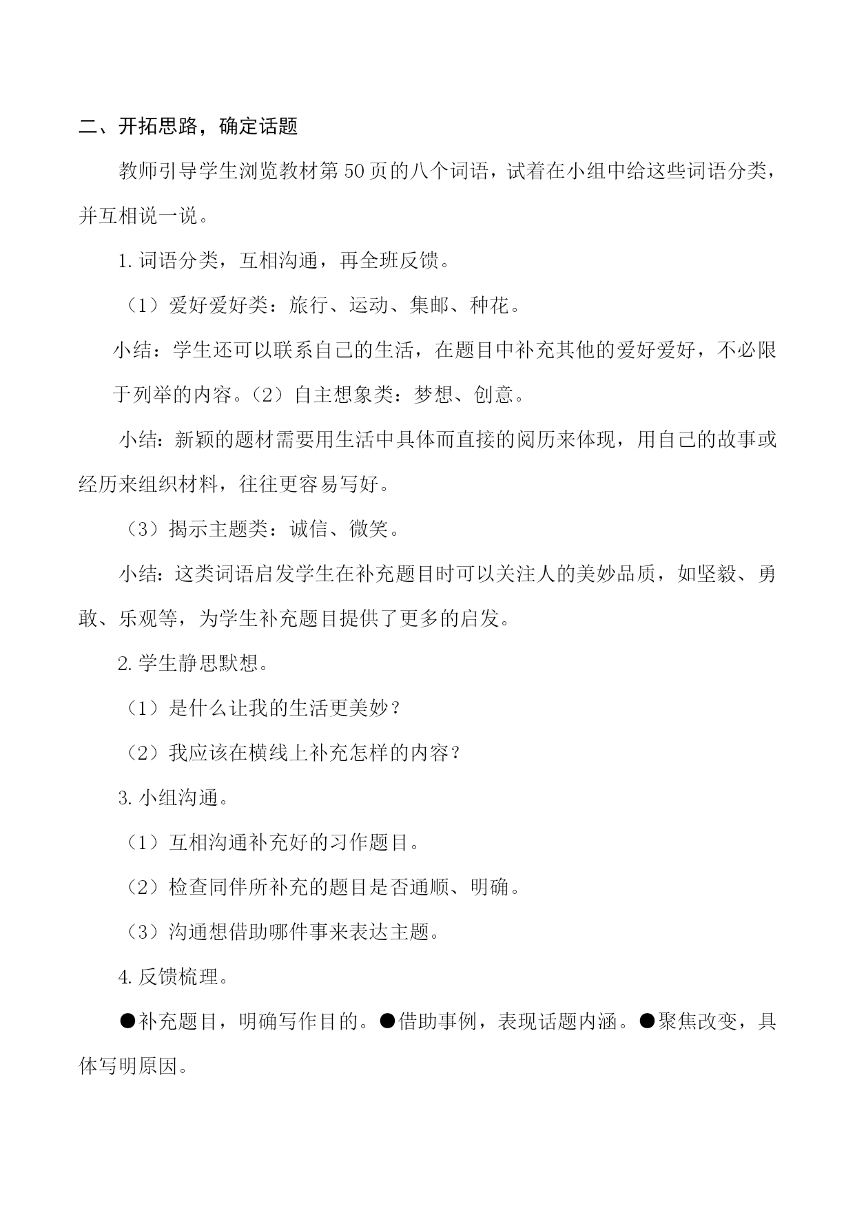 习作三________让生活更美妙[教学目标]1.选择让自己生活更美妙的一件事情、一样事物或一种品质写下来。2.写清楚它是怎样影响自己生活的,把它让生活更美妙的原因写具体。【语文要素】3.分享习作心得体会。[教学重难点]1.基于写作目的,写清楚某件事物让生活更美妙的经历,情节要围绕这件事物对生活的影响展开。2.能把某件事物让生活更美妙的原因写清楚,写具体。[教学课时]1—2课时一、仔细审题,明确要点师:同学们,在这个单元,我们通过学习课文,一起进行“有目的地阅读”。这次习作,我们也要先明确写作的目的,做到
