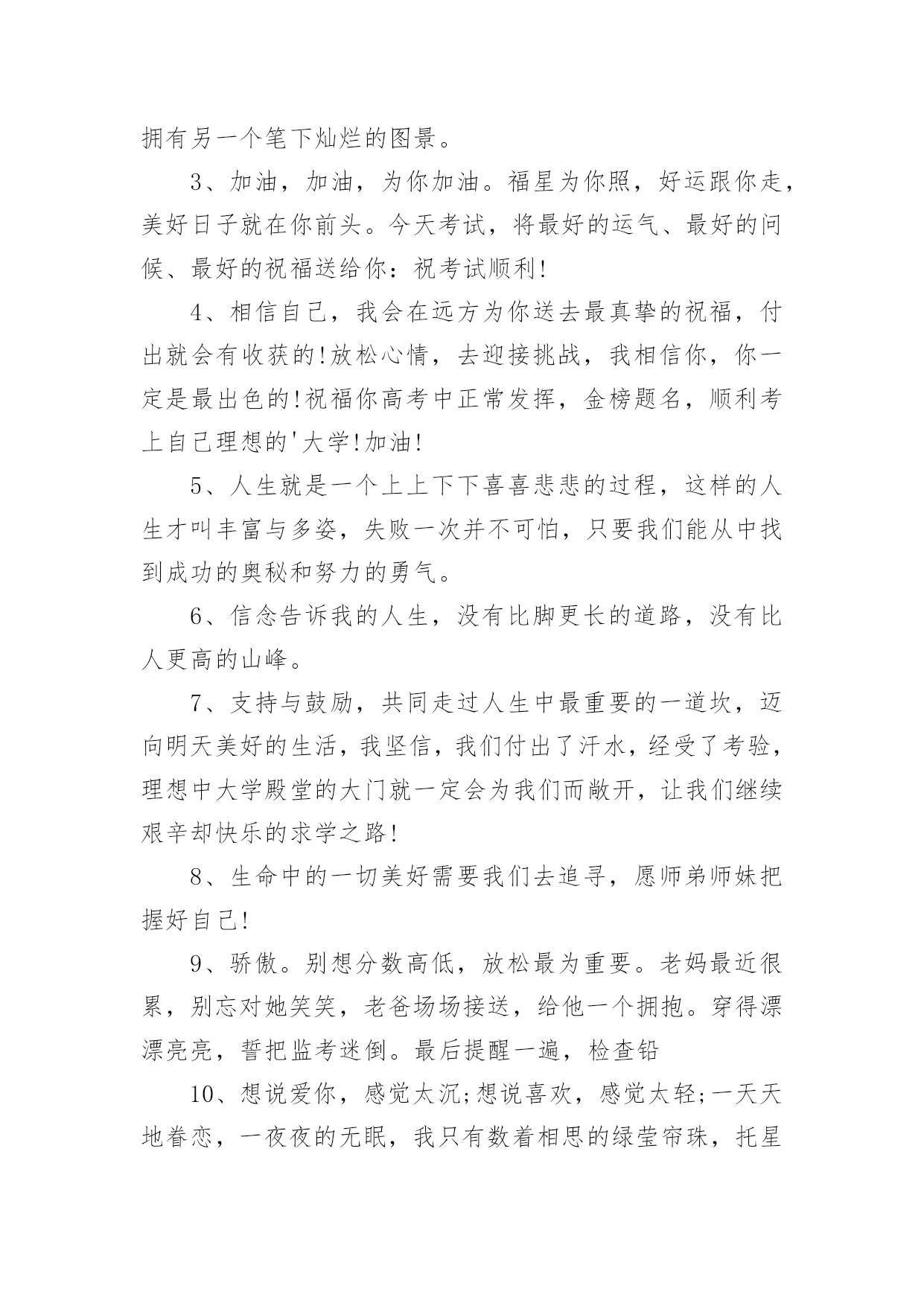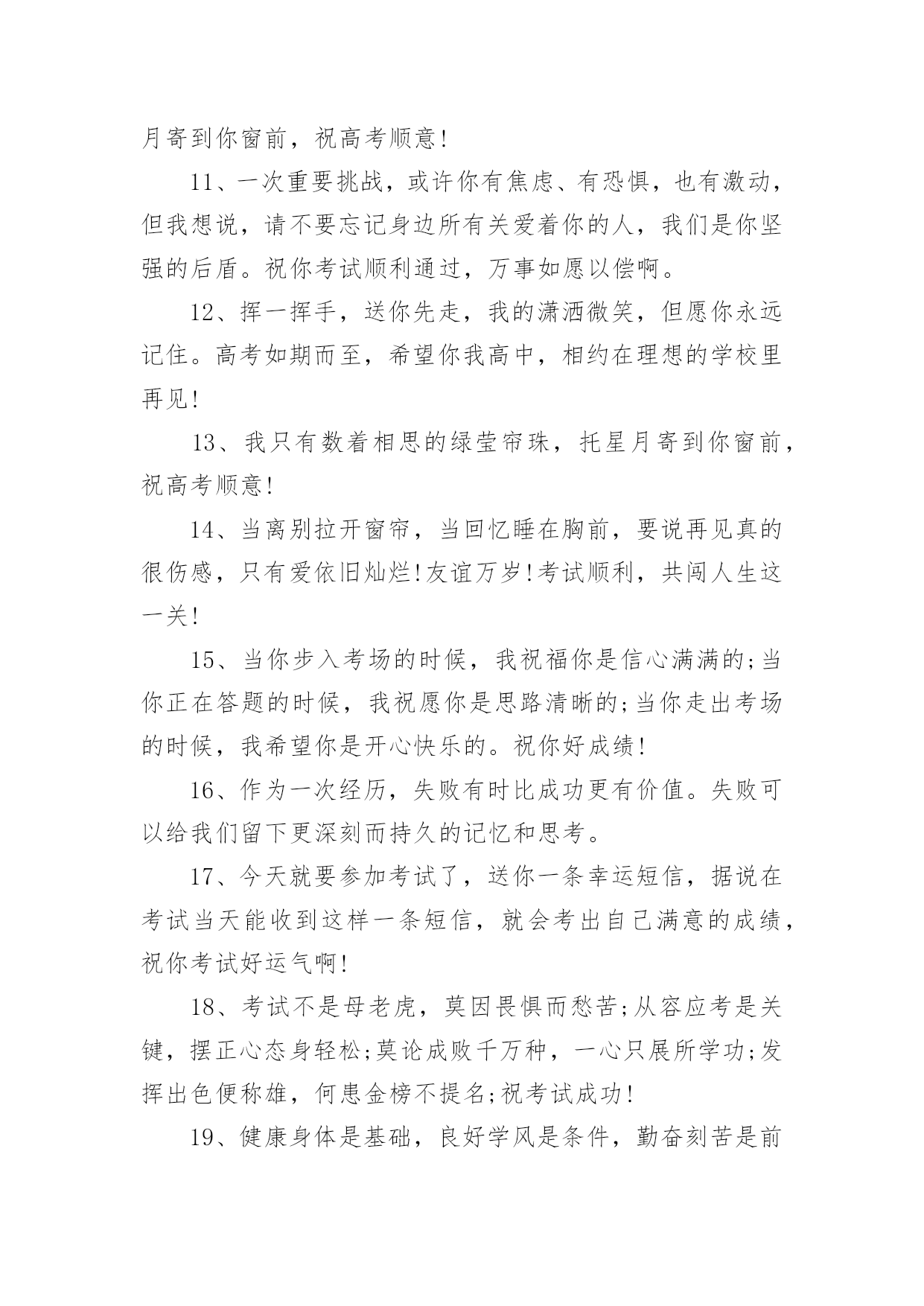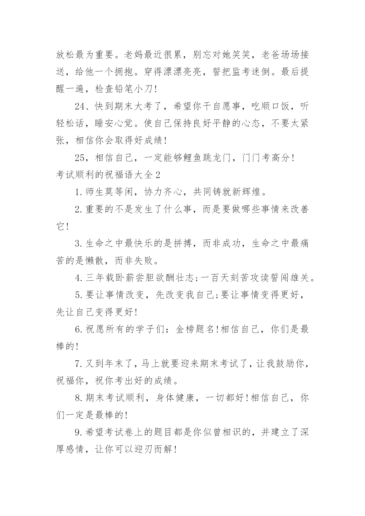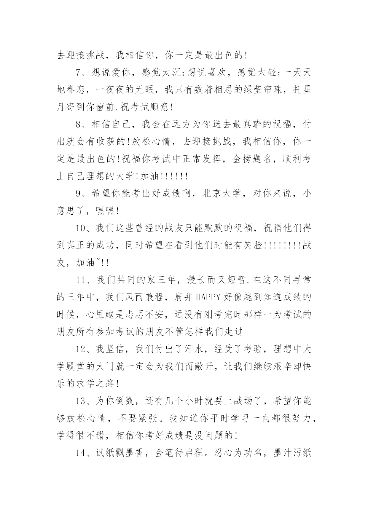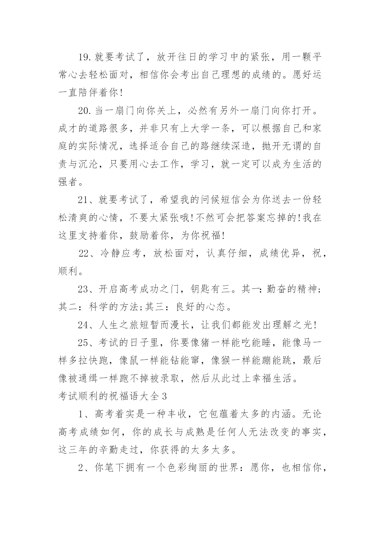 考试顺利的祝福语考试顺利的祝福语大全在平凡的学习、工作、生活中,大家对祝福语都再熟悉不过了吧,祝福语是人们表达心中祝福的话语。那么你所知道的祝福语都是什么样子的?下面是小编整理的考试顺利的祝福语大全,欢迎大家分享。考试顺利的祝福语大全11、祝福我的好朋友考研成功!虽然最近我不再陪伴你学习,但是我在心里依然惦记着你.相信你一定会成功的不管你能否看到.都希望你能感受到我真诚的祝福!2、再过几日即考试,十年寒窗为今朝。临时没法抱佛脚,上阵磨枪有绝招。考前定要休息好,用具准备要趁早,有备而战信心高。祝考试顺利!3、月寒更觉日暖,分别更恋相聚,在这毕业之时,祝愿你--万事如意,我们的生活充满了阳光和欢笑快乐地跳吧,世界属于我们!4、依依终须别,此后盼珍重,再叙情更浓。5、一次重要挑战,或许你有焦虑、有恐惧,也有激动,但我想说,请不要忘记身边所有关爱着你的人,我们是你坚强的后盾。祝你考试顺利通过,万事如愿以偿啊。6、眼看考试就要来了,向前看,相信自己,我会在远方为你送去最真挚的祝福,付出就会有收获的!放松心情,去迎接挑战,我相信你,你一定是最出色的!7、想说爱你,感觉太沉;想说喜欢,感觉太轻;一天天地眷恋,一夜夜的无眠,我只有数着相思的绿莹帘珠,托星月寄到你窗前.祝考试顺意!8、相信自己,我会在远方为你送去最真挚的祝福,付出就会有收获的!放松心情,去迎接挑战,我相信你,你一定是最出色的!祝福你考试中正常发挥,金榜题名,顺利考上自己理想的大学!加油!!!!!!9、希望你能考出好成绩啊,北京大学,对你来说,小意思了,嘿嘿!10、我们这些曾经的战友只能默默的祝福,祝福他们得到真正的成功,同时希望在看到他们时能有笑脸!!!!!!!!战友,加油~!!11、我们共同的家三年,漫长而又短暂.在这不同寻常的三年中,我们风雨兼程,肩并HAPPY好像越到知道成绩的时候,心里越是忐忑不安,远没有刚考完时那样一为考试的朋友所有参加考试的朋友不管怎样我们走过12、我坚信,我们付出了汗水,经受了考验,理想中大学殿堂的大门就一定会为我们而敞开,让我们继续艰辛却快乐的求学之路!13、为你倒数,还有几个小时就要上战场了,希望你能够放松心情,不要紧张。我知道你平时学习一向都很努力,学得很不错,相信你考好成绩是没问题的!14、试纸飘墨香,金笔待启程。忍心为功名,墨汁污纸张。怎能抛功名,畅游在海外。绞尽脑汁干,名在孙山外。两袖清风去,何苦染尘埃。祝考试成功!!!15、十年寒窗苦读日,只盼金榜题名时,祝你考试拿高分,鲤鱼跳龙门!加油!16、亲爱的同学,我们在一起这么久了,都是你在为我付出。我却没为你做些什么…下辈子如果做牛做马,我...我一定拔草给你吃!考试顺利!17、亲爱的同学,期末考试来了,愿你们考出好成绩,考到自己理想的成绩。18、亲爱的孩子,天,每一天爸爸都在全心全意地为你祝福。祝愿你从小的梦想成真!爸爸相信你一定会成功,明年秋天我就可以到大学校园探望你,我们一言为定19、努力了,就无怨无悔。有道是:天道筹勤!相信自己,你是最棒的!!愿和你分享每一份的喜悦!20、努力的苦读,就为这一刻啰!把你的实力全部发挥,所有关爱着你的人,都会为你祝福、祈祷,相信你会考出满意的成绩,榜上有名喔!21、你有你的赤橙黄绿,我有我的青蓝靛紫,天空同属于我们,因为我们年轻。22、你的美丽、雅纯是子弹,会深深地击中我的心,让你的情话和动人在我心中一生美丽,一条短信却蕴含着我千千万万个心愿,祝你天天快乐、高兴。23、明天就要考试,出门还得趁早。付出就有回报,赶紧睡个好觉。毕竟熬过十年,参加就可骄傲。别想分数高低,放松最为重要。老妈最近很累,别忘对她笑笑,老爸场场接送,给他一个拥抱。穿得漂漂亮亮,誓把监考迷倒。最后提醒一遍,检查铅笔小刀!24、快到期末大考了,希望你干自愿事,吃顺口饭,听轻松话,睡安心觉。使自己保持良好平静的心态,不要太紧张,相信你会取得好成绩!25,相信自己,一定能够鲤鱼跳龙门,门门考高分!考试顺利的祝福语大全21.师生莫等闲,协力齐心,共同铸就新辉煌。2.重要的不是发生了什么事,而是要做哪些事情来改善它!3.生命之中最快乐的是拼搏,而非成功,生命之中最痛苦的是懒散,而非失败。4.三年载卧薪尝胆欲酬壮志;一百天刻苦攻读誓闯雄关。5.要让事情改变,先改变我自己;要让事情变得更好,先让自己变得更好!6.祝愿所有的学子们:金榜题名!相信自己,你们是最棒的!7.又到年末了,马上就要迎来期末考试了,让我鼓励你,祝福你,祝你考出好的成绩。8.期末考试顺利,身体健康,一切都好!相信自己,你们一定是最棒的!9.希望考试卷上的题目都是你似曾相识的,并建立了深厚感情,让你可以迎刃而解!10.真心地祝福你考试取得好成绩!发挥出最好的水平。你是个聪明和头脑灵活的人,我相信你一定成功!!!11.面对目标