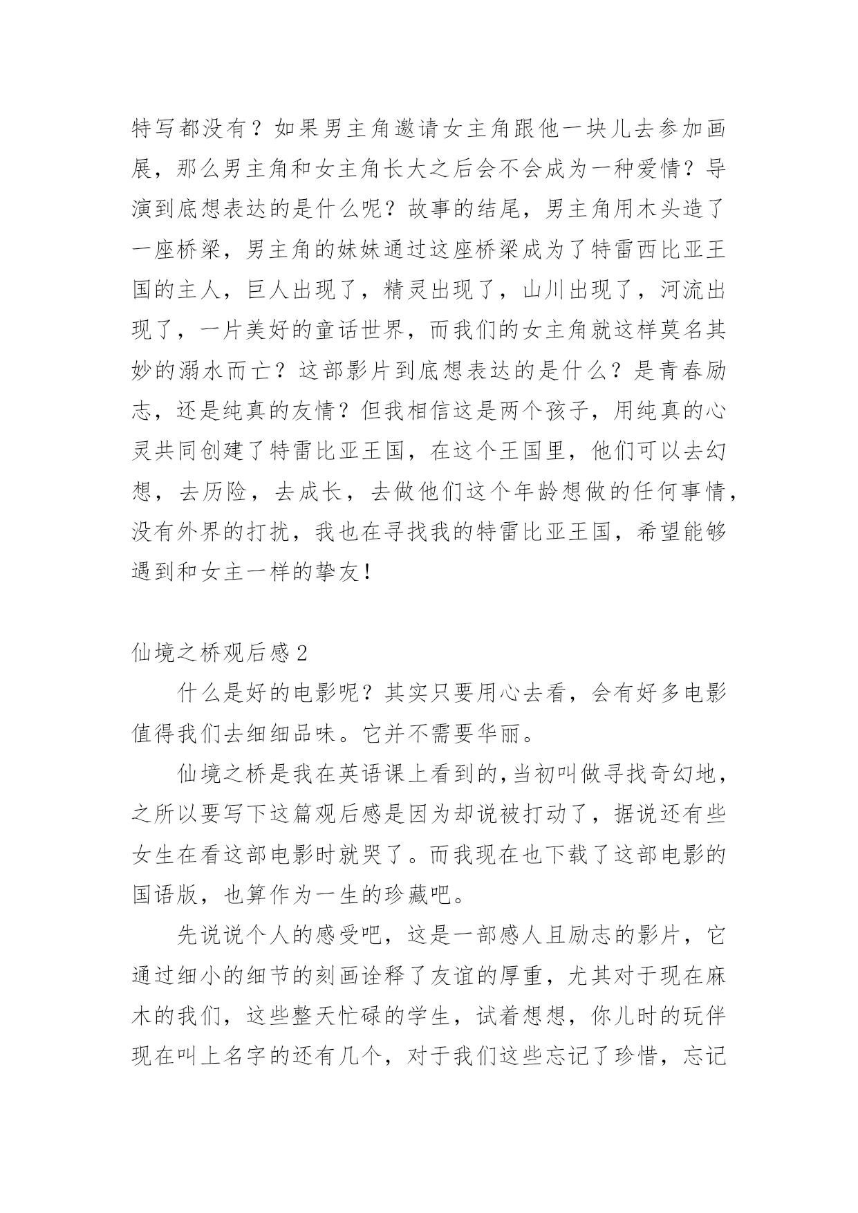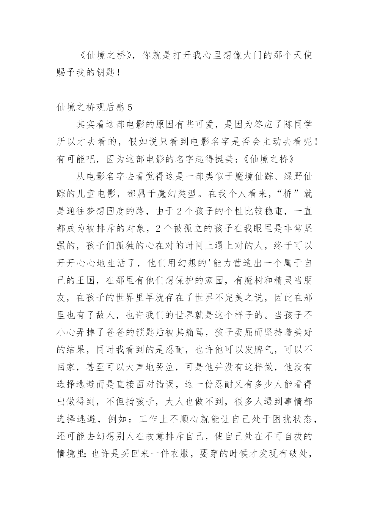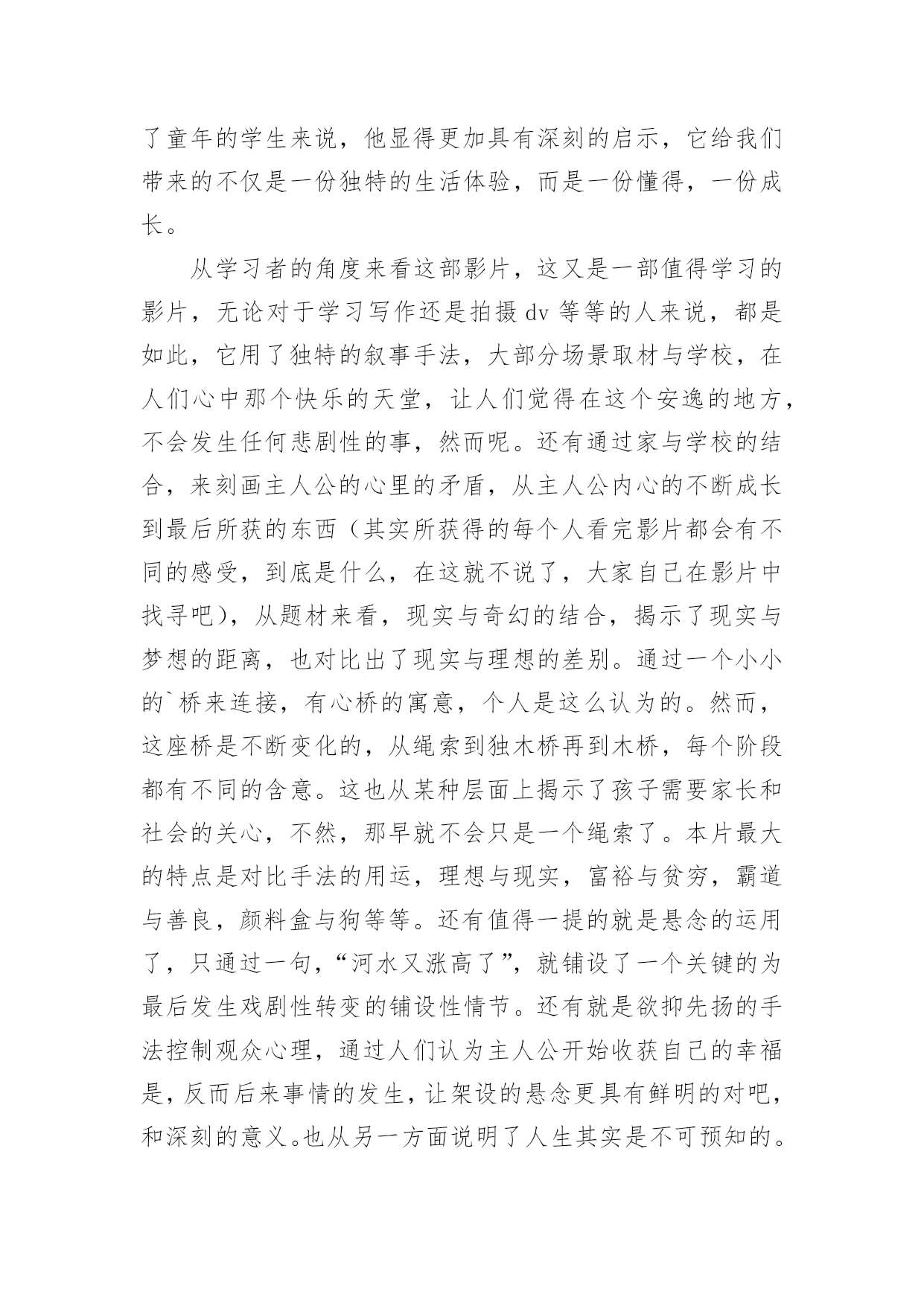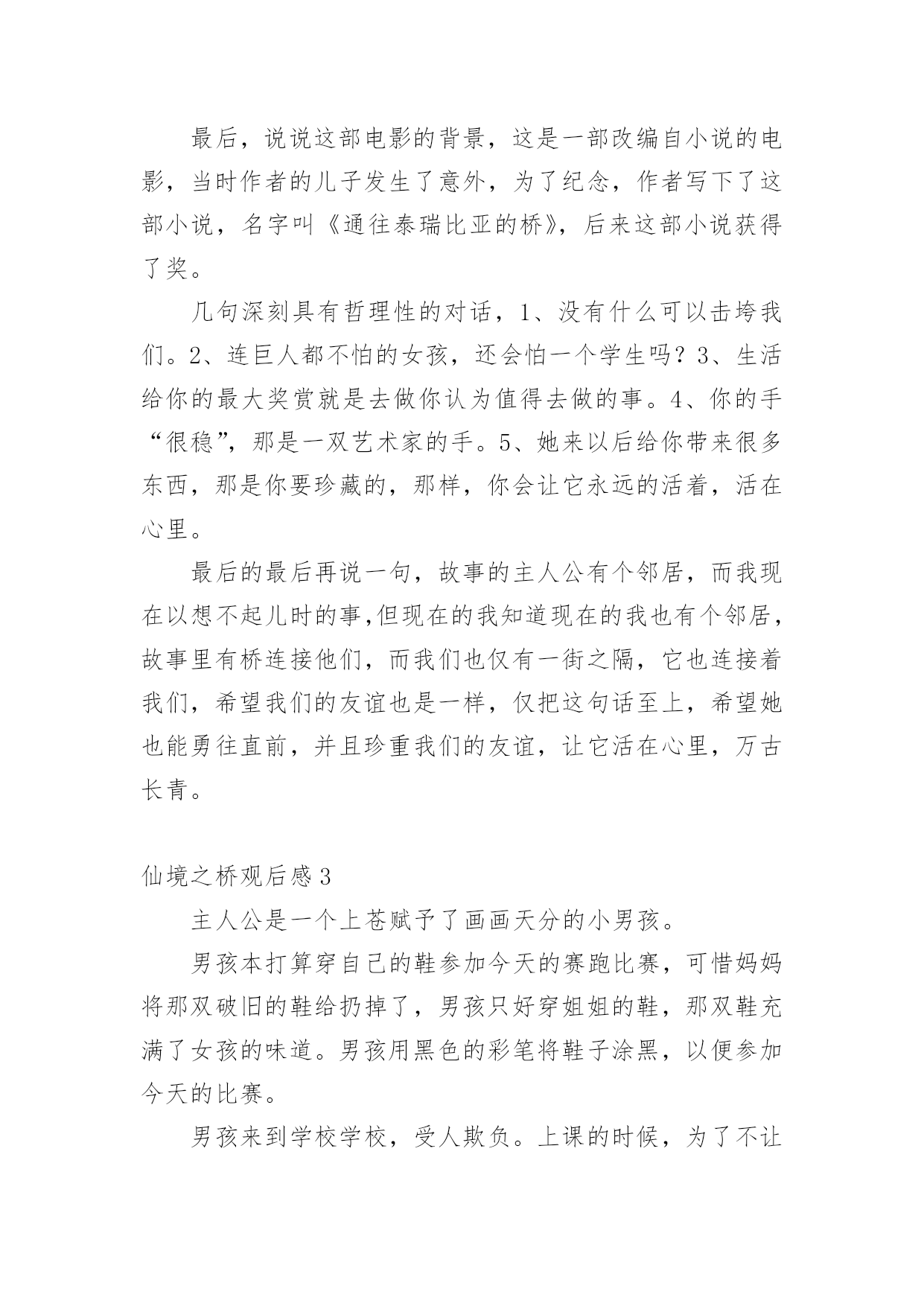 仙境之桥观后感当观看作品时,我们会沉浸在情节之中,相信你一定有很多值得分享的收获,透过观影,我们可以发现一些深刻的感悟。那么我们该怎么去写观后感呢?下面是小编为大家收集的仙境之桥观后感,欢迎大家借鉴与参考,希望对大家有所帮助。仙境之桥观后感1在每个人心底的深处都有一个仙境,可是当没有桥梁与之沟通时,那只是一片荒芜的森林。一开始被女主角的穿着打扮所吸引,尤其是女主开学第一天背的夸张的斜挎包,很符合我的搭配审美观点,还有其他细节的搭配处理,也是非常nice,就抱着打发时间的心态去看了一下这部影片。当男主角和女主角把绳子当做秋千荡来荡去的时候,脸部朝向天空,露出灿烂的笑容,特别的治愈,原本以为这是一部美丽的童话故事,一直以一种轻松愉悦的心态去看这部片子,可是看到最后却发现并非如此,心情反而似乎还有些沉重,还有点儿弄不明白导演想向我们表达的是什么。男主角和女主角大概是十三四岁的样子,应该是上的七年级,男主角的生活环境可以用失去阳光来形容,家境并不富裕,家里孩子较多,父母负担较重,父母的不重视,姐姐们的嘲笑,在学校里也被同学鄙视,有点自卑,和同学的关系处理的也不好。然而女主角天使般的出场让我的眼前一亮,女主角非常的漂亮,阳光灿烂,而且个性鲜明,对生活充满了激情,爱幻想,活泼开朗。无论是在学校还是放学之后,女主角都在改变男主对生活的态度。他们一块儿学习,放学后一块儿跨过小河,去森林深处冒险,幻想,一块儿去打怪兽,在学校里一块儿帮助同学……看到这里,我以为是一部青春励志片,但是当看到男主和女主在雨中诀别的那一幕,我有点迷茫,不知道导演想表达的是什么。学校里的老师邀请男主角去参观画展的时候,路过女主角的房子附近,我原本以为男主角会要求女主角一块儿去,这里导演还给了男主角一个特写,当老师问到你还有什么忘了吗的时候?男主角看了一眼女主角家的房子,犹豫了一下,然后说没有,这一刻我在想接下来会有什么事情发生呢?为什么男主角不要求女主角一起去参加画展呢?果不其然,当男主角参加完画展回来之后,得到的却是女主角溺水死亡的消息,看到这里,我一下子陷入了迷雾之中,这是一个特别勇敢的,独立的,自信的,阳光的女孩儿,为什么会发生这么不幸的事情呢?当男主角和老师一块儿去画展的时候,男孩儿的父亲也开车出门了,河流上方的绳子断了,女主角落水溺水而亡,男主角在森林里看到的那个影子是自己的父亲,会不会是男主角的`父亲把绳子割断了而导致的女主角落水,溺水而亡呢?影片的2/3都是在讲青春励志的故事,但影片的后1/3是在讲非常悲痛的一个故事,为什么女主角的死亡过程连个特写都没有?如果男主角邀请女主角跟他一块儿去参加画展,那么男主角和女主角长大之后会不会成为一种爱情?导演到底想表达的是什么呢?故事的结尾,男主角用木头造了一座桥梁,男主角的妹妹通过这座桥梁成为了特雷西比亚王国的主人,巨人出现了,精灵出现了,山川出现了,河流出现了,一片美好的童话世界,而我们的女主角就这样莫名其妙的溺水而亡?这部影片到底想表达的是什么?是青春励志,还是纯真的友情?但我相信这是两个孩子,用纯真的心灵共同创建了特雷比亚王国,在这个王国里,他们可以去幻想,去历险,去成长,去做他们这个年龄想做的任何事情,没有外界的打扰,我也在寻找我的特雷比亚王国,希望能够遇到和女主一样的挚友!仙境之桥观后感2什么是好的电影呢?其实只要用心去看,会有好多电影值得我们去细细品味。它并不需要华丽。仙境之桥是我在英语课上看到的,当初叫做寻找奇幻地,之所以要写下这篇观后感是因为却说被打动了,据说还有些女生在看这部电影时就哭了。而我现在也下载了这部电影的国语版,也算作为一生的珍藏吧。先说说个人的感受吧,这是一部感人且励志的影片,它通过细小的细节的刻画诠释了友谊的厚重,尤其对于现在麻木的我们,这些整天忙碌的学生,试着想想,你儿时的玩伴现在叫上名字的还有几个,对于我们这些忘记了珍惜,忘记了童年的学生来说,他显得更加具有深刻的启示,它给我们带来的不仅是一份独特的生活体验,而是一份懂得,一份成长。从学习者的角度来看这部影片,这又是一部值得学习的影片,无论对于学习写作还是拍摄dv等等的人来说,都是如此,它用了独特的叙事手法,大部分场景取材与学校,在人们心中那个快乐的天堂,让人们觉得在这个安逸的地方,不会发生任何悲剧性的事,然而呢。还有通过家与学校的结合,来刻画主人公的心里的矛盾,从主人公内心的不断成长到最后所获的东西(其实所获得的每个人看完影片都会有不同的感受,到底是什么,在这就不说了,大家自己在影片中找寻吧),从题材来看,现实与奇幻的结合,揭示了现实与梦想的距离,也对比出了现实与理想的差别。通过一个小小的`桥来连接,有心桥的寓意,个人是这么认为的。然而,这座桥是不断变化的,从绳索到独木桥再到木桥,每个阶段都有不同的含意。这也从某种层面上揭示了