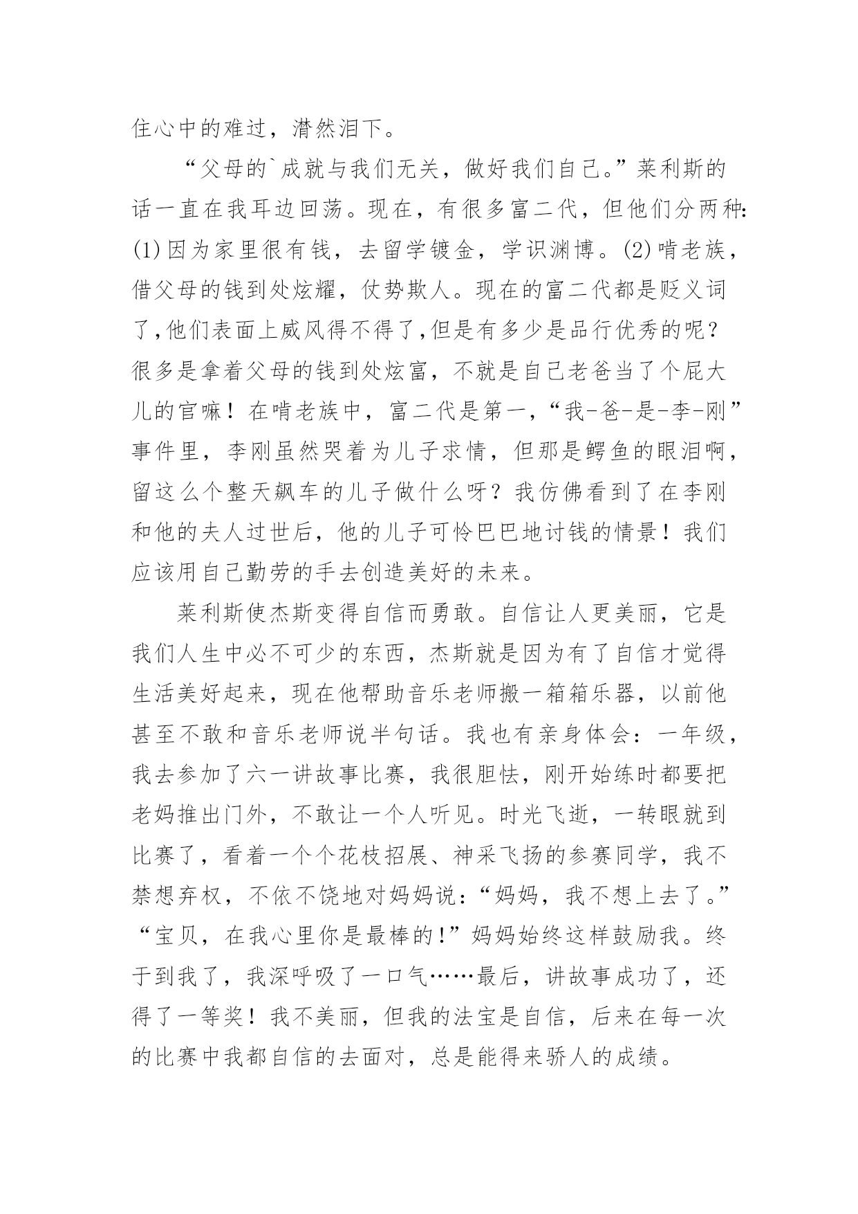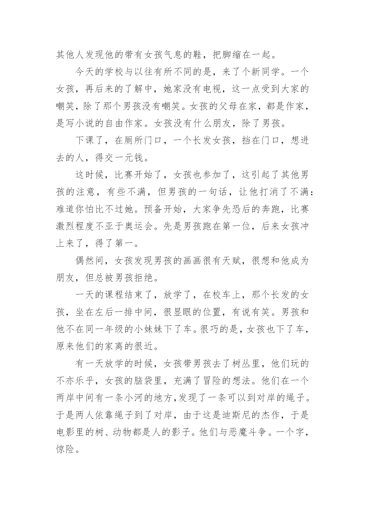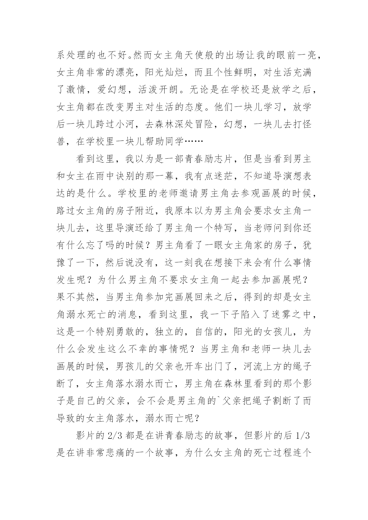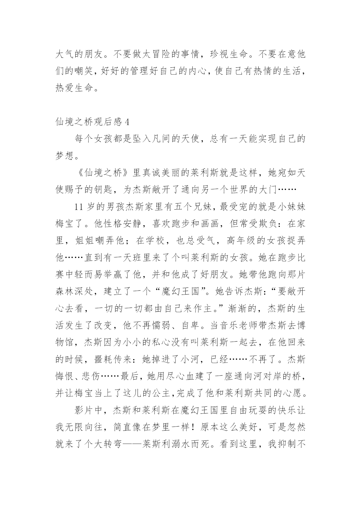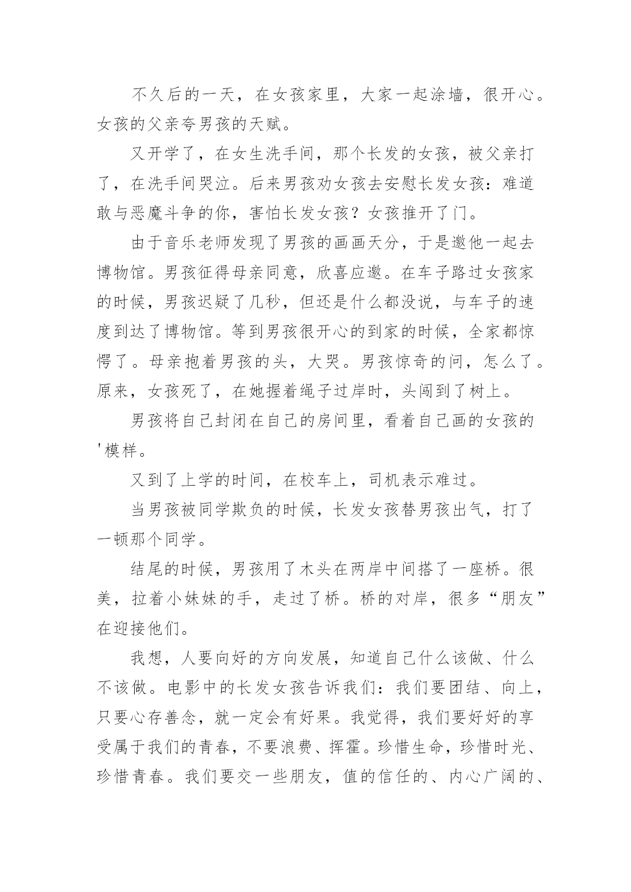 仙境之桥观后感当观看作品时,我们会沉浸在情节之中,相信你一定有很多值得分享的收获,透过观影,我们可以发现一些深刻的感悟。那么我们该怎么去写观后感呢?下面是小编为大家收集的仙境之桥观后感,欢迎大家借鉴与参考,希望对大家有所帮助。仙境之桥观后感1在每个人心底的深处都有一个仙境,可是当没有桥梁与之沟通时,那只是一片荒芜的森林。一开始被女主角的穿着打扮所吸引,尤其是女主开学第一天背的夸张的斜挎包,很符合我的搭配审美观点,还有其他细节的搭配处理,也是非常nice,就抱着打发时间的心态去看了一下这部影片。当男主角和女主角把绳子当做秋千荡来荡去的时候,脸部朝向天空,露出灿烂的笑容,特别的治愈,原本以为这是一部美丽的童话故事,一直以一种轻松愉悦的心态去看这部片子,可是看到最后却发现并非如此,心情反而似乎还有些沉重,还有点儿弄不明白导演想向我们表达的是什么。男主角和女主角大概是十三四岁的样子,应该是上的七年级,男主角的生活环境可以用失去阳光来形容,家境并不富裕,家里孩子较多,父母负担较重,父母的不重视,姐姐们的嘲笑,在学校里也被同学鄙视,有点自卑,和同学的关系处理的也不好。然而女主角天使般的出场让我的眼前一亮,女主角非常的漂亮,阳光灿烂,而且个性鲜明,对生活充满了激情,爱幻想,活泼开朗。无论是在学校还是放学之后,女主角都在改变男主对生活的态度。他们一块儿学习,放学后一块儿跨过小河,去森林深处冒险,幻想,一块儿去打怪兽,在学校里一块儿帮助同学……看到这里,我以为是一部青春励志片,但是当看到男主和女主在雨中诀别的那一幕,我有点迷茫,不知道导演想表达的是什么。学校里的老师邀请男主角去参观画展的时候,路过女主角的房子附近,我原本以为男主角会要求女主角一块儿去,这里导演还给了男主角一个特写,当老师问到你还有什么忘了吗的时候?男主角看了一眼女主角家的房子,犹豫了一下,然后说没有,这一刻我在想接下来会有什么事情发生呢?为什么男主角不要求女主角一起去参加画展呢?果不其然,当男主角参加完画展回来之后,得到的却是女主角溺水死亡的消息,看到这里,我一下子陷入了迷雾之中,这是一个特别勇敢的,独立的,自信的,阳光的女孩儿,为什么会发生这么不幸的事情呢?当男主角和老师一块儿去画展的时候,男孩儿的父亲也开车出门了,河流上方的绳子断了,女主角落水溺水而亡,男主角在森林里看到的那个影子是自己的父亲,会不会是男主角的`父亲把绳子割断了而导致的女主角落水,溺水而亡呢?影片的2/3都是在讲青春励志的故事,但影片的后1/3是在讲非常悲痛的一个故事,为什么女主角的死亡过程连个特写都没有?如果男主角邀请女主角跟他一块儿去参加画展,那么男主角和女主角长大之后会不会成为一种爱情?导演到底想表达的是什么呢?故事的结尾,男主角用木头造了一座桥梁,男主角的妹妹通过这座桥梁成为了特雷西比亚王国的主人,巨人出现了,精灵出现了,山川出现了,河流出现了,一片美好的童话世界,而我们的女主角就这样莫名其妙的溺水而亡?这部影片到底想表达的是什么?是青春励志,还是纯真的友情?但我相信这是两个孩子,用纯真的心灵共同创建了特雷比亚王国,在这个王国里,他们可以去幻想,去历险,去成长,去做他们这个年龄想做的任何事情,没有外界的打扰,我也在寻找我的特雷比亚王国,希望能够遇到和女主一样的挚友!仙境之桥观后感2什么是好的电影呢?其实只要用心去看,会有好多电影值得我们去细细品味。它并不需要华丽。仙境之桥是我在英语课上看到的,当初叫做寻找奇幻地,之所以要写下这篇观后感是因为却说被打动了,据说还有些女生在看这部电影时就哭了。而我现在也下载了这部电影的国语版,也算作为一生的珍藏吧。先说说个人的感受吧,这是一部感人且励志的影片,它通过细小的细节的刻画诠释了友谊的厚重,尤其对于现在麻木的我们,这些整天忙碌的学生,试着想想,你儿时的玩伴现在叫上名字的还有几个,对于我们这些忘记了珍惜,忘记了童年的学生来说,他显得更加具有深刻的启示,它给我们带来的不仅是一份独特的生活体验,而是一份懂得,一份成长。从学习者的角度来看这部影片,这又是一部值得学习的影片,无论对于学习写作还是拍摄dv等等的人来说,都是如此,它用了独特的叙事手法,大部分场景取材与学校,在人们心中那个快乐的天堂,让人们觉得在这个安逸的地方,不会发生任何悲剧性的事,然而呢。还有通过家与学校的结合,来刻画主人公的心里的矛盾,从主人公内心的不断成长到最后所获的东西(其实所获得的每个人看完影片都会有不同的感受,到底是什么,在这就不说了,大家自己在影片中找寻吧),从题材来看,现实与奇幻的结合,揭示了现实与梦想的距离,也对比出了现实与理想的差别。通过一个小小的`桥来连接,有心桥的寓意,个人是这么认为的。然而,这座桥是不断变化的,从绳索到独木桥再到木桥,每个阶段都有不同的含意。这也从某种层面上揭示了