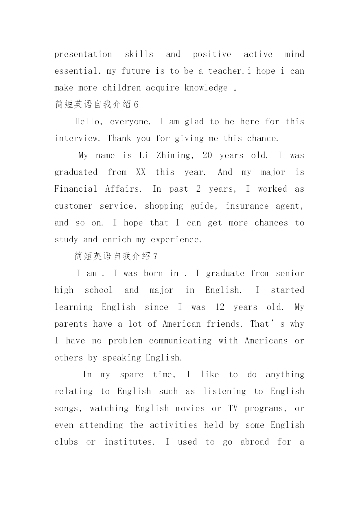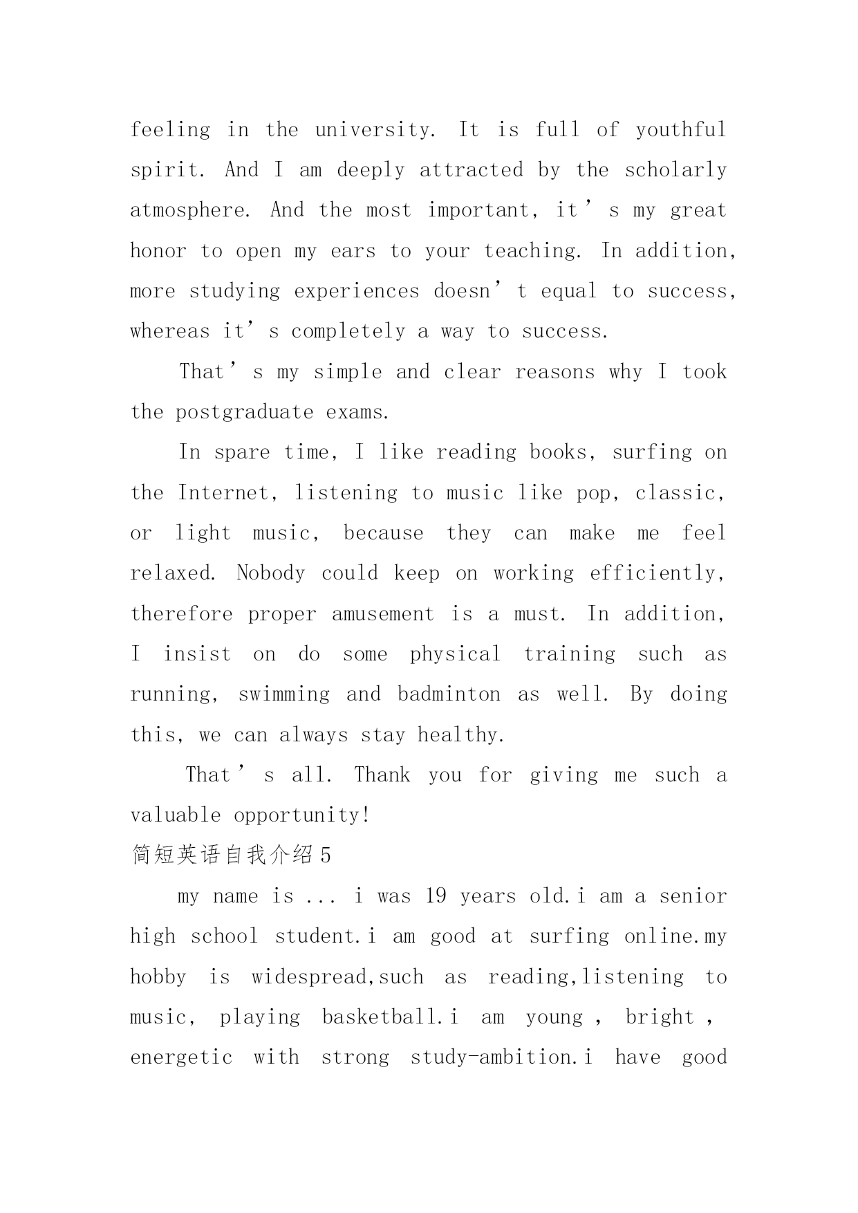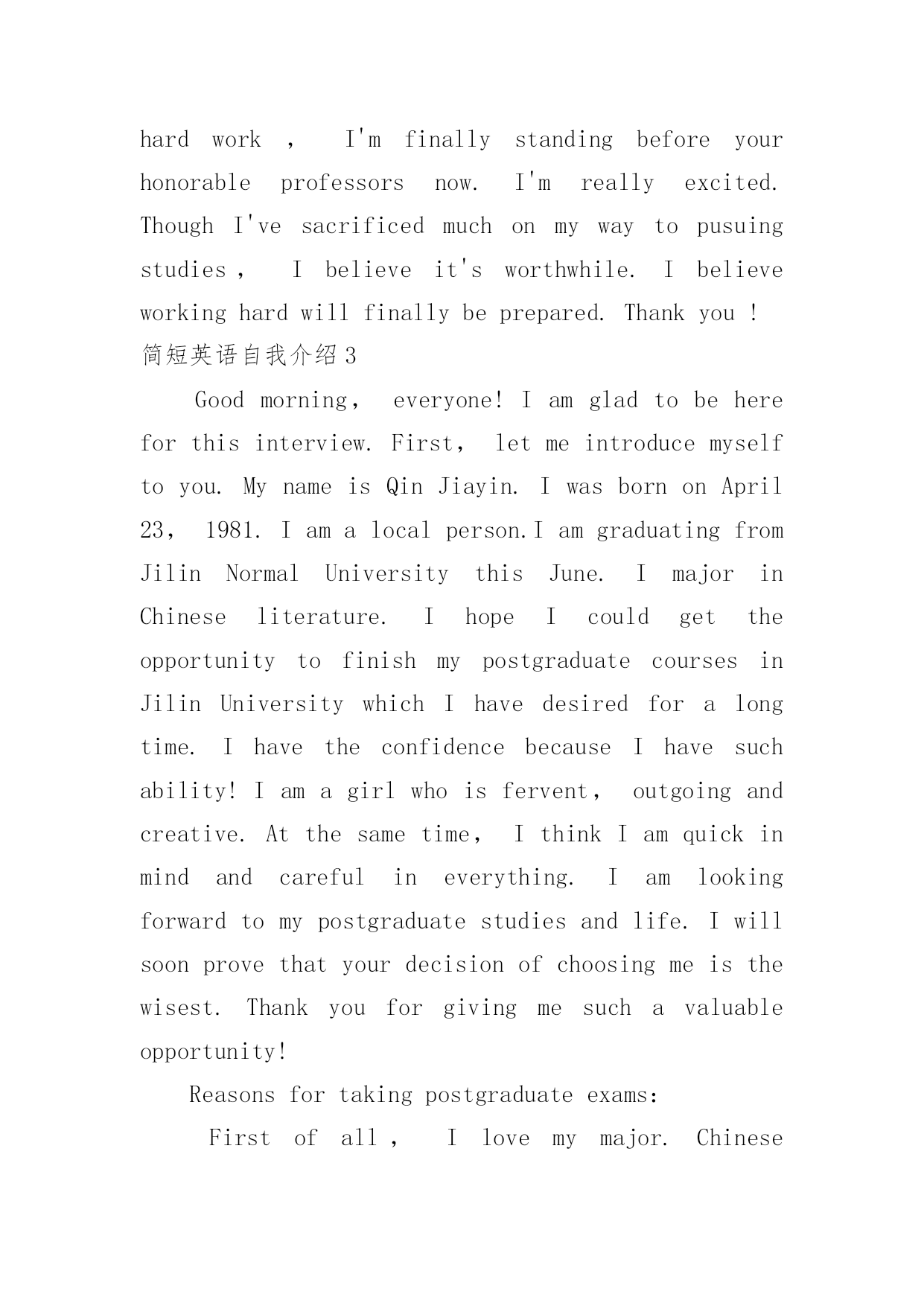 简短英语自我介绍简短英语自我介绍处在一个陌生场合时,我们时常会需要作自我介绍,自我介绍是一种认识自我的'手段。那么我们该怎么去写自我介绍呢?以下是小编收集整理的简短英语自我介绍,仅供参考,大家一起来看看吧。简短英语自我介绍1professors:Itismygreatpleasuretobehere.MynameisXXXX,graduatedfromXXXXDepartmentofXXXXUniversity.Duringmyfour-yearstudyintheuniversityasanunder-graduatestudent,Ihavebuiltupasolidfoundationofprofessionalknowledge,aswellasarichexperienceofsocialactivities.Iamadeterminedperson,alwayswillingtoachievehighergoals.Whatsmore,Iamgoodatanalysis,withastrongsenseofcooperation.AlloftheseledmetothesuccessofpassingthefirstroundoftheentranceexaminationtotheMastersdegree.Personally,Iamveryhumorousandeasy-going,enjoyingagoodrelationshipamongmyclassmates.Inmysparetime,Iliketoreadbooksregardinghowtobemyselfandhowtodealwithproblems.Musicandmoviesaremyfavoriteentertainments.Asformysportinterest,Icouldnotdenymygreatestinterestisfootball.Playingthisgamebringsmealotofglory,happinessandpassion.Allinall,WuhanUniversity,withahighlyqualifiedfacultyandstrongacademicenvironmentistheuniversityIhavelongadmired.IbelievethatIamaveryqualifiedapplicantforadmissionintoyourMasterofITprogramandcancontributetotheenrichmentorpersityofyouruniversity.简短英语自我介绍2RespectedProfessors,Goodafternoon!I'mgreathonoredtomeetyouhere.Nowallowmetogiveabriefself-introduction.I'm,26yearsold,bornincity,Province.Intheyearof,IenteredUniversity,majoringinMachincalDesigningandProducing.Duringthose4years'study,IworkedhardandIwasalwaysactiveinvariousactivities.IgainedthefirstscholarshipforfourtimesandIjoinedtheCommunistPartyatthecollege.AftermygraduationinJune,Iworkedincompany.IgotapositionintheTechnologyDepartmentthefirstyearandIwasinvolvedinseveralinternetprojects,suchastheoneforCollegestudentRecruitmentinHenanProvinceandtheoneforComputerCenterinMathmaticsDepartmentinZhengzhouUniversity.Owningtomyhardwork,IwasawardedtheBestNewcomerPrizeintheyear.Thenextyear,IwastransferredintothePrincipalCustomerDepartment,responsiblefordevelopingandstrengtheningagoodrelationshipbetweentheprincipalcustomersandmycompany.Twomajorcustomer