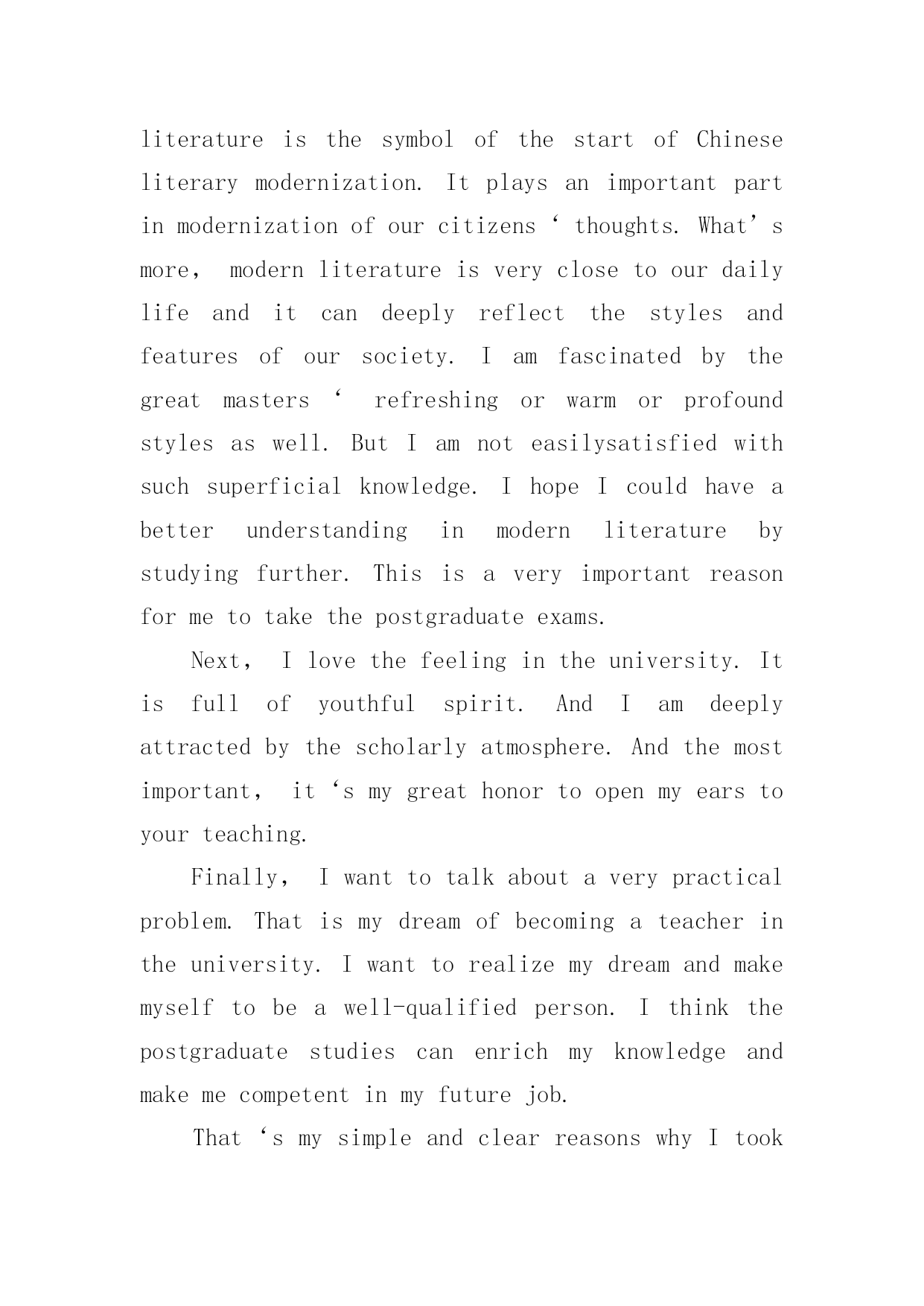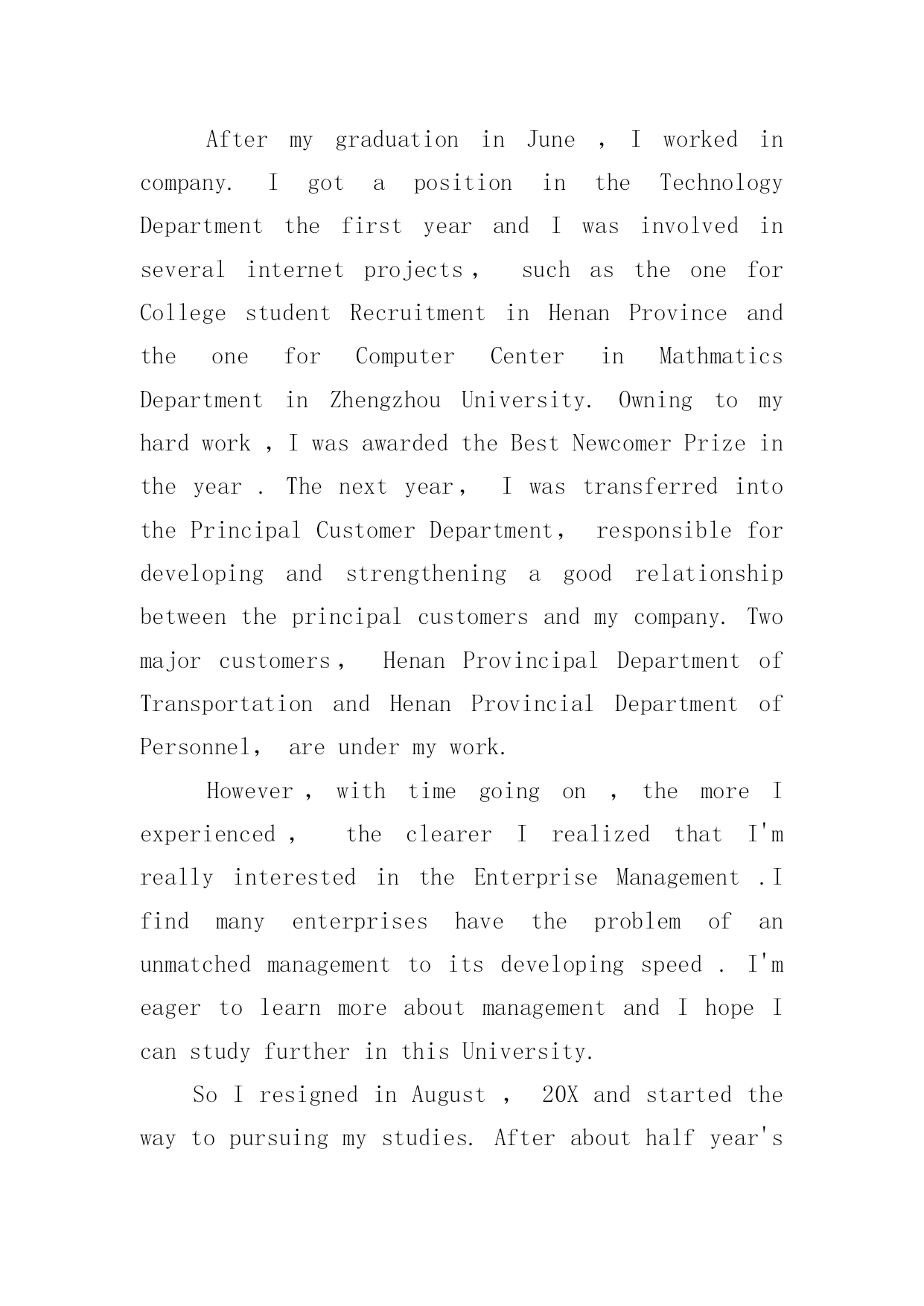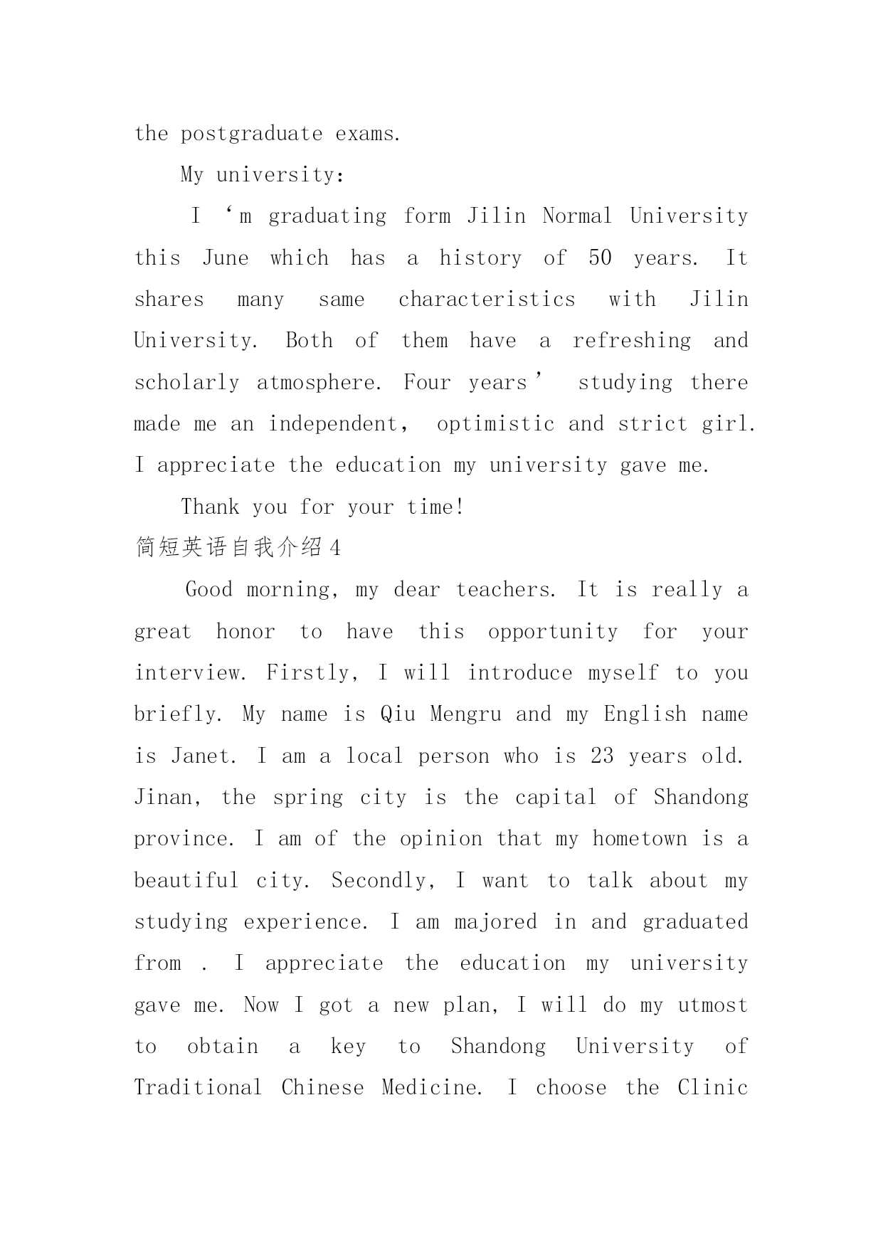 简短英语自我介绍简短英语自我介绍处在一个陌生场合时,我们时常会需要作自我介绍,自我介绍是一种认识自我的'手段。那么我们该怎么去写自我介绍呢?以下是小编收集整理的简短英语自我介绍,仅供参考,大家一起来看看吧。简短英语自我介绍1professors:Itismygreatpleasuretobehere.MynameisXXXX,graduatedfromXXXXDepartmentofXXXXUniversity.Duringmyfour-yearstudyintheuniversityasanunder-graduatestudent,Ihavebuiltupasolidfoundationofprofessionalknowledge,aswellasarichexperienceofsocialactivities.Iamadeterminedperson,alwayswillingtoachievehighergoals.Whatsmore,Iamgoodatanalysis,withastrongsenseofcooperation.AlloftheseledmetothesuccessofpassingthefirstroundoftheentranceexaminationtotheMastersdegree.Personally,Iamveryhumorousandeasy-going,enjoyingagoodrelationshipamongmyclassmates.Inmysparetime,Iliketoreadbooksregardinghowtobemyselfandhowtodealwithproblems.Musicandmoviesaremyfavoriteentertainments.Asformysportinterest,Icouldnotdenymygreatestinterestisfootball.Playingthisgamebringsmealotofglory,happinessandpassion.Allinall,WuhanUniversity,withahighlyqualifiedfacultyandstrongacademicenvironmentistheuniversityIhavelongadmired.IbelievethatIamaveryqualifiedapplicantforadmissionintoyourMasterofITprogramandcancontributetotheenrichmentorpersityofyouruniversity.简短英语自我介绍2RespectedProfessors,Goodafternoon!I'mgreathonoredtomeetyouhere.Nowallowmetogiveabriefself-introduction.I'm,26yearsold,bornincity,Province.Intheyearof,IenteredUniversity,majoringinMachincalDesigningandProducing.Duringthose4years'study,IworkedhardandIwasalwaysactiveinvariousactivities.IgainedthefirstscholarshipforfourtimesandIjoinedtheCommunistPartyatthecollege.AftermygraduationinJune,Iworkedincompany.IgotapositionintheTechnologyDepartmentthefirstyearandIwasinvolvedinseveralinternetprojects,suchastheoneforCollegestudentRecruitmentinHenanProvinceandtheoneforComputerCenterinMathmaticsDepartmentinZhengzhouUniversity.Owningtomyhardwork,IwasawardedtheBestNewcomerPrizeintheyear.Thenextyear,IwastransferredintothePrincipalCustomerDepartment,responsiblefordevelopingandstrengtheningagoodrelationshipbetweentheprincipalcustomersandmycompany.Twomajorcustomer