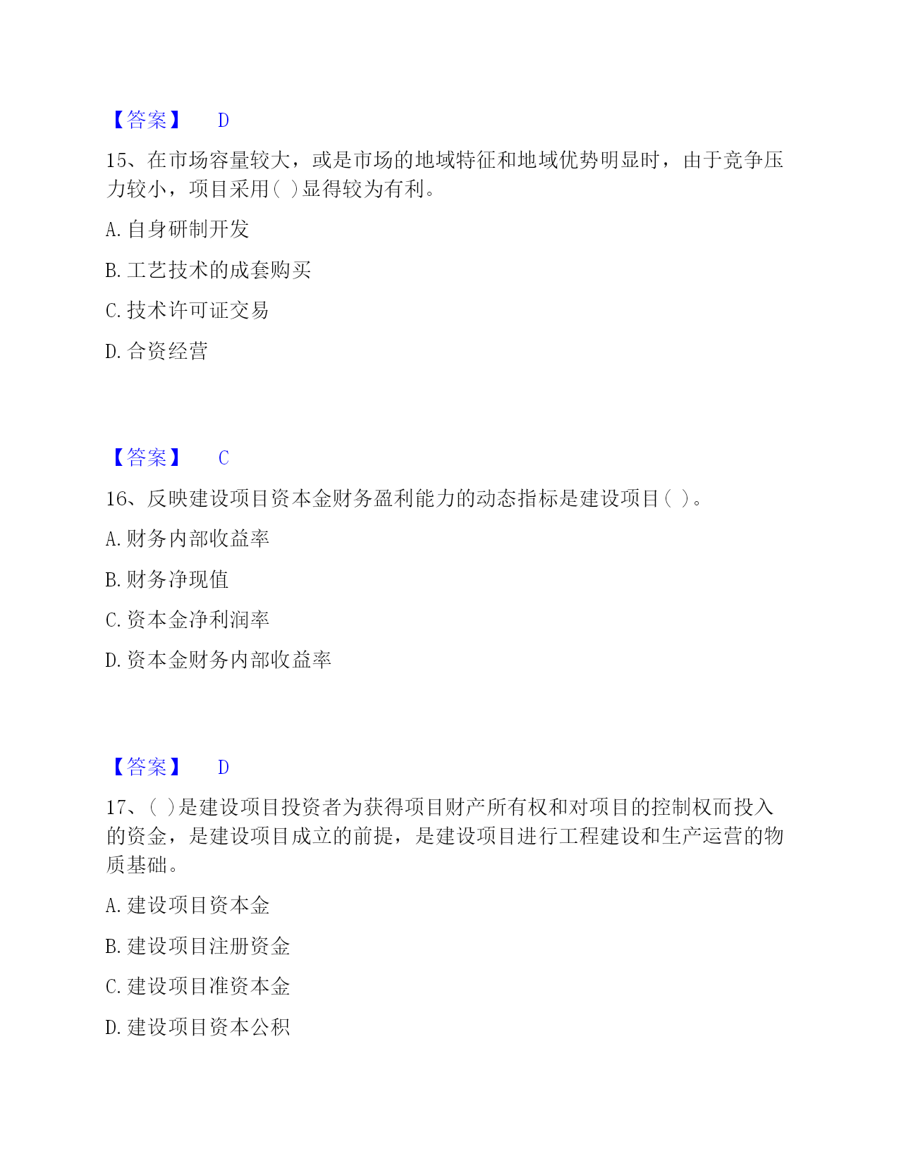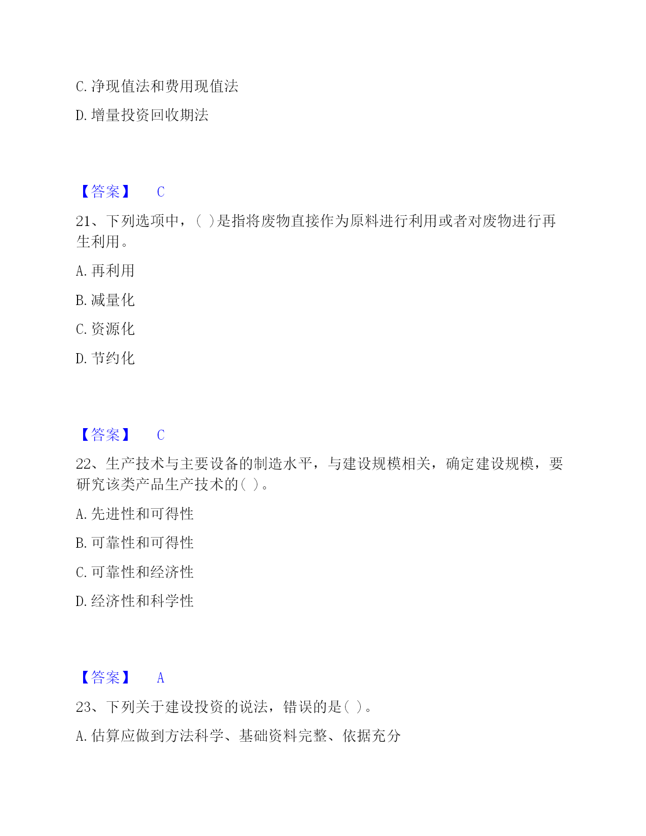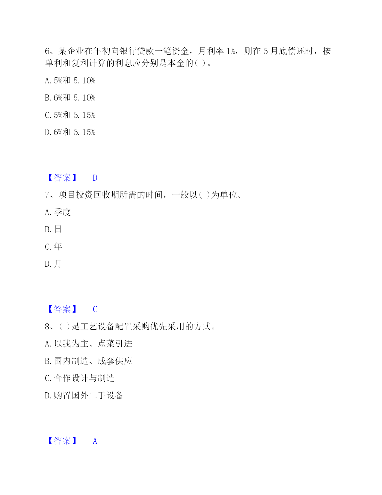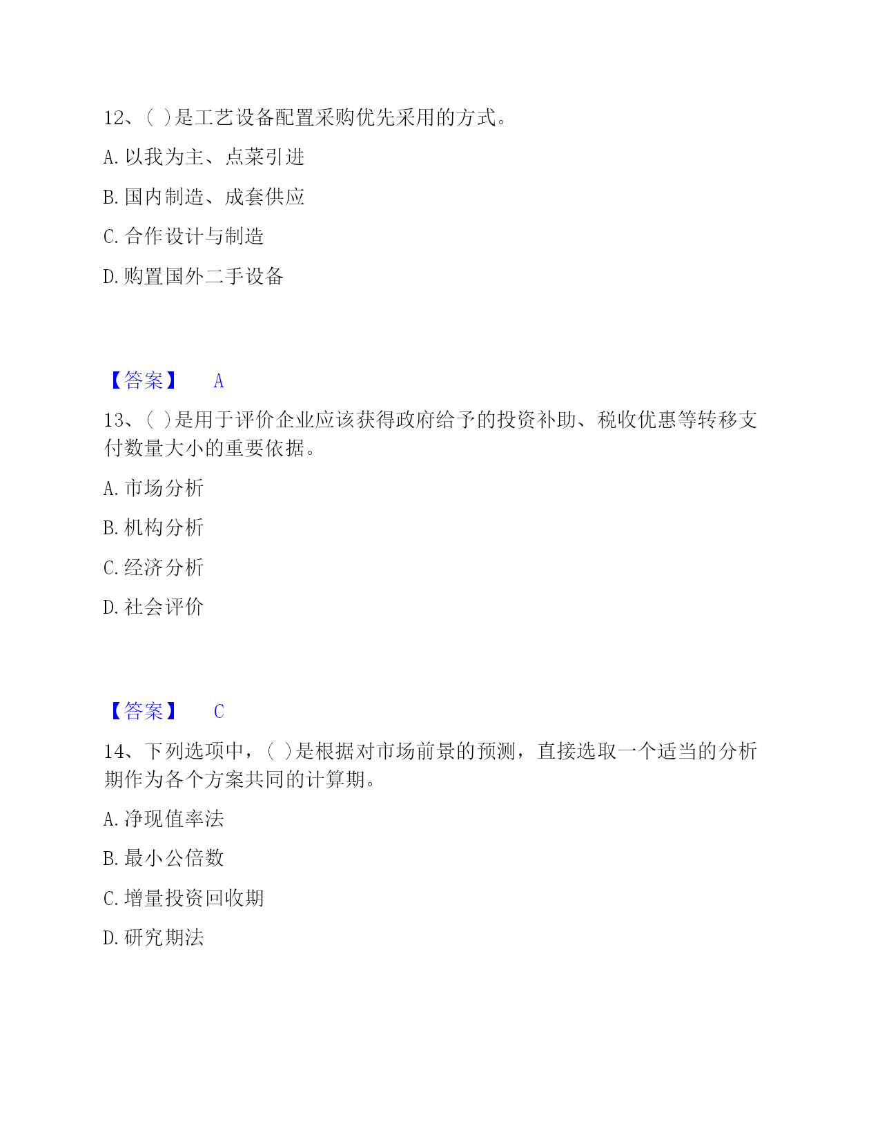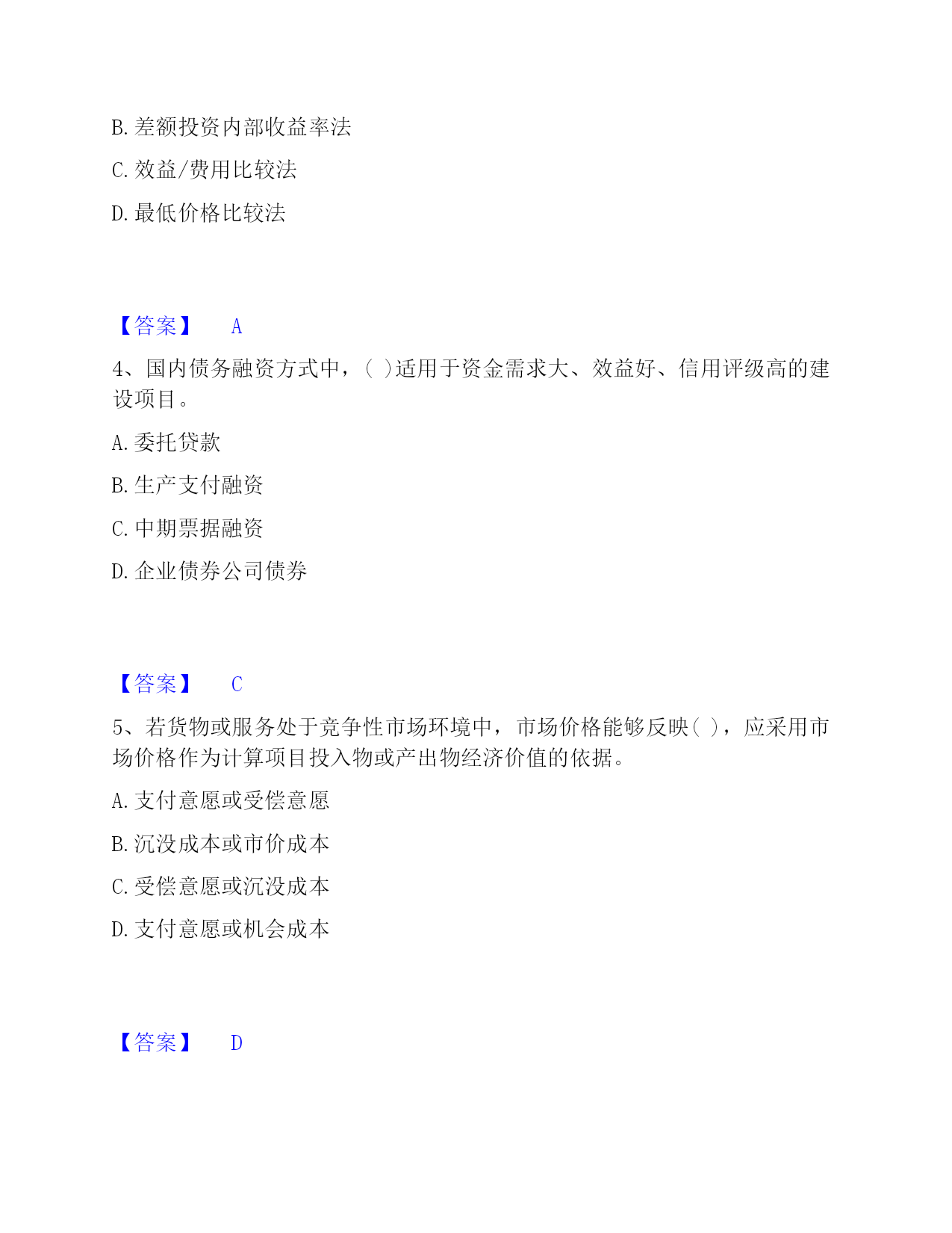2022-2023年投资项目管理师之投资建设项目决策模拟考试试卷A卷含答案单选题(共50题)1、对于项目用地要结合国家土地利用政策和生态环境条件去评价其土地占用的()。A.合理性B.必要性C.系统性D.针对性【答案】B2、当△FIRR(或△EIRR)()iA.大于B.小于C.大于或等于D.等于【答案】B3、下列选项中,()往往仅对项目进行初步的比选,没有考虑不同投资、不同收益、不同计算期对项目产生的影响。A.净现值比较法B.差额投资内部收益率法C.效益/费用比较法D.最低价格比较法【答案】A4、国内债务融资方式中,()适用于资金需求大、效益好、信用评级高的建设项目。A.委托贷款B.生产支付融资C.中期票据融资D.企业债券公司债券【答案】C5、若货物或服务处于竞争性市场环境中,市场价格能够反映(),应采用市场价格作为计算项目投入物或产出物经济价值的依据。A.支付意愿或受偿意愿B.沉没成本或市价成本C.受偿意愿或沉没成本D.支付意愿或机会成本【答案】D6、某企业在年初向银行贷款一笔资金,月利率1%,则在6月底偿还时,按单利和复利计算的利息应分别是本金的()。A.5%和5.10%B.6%和5.10%C.5%和6.15%D.6%和6.15%【答案】D7、项目投资回收期所需的时间,一般以()为单位。A.季度B.日C.年D.月【答案】C8、()是工艺设备配置采购优先采用的方式。A.以我为主、点菜引进B.国内制造、成套供应C.合作设计与制造D.购置国外二手设备【答案】A9、若名义利率一定,年有效利率与一年中计息周期数m的关系为()。A.计息周期增加,年有效利率不变B.计息周期增加,年有效利率减小C.计息周期增加,年有效利率增加D.计息周期减小,年有效利率增加【答案】C10、项目产品方案应以()为导向,根据目标市场来确定产品品种、数量、质量,产品方案应能适应市场多变的要求。A.市场需求B.市场总体结构C.市场供应D.价格波动【答案】A11、下列选项中,()的评估结论是项目立项的依据。A.可行性研究报告B.项目建议书C.项目申请报告D.项目技术方案【答案】B12、()是工艺设备配置采购优先采用的方式。A.以我为主、点菜引进B.国内制造、成套供应C.合作设计与制造D.购置国外二手设备【答案】A13、()是用于评价企业应该获得政府给予的投资补助、税收优惠等转移支付数量大小的重要依据。A.市场分析B.机构分析C.经济分析D.社会评价【答案】C14、下列选项中,()是根据对市场前景的预测,直接选取一个适当的分析期作为各个方案共同的计算期。A.净现值率法B.最小公倍数C.增量投资回收期D.研究期法【答案】D15、在市场容量较大,或是市场的地域特征和地域优势明显时,由于竞争压力较小,项目采用()显得较为有利。A.自身研制开发B.工艺技术的成套购买C.技术许可证交易D.合资经营【答案】C16、反映建设项目资本金财务盈利能力的动态指标是建设项目()。A.财务内部收益率B.财务净现值C.资本金净利润率D.资本金财务内部收益率【答案】D17、()是建设项目投资者为获得项目财产所有权和对项目的控制权而投入的资金,是建设项目成立的前提,是建设项目进行工程建设和生产运营的物质基础。A.建设项目资本金B.建设项目注册资金C.建设项目准资本金D.建设项目资本公积【答案】A18、没有考虑到设备规格、材质的差异,估算的准确度也不高的建设项目估算方法是()。A.生产能力指数法B.比例估算法C.朗格系数法D.指标估算法【答案】C19、偿债备付率是指项目在借款偿还期内,()与当期应还本付息金额的比值。A.销售收入B.利润总额C.可用于还本付息的资金D.税息前利润【答案】C20、下列选择中,()用于计算期不同的互斥方案的经济比选时,必须运用合理的方法把各方案换算为相同的计算期,在此基础上各方案就有了可比性,然后运用相关计算方法和评判准则进行经济比选。A.净年值法和费用年值法B.效益/费用比较法C.净现值法和费用现值法D.增量投资回收期法【答案】C21、下列选项中,()是指将废物直接作为原料进行利用或者对废物进行再生利用。A.再利用B.减量化C.资源化D.节约化【答案】C22、生产技术与主要设备的制造水平,与建设规模相关,确定建设规模,要研究该类产品生产技术的()。A.先进性和可得性B.可靠性和可得性C.可靠性和经济性D.经济性和科学性【答