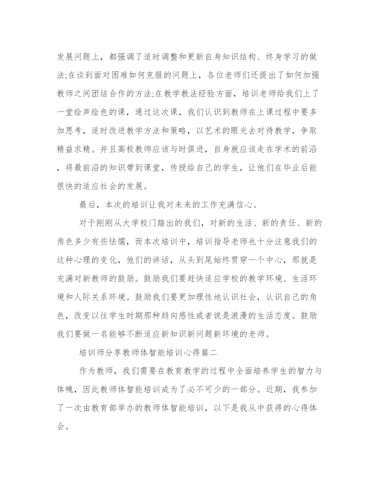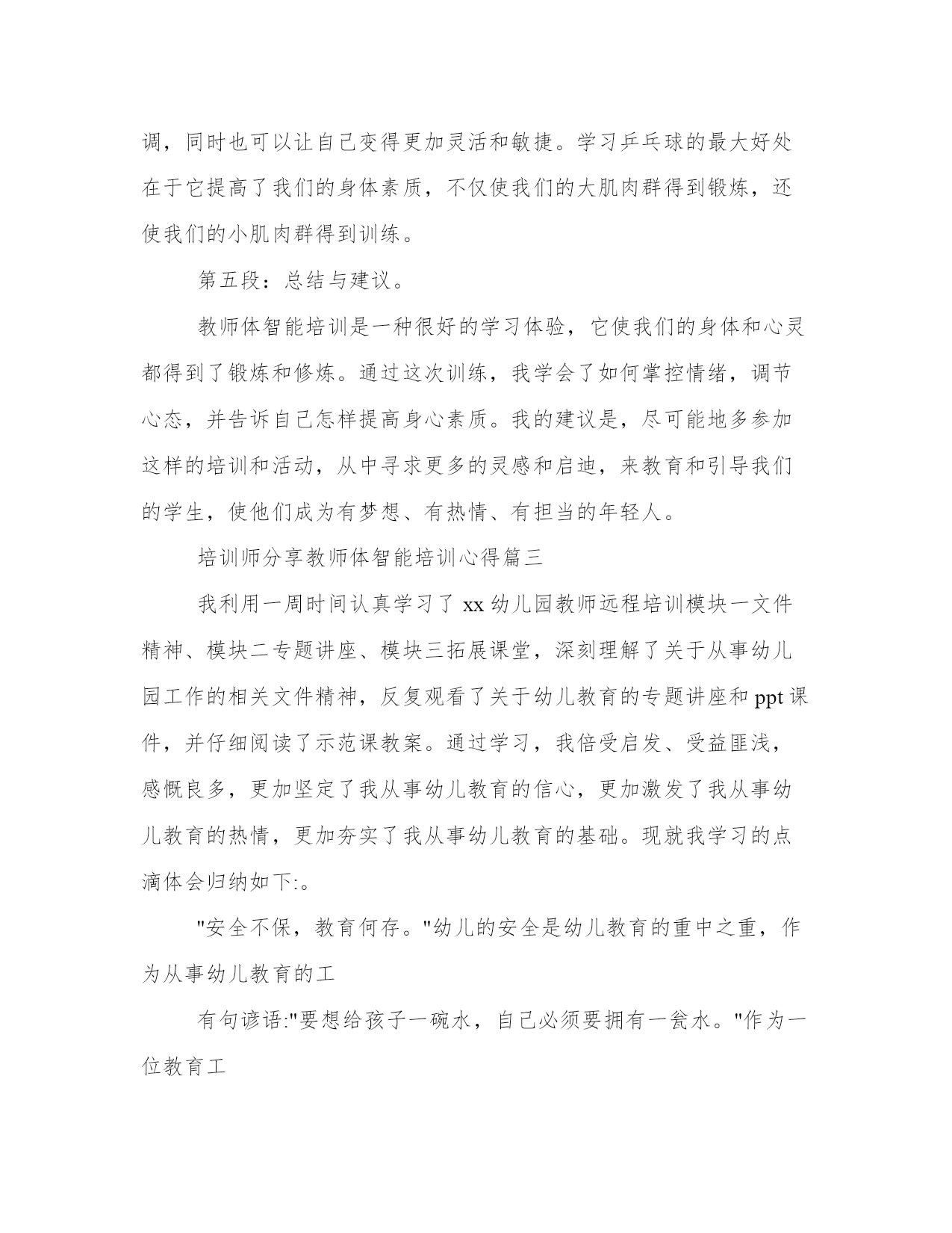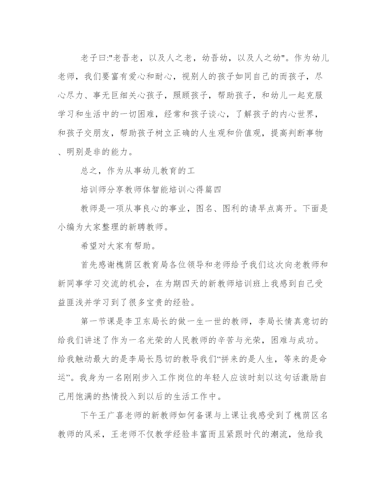 培训师分享教师体智能培训心得大全(24篇)发展创新精神是推动社会进步的驱动力之一。总结的语言要恰当、得体,我们应该根据不同的对象和场合来选择恰当的语气和用词。以下是一些总结的范文,供大家参考和借鉴。培训师分享教师体智能培训心得篇一只有多读书、多思考、多反思。才能真正提高教学能力,做一个智慧型的老师。下面是小编为大家整理的教师跟岗。希望对大家有帮助。年超不惑,愈益困惑;反思自我,渴望超越。十分幸运,我参加了20xx年广东省级骨干教师培训,10月25—11月14日走进深圳特级教师杨特的名师工作室跟岗学习。20天来,我严守纪律,从不掉队半天,每天都早出晚归,虽然很累,但快乐着。其间聆听了徐晋如、王文英、杨建华、吴泓、程少堂等专家、教授的讲座;在深圳多间学校听了七节优质示范课;完成了由谭海生教授主持的杨特初中生活。作文。的实践与分析课题。开题报告。;在杨特主持下,全体学员在文言文教学,阅读教学、诗歌教学、作文教学等方面进行了研讨,并上了公开课,本人收获很大。领略名师风范,碰撞智慧火花。这次跟岗学习,让我充分领略到专家与名师那份独特的魅力——广博的知识积累和深厚的文化底蕴。最幸运是遇到名师杨特。她学识渊博,她人品谦逊,她平易近人。在她带领下,我们十三个来自不同地区的学员成为一个亲密和谐的学习大家庭,在跟岗学习中,大家认真听课,坦诚评课,互相切磋教学技艺,认真准备公开课,互相交流听课心得、书写教学反思,碰撞智慧火花。在紧张忙碌的学习生活中,建立了一种坦诚互助、共同提高的良好氛围。走出职业倦怠,更新教育理念。本人从教20多年,已经失去了初为人师的激情。这次跟岗学习,特别是吴泓老师的“博客引领教师成长”的讲座;程少堂教授“名师成长与语文教学”的讲座;杨特老师对阅读教学、作文教学的见解和做法等。我从中了解了先进的教育教学理念、现代教育观、教师观、学生观。走出了职业的倦怠。给我以后的课堂教学指明了一条新的阳光道,认识到只有多读书、多思考、多反思。才能真正提高教学能力,做一个智慧型的老师。培训时间是有限的,但我所得到的是无限的,相信今天的收获,会在不久的明天编织一幅“喜看稻菽千重浪,倾听幼竹拔节声”的丰收图。16天的教师跟岗培训即将过去,可是这次跟岗培训却给我留下了深刻的印象。12月2日,我来到了东莞莞城中心小学,开始为期十二天的跟岗学习。莞城中心小学制定了详细的培训计划,考虑了我们学员的培训活动、生活各个方面的点点滴滴,并按照计划有条不紊地进行各项培训活动,如文化考察、学员研修以及学员展示课等。各项培训活动紧张而有序地进行,得到了我们培训学员的一致好评。在这里,我享受了东莞莞城中心小学的教育资源,与许多名师,专家的接触交流,听了梁惠权校长介绍学校办学理念与特色,听了苏庆南主任以考级促阅读、以活动激兴趣的讲座,听了周奇、彭才华、黄燕芬等品牌老师的课,还观摩了第二课堂教学。我感受到他们“悦纳至正”的办学理念不折不扣地付诸实施,而且获得成功,让我大开眼界,收益良多。在跟岗学习中,我感受了先进的教育教学理念,名师的成功经验,提升了自身的教育教学水平。在三位品牌老师的带领下和指导下,我们对观摩课进行讨论和点评,我们的跟岗学习,内容丰富,形式多样。这次的跟岗培训学习让我对教学理念有了更加深刻的理解,教学能力得到了一次新的提升。且在三位品牌老师的指导下我将所学的理论与实践结合,上回报课,听课评课,上课反思等等。通过学习收获颇丰,感触良多。在黄燕芬老师的课上,让我知道注重识字教学。她充分相信学生,放手让孩子自己识字,互帮互学。在生生互动,师生互动中,学生体验到了学习的快乐。在彭才华老师的课上,让我领略到课堂的语言的艺术美,彭老师教学时的朗读指导很有技巧,随机应变能力强,真令我佩服!我深深地体会到了老师的课堂语言是一门艺术。而在周奇老师的课身上,让我知道用聊天的形式可以善于激发学生的情感。课堂上没有约束,说实在,我喜欢这样的聊天,亲切而又自然,没有师生之分,没有优差之界,这种聊天形式的课堂,值得我去深入探讨。还有,听了周奇老师的作文课以及彭才华老师的“广快作文”讲座,我心里有底了,我要把他们这种作文模式带回去,也让我们的学校里吹起这一鼓作文风。培训活动中,我们也展示了一堂又一堂充满语文韵味的好课。我和其他学员团结互助,形成了良好的学习氛围,每一次研讨、交流活动都是那么真诚、朴实,大家在一起讨论教学中的困惑,交流教学中的体验,仿佛是彼此心与心的交流,更是大家用情感谱写的一曲值得回味的篇章。在我上伯牙绝弦的教学,在整个教学中,自然流畅,音乐、画面不过分,拓展恰当。周奇老师在点评中,向我提出了一些需要改进的地方。经他一点拨,进一步发现了自己身上存在的不足,如正音方面还没注意,在追求答案的过程还有一个关键有价值的鼓励,对知音的内涵还