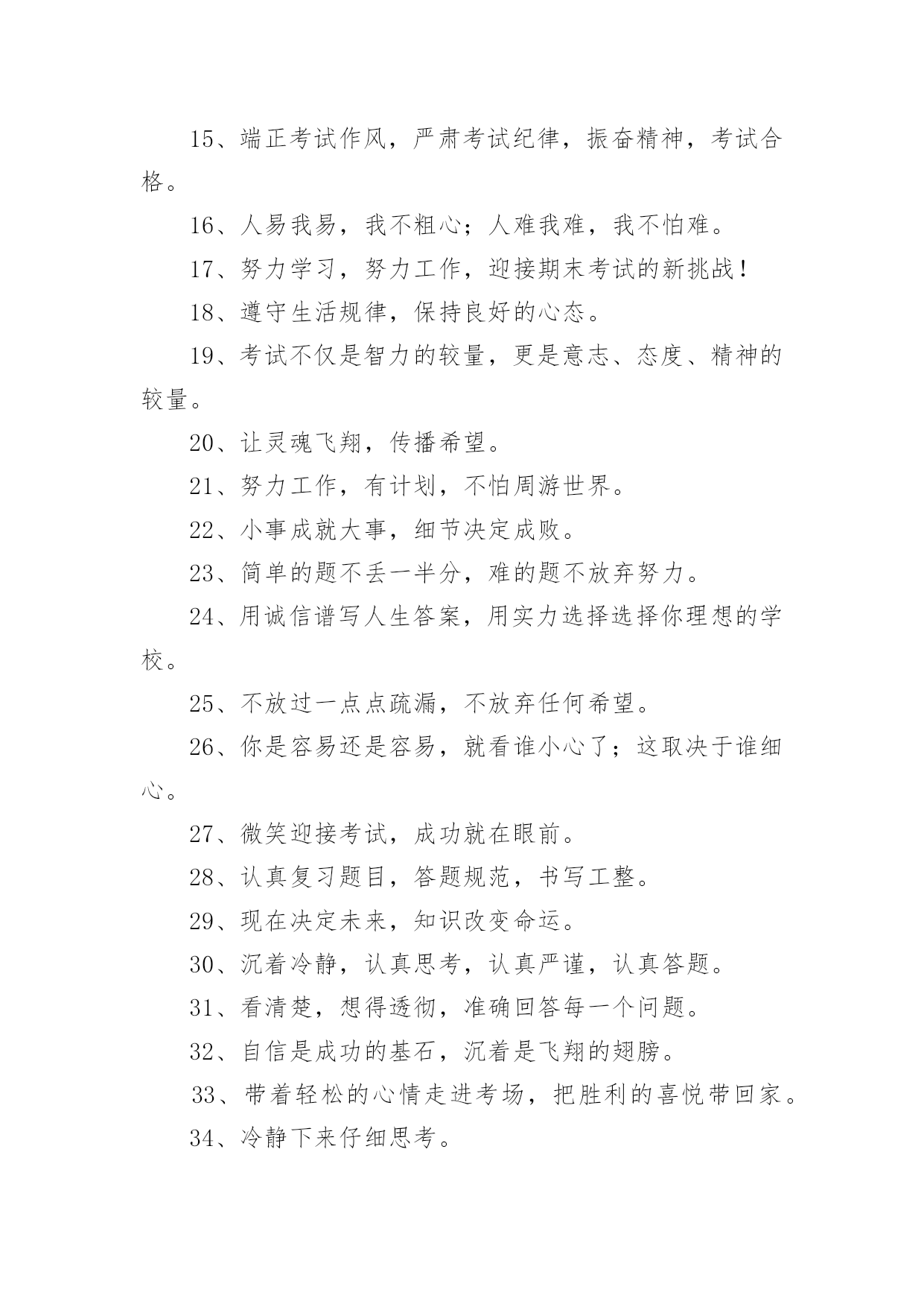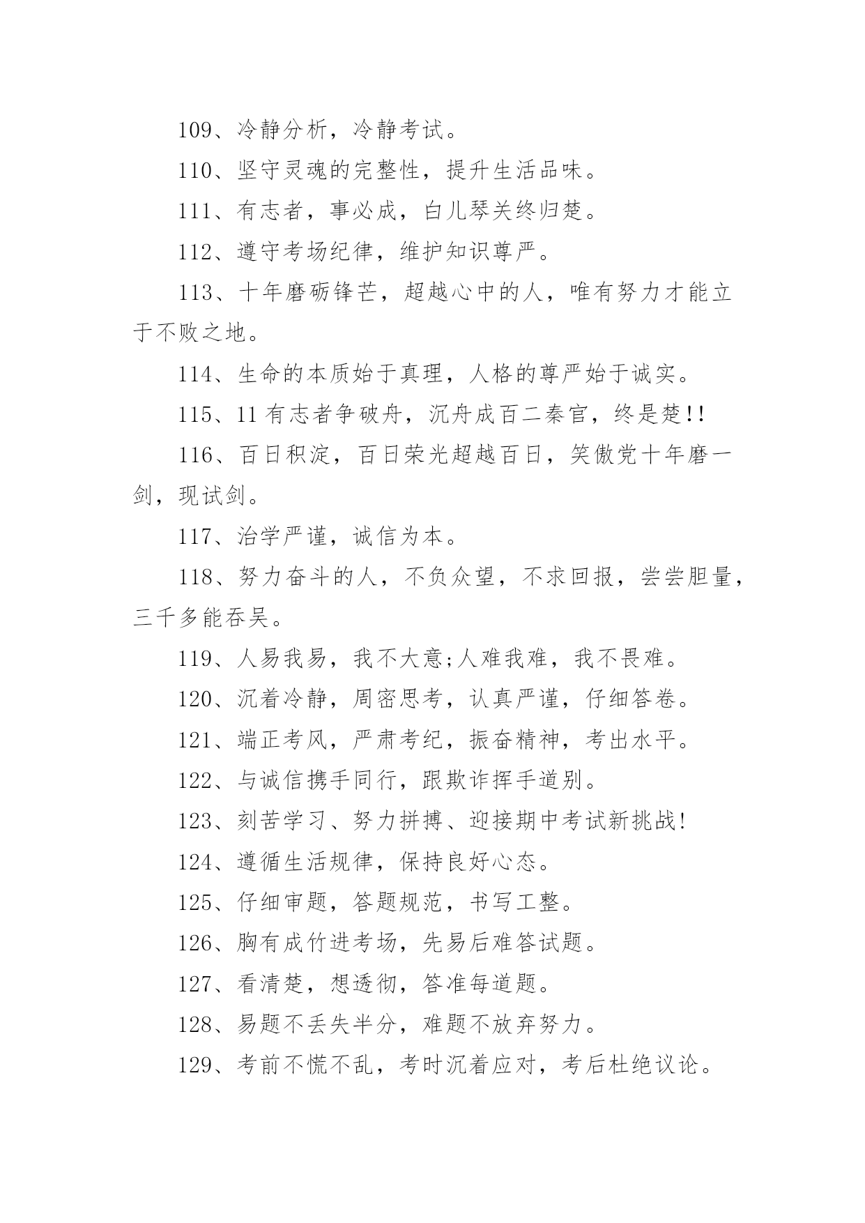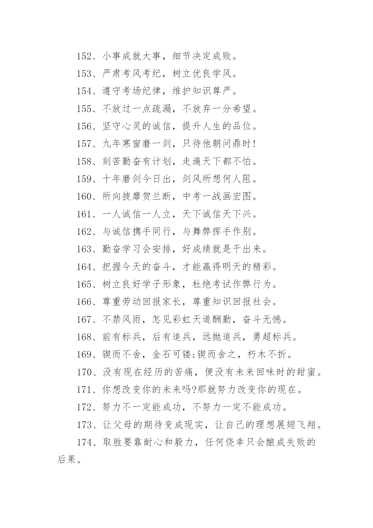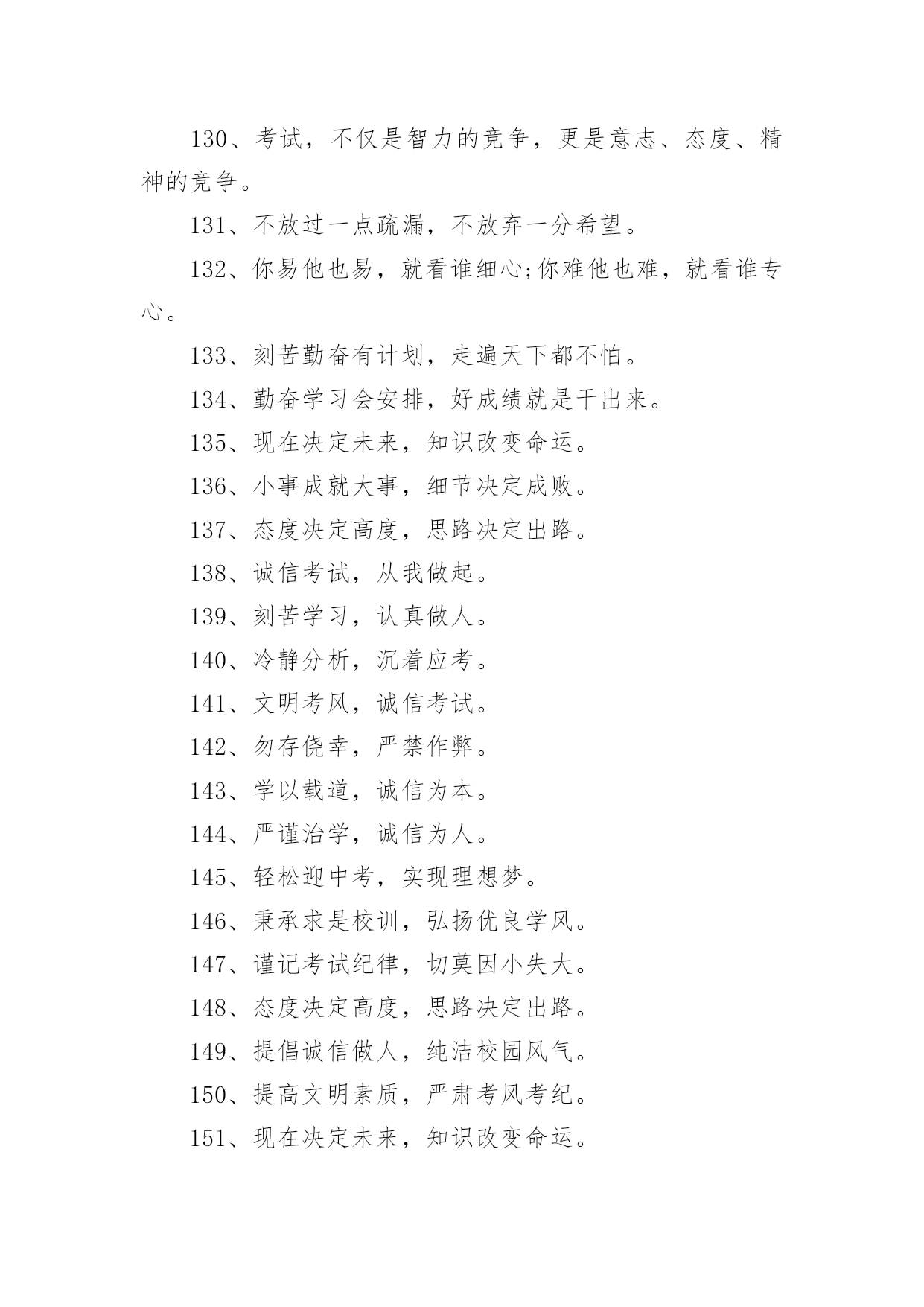 考试励志标语考试励志标语590句在日常学习、工作抑或是生活中,大家一定没少看到过标语吧,标语对人们的思维是有一定的感性作用的。你还在找寻优秀经典的标语吗?下面是小编帮大家整理的考试励志标语,欢迎大家借鉴与参考,希望对大家有所帮助。1、把握今天的奋斗,才能赢得明天的精彩。2、十年磨一剑今日出,谁来挡剑风。3、提倡诚实正直,营造纯净的校园氛围。4、细节的完整性尤为真实,灵魂的纯洁更显得弥足珍贵。5、睁开双眼,开始比赛,睁开双眼,学会关灯。6、不放过一点疏漏,不放弃任何希望。7、冷静分析,冷静对待考试。8、坚守灵魂的完整性,提升生活品味。9、有志者,事可成,白儿琴关终归楚。10、遵守考场纪律,维护知识尊严。11、十年磨砺锋芒,超越心中的人,唯有努力才能立于不败之地。12、生命的本质从真理开始,人格的尊严从诚实开始。13、百日积淀,百日荣光超越百日,笑傲党十年磨一剑,剑锋现试。14、治学严谨,诚信为本。15、端正考试作风,严肃考试纪律,振奋精神,考试合格。16、人易我易,我不粗心;人难我难,我不怕难。17、努力学习,努力工作,迎接期末考试的新挑战!18、遵守生活规律,保持良好的心态。19、考试不仅是智力的较量,更是意志、态度、精神的较量。20、让灵魂飞翔,传播希望。21、努力工作,有计划,不怕周游世界。22、小事成就大事,细节决定成败。23、简单的题不丢一半分,难的题不放弃努力。24、用诚信谱写人生答案,用实力选择选择你理想的学校。25、不放过一点点疏漏,不放弃任何希望。26、你是容易还是容易,就看谁小心了;这取决于谁细心。27、微笑迎接考试,成功就在眼前。28、认真复习题目,答题规范,书写工整。29、现在决定未来,知识改变命运。30、沉着冷静,认真思考,认真严谨,认真答题。31、看清楚,想得透彻,准确回答每一个问题。32、自信是成功的基石,沉着是飞翔的翅膀。33、带着轻松的心情走进考场,把胜利的喜悦带回家。34、冷静下来仔细思考。35、诚信行事,告别欺诈。36、自信进考场,先答后难。37、我自信,我成功。38、秉承求真务实、弘扬学风的校训。39、考前不要慌张,考中要冷静应对,考后避免讨论。40、信心是力量的源泉,坚持是成功的保证。41、让父母的期望成为现实,让理想飞扬。42、勤学苦练,成绩好。43、十年磨一剑为忌,六月试炼是真的。44、从容应对中考,微笑面对生活。微笑迎接考试,成功就在眼前。45、成功靠努力和汗水,靠技巧和方法。46、谁英雄睡好汉,80天后看一看。47、树信心振足精神,比成绩不甘落后。48、时刻努力着,为铸就中考新辉煌而努力奋斗!49、时间紧,任务重,真投入,出佳绩。50、失掉了现在,也就没有了未来。51、山外有山,楼外有楼,没有最好,只有更好。52、弱者失机遇,强者抓机遇,智者抢机遇。53、若要今生不虚度,立志自当少年时。54、让父母的期待变成现实,让自己的理想展翅飞翔。55、取胜要靠耐心和毅力,任何侥幸只会酿成失败的后果。56、前有标兵,后有追兵,远抛追兵,勇超标兵。57、你想活得更有质量、更有层次、更有品位吗?那就努力改变你的现状!58、没有现在经历的苦痛,便没有未来回味时的甜蜜。59、快乐把时间变得很短,苦难把岁月拉得很长。60、脚踏实地搞复习,胸有成竹迎挑战。61、给自己撑起一方未来的天空,给父母送去一片希望的慰籍。62、给你翅膀,你能飞多高?63、分分秒秒做些有益的事,每时每刻戒掉无聊的行为64、多一分努力,多一分成绩,多一点希望,多一些欢乐。65、当务之急,莫过于戒骄戒躁戒浮戒松,当今之时,莫重于思危思进思强思胜。66、成功的秘诀:不断追求,奋力拼搏,敢于超越。67、“干净、安静、竞争、尊重”牢记“比较、学习、赶超、超越”迎接挑战。68、差异发生在空闲时间,结果取决于点点滴滴的积累。69、摒弃侥幸的想法,必须百炼成钢;厚分而秒,只为一鸣惊人。70、没有比努力更快乐,没有比基础更进步,没有比好结果更多。71、不爬山,不知天高;不面对深溪,不知大地之厚。72、没有思考,就是混乱;不问就没有收获;如果你不问,你不知道。73、无论山多险峻,不畏艰险的人,总有办法攀登的。74、风再快,山河也不会向风低头。75、冷静回答问题,多思考;不要急于交卷,再检查一遍。76、坚持到底,不懈追求;优异的成绩足以让人期待。77、狠抓基础是成功的基础,坚持是胜利的保证。78、积极思考创造积极生活,消极思考创造消极生活。79、基础知识要扎实,重点知识要巩固,难点知识要务实。80、今天多加一点努力,明天一定会收获成功。81、能烧瓷不是神,有志者能学精艺。82、考试不仅是智力的较量,更是意志、态度、精神的较量。83、理想是力量的源泉,智慧的摇篮,冲锋的旗帜,荆棘之剑。84、成功的秘诀:不断追求,努力工作,敢于超越。85、成功的人最不