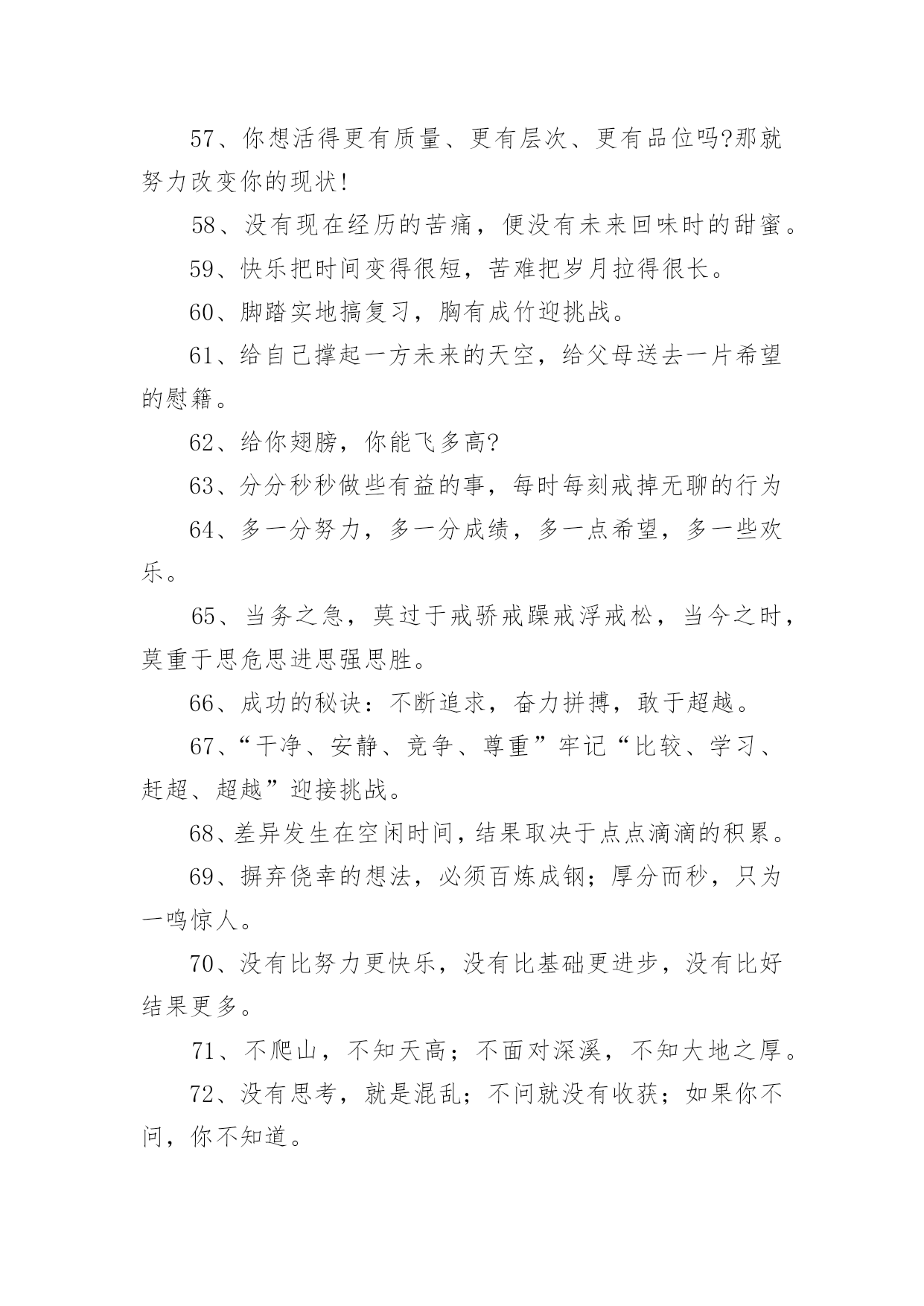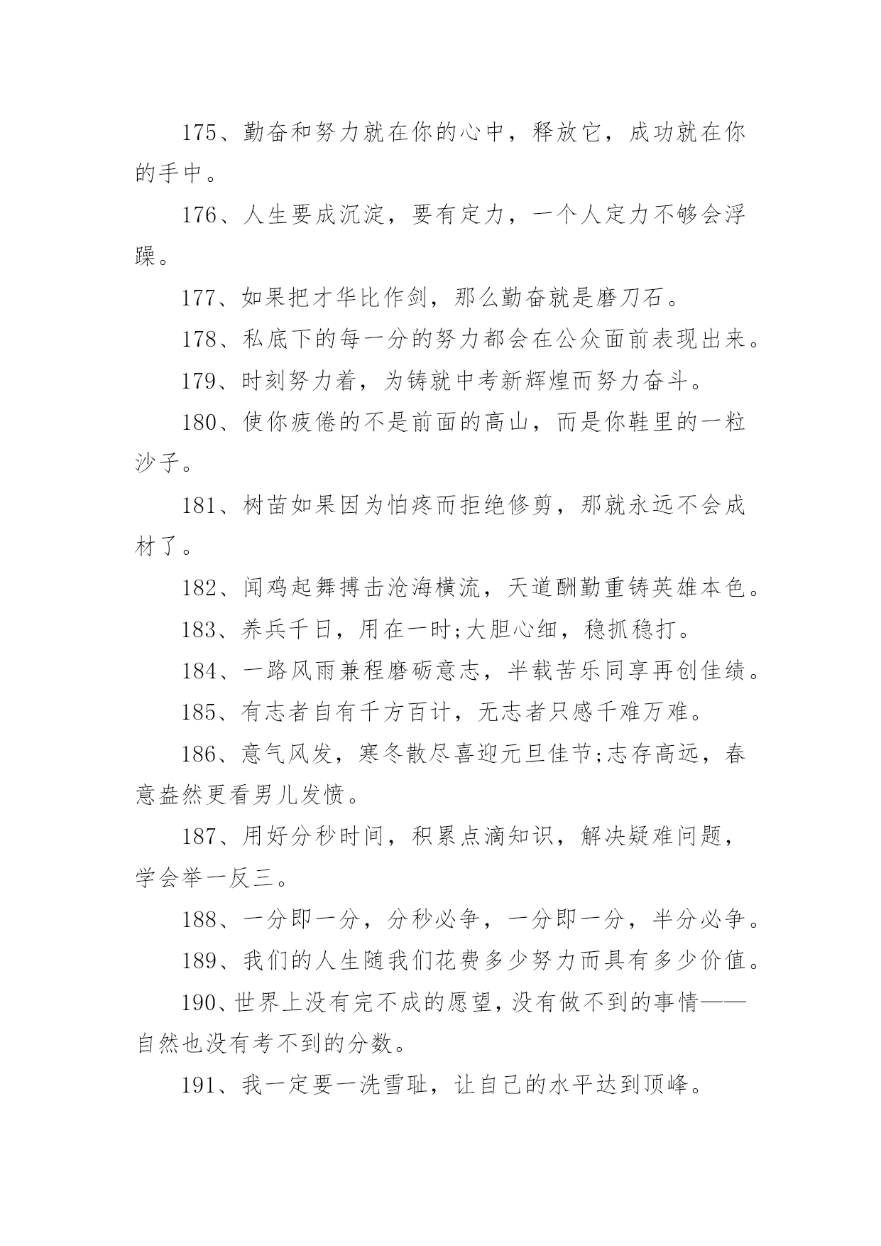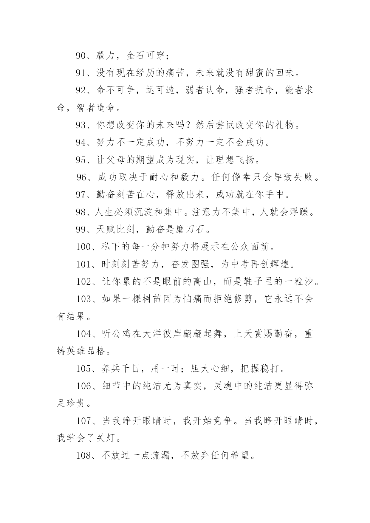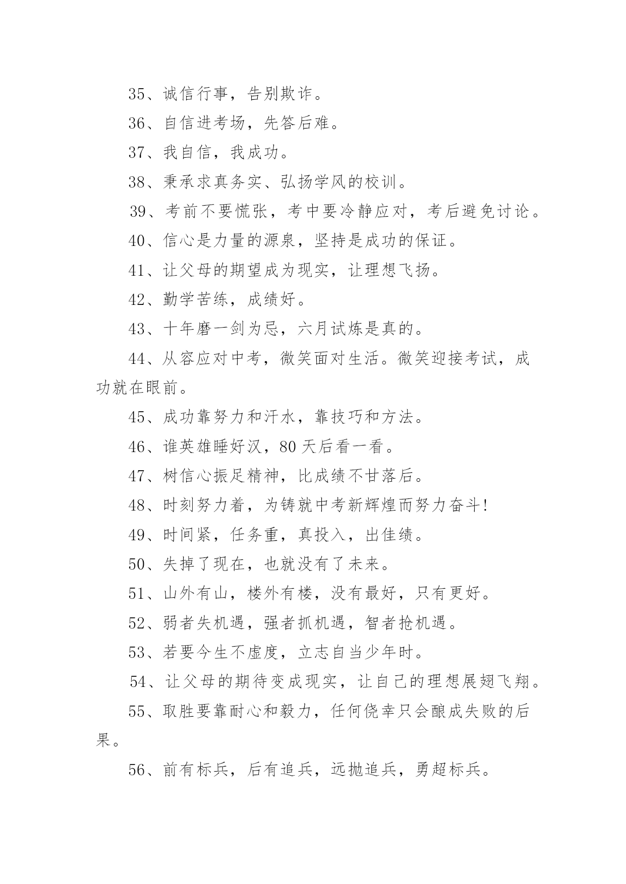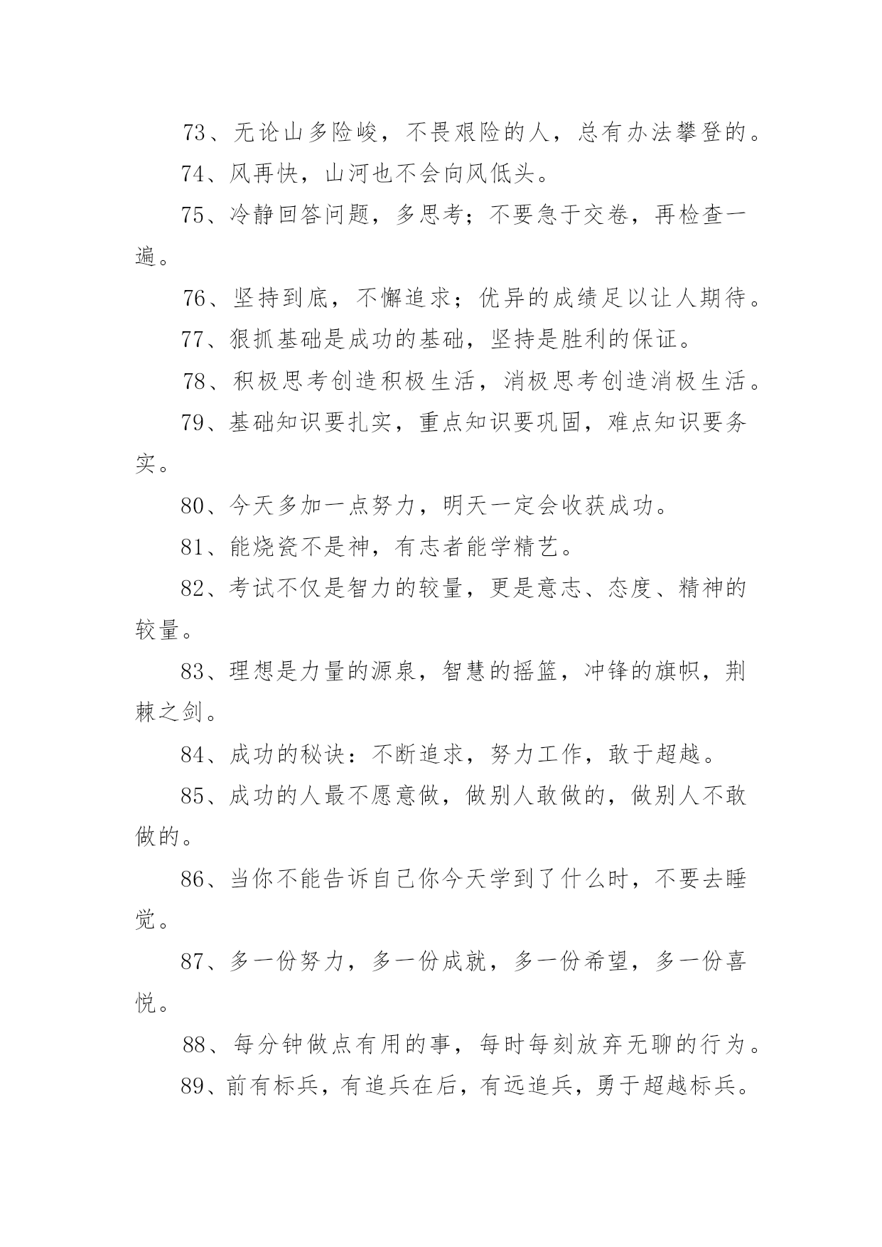 考试励志标语考试励志标语590句在日常学习、工作抑或是生活中,大家一定没少看到过标语吧,标语对人们的思维是有一定的感性作用的。你还在找寻优秀经典的标语吗?下面是小编帮大家整理的考试励志标语,欢迎大家借鉴与参考,希望对大家有所帮助。1、把握今天的奋斗,才能赢得明天的精彩。2、十年磨一剑今日出,谁来挡剑风。3、提倡诚实正直,营造纯净的校园氛围。4、细节的完整性尤为真实,灵魂的纯洁更显得弥足珍贵。5、睁开双眼,开始比赛,睁开双眼,学会关灯。6、不放过一点疏漏,不放弃任何希望。7、冷静分析,冷静对待考试。8、坚守灵魂的完整性,提升生活品味。9、有志者,事可成,白儿琴关终归楚。10、遵守考场纪律,维护知识尊严。11、十年磨砺锋芒,超越心中的人,唯有努力才能立于不败之地。12、生命的本质从真理开始,人格的尊严从诚实开始。13、百日积淀,百日荣光超越百日,笑傲党十年磨一剑,剑锋现试。14、治学严谨,诚信为本。15、端正考试作风,严肃考试纪律,振奋精神,考试合格。16、人易我易,我不粗心;人难我难,我不怕难。17、努力学习,努力工作,迎接期末考试的新挑战!18、遵守生活规律,保持良好的心态。19、考试不仅是智力的较量,更是意志、态度、精神的较量。20、让灵魂飞翔,传播希望。21、努力工作,有计划,不怕周游世界。22、小事成就大事,细节决定成败。23、简单的题不丢一半分,难的题不放弃努力。24、用诚信谱写人生答案,用实力选择选择你理想的学校。25、不放过一点点疏漏,不放弃任何希望。26、你是容易还是容易,就看谁小心了;这取决于谁细心。27、微笑迎接考试,成功就在眼前。28、认真复习题目,答题规范,书写工整。29、现在决定未来,知识改变命运。30、沉着冷静,认真思考,认真严谨,认真答题。31、看清楚,想得透彻,准确回答每一个问题。32、自信是成功的基石,沉着是飞翔的翅膀。33、带着轻松的心情走进考场,把胜利的喜悦带回家。34、冷静下来仔细思考。35、诚信行事,告别欺诈。36、自信进考场,先答后难。37、我自信,我成功。38、秉承求真务实、弘扬学风的校训。39、考前不要慌张,考中要冷静应对,考后避免讨论。40、信心是力量的源泉,坚持是成功的保证。41、让父母的期望成为现实,让理想飞扬。42、勤学苦练,成绩好。43、十年磨一剑为忌,六月试炼是真的。44、从容应对中考,微笑面对生活。微笑迎接考试,成功就在眼前。45、成功靠努力和汗水,靠技巧和方法。46、谁英雄睡好汉,80天后看一看。47、树信心振足精神,比成绩不甘落后。48、时刻努力着,为铸就中考新辉煌而努力奋斗!49、时间紧,任务重,真投入,出佳绩。50、失掉了现在,也就没有了未来。51、山外有山,楼外有楼,没有最好,只有更好。52、弱者失机遇,强者抓机遇,智者抢机遇。53、若要今生不虚度,立志自当少年时。54、让父母的期待变成现实,让自己的理想展翅飞翔。55、取胜要靠耐心和毅力,任何侥幸只会酿成失败的后果。56、前有标兵,后有追兵,远抛追兵,勇超标兵。57、你想活得更有质量、更有层次、更有品位吗?那就努力改变你的现状!58、没有现在经历的苦痛,便没有未来回味时的甜蜜。59、快乐把时间变得很短,苦难把岁月拉得很长。60、脚踏实地搞复习,胸有成竹迎挑战。61、给自己撑起一方未来的天空,给父母送去一片希望的慰籍。62、给你翅膀,你能飞多高?63、分分秒秒做些有益的事,每时每刻戒掉无聊的行为64、多一分努力,多一分成绩,多一点希望,多一些欢乐。65、当务之急,莫过于戒骄戒躁戒浮戒松,当今之时,莫重于思危思进思强思胜。66、成功的秘诀:不断追求,奋力拼搏,敢于超越。67、“干净、安静、竞争、尊重”牢记“比较、学习、赶超、超越”迎接挑战。68、差异发生在空闲时间,结果取决于点点滴滴的积累。69、摒弃侥幸的想法,必须百炼成钢;厚分而秒,只为一鸣惊人。70、没有比努力更快乐,没有比基础更进步,没有比好结果更多。71、不爬山,不知天高;不面对深溪,不知大地之厚。72、没有思考,就是混乱;不问就没有收获;如果你不问,你不知道。73、无论山多险峻,不畏艰险的人,总有办法攀登的。74、风再快,山河也不会向风低头。75、冷静回答问题,多思考;不要急于交卷,再检查一遍。76、坚持到底,不懈追求;优异的成绩足以让人期待。77、狠抓基础是成功的基础,坚持是胜利的保证。78、积极思考创造积极生活,消极思考创造消极生活。79、基础知识要扎实,重点知识要巩固,难点知识要务实。80、今天多加一点努力,明天一定会收获成功。81、能烧瓷不是神,有志者能学精艺。82、考试不仅是智力的较量,更是意志、态度、精神的较量。83、理想是力量的源泉,智慧的摇篮,冲锋的旗帜,荆棘之剑。84、成功的秘诀:不断追求,努力工作,敢于超越。85、成功的人最不