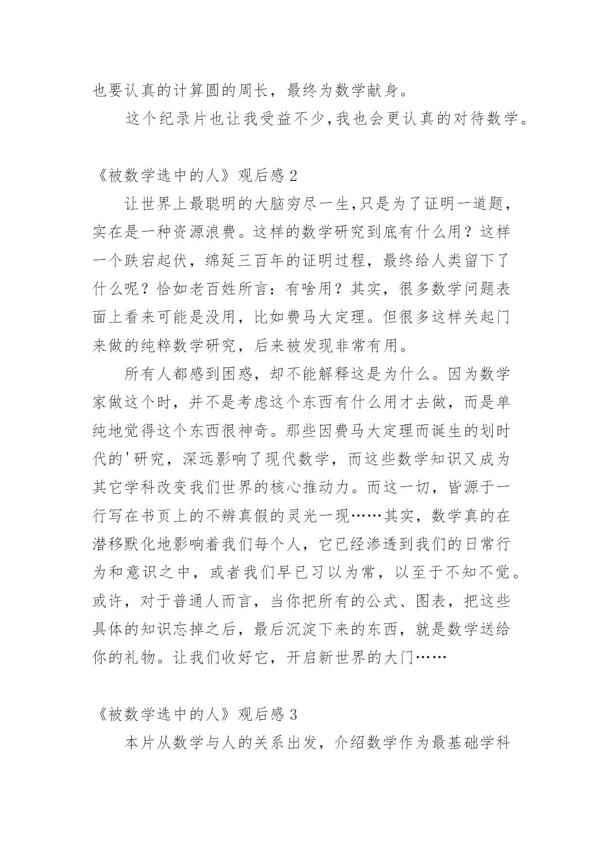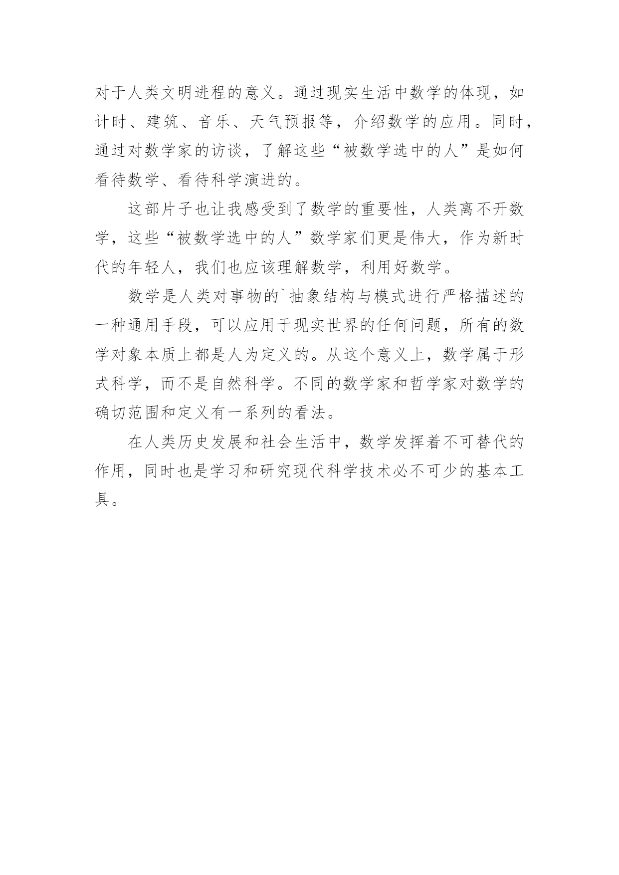 《被数学选中的人》观后感当品味完一部影视作品后,你有什么总结呢?为此就要认真思考观后感如何写了。那么你真的会写观后感吗?以下是小编帮大家整理的《被数学选中的人》观后感,欢迎阅读,希望大家能够喜欢。《被数学选中的人》观后感1我收看了《被数学选中的人》这一系列的纪录片后,收获很多,也很受震撼。我首先了解了数学的本质,在第一集的时候,我从另一个角度了解了数学,发现数学竟然是那么神奇又令人捉摸不透的东西。从一幅幅包含着历史岁月痕迹的画面中,我发现原来古时候每个地方的数学都是不一样的。苏轼说过:“横看成岭侧成峰,远近高低各不同。”也就是说,从不同角度来看,数学都是不一样的。不仅如此,在纪录片中,还有许多“被数学选中的.人”发表了他们对数学的看法。他们中有人说“只要你对一件事感兴趣,那么多难你都会想要完成。但是如果你不感兴趣,多简单的事你都会懒得做。”这句话给我的感触很深,在从今往后的学习中,我也会努力让自己对每一门学科都感兴趣,努力做好每一件事。最后,在这个纪录片中,我对那些古代的数学家印象也很深。不管是阿基米德还是欧拉等等那些数学家,他们都有一颗热爱数学的心,其中,阿基米德就算在生命的最后一刻,也要认真的计算圆的周长,最终为数学献身。这个纪录片也让我受益不少,我也会更认真的对待数学。《被数学选中的人》观后感2让世界上最聪明的大脑穷尽一生,只是为了证明一道题,实在是一种资源浪费。这样的数学研究到底有什么用?这样一个跌宕起伏,绵延三百年的证明过程,最终给人类留下了什么呢?恰如老百姓所言:有啥用?其实,很多数学问题表面上看来可能是没用,比如费马大定理。但很多这样关起门来做的纯粹数学研究,后来被发现非常有用。所有人都感到困惑,却不能解释这是为什么。因为数学家做这个时,并不是考虑这个东西有什么用才去做,而是单纯地觉得这个东西很神奇。那些因费马大定理而诞生的划时代的'研究,深远影响了现代数学,而这些数学知识又成为其它学科改变我们世界的核心推动力。而这一切,皆源于一行写在书页上的不辨真假的灵光一现……其实,数学真的在潜移默化地影响着我们每个人,它已经渗透到我们的日常行为和意识之中,或者我们早已习以为常,以至于不知不觉。或许,对于普通人而言,当你把所有的公式、图表,把这些具体的知识忘掉之后,最后沉淀下来的东西,就是数学送给你的礼物。让我们收好它,开启新世界的大门……《被数学选中的人》观后感3本片从数学与人的关系出发,介绍数学作为最基础学科对于人类文明进程的意义。通过现实生活中数学的体现,如计时、建筑、音乐、天气预报等,介绍数学的应用。同时,通过对数学家的访谈,了解这些“被数学选中的人”是如何看待数学、看待科学演进的。这部片子也让我感受到了数学的重要性,人类离不开数学,这些“被数学选中的人”数学家们更是伟大,作为新时代的年轻人,我们也应该理解数学,利用好数学。数学是人类对事物的`抽象结构与模式进行严格描述的一种通用手段,可以应用于现实世界的任何问题,所有的数学对象本质上都是人为定义的。从这个意义上,数学属于形式科学,而不是自然科学。不同的数学家和哲学家对数学的确切范围和定义有一系列的看法。在人类历史发展和社会生活中,数学发挥着不可替代的作用,同时也是学习和研究现代科学技术必不可少的基本工具。