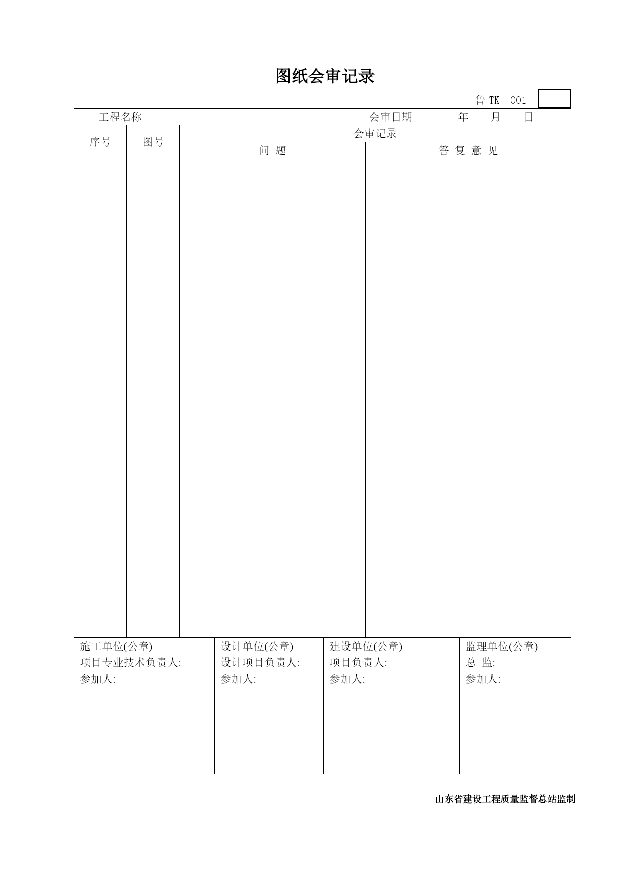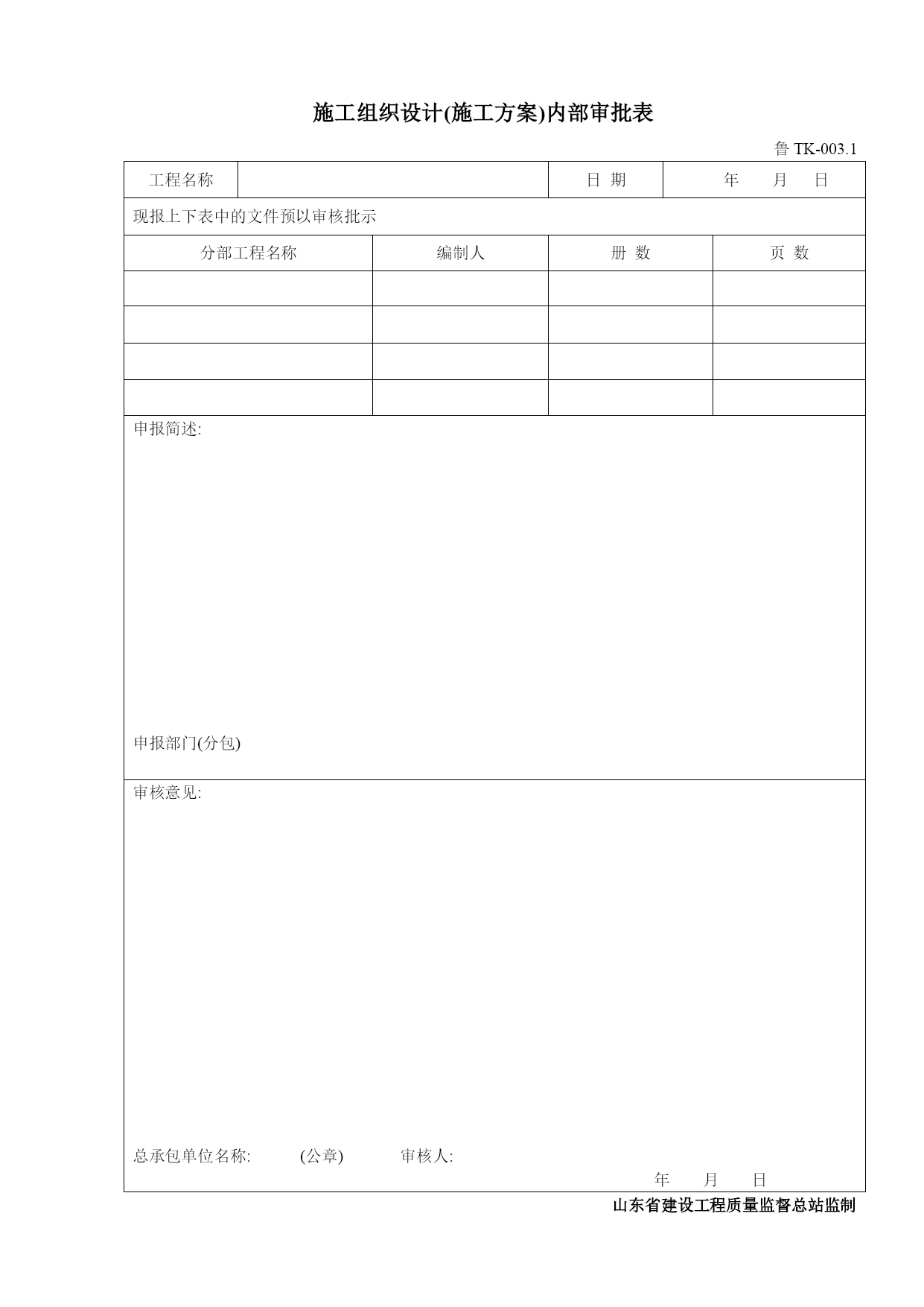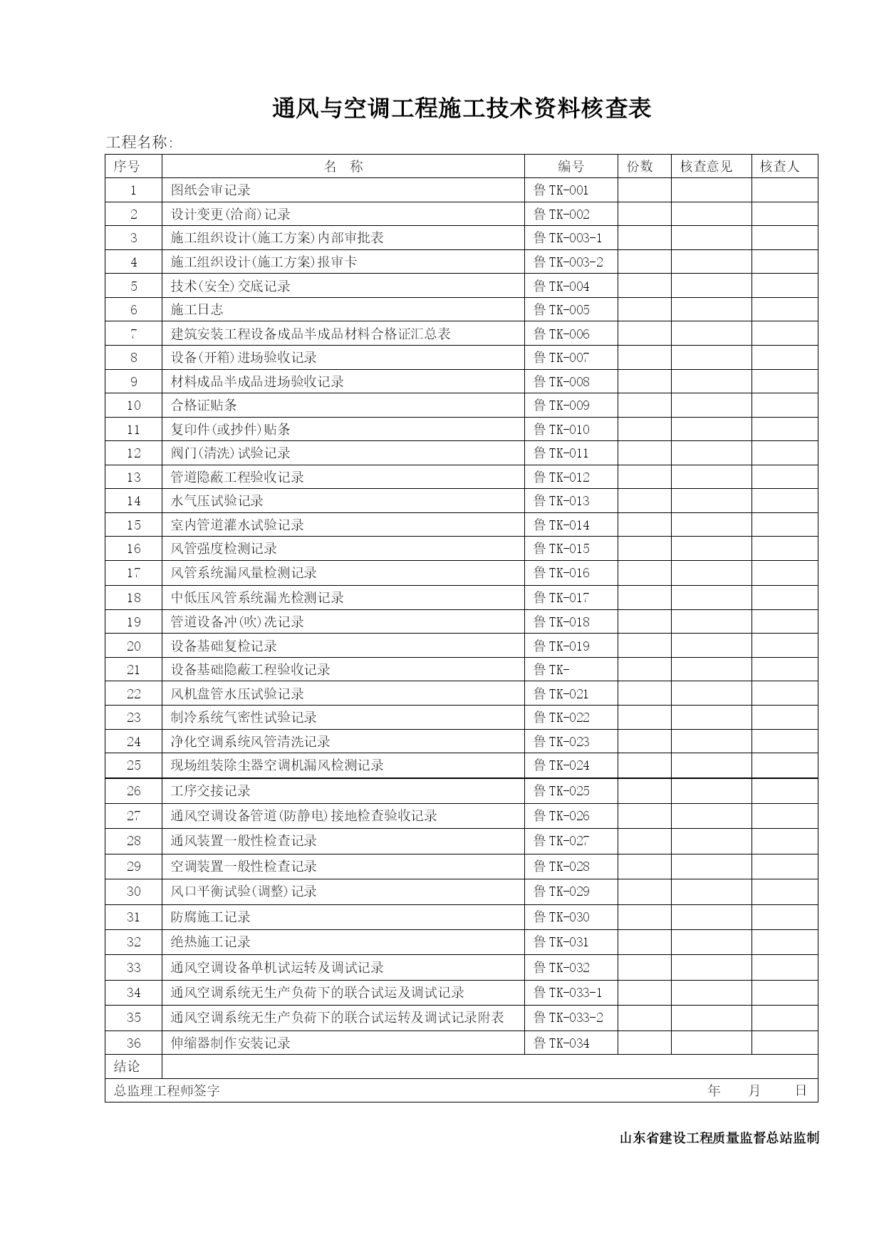 通风与空调工程施工技术资料及验收资料表格模板优质资料(可以直接使用,可编辑优质资料,欢迎下载)通风与空调工程施工技术资料工程名称建设单位监理单位施工单位项目专业技术负责人编制人竣工日期年月日通风与空调工程施工技术资料核查表工程名称:序号名称编号份数核查意见核查人1图纸会审记录鲁TK-0012设计变更(洽商)记录鲁TK-0023施工组织设计(施工方案)内部审批表鲁TK-003-14施工组织设计(施工方案)报审卡鲁TK-003-25技术(安全)交底记录鲁TK-0046施工日志鲁TK-0057建筑安装工程设备成品半成品材料合格证汇总表鲁TK-0068设备(开箱)进场验收记录鲁TK-0079材料成品半成品进场验收记录鲁TK-00810合格证贴条鲁TK-00911复印件(或抄件)贴条鲁TK-01012阀门(清洗)试验记录鲁TK-01113管道隐蔽工程验收记录鲁TK-01214水气压试验记录鲁TK-01315室内管道灌水试验记录鲁TK-01416风管强度检测记录鲁TK-01517风管系统漏风量检测记录鲁TK-01618中低压风管系统漏光检测记录鲁TK-01719管道设备冲(吹)冼记录鲁TK-01820设备基础复检记录鲁TK-01921设备基础隐蔽工程验收记录鲁TK-22风机盘管水压试验记录鲁TK-02123制冷系统气密性试验记录鲁TK-02224净化空调系统风管清洗记录鲁TK-02325现场组装除尘器空调机漏风检测记录鲁TK-02426工序交接记录鲁TK-02527通风空调设备管道(防静电)接地检查验收记录鲁TK-02628通风装置一般性检查记录鲁TK-02729空调装置一般性检查记录鲁TK-02830风口平衡试验(调整)记录鲁TK-02931防腐施工记录鲁TK-03032绝热施工记录鲁TK-03133通风空调设备单机试运转及调试记录鲁TK-03234通风空调系统无生产负荷下的联合试运及调试记录鲁TK-033-135通风空调系统无生产负荷下的联合试运转及调试记录附表鲁TK-033-236伸缩器制作安装记录鲁TK-034结论总监理工程师签字年月日山东省建设工程质量监督总站监制安装施工日志工程名称项目经理专业技术负责人编制人年月日至年月图纸会审记录鲁TK—001工程名称会审日期年月日序号图号会审记录问题答复意见施工单位(公章)项目专业技术负责人:参加人:设计单位(公章)设计项目负责人:参加人:建设单位(公章)项目负责人:参加人:监理单位(公章)总监:参加人:山东省建设工程质量监督总站监制说明1.序号:以审查问题的先后填写序号。2.图号按序号的顺序标明图纸编号。3.会审记录栏为主要填写内容。提出方将存在的问题记录在问题一栏,答复意见记录在答复意见一栏,对于需要变更或设计深度满足不了施工要求的,设计单位应出具书面设计文件重新处理。设计变更(洽商)记录鲁TK—002工程名称变更(洽商)日期年月日记录内容:设计单位(公章)单位(项目)负责人:施工单位(公章)项目专业技术负责人:建设单位(公章)单位(项目)负责人:监理单位(公章)总监:山东省建设工程质量监督总站监制说明本表是设计变更记录或几方洽商的记录.施工组织设计(施工方案)内部审批表鲁TK-003.1工程名称日期年月日现报上下表中的文件预以审核批示分部工程名称编制人册数页数申报简述:申报部门(分包)审核意见:总承包单位名称:(公章)审核人:年月日山东省建设工程质量监督总站监制说明施工组织设计(施工方案)内部审批表,是作为施工企业内部审查的运行表格,申报部门可能是企业的施工队处等单位,可能是外包单位.分包单位应在申报部门处加盖公章,并应在申报简述里表明为分包单位.如企业内部可不加盖公章.审核意见应根据企业内定要求进行审核,如有意见本表填写不开,可另加附页说明..施工组织设计(施工方案)报审卡鲁TK-003.2送审报告……………………………………………工程施工组织设计(施工方案)编制完毕并按单位内部要求审批完毕,今报上,请批示.申报单位………………….(公章)年月日审批结论批准单位:监理(建设)单位(公章)监理专业工程师(建设单位项目专业负责人):总监理工程师