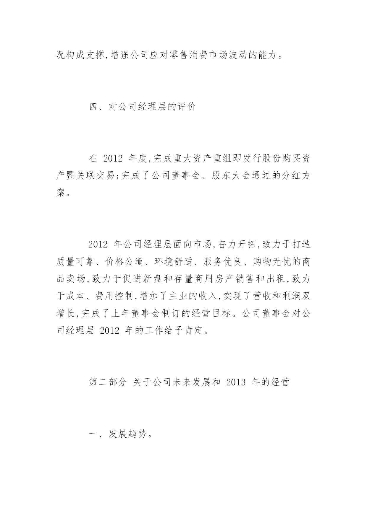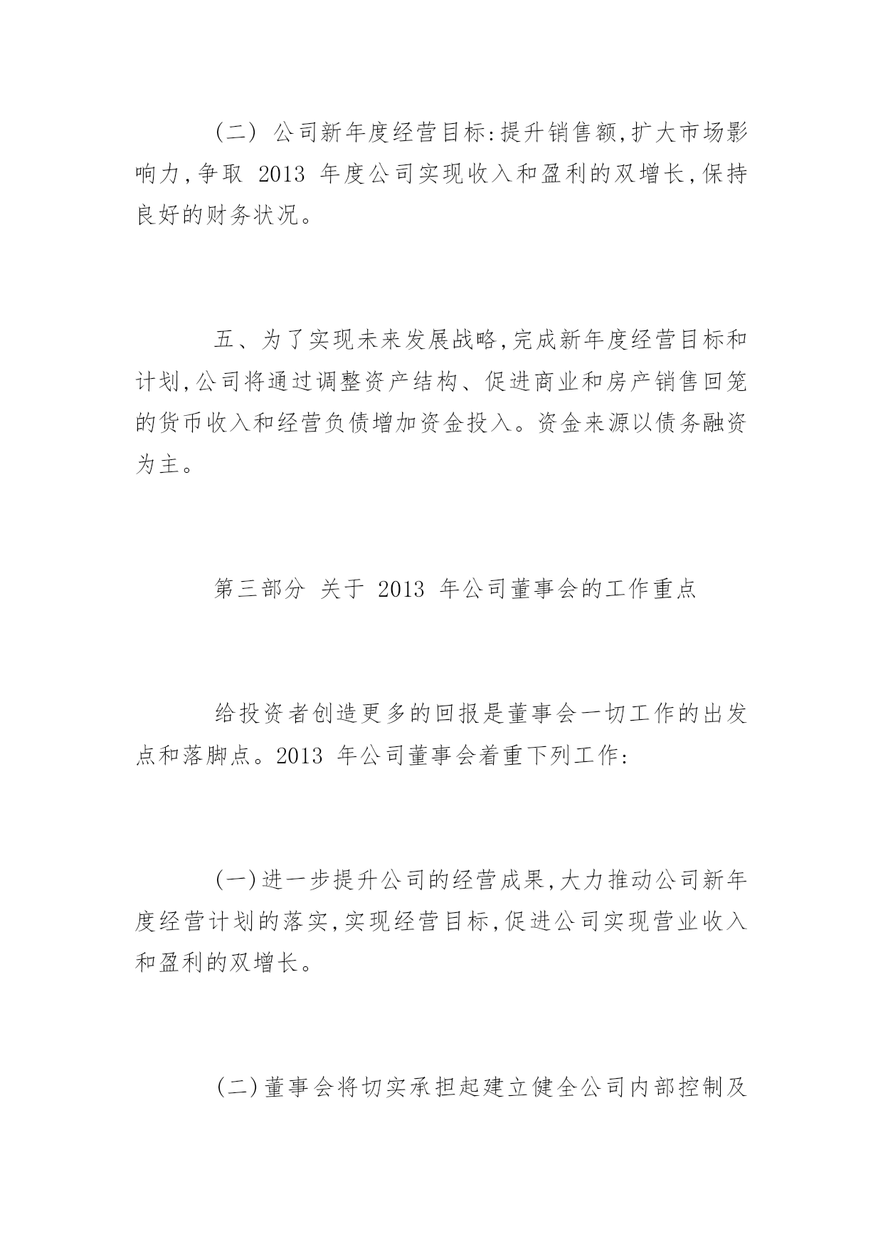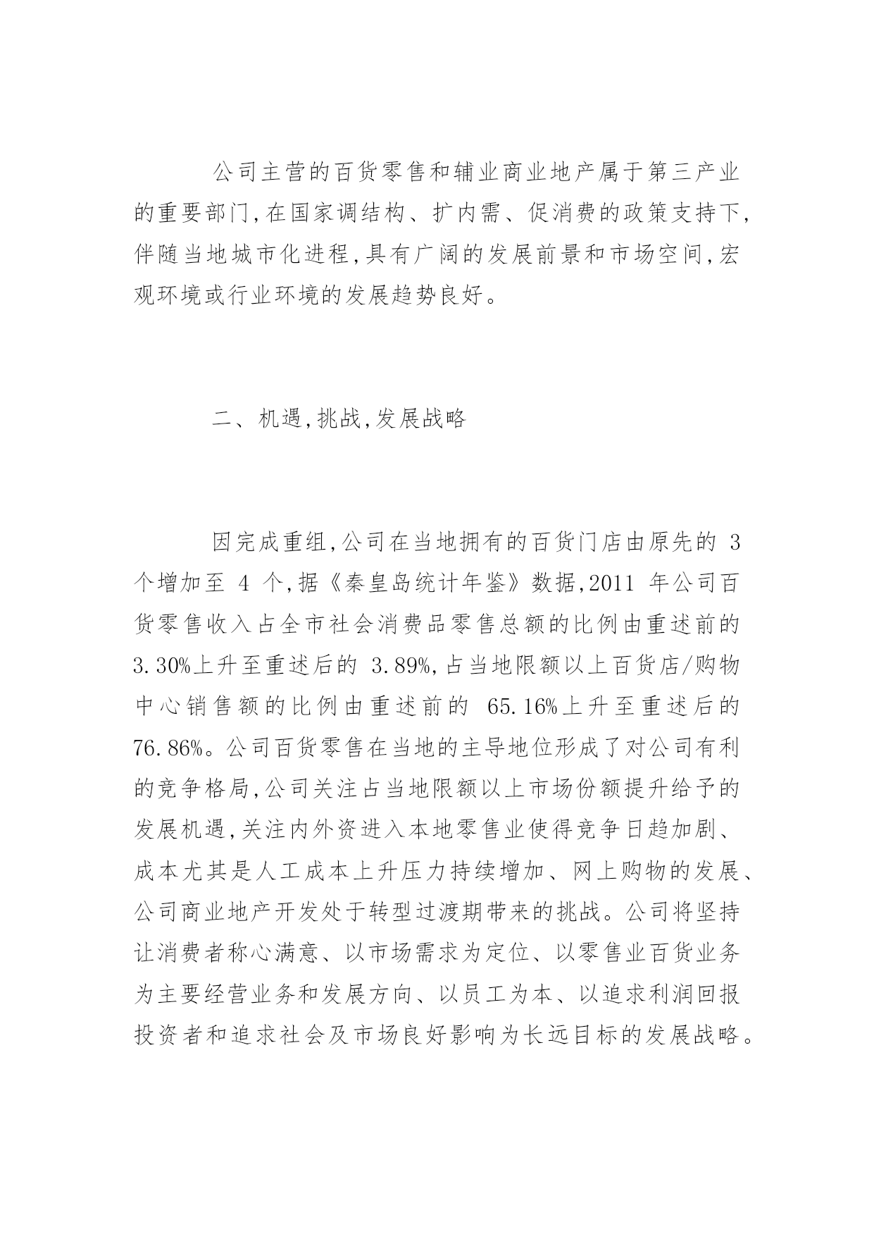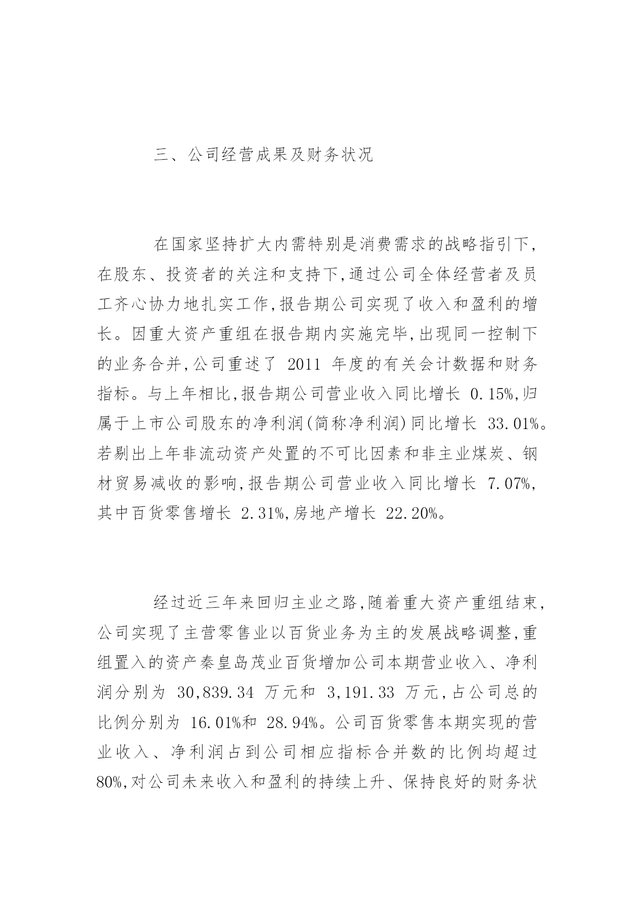 公司董事会工作报告公司董事会工作报告现对董事会2012年度工作进行总结,并就公司未来发展和公司2013年经营、2013年公司董事会重点工作做出安排,进一步推动公司的经营与管理等各项工作步上新台阶,进一步提高效益增加盈利,进一步加强公司内部控制建设,尽最大努力回报股东,不辜负投资者的支持和信任。第一部分关于2012年公司工作回顾一、董事会尽责履职情况2012年公司董事会召开了七次会议,作出的各项决议、纪要得到执行;召集了四次股东大会,董事会提请审议事项都获得了通过。2012年公司董事会真实、准确、完整、公平、及时地向社会及投资者发布了48项编号公告,进一步提高信息披露质量和公司透明度,维护投资者的利益。2012年公司独立董事能够认真履行职责,能够按时参加董事会行使权利(没有请假或委托情形),对公司重大决策、内控制度建设、关联交易、经营事项、信息披露发表独立意见,向公司2011年度股东大会述职,在公司治理、规范运作、维护中小股东合法权益等方面发挥了重要作用。在过去的一年里,公司董事会及其董事的工作扎实有效,为了维护股东及投资者权益,在增加主业收入及盈利、实现经营目标、解决同业竞争、加强治理及内部控制建设等方面,积极谋划决策,保证公司的稳定与发展。二、推进公司治理情况2012年公司继续推进治理工作,依据中国证监会《关于进一步落实上市公司现金分红有关事项的通知》要求,修订公司章程利润分配条款,强化现金分红。依据内控基本规范及配套指引,制定实施方案,进一步深入开展内控体系建设。成立内控建设工作组,聘请咨询机构指导工作并现场调查后出具风险矩阵;工作组下设办公室,按照基本规范及配套指引整理出比对文件和内控建设框架及路线,下发公司财务系统、子公司安徽国润进行试点。为了动员公司全体员工参与内控建设和有效实施,确保公司内控体系建设落到实处、取得实效,依据财政部办公厅财会办[2012]30号文件《关于2012年主板上市公司分类分批实施企业内部控制规范体系的通知》、中国证监会河北监管局冀证监发[2012]92号《关于辖区公司进一步做好内部控制规范体系实施工作的通知》要求,公司董事会将对《内控工作方案》相关工作进度时间节点作出调整:将内部控制建设工作计划完成时间由2012年7月中旬,调整为2014年6月;将内部控制自我评价工作计划完成时间由2013年1月下旬,调整为2014年12月;将内部控制审计工作计划完成时间由2013年1月下旬,调整为2015年1月。按照中国证监会及其派出机构、证券交易所的治理要求,公司建立健全完善各项制度,实施规范运作,公司治理的实际状况与中国证监会发布的有关上市公司治理的规范性文件要求不存在差异。三、公司经营成果及财务状况在国家坚持扩大内需特别是消费需求的战略指引下,在股东、投资者的关注和支持下,通过公司全体经营者及员工齐心协力地扎实工作,报告期公司实现了收入和盈利的增长。因重大资产重组在报告期内实施完毕,出现同一控制下的业务合并,公司重述了2011年度的有关会计数据和财务指标。与上年相比,报告期公司营业收入同比增长0.15%,归属于上市公司股东的净利润(简称净利润)同比增长33.01%。若剔出上年非流动资产处置的不可比因素和非主业煤炭、钢材贸易减收的影响,报告期公司营业收入同比增长7.07%,其中百货零售增长2.31%,房地产增长22.20%。经过近三年来回归主业之路,随着重大资产重组结束,公司实现了主营零售业以百货业务为主的发展战略调整,重组置入的资产秦皇岛茂业百货增加公司本期营业收入、净利润分别为30,839.34万元和3,191.33万元,占公司总的比例分别为16.01%和28.94%。公司百货零售本期实现的营业收入、净利润占到公司相应指标合并数的比例均超过80%,对公司未来收入和盈利的持续上升、保持良好的财务状况构成支撑,增强公司应对零售消费市场波动的能力。四、对公司经理层的评价在2012年度,完成重大资产重组即发行股份购买资产暨关联交易;完成了公司董事会、股东大会通过的分红方案。2012年公司经理层面向市场,奋力开拓,致力于打造质量可靠、价格公道、环境舒适、服务优良、购物无忧的商品卖场,致力于促进新盘和存量商用房产销售和出租,致力于成本、费用控制,增加了主业的收入,实现了营收和利润双增长,完成了上年董事会制订的经营目标。公司董事会对公司经理层2012年的工作给予肯定。第二部分关于公司未来发展和2013年的经营一、发展趋势。公司主营的百货零售和辅业商业地产属于第三产业的重要部门,在国家调结构、扩内需、促消费的政策支持下,伴随当地城市化进程,具有广阔的发展前景和市场空间,宏观环境或行业环境的发展趋势良好。二、机遇,挑战,发展战略因完成重组,公司在当地拥有的百货门店由原先的