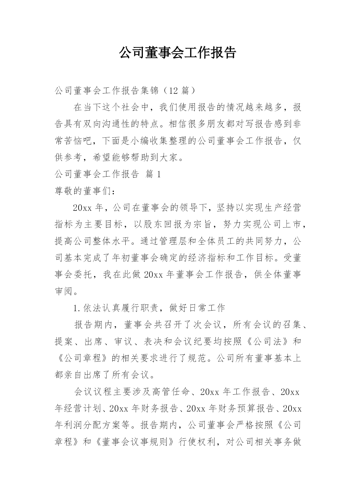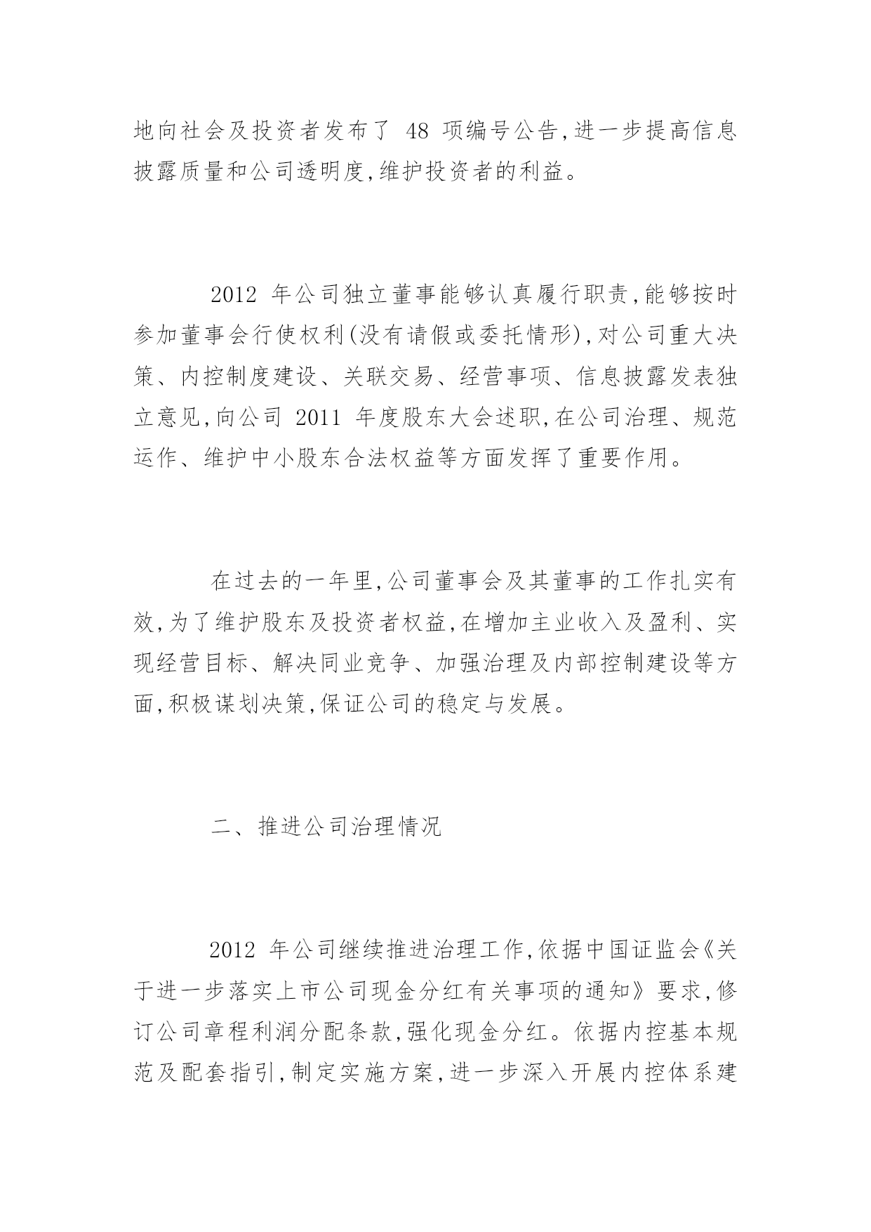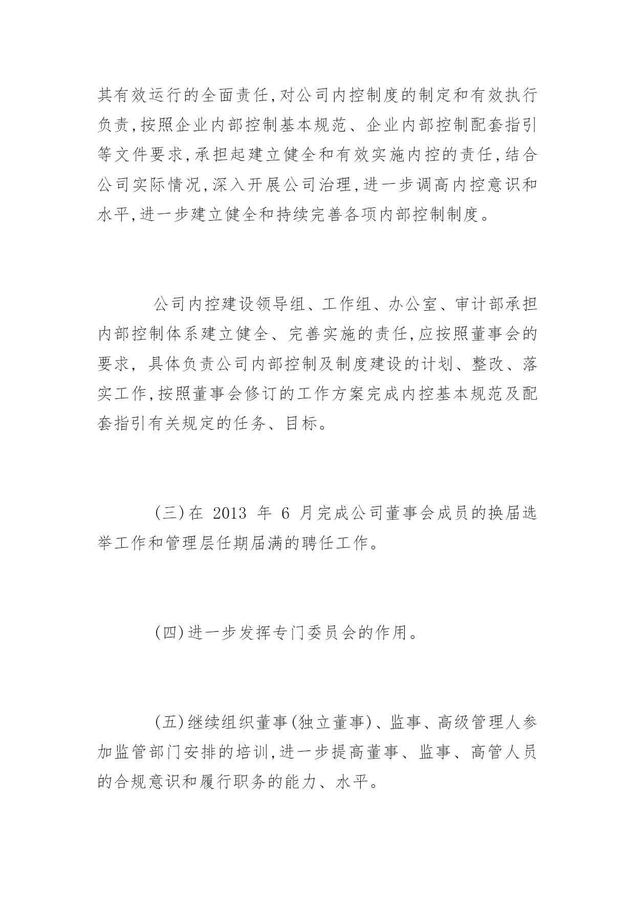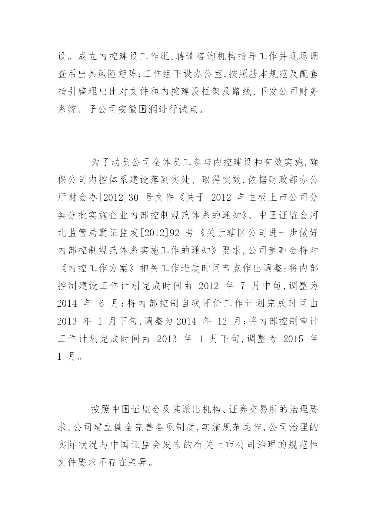 公司董事会工作报告公司董事会工作报告现对董事会2012年度工作进行总结,并就公司未来发展和公司2013年经营、2013年公司董事会重点工作做出安排,进一步推动公司的经营与管理等各项工作步上新台阶,进一步提高效益增加盈利,进一步加强公司内部控制建设,尽最大努力回报股东,不辜负投资者的支持和信任。第一部分关于2012年公司工作回顾一、董事会尽责履职情况2012年公司董事会召开了七次会议,作出的各项决议、纪要得到执行;召集了四次股东大会,董事会提请审议事项都获得了通过。2012年公司董事会真实、准确、完整、公平、及时地向社会及投资者发布了48项编号公告,进一步提高信息披露质量和公司透明度,维护投资者的利益。2012年公司独立董事能够认真履行职责,能够按时参加董事会行使权利(没有请假或委托情形),对公司重大决策、内控制度建设、关联交易、经营事项、信息披露发表独立意见,向公司2011年度股东大会述职,在公司治理、规范运作、维护中小股东合法权益等方面发挥了重要作用。在过去的一年里,公司董事会及其董事的工作扎实有效,为了维护股东及投资者权益,在增加主业收入及盈利、实现经营目标、解决同业竞争、加强治理及内部控制建设等方面,积极谋划决策,保证公司的稳定与发展。二、推进公司治理情况2012年公司继续推进治理工作,依据中国证监会《关于进一步落实上市公司现金分红有关事项的通知》要求,修订公司章程利润分配条款,强化现金分红。依据内控基本规范及配套指引,制定实施方案,进一步深入开展内控体系建设。成立内控建设工作组,聘请咨询机构指导工作并现场调查后出具风险矩阵;工作组下设办公室,按照基本规范及配套指引整理出比对文件和内控建设框架及路线,下发公司财务系统、子公司安徽国润进行试点。为了动员公司全体员工参与内控建设和有效实施,确保公司内控体系建设落到实处、取得实效,依据财政部办公厅财会办[2012]30号文件《关于2012年主板上市公司分类分批实施企业内部控制规范体系的通知》、中国证监会河北监管局冀证监发[2012]92号《关于辖区公司进一步做好内部控制规范体系实施工作的通知》要求,公司董事会将对《内控工作方案》相关工作进度时间节点作出调整:将内部控制建设工作计划完成时间由2012年7月中旬,调整为2014年6月;将内部控制自我评价工作计划完成时间由2013年1月下旬,调整为2014年12月;将内部控制审计工作计划完成时间由2013年1月下旬,调整为2015年1月。按照中国证监会及其派出机构、证券交易所的治理要求,公司建立健全完善各项制度,实施规范运作,公司治理的实际状况与中国证监会发布的有关上市公司治理的规范性文件要求不存在差异。三、公司经营成果及财务状况在国家坚持扩大内需特别是消费需求的战略指引下,在股东、投资者的关注和支持下,通过公司全体经营者及员工齐心协力地扎实工作,报告期公司实现了收入和盈利的增长。因重大资产重组在报告期内实施完毕,出现同一控制下的业务合并,公司重述了2011年度的有关会计数据和财务指标。与上年相比,报告期公司营业收入同比增长0.15%,归属于上市公司股东的净利润(简称净利润)同比增长33.01%。若剔出上年非流动资产处置的不可比因素和非主业煤炭、钢材贸易减收的影响,报告期公司营业收入同比增长7.07%,其中百货零售增长2.31%,房地产增长22.20%。经过近三年来回归主业之路,随着重大资产重组结束,公司实现了主营零售业以百货业务为主的发展战略调整,重组置入的资产秦皇岛茂业百货增加公司本期营业收入、净利润分别为30,839.34万元和3,191.33万元,占公司总的比例分别为16.01%和28.94%。公司百货零售本期实现的营业收入、净利润占到公司相应指标合并数的比例均超过80%,对公司未来收入和盈利的持续上升、保持良好的财务状况构成支撑,增强公司应对零售消费市场波动的能力。四、对公司经理层的评价在2012年度,完成重大资产重组即发行股份购买资产暨关联交易;完成了公司董事会、股东大会通过的分红方案。2012年公司经理层面向市场,奋力开拓,致力于打造质量可靠、价格公道、环境舒适、服务优良、购物无忧的商品卖场,致力于促进新盘和存量商用房产销售和出租,致力于成本、费用控制,增加了主业的收入,实现了营收和利润双增长,完成了上年董事会制订的经营目标。公司董事会对公司经理层2012年的工作给予肯定。第二部分关于公司未来发展和2013年的经营一、发展趋势。公司主营的百货零售和辅业商业地产属于第三产业的重要部门,在国家调结构、扩内需、促消费的政策支持下,伴随当地城市化进程,具有广阔的发展前景和市场空间,宏观环境或行业环境的发展趋势良好。二、机遇,挑战,发展战略因完成重组,公司在当地拥有的百货门店由原先的