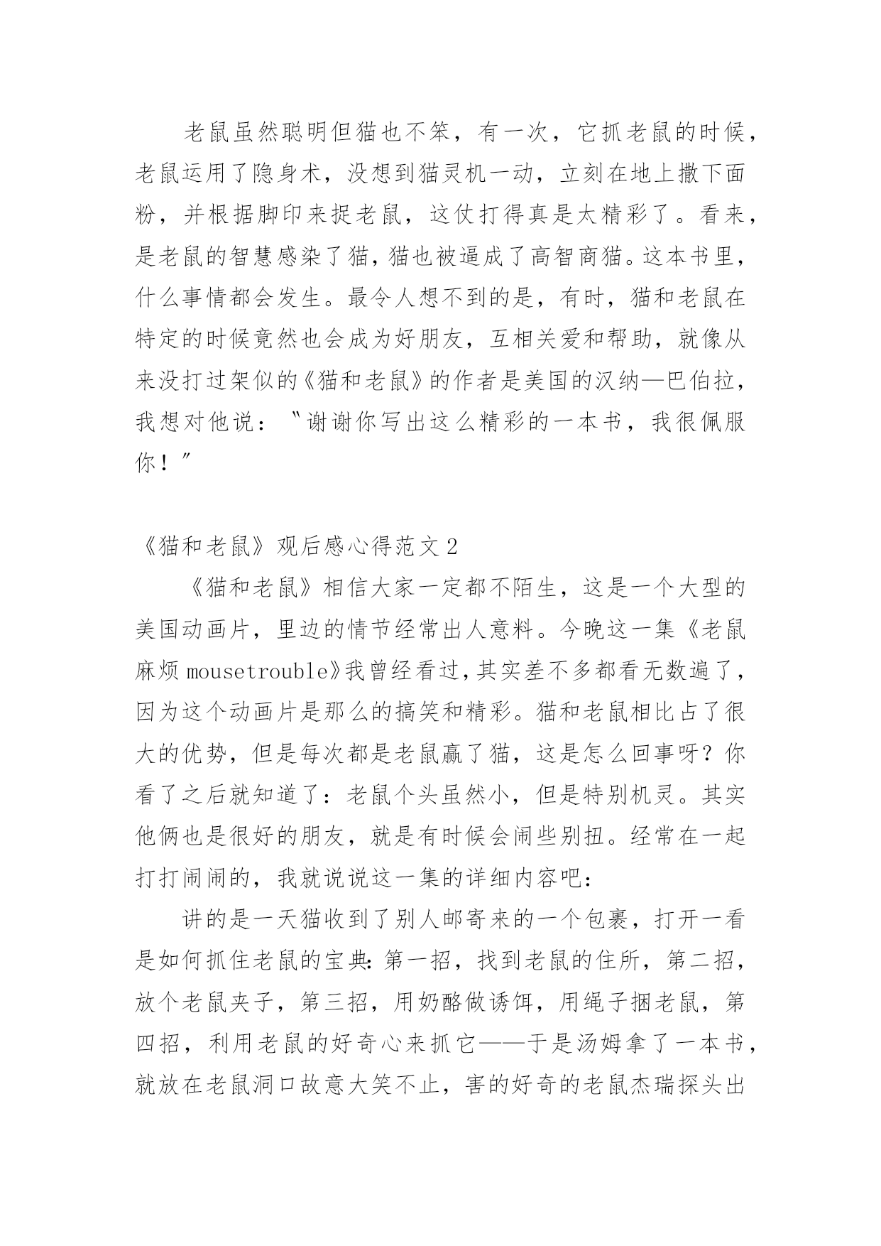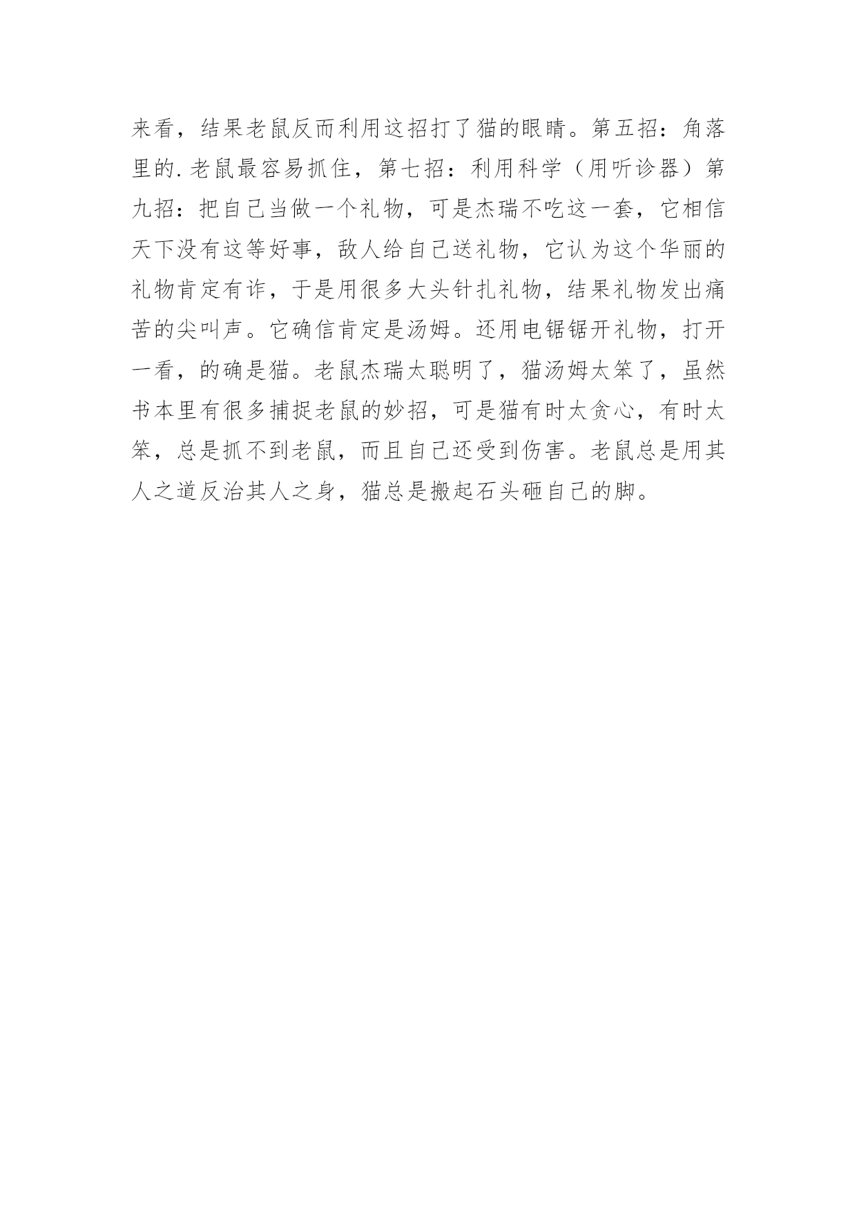 《猫和老鼠》观后感心得《猫和老鼠》观后感心得范文细细品味一部作品以后,相信大家一定领会了不少东西,为此需要好好认真地写观后感。观后感你想好怎么写了吗?以下是小编精心整理的《猫和老鼠》观后感心得范文,仅供参考,希望能够帮助到大家。《猫和老鼠》观后感心得范文1我最喜欢看的漫画书就是《猫和老鼠》了,每次我看这本书时都会被逗得哈哈大笑,笑过后我非常敬佩小老鼠的聪明和勇气。危险时刻都会发生,看:小老鼠又差点被猫抓到,机敏的它立刻拿起身边的工具打猫或者夹猫的鼻子,并借此机会马上溜走。有一次,许多恶猫一起围攻小老鼠,就在这个危急时刻,小老鼠突然变得力大无比,将恶猫们打了个落花流水:有的猫被扔到门上;有的.猫被摔到墙上;还有的猫被踢到土坑里。当然,小老鼠并不是时刻都有这种神力的,所以,更多时候它是运用智慧来和猫战斗。比如,它看到猫睡着了,就设法把猫弄到主人整洁漂亮的床上,嘿嘿!这时,猫倒霉的时候就到喽——它还没弄清是怎么回事,就被怒气冲冲的主人赶出了家门。我真是太喜欢这只聪明可爱的小老鼠了。老鼠虽然聪明但猫也不笨,有一次,它抓老鼠的时候,老鼠运用了隐身术,没想到猫灵机一动,立刻在地上撒下面粉,并根据脚印来捉老鼠,这仗打得真是太精彩了。看来,是老鼠的智慧感染了猫,猫也被逼成了高智商猫。这本书里,什么事情都会发生。最令人想不到的是,有时,猫和老鼠在特定的时候竟然也会成为好朋友,互相关爱和帮助,就像从来没打过架似的《猫和老鼠》的作者是美国的汉纳—巴伯拉,我想对他说:〝谢谢你写出这么精彩的一本书,我很佩服你!〞《猫和老鼠》观后感心得范文2《猫和老鼠》相信大家一定都不陌生,这是一个大型的美国动画片,里边的情节经常出人意料。今晚这一集《老鼠麻烦mousetrouble》我曾经看过,其实差不多都看无数遍了,因为这个动画片是那么的搞笑和精彩。猫和老鼠相比占了很大的优势,但是每次都是老鼠赢了猫,这是怎么回事呀?你看了之后就知道了:老鼠个头虽然小,但是特别机灵。其实他俩也是很好的朋友,就是有时候会闹些别扭。经常在一起打打闹闹的,我就说说这一集的详细内容吧:讲的是一天猫收到了别人邮寄来的一个包裹,打开一看是如何抓住老鼠的宝典:第一招,找到老鼠的住所,第二招,放个老鼠夹子,第三招,用奶酪做诱饵,用绳子捆老鼠,第四招,利用老鼠的好奇心来抓它——于是汤姆拿了一本书,就放在老鼠洞口故意大笑不止,害的好奇的老鼠杰瑞探头出来看,结果老鼠反而利用这招打了猫的眼睛。第五招:角落里的.老鼠最容易抓住,第七招:利用科学(用听诊器)第九招:把自己当做一个礼物,可是杰瑞不吃这一套,它相信天下没有这等好事,敌人给自己送礼物,它认为这个华丽的礼物肯定有诈,于是用很多大头针扎礼物,结果礼物发出痛苦的尖叫声。它确信肯定是汤姆。还用电锯锯开礼物,打开一看,的确是猫。老鼠杰瑞太聪明了,猫汤姆太笨了,虽然书本里有很多捕捉老鼠的妙招,可是猫有时太贪心,有时太笨,总是抓不到老鼠,而且自己还受到伤害。老鼠总是用其人之道反治其人之身,猫总是搬起石头砸自己的脚。