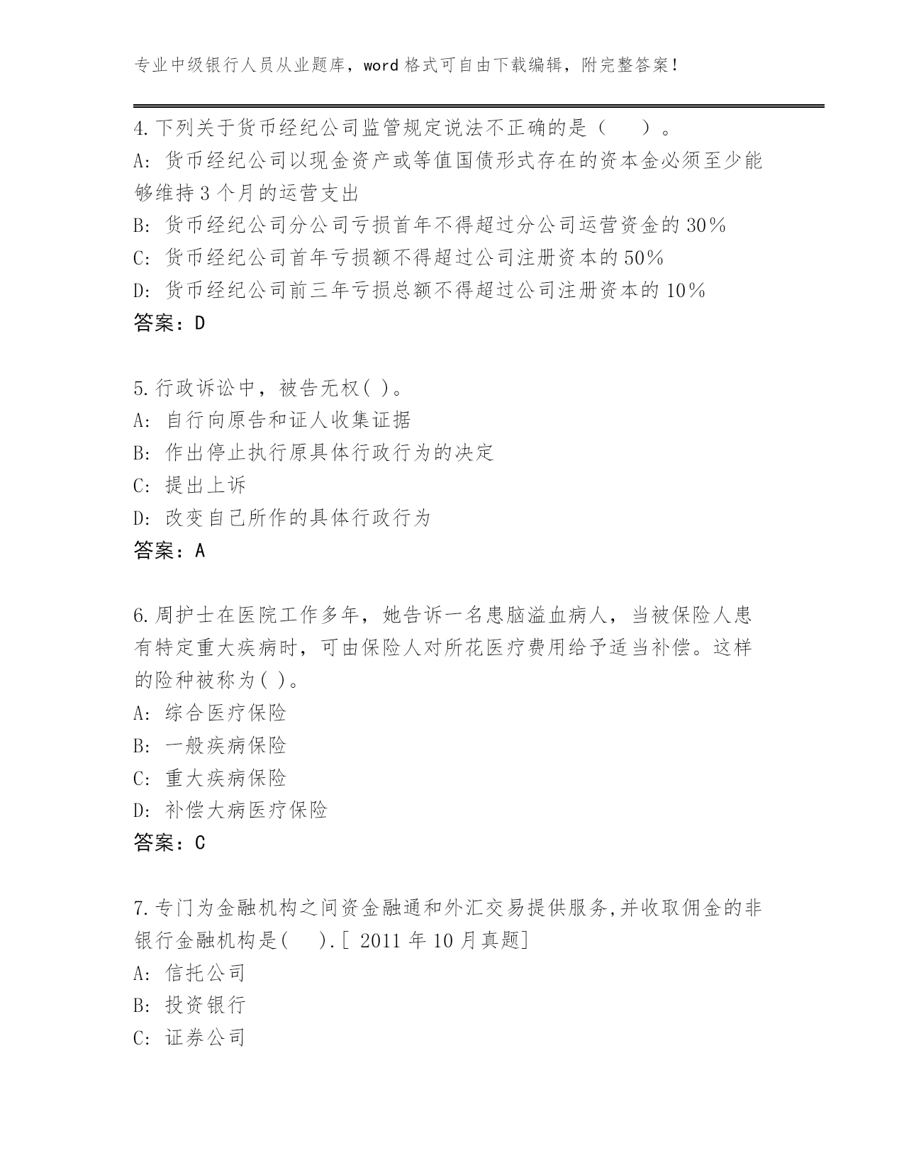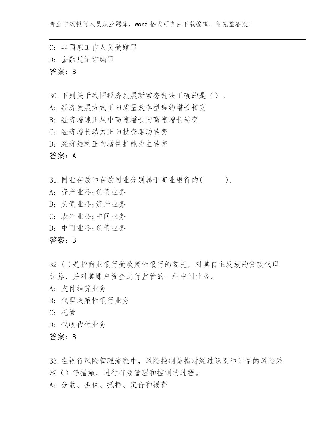 专业中级银行人员从业题库,word格式可自由下载编辑,附完整答案!2024湖北省钟祥市中级银行人员从业真题题库(真题汇编)第I部分单选题(100题)1.下列选项中不属于商业银行内部控制目标的是().[2015年10月真题]A:确保国家法律规定和商业银行内部规章制度的贯彻执行B:确保商业银行发展战略和经营目标的全面实施和充分实现C:确保资产负债业务快速发展D:确保业务记录、财务信息和其他管理信息的及时、真实和完整答案:C2.下列各项中不属于商业银行同业拆入的主要风险点的是()。A:资产和负债期限错配B:风险管理欠缺C:内部控制薄弱D:内部审计监督不到位答案:A3.在贷款的五级分类中,尽管借款人目前有能力偿还贷款本息,但存在一些可能对偿还产生不利影响因素的贷款是()。A:关注类贷款B:可疑类贷款C:损失类贷款D:次级类贷款答案:A4.下列关于货币经纪公司监管规定说法不正确的是()。A:货币经纪公司以现金资产或等值国债形式存在的资本金必须至少能够维持3个月的运营支出B:货币经纪公司分公司亏损首年不得超过分公司运营资金的30%C:货币经纪公司首年亏损额不得超过公司注册资本的50%D:货币经纪公司前三年亏损总额不得超过公司注册资本的10%答案:D5.行政诉讼中,被告无权()。A:自行向原告和证人收集证据B:作出停止执行原具体行政行为的决定C:提出上诉D:改变自己所作的具体行政行为答案:A6.周护士在医院工作多年,她告诉一名患脑溢血病人,当被保险人患有特定重大疾病时,可由保险人对所花医疗费用给予适当补偿。这样的险种被称为()。A:综合医疗保险B:一般疾病保险C:重大疾病保险D:补偿大病医疗保险答案:C7.专门为金融机构之间资金融通和外汇交易提供服务,并收取佣金的非银行金融机构是().[2011年10月真题]A:信托公司B:投资银行C:证券公司D:货币经纪公司答案:D8.商业银行在项目评估中,对项目设备选择是否合理进行的评估属于()。[2015年5月真题]A:项目技术评估B:项目建设配套条件评估C:项目财务评估D:银行效益评估答案:A9.遗嘱的内容应包含()才能成立。A:指定继承人、受遗赠人B:指定遗嘱执行人C:遗嘱生效时间D:对遗嘱继承人或者受遗赠人附加义务E指定遗产的分配办法或者份额答案:A10.一般而言,经济周期的各个阶段中,商业银行的资产规模和利润处于最高水平的是()。A:经济危机阶段B:经济复苏阶段C:经济萧条阶段D:经济高涨阶段答案:D11.以下不属于客户经营业绩分析指标的是()。[2015年5月真题]A:与行业比较的销售增长率B:资产周转率指标C:主营业务收入占销售收入总额比重D:市场占有率指标答案:B12.根据《个人贷款管理暂行办法》规定,贷款人应按区域、品种、客户群等维度建立个人贷款()管理制度。[2015年10月真题]A:还款记录B:风险限额C:担保情况D:信用评级答案:B13.中国人民银行公布的当日外汇牌价是().[2015年10月真题]A:现汇买入价B:现钞卖出价C:中间价D:现钞买入价答案:C14.下列项目中应征收增值税的是()。A:企业将自产钢材用于扩建建房B:企业转让商标取得的收入C:农业生产者出售的初级农产品D:邮电局销售报纸、杂志答案:A15.下列不属于个人所有财产的是()。A:房产B:耕地C:存款D:股权答案:B16.下列关于个人汽车贷款原则的说法,错误的是()。A:“特定用途”指个人汽车贷款只可归借款人本人使用,不可转借他人,借款人本人可根据其需要决定使用方向B:“设定担保”指借款人申请个人汽车贷款需提供所购汽车抵押或其他有效担保C:“分类管理”指按照贷款所购车辆种类和用途的不同,对个人汽车贷款设定不同的贷款条件D:个人汽车贷款实行“设定担保,分类管理,特定用途”的原则答案:A17.转继承的客体是()。A:被继承人B:遗产所有权C:继承人D:继承权答案:B18.()是用于衡量和防御银行实际承担的损失超出预计损失的那部分损失,是防止银行倒闭的最后防线。A:监管资本B:会计资本C:经济资本D:一般准备答案:C19.衡量利率变动对银行当期收益影响的分析方法是()。A:缺口分析B:风险价值分析C:情景分析D:久期分析答案:A20.商业银行通过内部评级确定每个非零售风险暴露债务人的风险等级时,债务人评级范围包括()。A:保证人和被保证人B:债务人和债项C:保证人和债项D:债务人和保证人答案:D21.个人住房贷款业务合作中