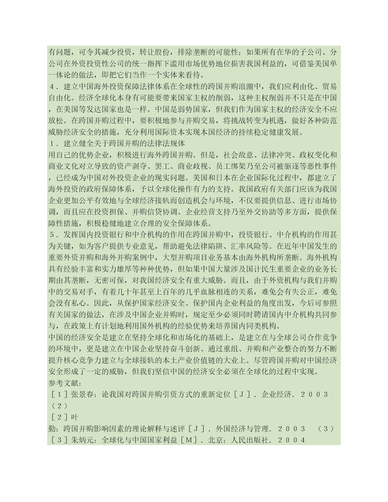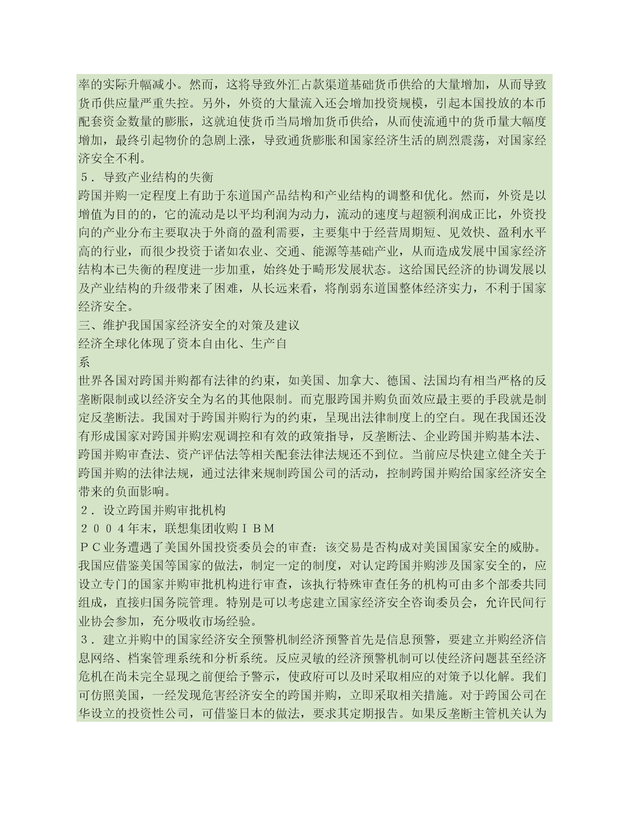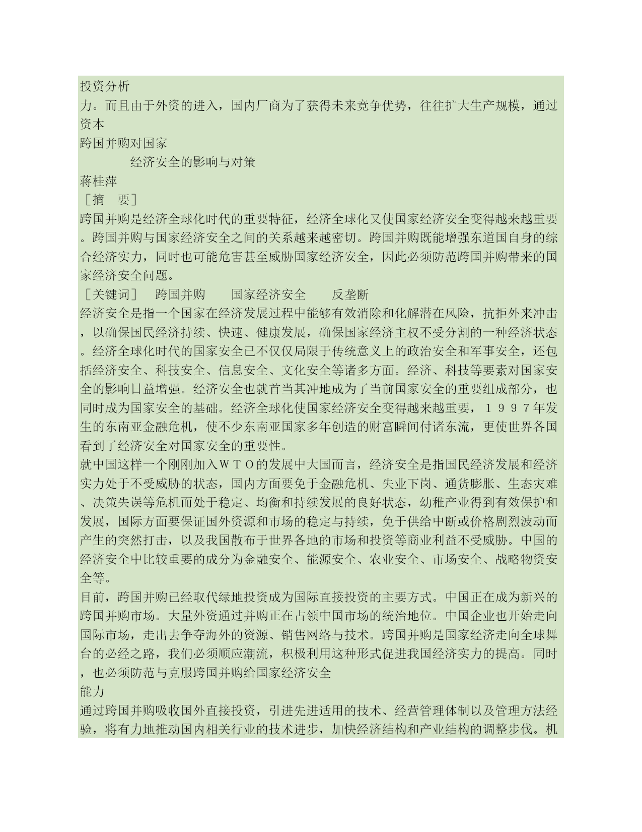 跨国并购对国家经济安全的影响与对策(完整版)实用资料(可以直接使用,可编辑完整版实用资料,欢迎下载)投资分析力。而且由于外资的进入,国内厂商为了获得未来竞争优势,往往扩大生产规模,通过资本跨国并购对国家经济安全的影响与对策蒋桂萍[摘要]跨国并购是经济全球化时代的重要特征,经济全球化又使国家经济安全变得越来越重要。跨国并购与国家经济安全之间的关系越来越密切。跨国并购既能增强东道国自身的综合经济实力,同时也可能危害甚至威胁国家经济安全,因此必须防范跨国并购带来的国家经济安全问题。[关键词]跨国并购国家经济安全反垄断经济安全是指一个国家在经济发展过程中能够有效消除和化解潜在风险,抗拒外来冲击,以确保国民经济持续、快速、健康发展,确保国家经济主权不受分割的一种经济状态。经济全球化时代的国家安全已不仅仅局限于传统意义上的政治安全和军事安全,还包括经济安全、科技安全、信息安全、文化安全等诸多方面。经济、科技等要素对国家安全的影响日益增强。经济安全也就首当其冲地成为了当前国家安全的重要组成部分,也同时成为国家安全的基础。经济全球化使国家经济安全变得越来越重要,1997年发生的东南亚金融危机,使不少东南亚国家多年创造的财富瞬间付诸东流,更使世界各国看到了经济安全对国家安全的重要性。就中国这样一个刚刚加入WTO的发展中大国而言,经济安全是指国民经济发展和经济实力处于不受威胁的状态,国内方面要免于金融危机、失业下岗、通货膨胀、生态灾难、决策失误等危机而处于稳定、均衡和持续发展的良好状态,幼稚产业得到有效保护和发展,国际方面要保证国外资源和市场的稳定与持续,免于供给中断或价格剧烈波动而产生的突然打击,以及我国散布于世界各地的市场和投资等商业利益不受威胁。中国的经济安全中比较重要的成分为金融安全、能源安全、农业安全、市场安全、战略物资安全等。目前,跨国并购已经取代绿地投资成为国际直接投资的主要方式。中国正在成为新兴的跨国并购市场。大量外资通过并购正在占领中国市场的统治地位。中国企业也开始走向国际市场,走出去争夺海外的资源、销售网络与技术。跨国并购是国家经济走向全球舞台的必经之路,我们必须顺应潮流,积极利用这种形式促进我国经济实力的提高。同时,也必须防范与克服跨国并购给国家经济安全能力通过跨国并购吸收国外直接投资,引进先进适用的技术、经营管理体制以及管理方法经验,将有力地推动国内相关行业的技术进步,加快经济结构和产业结构的调整步伐。机械、电子、纺织、医药等许多行业通过吸收外资使产品得到更新换代,明显提高了技术工艺和生产水平,增强了国际市场竞争能力,有些产品或行业已经具有较强的国际竞争能用跨国并购作为重要的资本经营活动,在国家经济发展中的作用十分明显。通过合理有效地并购活动,有助于我国企业增强国际竞争力,走向世界,有助于提高我国的综合国际竞争力,巩固和增强国家经济安全实力。1.弥补要素缺口,为经济安全提供强有力的物质基础跨国并购可以提供一系列的资产用于各种结构调整,并且快速补充当地的要素缺口,对东道国经济发展产生资本形成、技术外溢、产业升级、就业、贸易创造、创新等一系列效应。跨国并购不仅可以盘活东道国的资本存量,引发东道国相关投资并带动产业前后向投资,而且往往会带来大量后续投资,带来比以前更大的生产能力。通过跨国并购,发达国家和发展中国家进行了横向水平的产业结构转移,这在一定程度上符合了产业结构升级的需要。通过产业前后向联系和乘数效应,就业也会相应增加。被并购企业通过结构调整增加了其生产效率,也达到了转移技术和管理技能的目的,增强了开发自己企业特定优势的能力,最终使自己也具有跨国公司的对外投资能力。2.提高产业竞争力,增强经济安全防御带来的消极影响。一、跨国并购对国家经济安全的积极作运营,组建大集团以获取规模经济效应,于是整个产业的规模经济性得以提高,产业集中度也随之上升。3.推动经济改革,为经济安全提供体制和制度上的保障跨国并购可以推动国家经济改革,促进市场导向型体系的建立。跨国并购带来了新的企业经营标准、经营机制和内部管理方法,极大地冲击了我国的传统经济体制,对我国企业改革产生了明显的示范效应,为国有企业的改革提供了现实的参照体。跨国并购企业以市场为导向、通过市场合理配置资源的经济理念,不断促使政府运用汇率、税率、利率等经济手段进行宏观管理和依法管理,从而最终为维护国家经济安全提供体制和制度上的保障。二、跨国并购对国家经济安全的消极影响虽然外资通过并购活动在东道国赚取利润的过程中客观上会对东道国的经济发展乃至国家的经济安全产生积极影响,但跨国公司垄断市场的天性和追求利润最大化的最终目标使跨国并购对国家经济安全所构成的威胁和消极影响不容忽视。对发展中国家而言,除非设计出管理和控制跨国并购的有效方法,否则并购