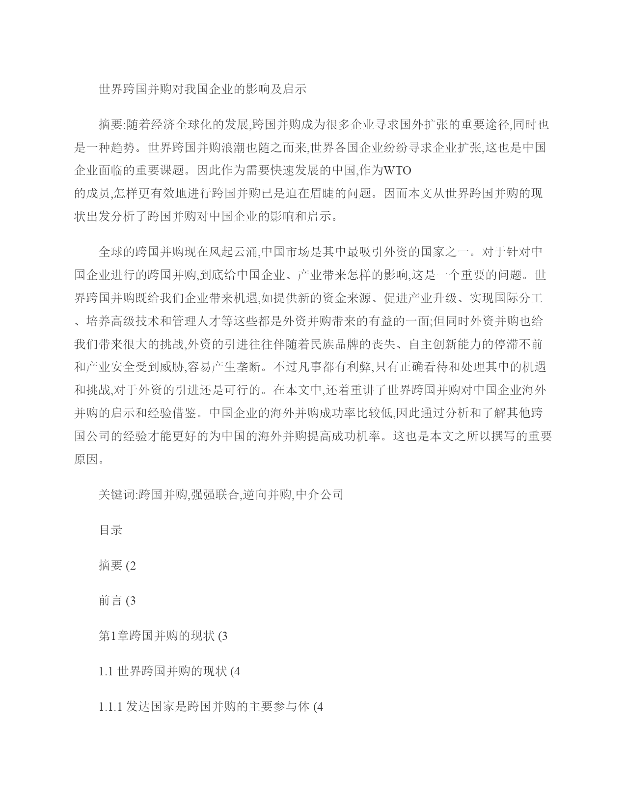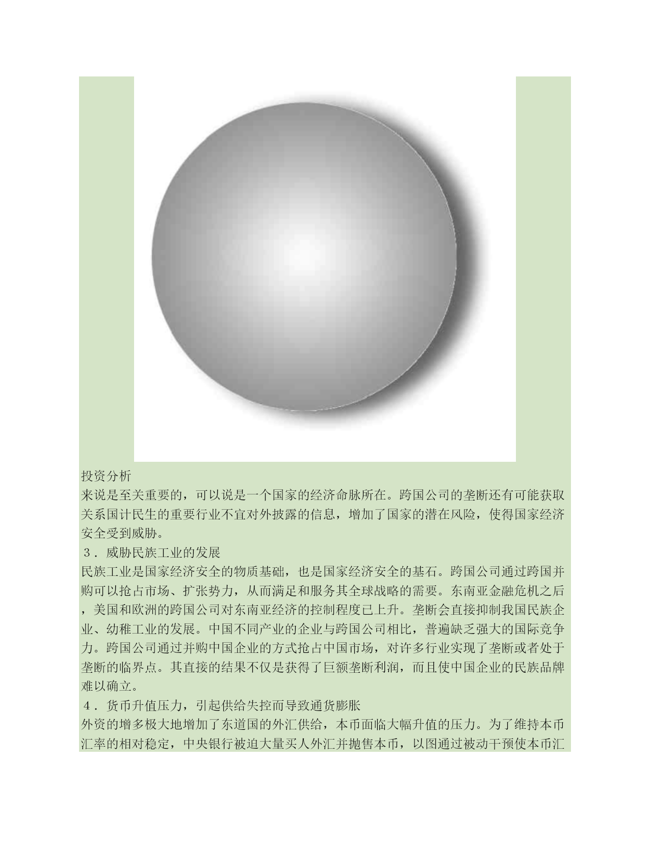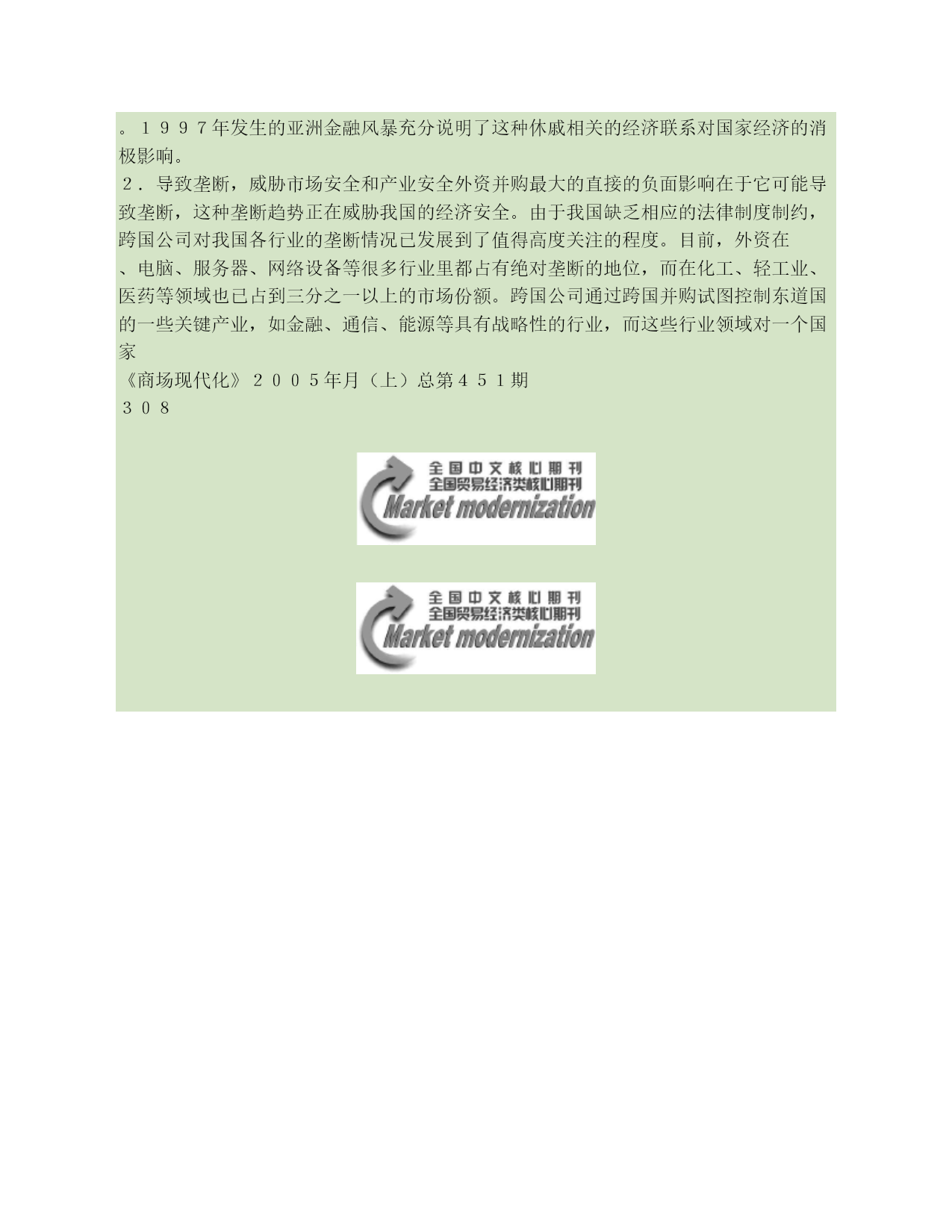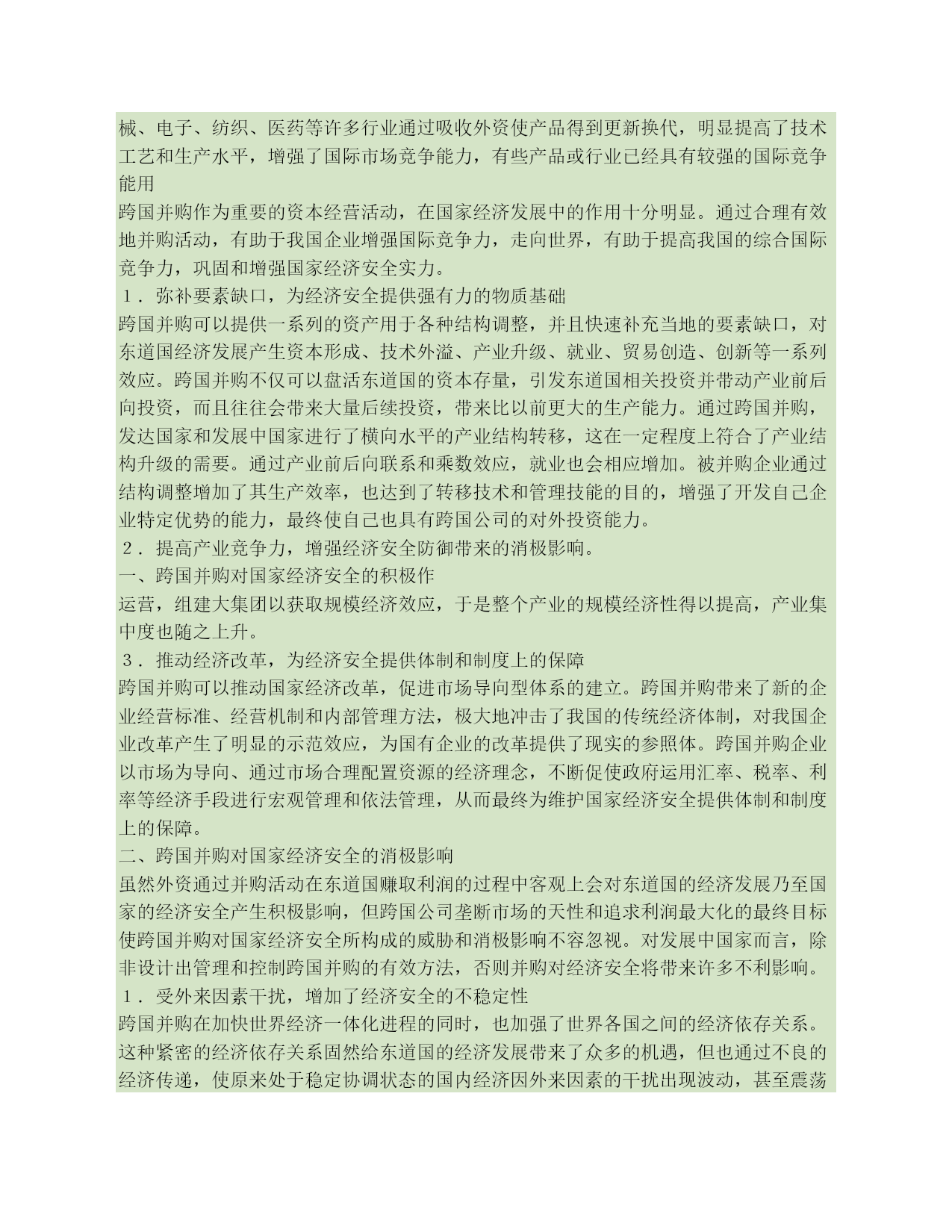 跨国并购对国家经济安全的影响与对策(完整版)实用资料(可以直接使用,可编辑完整版实用资料,欢迎下载)投资分析力。而且由于外资的进入,国内厂商为了获得未来竞争优势,往往扩大生产规模,通过资本跨国并购对国家经济安全的影响与对策蒋桂萍[摘要]跨国并购是经济全球化时代的重要特征,经济全球化又使国家经济安全变得越来越重要。跨国并购与国家经济安全之间的关系越来越密切。跨国并购既能增强东道国自身的综合经济实力,同时也可能危害甚至威胁国家经济安全,因此必须防范跨国并购带来的国家经济安全问题。[关键词]跨国并购国家经济安全反垄断经济安全是指一个国家在经济发展过程中能够有效消除和化解潜在风险,抗拒外来冲击,以确保国民经济持续、快速、健康发展,确保国家经济主权不受分割的一种经济状态。经济全球化时代的国家安全已不仅仅局限于传统意义上的政治安全和军事安全,还包括经济安全、科技安全、信息安全、文化安全等诸多方面。经济、科技等要素对国家安全的影响日益增强。经济安全也就首当其冲地成为了当前国家安全的重要组成部分,也同时成为国家安全的基础。经济全球化使国家经济安全变得越来越重要,1997年发生的东南亚金融危机,使不少东南亚国家多年创造的财富瞬间付诸东流,更使世界各国看到了经济安全对国家安全的重要性。就中国这样一个刚刚加入WTO的发展中大国而言,经济安全是指国民经济发展和经济实力处于不受威胁的状态,国内方面要免于金融危机、失业下岗、通货膨胀、生态灾难、决策失误等危机而处于稳定、均衡和持续发展的良好状态,幼稚产业得到有效保护和发展,国际方面要保证国外资源和市场的稳定与持续,免于供给中断或价格剧烈波动而产生的突然打击,以及我国散布于世界各地的市场和投资等商业利益不受威胁。中国的经济安全中比较重要的成分为金融安全、能源安全、农业安全、市场安全、战略物资安全等。目前,跨国并购已经取代绿地投资成为国际直接投资的主要方式。中国正在成为新兴的跨国并购市场。大量外资通过并购正在占领中国市场的统治地位。中国企业也开始走向国际市场,走出去争夺海外的资源、销售网络与技术。跨国并购是国家经济走向全球舞台的必经之路,我们必须顺应潮流,积极利用这种形式促进我国经济实力的提高。同时,也必须防范与克服跨国并购给国家经济安全能力通过跨国并购吸收国外直接投资,引进先进适用的技术、经营管理体制以及管理方法经验,将有力地推动国内相关行业的技术进步,加快经济结构和产业结构的调整步伐。机械、电子、纺织、医药等许多行业通过吸收外资使产品得到更新换代,明显提高了技术工艺和生产水平,增强了国际市场竞争能力,有些产品或行业已经具有较强的国际竞争能用跨国并购作为重要的资本经营活动,在国家经济发展中的作用十分明显。通过合理有效地并购活动,有助于我国企业增强国际竞争力,走向世界,有助于提高我国的综合国际竞争力,巩固和增强国家经济安全实力。1.弥补要素缺口,为经济安全提供强有力的物质基础跨国并购可以提供一系列的资产用于各种结构调整,并且快速补充当地的要素缺口,对东道国经济发展产生资本形成、技术外溢、产业升级、就业、贸易创造、创新等一系列效应。跨国并购不仅可以盘活东道国的资本存量,引发东道国相关投资并带动产业前后向投资,而且往往会带来大量后续投资,带来比以前更大的生产能力。通过跨国并购,发达国家和发展中国家进行了横向水平的产业结构转移,这在一定程度上符合了产业结构升级的需要。通过产业前后向联系和乘数效应,就业也会相应增加。被并购企业通过结构调整增加了其生产效率,也达到了转移技术和管理技能的目的,增强了开发自己企业特定优势的能力,最终使自己也具有跨国公司的对外投资能力。2.提高产业竞争力,增强经济安全防御带来的消极影响。一、跨国并购对国家经济安全的积极作运营,组建大集团以获取规模经济效应,于是整个产业的规模经济性得以提高,产业集中度也随之上升。3.推动经济改革,为经济安全提供体制和制度上的保障跨国并购可以推动国家经济改革,促进市场导向型体系的建立。跨国并购带来了新的企业经营标准、经营机制和内部管理方法,极大地冲击了我国的传统经济体制,对我国企业改革产生了明显的示范效应,为国有企业的改革提供了现实的参照体。跨国并购企业以市场为导向、通过市场合理配置资源的经济理念,不断促使政府运用汇率、税率、利率等经济手段进行宏观管理和依法管理,从而最终为维护国家经济安全提供体制和制度上的保障。二、跨国并购对国家经济安全的消极影响虽然外资通过并购活动在东道国赚取利润的过程中客观上会对东道国的经济发展乃至国家的经济安全产生积极影响,但跨国公司垄断市场的天性和追求利润最大化的最终目标使跨国并购对国家经济安全所构成的威胁和消极影响不容忽视。对发展中国家而言,除非设计出管理和控制跨国并购的有效方法,否则并购