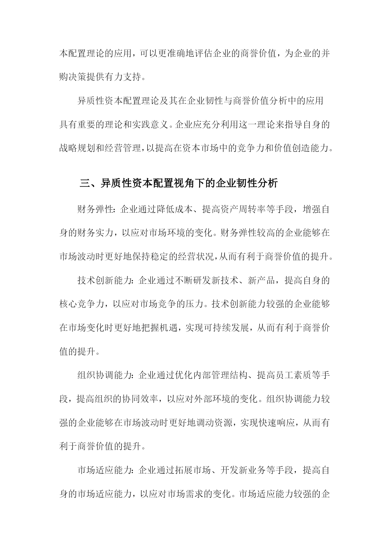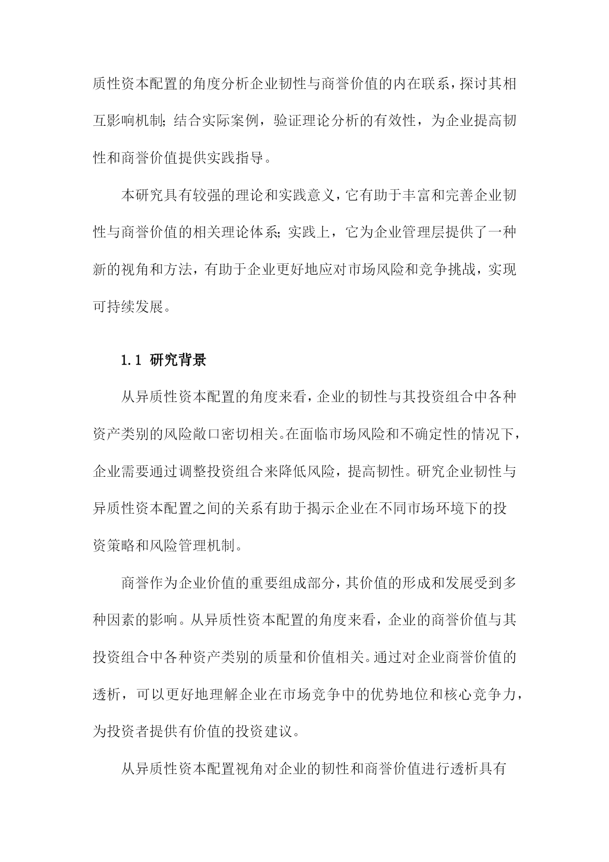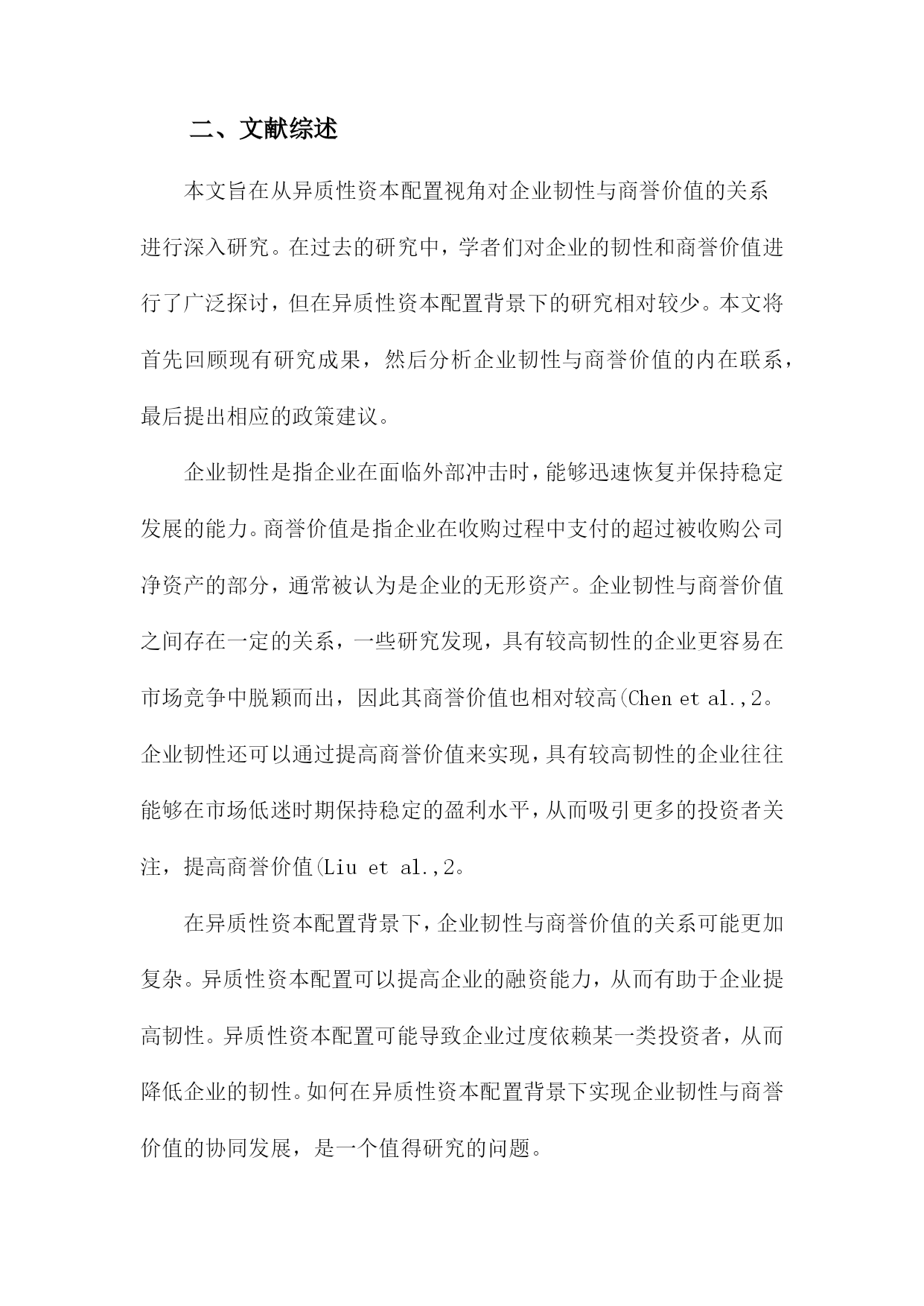 异质性资本配置视角下企业韧性与商誉价值透析一、研究背景和意义随着全球经济一体化的不断深入,企业面临着日益激烈的市场竞争和不断变化的商业环境。在这种背景下,企业韧性成为衡量企业抵御风险、适应变革和持续发展的重要指标。商誉作为一种重要的无形资产,对企业价值和竞争力具有重要影响。越来越多的研究开始关注企业韧性与商誉价值之间的关系,试图从异质性资本配置的角度来探讨这一问题。异质性资本配置是指在资本市场中,不同的投资者根据自身的投资目标、风险偏好和信息获取能力等因素,对各类资产进行分散或集中的投资策略。在企业层面,异质性资本配置主要体现在企业的股权结构、融资渠道和投资组合等方面。从异质性资本配置的角度来研究企业韧性与商誉价值的关系,有助于揭示企业在面对市场风险和竞争压力时,如何通过优化资本结构和投资组合来提高自身抗风险能力和商誉价值。本研究将从以下几个方面展开:首先,通过对国内外相关文献的综述,梳理企业韧性与商誉价值的理论框架和研究现状;其次,从异质性资本配置的角度分析企业韧性与商誉价值的内在联系,探讨其相互影响机制;结合实际案例,验证理论分析的有效性,为企业提高韧性和商誉价值提供实践指导。本研究具有较强的理论和实践意义,它有助于丰富和完善企业韧性与商誉价值的相关理论体系;实践上,它为企业管理层提供了一种新的视角和方法,有助于企业更好地应对市场风险和竞争挑战,实现可持续发展。1.1研究背景从异质性资本配置的角度来看,企业的韧性与其投资组合中各种资产类别的风险敞口密切相关。在面临市场风险和不确定性的情况下,企业需要通过调整投资组合来降低风险,提高韧性。研究企业韧性与异质性资本配置之间的关系有助于揭示企业在不同市场环境下的投资策略和风险管理机制。商誉作为企业价值的重要组成部分,其价值的形成和发展受到多种因素的影响。从异质性资本配置的角度来看,企业的商誉价值与其投资组合中各种资产类别的质量和价值相关。通过对企业商誉价值的透析,可以更好地理解企业在市场竞争中的优势地位和核心竞争力,为投资者提供有价值的投资建议。从异质性资本配置视角对企业的韧性和商誉价值进行透析具有重要的理论和实践意义。本研究将通过对企业韧性与异质性资本配置关系的探讨,以及对商誉价值的分析,为企业管理者提供有关如何提高企业韧性和优化商誉价值的启示,以期为企业的可持续发展提供理论支持。1.2研究意义本研究将通过对企业韧性与商誉价值的相关理论进行梳理,构建一个完整的理论框架,以期为企业韧性与商誉价值关系的探讨提供理论支持。本研究还将对国内外相关研究成果进行综述,分析现有研究在理论体系、研究方法和实证分析等方面的不足之处,为后续研究提供借鉴和启示。本研究将从异质性资本配置的视角出发,结合企业财务数据和经营绩效指标,对企业韧性与商誉价值之间的关系进行实证分析。通过对比分析不同行业、不同规模企业之间的韧性与商誉价值差异,揭示企业韧性对商誉价值的影响机制,为企业制定有效的商誉管理策略提供实证依据。本研究将提出针对企业韧性与商誉价值关系的政策建议,为企业提高韧性、优化商誉管理提供实践指导。这些建议将有助于企业在面临不确定和风险挑战时,更好地调整经营策略、优化资源配置,从而提高企业的竞争力和抗风险能力,实现可持续发展。二、文献综述本文旨在从异质性资本配置视角对企业韧性与商誉价值的关系进行深入研究。在过去的研究中,学者们对企业的韧性和商誉价值进行了广泛探讨,但在异质性资本配置背景下的研究相对较少。本文将首先回顾现有研究成果,然后分析企业韧性与商誉价值的内在联系,最后提出相应的政策建议。企业韧性是指企业在面临外部冲击时,能够迅速恢复并保持稳定发展的能力。商誉价值是指企业在收购过程中支付的超过被收购公司净资产的部分,通常被认为是企业的无形资产。企业韧性与商誉价值之间存在一定的关系,一些研究发现,具有较高韧性的企业更容易在市场竞争中脱颖而出,因此其商誉价值也相对较高(Chenetal.,2。企业韧性还可以通过提高商誉价值来实现,具有较高韧性的企业往往能够在市场低迷时期保持稳定的盈利水平,从而吸引更多的投资者关注,提高商誉价值(Liuetal.,2。在异质性资本配置背景下,企业韧性与商誉价值的关系可能更加复杂。异质性资本配置可以提高企业的融资能力,从而有助于企业提高韧性。异质性资本配置可能导致企业过度依赖某一类投资者,从而降低企业的韧性。如何在异质性资本配置背景下实现企业韧性与商誉价值的协同发展,是一个值得研究的问题。优化资本市场结构,引导资金流向具有较高韧性的企业。政府可以通过调整税收政策、鼓励长期投资等手段,引导资金流向具有较高韧性的企业,从而提高这些企业的商誉价值。加强企业内部管理,提高企业韧性。政府可以通过培训、技术支持等方式,帮助企业提高内部管理水平,增强企