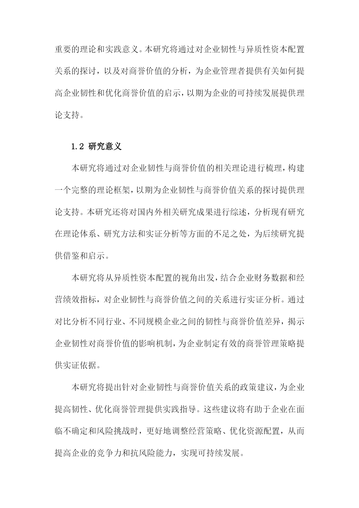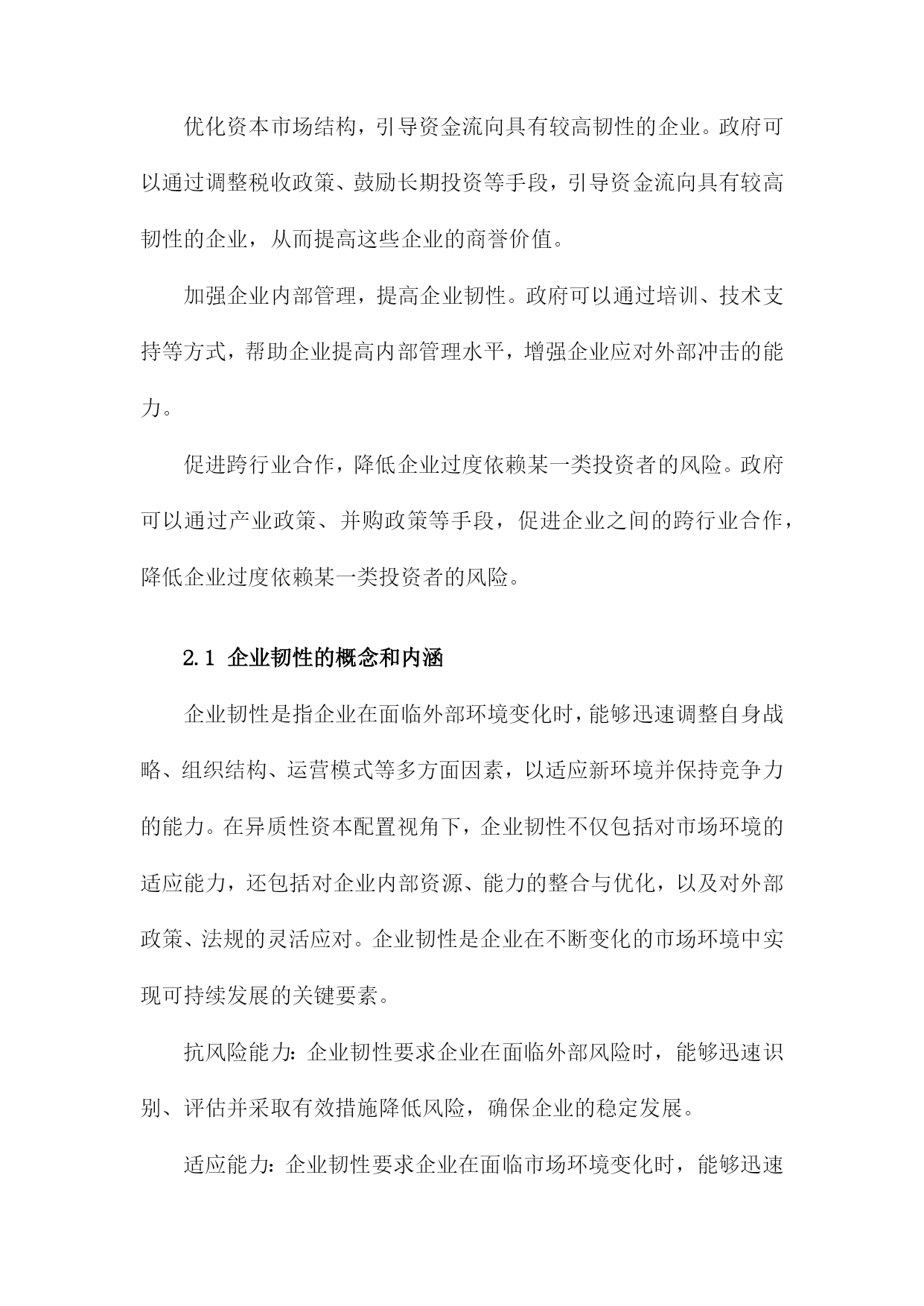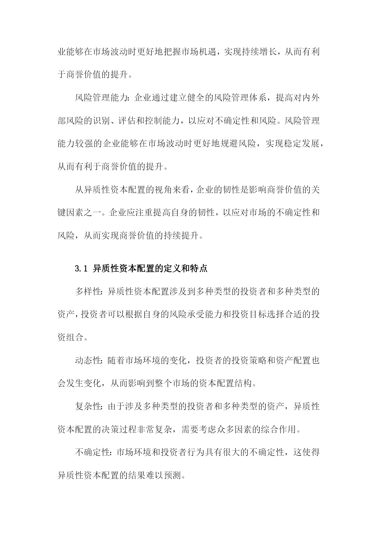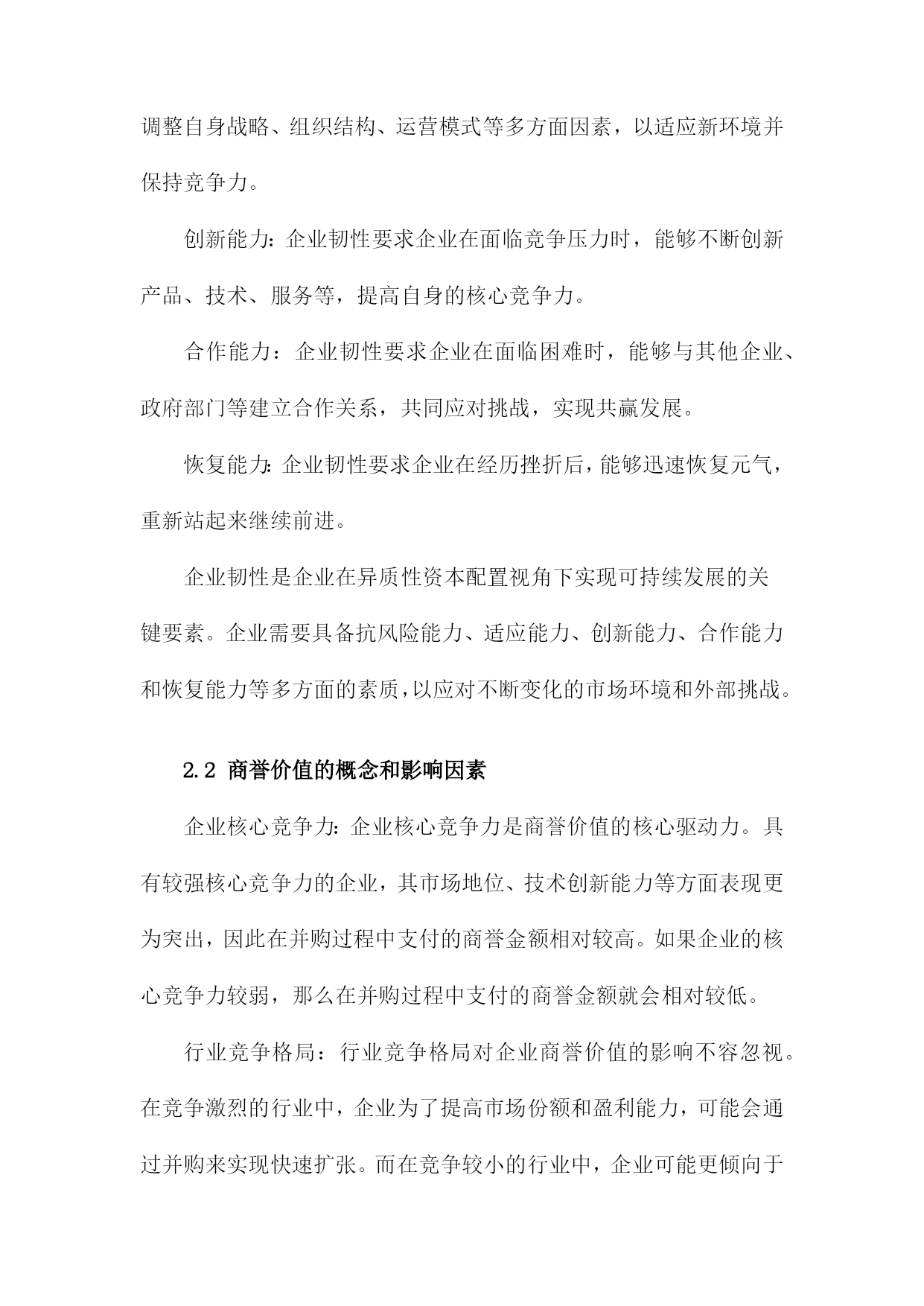 异质性资本配置视角下企业韧性与商誉价值透析一、研究背景和意义随着全球经济一体化的不断深入,企业面临着日益激烈的市场竞争和不断变化的商业环境。在这种背景下,企业韧性成为衡量企业抵御风险、适应变革和持续发展的重要指标。商誉作为一种重要的无形资产,对企业价值和竞争力具有重要影响。越来越多的研究开始关注企业韧性与商誉价值之间的关系,试图从异质性资本配置的角度来探讨这一问题。异质性资本配置是指在资本市场中,不同的投资者根据自身的投资目标、风险偏好和信息获取能力等因素,对各类资产进行分散或集中的投资策略。在企业层面,异质性资本配置主要体现在企业的股权结构、融资渠道和投资组合等方面。从异质性资本配置的角度来研究企业韧性与商誉价值的关系,有助于揭示企业在面对市场风险和竞争压力时,如何通过优化资本结构和投资组合来提高自身抗风险能力和商誉价值。本研究将从以下几个方面展开:首先,通过对国内外相关文献的综述,梳理企业韧性与商誉价值的理论框架和研究现状;其次,从异质性资本配置的角度分析企业韧性与商誉价值的内在联系,探讨其相互影响机制;结合实际案例,验证理论分析的有效性,为企业提高韧性和商誉价值提供实践指导。本研究具有较强的理论和实践意义,它有助于丰富和完善企业韧性与商誉价值的相关理论体系;实践上,它为企业管理层提供了一种新的视角和方法,有助于企业更好地应对市场风险和竞争挑战,实现可持续发展。1.1研究背景从异质性资本配置的角度来看,企业的韧性与其投资组合中各种资产类别的风险敞口密切相关。在面临市场风险和不确定性的情况下,企业需要通过调整投资组合来降低风险,提高韧性。研究企业韧性与异质性资本配置之间的关系有助于揭示企业在不同市场环境下的投资策略和风险管理机制。商誉作为企业价值的重要组成部分,其价值的形成和发展受到多种因素的影响。从异质性资本配置的角度来看,企业的商誉价值与其投资组合中各种资产类别的质量和价值相关。通过对企业商誉价值的透析,可以更好地理解企业在市场竞争中的优势地位和核心竞争力,为投资者提供有价值的投资建议。从异质性资本配置视角对企业的韧性和商誉价值进行透析具有重要的理论和实践意义。本研究将通过对企业韧性与异质性资本配置关系的探讨,以及对商誉价值的分析,为企业管理者提供有关如何提高企业韧性和优化商誉价值的启示,以期为企业的可持续发展提供理论支持。1.2研究意义本研究将通过对企业韧性与商誉价值的相关理论进行梳理,构建一个完整的理论框架,以期为企业韧性与商誉价值关系的探讨提供理论支持。本研究还将对国内外相关研究成果进行综述,分析现有研究在理论体系、研究方法和实证分析等方面的不足之处,为后续研究提供借鉴和启示。本研究将从异质性资本配置的视角出发,结合企业财务数据和经营绩效指标,对企业韧性与商誉价值之间的关系进行实证分析。通过对比分析不同行业、不同规模企业之间的韧性与商誉价值差异,揭示企业韧性对商誉价值的影响机制,为企业制定有效的商誉管理策略提供实证依据。本研究将提出针对企业韧性与商誉价值关系的政策建议,为企业提高韧性、优化商誉管理提供实践指导。这些建议将有助于企业在面临不确定和风险挑战时,更好地调整经营策略、优化资源配置,从而提高企业的竞争力和抗风险能力,实现可持续发展。二、文献综述本文旨在从异质性资本配置视角对企业韧性与商誉价值的关系进行深入研究。在过去的研究中,学者们对企业的韧性和商誉价值进行了广泛探讨,但在异质性资本配置背景下的研究相对较少。本文将首先回顾现有研究成果,然后分析企业韧性与商誉价值的内在联系,最后提出相应的政策建议。企业韧性是指企业在面临外部冲击时,能够迅速恢复并保持稳定发展的能力。商誉价值是指企业在收购过程中支付的超过被收购公司净资产的部分,通常被认为是企业的无形资产。企业韧性与商誉价值之间存在一定的关系,一些研究发现,具有较高韧性的企业更容易在市场竞争中脱颖而出,因此其商誉价值也相对较高(Chenetal.,2。企业韧性还可以通过提高商誉价值来实现,具有较高韧性的企业往往能够在市场低迷时期保持稳定的盈利水平,从而吸引更多的投资者关注,提高商誉价值(Liuetal.,2。在异质性资本配置背景下,企业韧性与商誉价值的关系可能更加复杂。异质性资本配置可以提高企业的融资能力,从而有助于企业提高韧性。异质性资本配置可能导致企业过度依赖某一类投资者,从而降低企业的韧性。如何在异质性资本配置背景下实现企业韧性与商誉价值的协同发展,是一个值得研究的问题。优化资本市场结构,引导资金流向具有较高韧性的企业。政府可以通过调整税收政策、鼓励长期投资等手段,引导资金流向具有较高韧性的企业,从而提高这些企业的商誉价值。加强企业内部管理,提高企业韧性。政府可以通过培训、技术支持等方式,帮助企业提高内部管理水平,增强企