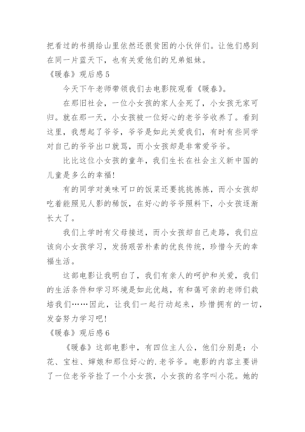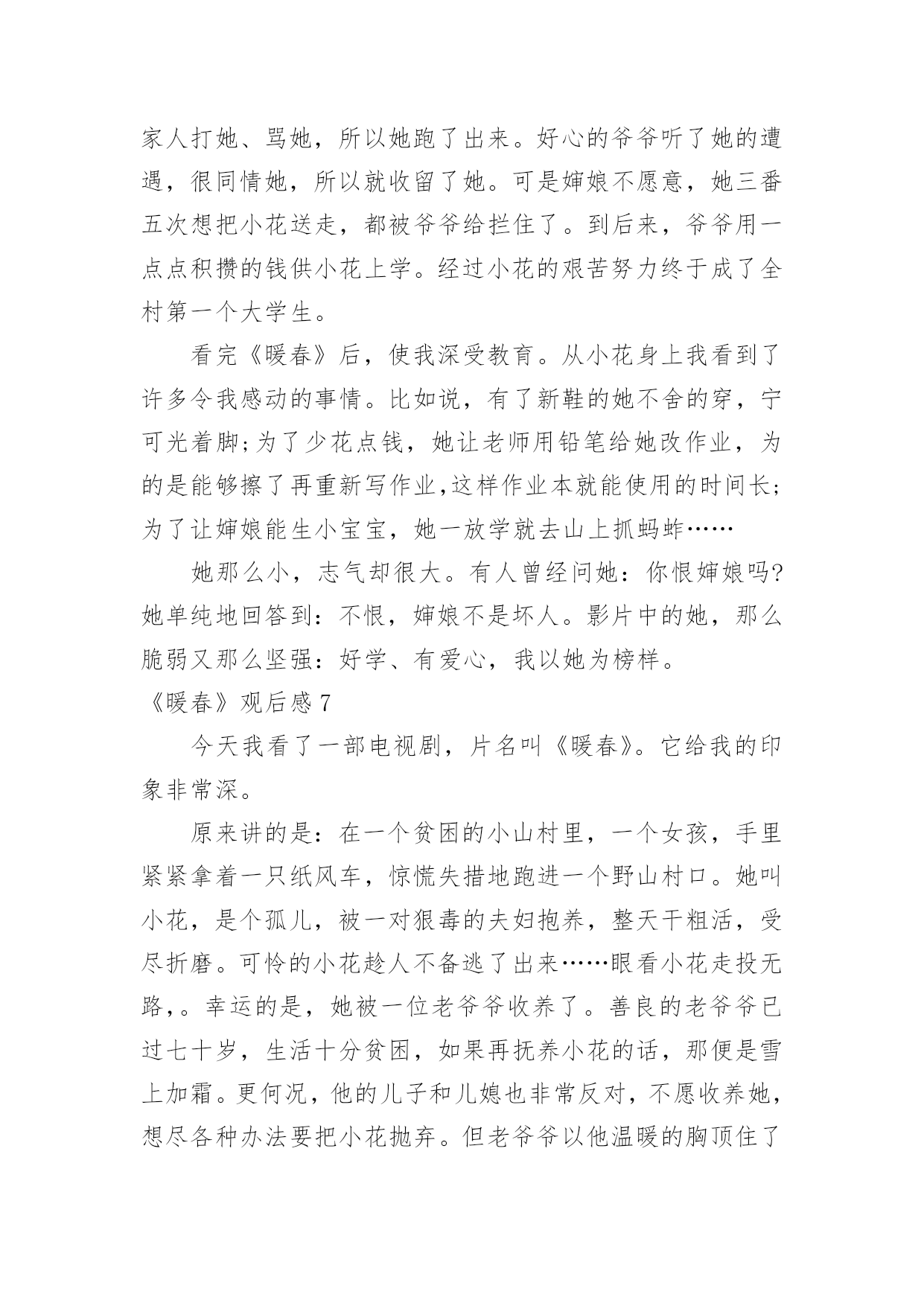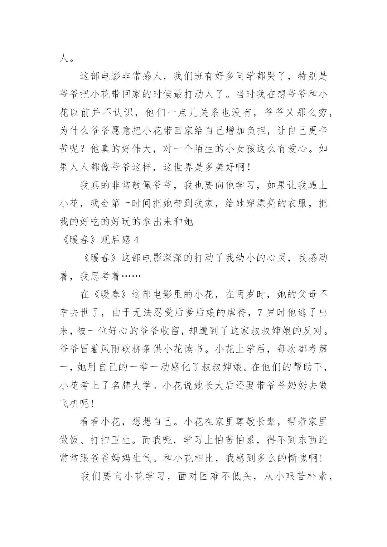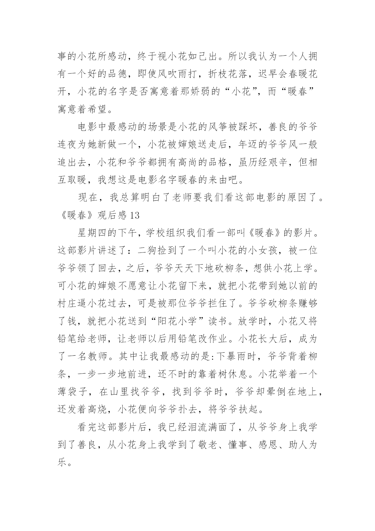 《暖春》观后感《暖春》观后感15篇当品味完一部作品后,对人生或者事物一定产生了许多感想吧,是时候写一篇观后感好好记录一下了。现在你是否对观后感一筹莫展呢?以下是小编为大家整理的《暖春》观后感,欢迎大家借鉴与参考,希望对大家有所帮助。《暖春》观后感1《暖春》这部电影真是感动人心,催人泪下。当电影才放到一半时,我就把纸巾哭湿了,眼睛哭红了。影片中的小花可真善良,对任何人都很友好,时时刻刻都为爷爷和亲人着想。爷爷更是让人感动,一辈子就为了两个孤儿没有成家,将宝柱和小花抚养长大,他们俩用真情感动了身边所有的村民。村民们把各自的爱心捐了出来,让小花一家人生活有了改善。十四年之后,小花长大成人了,通过自己的勤奋和努力,成为了村里的第一个大学生,毕业后,她为了报答村里对她的培养,毅然选择回到乡村当一名乡村教师。这部影片告诉我们一个道理:只要真诚地对待身边的每一个人,无论是谁,都会被你的真诚所感动,愿意为你付出一切。《暖春》观后感2今天,我们全班同学去看了《暖春》这部电影,看完之后我发现我们班很多同学都留下了眼泪,因为这部电影太感人了。这部电影讲的是一个叫小花的孩子,她生长在一个贫穷的小山村。这个村有一个黑心的包工头,他让小花的爸爸去挖煤,不幸的是小花的爸爸被砸死煤矿里。小花的爸爸死后,小花的妈妈及奶奶因悲伤也相继死去,就这样小花成了一个孤儿,后来小花被一个好心的爷爷收养,不管这位爷爷的家人怎样反对,但是爷爷硬要将小花留下。面对叔叔及婶娘的歧视,小花不但不记恨还用他那纯洁善良的心大大家感动……看完这部电影我想到了:人与人之间要及睦相处;互相信任;互相了解;互相帮助。这让我体会到了爷爷对社会无私的爱,及小花的不屈不挠的精神,这都是值得我们去学习的。记住这两个人——坚强的小花及她的具有一颗爱心的爷爷。《暖春》观后感3上个星期五,老师带我们在教室里看了一部非常感人的电影叫《暖春》。《暖春》讲的是一个名叫小花的可怜女孩被一位好心的爷爷收养了,可是爷爷的家里很穷,不能给小花买鞋和衣服,也上不起学。可是小花很懂事,非常体谅爷爷的难处,对爷爷非常孝顺。虽然婶婶不喜欢小花,觉得小花很多余,但是小花一次又一次的用她的善良、真诚和爱打动着周围所有的人。这部电影非常感人,我们班有好多同学都哭了,特别是爷爷把小花带回家的时候最打动人了。当时我在想爷爷和小花以前并不认识,他们一点儿关系也没有,爷爷又那么穷,为什么爷爷愿意把小花带回家给自己增加负担,让自己更辛苦呢?他真的好伟大,对一个陌生的小女孩这么有爱心。如果人人都像爷爷这样,这世界是多美好啊!我真的非常敬佩爷爷,我也要向他学习,如果让我遇上小花,我会第一时间把她带到我家,给她穿漂亮的衣服,把我的好吃的好玩的拿出来和她《暖春》观后感4《暖春》这部电影深深的打动了我幼小的心灵,我感动着,我思考着……在《暖春》这部电影里的小花,在两岁时,她的父母不幸去世了,由于无法忍受后爹后娘的虐待,7岁时他逃了出来,被一位好心的爷爷收留,却遭到了这家叔叔婶娘的反对。爷爷冒着风雨砍柳条供小花读书。小花上学后,每次都考第一,她用自己的一举一动感化了叔叔婶娘。在他们的帮助下,小花考上了名牌大学。小花说她长大后还要带爷爷奶奶去做飞机呢!看看小花,想想自己。小花在家里尊敬长辈,帮着家里做饭、打扫卫生。而我呢,学习上怕苦怕累,得不到东西还常常跟爸爸妈妈生气。和小花相比,我感到多么的惭愧啊!我们要向小花学习,面对困难不低头,从小艰苦朴素,把看过的书捐给山里依然还很贫困的小伙伴们。让他们感到在同一片蓝天下,也有关爱他们的兄弟姐妹。《暖春》观后感5今天下午老师带领我们去电影院观看《暖春》。在那旧社会,一位小女孩的家人全死了,小女孩无家可归。就在那一天,小女孩被一位好心的老爷爷收养了。看到这里,我想起了爷爷,爷爷是如此关爱我们,有时有些同学对自己的爷爷出口就骂,而小女孩却是非常爱爷爷。比比这位小女孩的童年,我们生长在社会主义新中国的儿童是多么的幸福!有的同学对美味可口的饭菜还要挑挑拣拣,而小女孩却吃着能照见人影的稀饭,在好心的爷爷照料下,小女孩逐渐长大了。我们上学时有父母接送,而小女孩却自己走路,我们应该向小女孩学习,发扬艰苦朴素的优良传统,珍惜今天的幸福生活。这部电影让我明白了,我们有亲人的呵护和关爱,我们的生活条件和学习环境是如此优越,有和蔼可亲的老师们栽培我们……因此,让我们一起行动起来,珍惜拥有的一切,发奋努力学习吧!《暖春》观后感6《暖春》这部电影中,有四位主人公,他们分别是:小花、宝柱、婶娘和那位好心的.老爷爷。电影的内容主要讲了一位老爷爷捡了一个小女孩,小女孩的名字叫小花。她的家人打她、骂她,所以她跑了出来。好心的爷爷听了她的遭遇,很同情她,所以就收留了她。可是婶娘不愿意,她三番五次想把小花送走,都被爷爷给拦住了。到后来,爷爷用一点点积