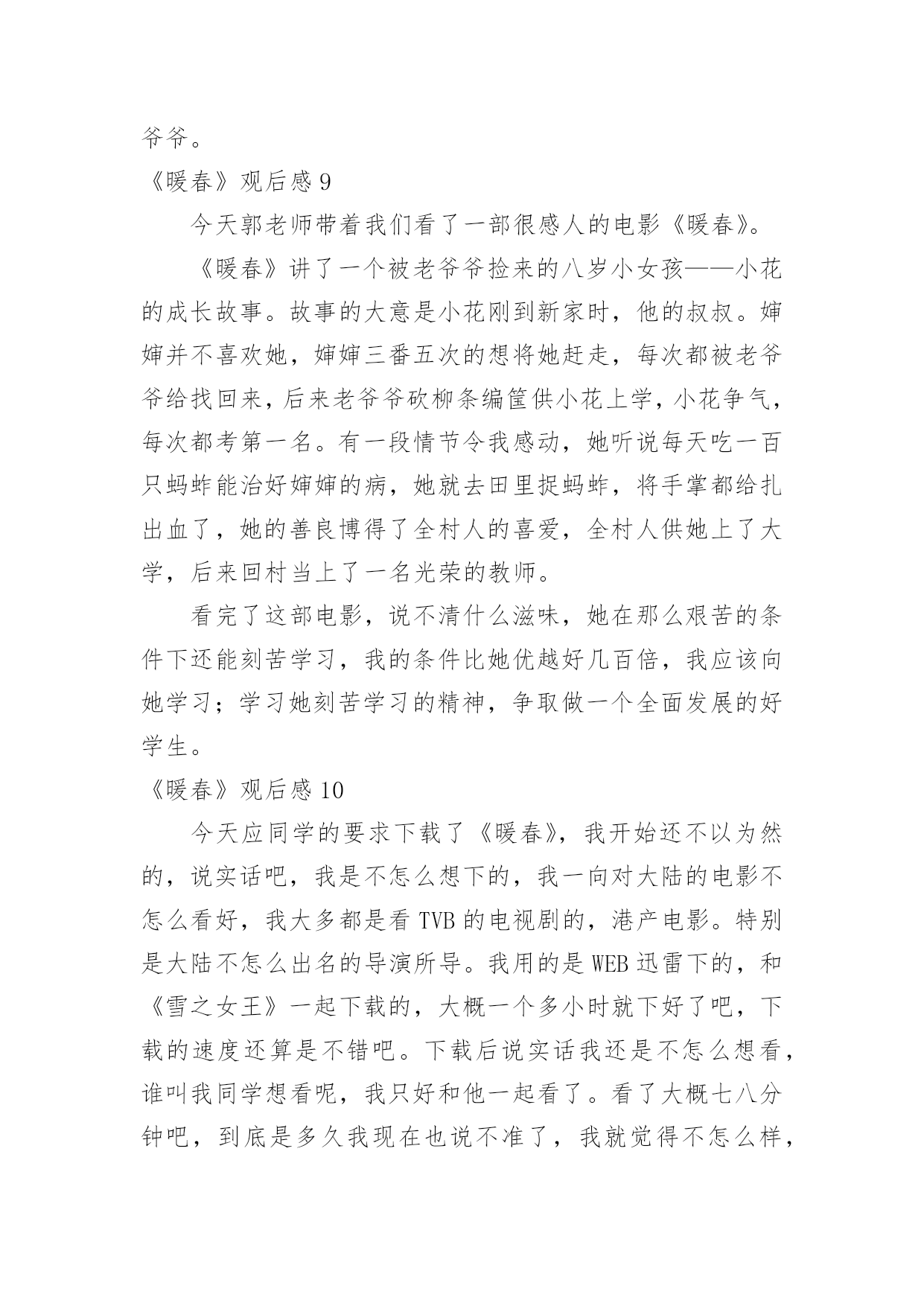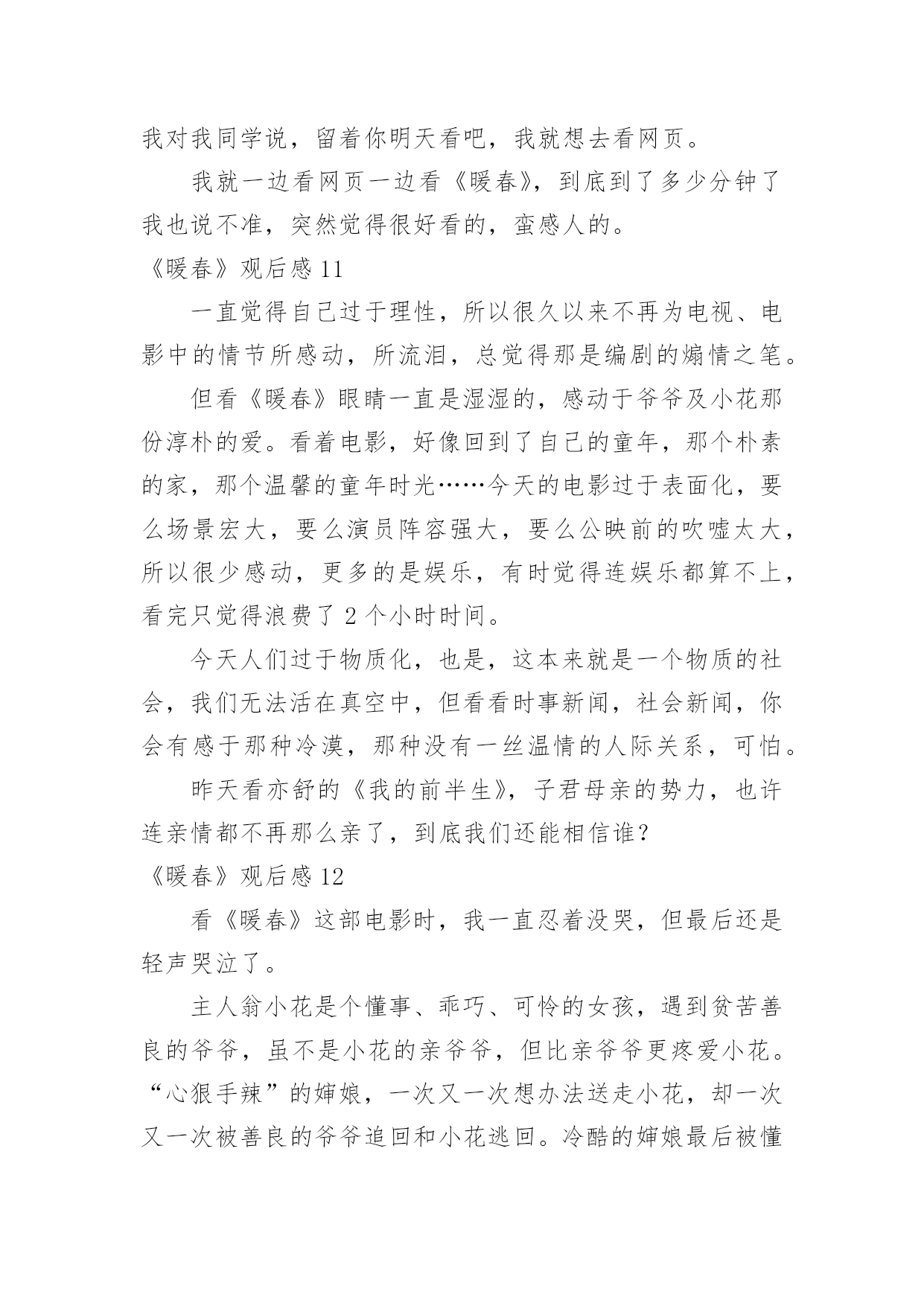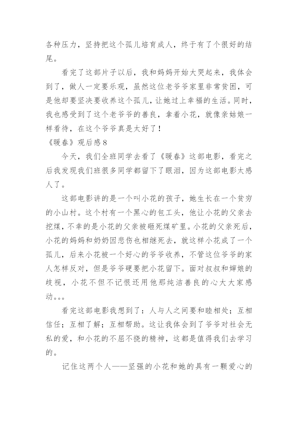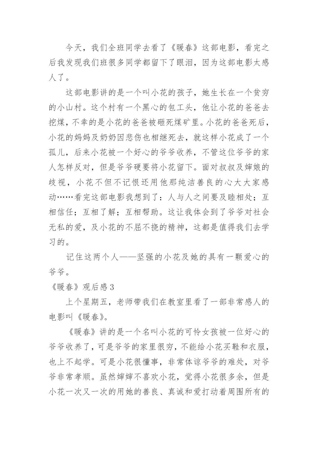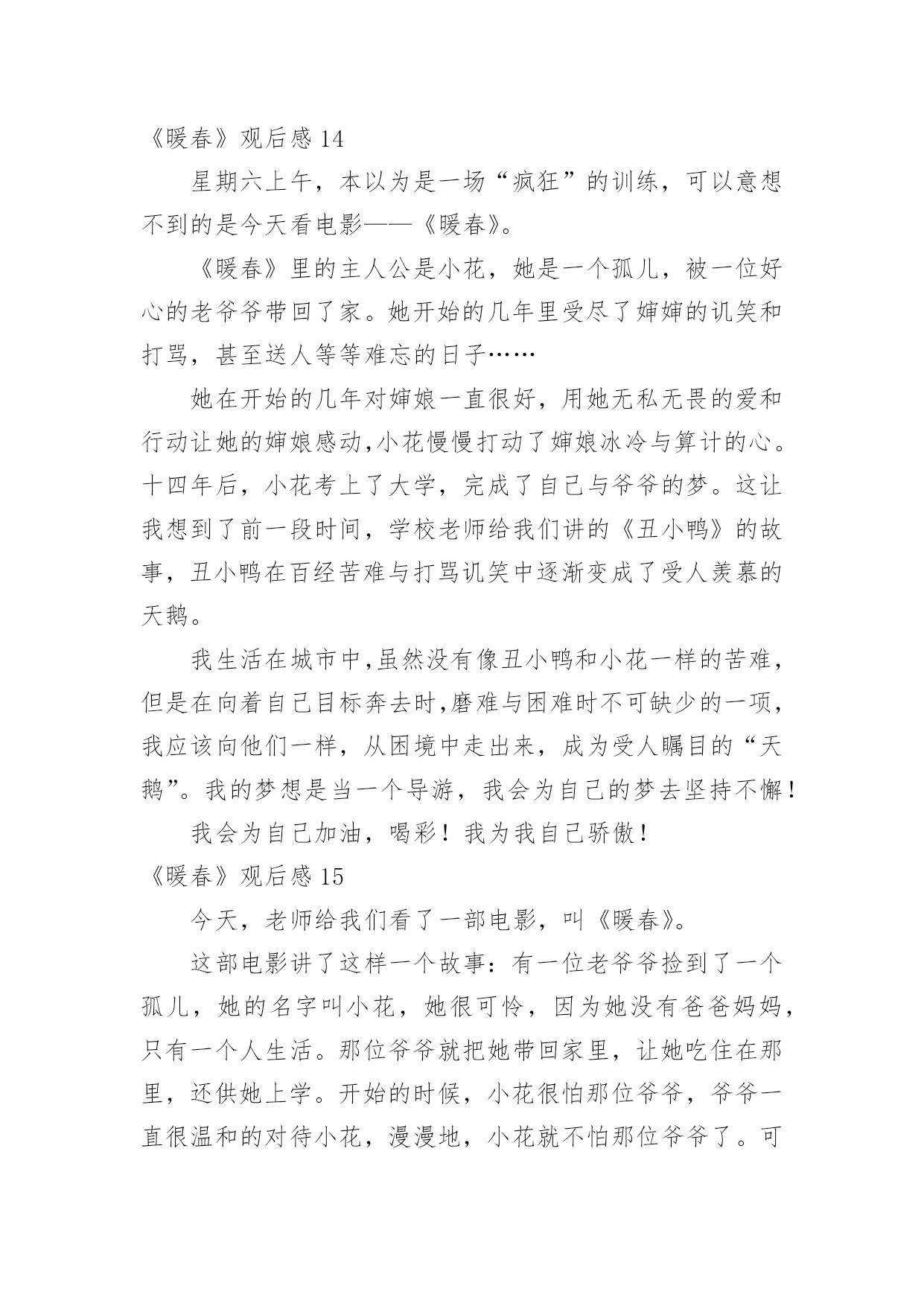 《暖春》观后感《暖春》观后感15篇当品味完一部作品后,对人生或者事物一定产生了许多感想吧,是时候写一篇观后感好好记录一下了。现在你是否对观后感一筹莫展呢?以下是小编为大家整理的《暖春》观后感,欢迎大家借鉴与参考,希望对大家有所帮助。《暖春》观后感1《暖春》这部电影真是感动人心,催人泪下。当电影才放到一半时,我就把纸巾哭湿了,眼睛哭红了。影片中的小花可真善良,对任何人都很友好,时时刻刻都为爷爷和亲人着想。爷爷更是让人感动,一辈子就为了两个孤儿没有成家,将宝柱和小花抚养长大,他们俩用真情感动了身边所有的村民。村民们把各自的爱心捐了出来,让小花一家人生活有了改善。十四年之后,小花长大成人了,通过自己的勤奋和努力,成为了村里的第一个大学生,毕业后,她为了报答村里对她的培养,毅然选择回到乡村当一名乡村教师。这部影片告诉我们一个道理:只要真诚地对待身边的每一个人,无论是谁,都会被你的真诚所感动,愿意为你付出一切。《暖春》观后感2今天,我们全班同学去看了《暖春》这部电影,看完之后我发现我们班很多同学都留下了眼泪,因为这部电影太感人了。这部电影讲的是一个叫小花的孩子,她生长在一个贫穷的小山村。这个村有一个黑心的包工头,他让小花的爸爸去挖煤,不幸的是小花的爸爸被砸死煤矿里。小花的爸爸死后,小花的妈妈及奶奶因悲伤也相继死去,就这样小花成了一个孤儿,后来小花被一个好心的爷爷收养,不管这位爷爷的家人怎样反对,但是爷爷硬要将小花留下。面对叔叔及婶娘的歧视,小花不但不记恨还用他那纯洁善良的心大大家感动……看完这部电影我想到了:人与人之间要及睦相处;互相信任;互相了解;互相帮助。这让我体会到了爷爷对社会无私的爱,及小花的不屈不挠的精神,这都是值得我们去学习的。记住这两个人——坚强的小花及她的具有一颗爱心的爷爷。《暖春》观后感3上个星期五,老师带我们在教室里看了一部非常感人的电影叫《暖春》。《暖春》讲的是一个名叫小花的可怜女孩被一位好心的爷爷收养了,可是爷爷的家里很穷,不能给小花买鞋和衣服,也上不起学。可是小花很懂事,非常体谅爷爷的难处,对爷爷非常孝顺。虽然婶婶不喜欢小花,觉得小花很多余,但是小花一次又一次的用她的善良、真诚和爱打动着周围所有的人。这部电影非常感人,我们班有好多同学都哭了,特别是爷爷把小花带回家的时候最打动人了。当时我在想爷爷和小花以前并不认识,他们一点儿关系也没有,爷爷又那么穷,为什么爷爷愿意把小花带回家给自己增加负担,让自己更辛苦呢?他真的好伟大,对一个陌生的小女孩这么有爱心。如果人人都像爷爷这样,这世界是多美好啊!我真的非常敬佩爷爷,我也要向他学习,如果让我遇上小花,我会第一时间把她带到我家,给她穿漂亮的衣服,把我的好吃的好玩的拿出来和她《暖春》观后感4《暖春》这部电影深深的打动了我幼小的心灵,我感动着,我思考着……在《暖春》这部电影里的小花,在两岁时,她的父母不幸去世了,由于无法忍受后爹后娘的虐待,7岁时他逃了出来,被一位好心的爷爷收留,却遭到了这家叔叔婶娘的反对。爷爷冒着风雨砍柳条供小花读书。小花上学后,每次都考第一,她用自己的一举一动感化了叔叔婶娘。在他们的帮助下,小花考上了名牌大学。小花说她长大后还要带爷爷奶奶去做飞机呢!看看小花,想想自己。小花在家里尊敬长辈,帮着家里做饭、打扫卫生。而我呢,学习上怕苦怕累,得不到东西还常常跟爸爸妈妈生气。和小花相比,我感到多么的惭愧啊!我们要向小花学习,面对困难不低头,从小艰苦朴素,把看过的书捐给山里依然还很贫困的小伙伴们。让他们感到在同一片蓝天下,也有关爱他们的兄弟姐妹。《暖春》观后感5今天下午老师带领我们去电影院观看《暖春》。在那旧社会,一位小女孩的家人全死了,小女孩无家可归。就在那一天,小女孩被一位好心的老爷爷收养了。看到这里,我想起了爷爷,爷爷是如此关爱我们,有时有些同学对自己的爷爷出口就骂,而小女孩却是非常爱爷爷。比比这位小女孩的童年,我们生长在社会主义新中国的儿童是多么的幸福!有的同学对美味可口的饭菜还要挑挑拣拣,而小女孩却吃着能照见人影的稀饭,在好心的爷爷照料下,小女孩逐渐长大了。我们上学时有父母接送,而小女孩却自己走路,我们应该向小女孩学习,发扬艰苦朴素的优良传统,珍惜今天的幸福生活。这部电影让我明白了,我们有亲人的呵护和关爱,我们的生活条件和学习环境是如此优越,有和蔼可亲的老师们栽培我们……因此,让我们一起行动起来,珍惜拥有的一切,发奋努力学习吧!《暖春》观后感6《暖春》这部电影中,有四位主人公,他们分别是:小花、宝柱、婶娘和那位好心的.老爷爷。电影的内容主要讲了一位老爷爷捡了一个小女孩,小女孩的名字叫小花。她的家人打她、骂她,所以她跑了出来。好心的爷爷听了她的遭遇,很同情她,所以就收留了她。可是婶娘不愿意,她三番五次想把小花送走,都被爷爷给拦住了。到后来,爷爷用一点点积