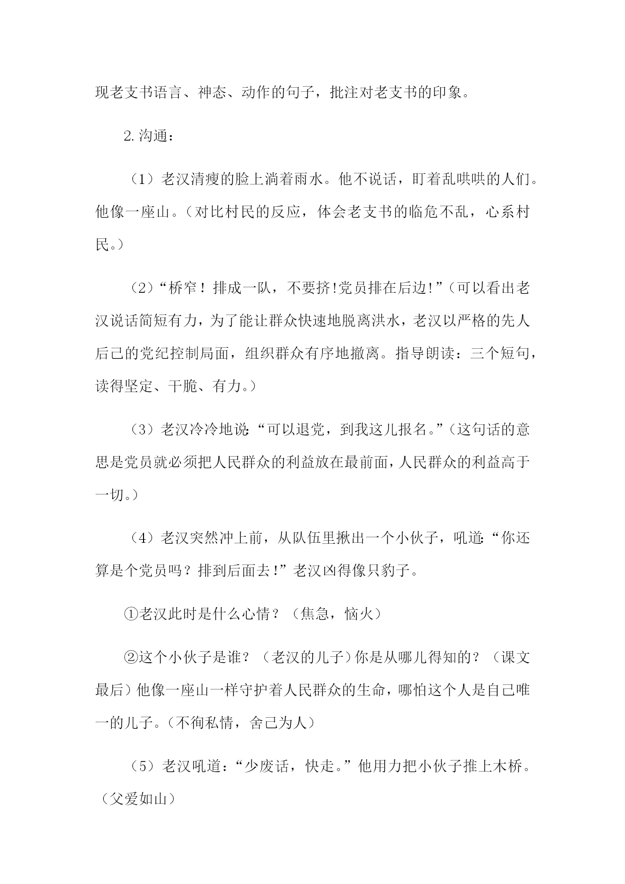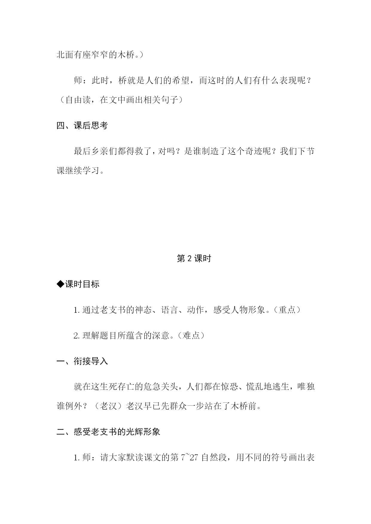13桥[教学目标]1.会写8个生字。能正确读写“咆哮、沙哑、呻吟”等词语。2.有感情地朗读课文,注意读好短句。3.通过老支书的神态、语言、动作,感受人物形象。【语文要素】4.能找出环境描写的句子,初步体会这些描写对表现人物形象的作用。[教学重难点]1.通过老支书的神态、语言、动作,感受人物形象。2.理解题目所蕴含的深意。[教学课时]2课时第1课时◆课时目标1.会写8个生字,会写11个词语。2.初读课文,感知故事情节,感受环境描写的作用。一、谈话导入桥有看得见的,如木桥、石桥;也有看不见的,如心灵的桥、生命