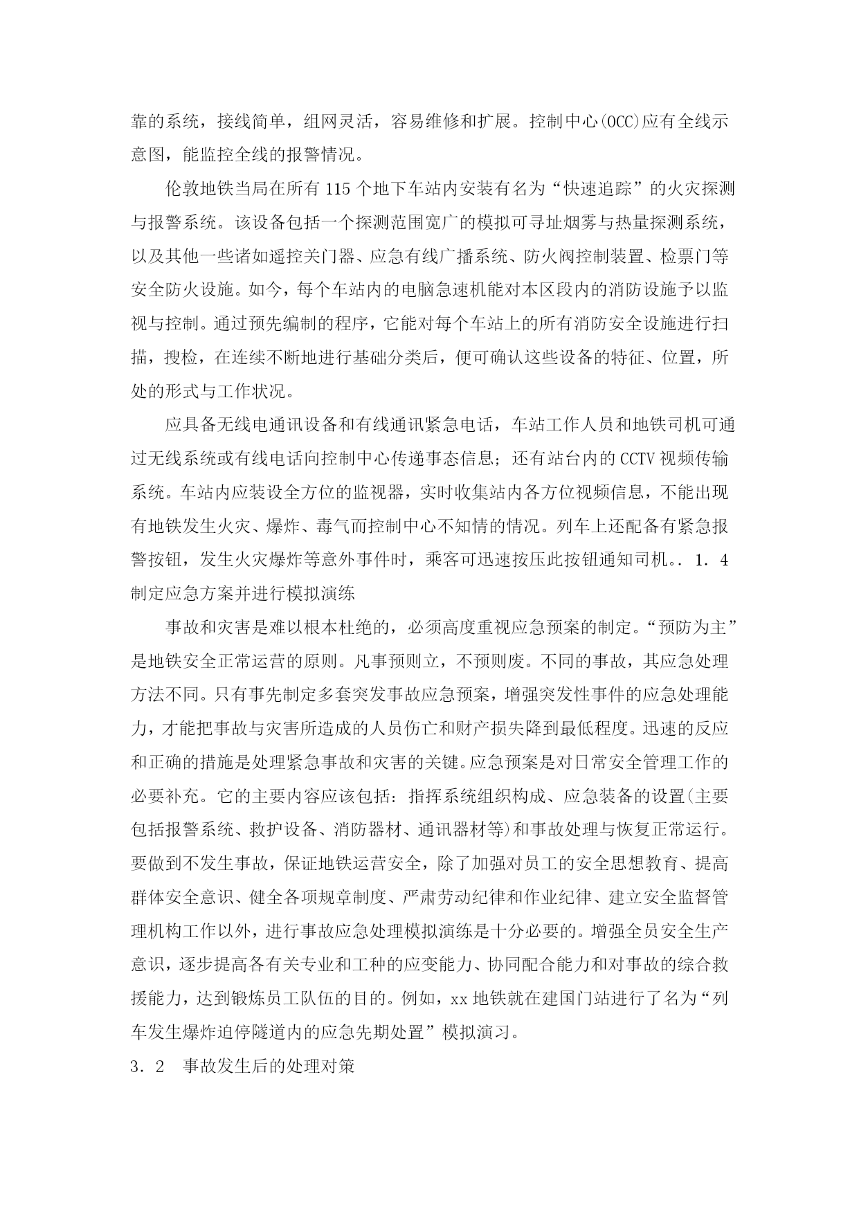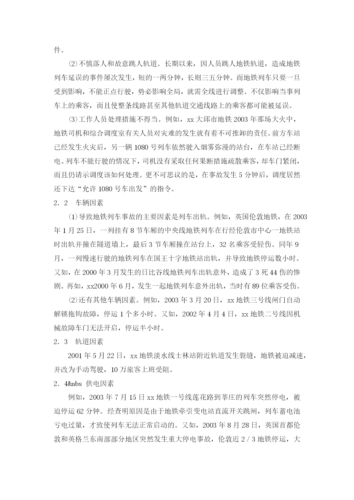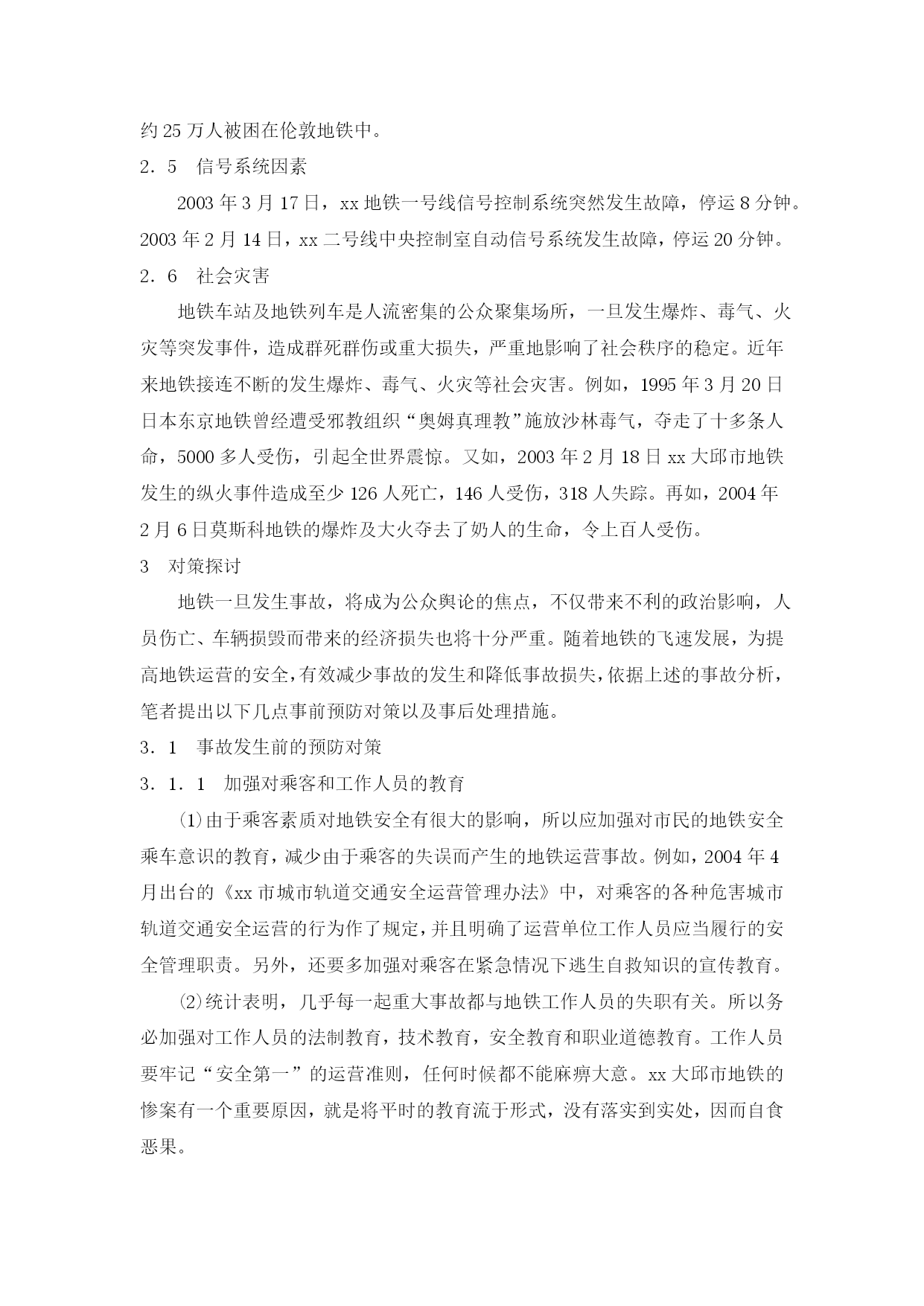 地铁运营事故分析及其对策研究[摘要]在对近年来国内外地铁发生的事故分析的基础上,笔者对影响地铁安全运营的人、车辆、轨道、供电、信号以及社会灾害等主要原因进行了探讨;针对这些原因提出了一些事故发生前的预防对策以及事故发生后的处理措施;突出强调了“以人为本”的大安全观,提出“人—车—轨道—安全管理”的安全运营系统及应急救援体系相结合的对策。这些对策和实施的实现将会减少地铁事故的发生和降低事故造成的人员伤亡及财产损失。[关键词]地铁;事故;影响因素;安全对策1引言地铁是城市公共交通重要组成部分之一,地铁安全的重要性不言而喻。近年来全球地铁事故不断发生,我国的xx、xx、xx等城市地铁先后发生不少事故。因此,分析地铁运营事故的影响因素,制定预防事故相关对策以及突发事故后的救援措施,对于改善地铁运营的安全现状,预防事故和降低事故损失都具有十分重要的意义。2地铁运营事故分析地铁运营安全不仅涉及人—车辆—轨道等系统因素,还受到社会环境和列车运行相关设备(信号系统、供电系统)等因素的影响。近年来国内外地铁事故统计的分析表明:人、车辆、轨道、供电、信号及社会灾害等是地铁事故的主要因素。2.1人员因素从2002年和2003年对xx地铁一、二号线发生事故的分类统计表明:一般性事故主要是因乘客未遵守安全乘车规则,而险性事故多是由于工作人员职责疏忽引发的。人员因素是肇致地铁事故的主要原因,其中包括:(1)拥挤。例如,2001年12月4日晚,xx地铁一号线一名女子在站台上候车,当车驶入站台时,被拥挤人流挤下站台,当场被列车压死。又如,1999年5月在白俄罗斯,也因地铁车站人员过多,混乱而拥挤,导致54名乘客被踩死事件。(2)不慎落人和故意跳人轨道。长期以来,因人员跳人地铁轨道,造成地铁列车延误的事件屡次发生,短的一两分钟,长则三五分钟。而地铁列车只要一旦受到影响,不能正点行驶,势必影响全局,就需全线进行调整。不仅影响当事列车上的乘客,而且使整条线路甚至其他轨道交通线路上的乘客都可能被延误。(3)工作人员处理措施不得当。例如,xx大邱市地铁2003年那场大火中,地铁司机和综合调度室有关人员对灾难的发生就有着不可推卸的责任。前方车站已经发生火灾后,另一辆1080号列车依然驶入烟雾弥漫的站台,在车站已经断电、列车不能行驶的情况下,司机没有采取任何果断措施疏散乘客,却车门紧闭,而且仍请示调度该如何处理。更不可思议的是,在事故发生5分钟后,调度居然还下达“允许1080号车出发”的指令。2.2车辆因素(1)导致地铁列车事故的主要因素是列车出轨。例如,英国伦敦地铁,在2003年1月25日,一列挂有8节车厢的中央线地铁列车在行经伦敦市中心一地铁站时出轨并撞在隧道墙上,最后3节车厢撞在站台上,32名乘客受轻伤。同年9月,一列慢速行驶的地铁列车在国王十字地铁站出轨,并导致地铁停运数小时。又如,在2000年3月发生的日比谷线地铁列车出轨意外,造成了3死44伤的惨剧。再如,xx2000年6月,发生一起地铁列车意外出轨,当时有89位乘客受伤。(2)还有其他车辆因素。例如,2003年3月20日,xx地铁三号线闸门自动解锁拖钩故障,停运1个多小时。又如,2002年4月4日,xx地铁二号线因机械故障车门无法开启,停运半小时。2.3轨道因素2001年5月22日,xx地铁淡水线士林站附近轨道发生裂缝,地铁被迫减速,并改为手动驾驶,10万旅客上班受阻。2.4&nbs供电因素例如,2003年7月15日xx地铁一号线莲花路到莘庄的列车突然停电,被迫停运62分钟。经查明原因是由于地铁牵引变电站直流开关跳闸,列车蓄电池亏电过量,才致使列车无法正常启动的。又如,2003年8月28日,英国首都伦敦和英格兰东南部部分地区突然发生重大停电事故,伦敦近2/3地铁停运,大约25万人被困在伦敦地铁中。2.5信号系统因素2003年3月17日,xx地铁一号线信号控制系统突然发生故障,停运8分钟。2003年2月14日,xx二号线中央控制室自动信号系统发生故障,停运20分钟。2.6社会灾害地铁车站及地铁列车是人流密集的公众聚集场所,一旦发生爆炸、毒气、火灾等突发事件,造成群死群伤或重大损失,严重地影响了社会秩序的稳定。近年来地铁接连不断的发生爆炸、毒气、火灾等社会灾害。例如,1995年3月20日日本东京地铁曾经遭受邪教组织“奥姆真理教”施放沙林毒气,夺走了十多条人命,5000多人受伤,引起全世界震惊。又如,2003年2月18日xx大邱市地铁发生的纵火事件造成至少126人死亡,146人受伤,318人失踪。再如,2004年2月6日莫斯科地铁的爆炸及大火夺去了奶人的生命,令上百人受伤。3对策探讨地铁一旦发生事故,将成为公众舆论的焦点,不仅带来不利的政治影响,人员伤亡、车