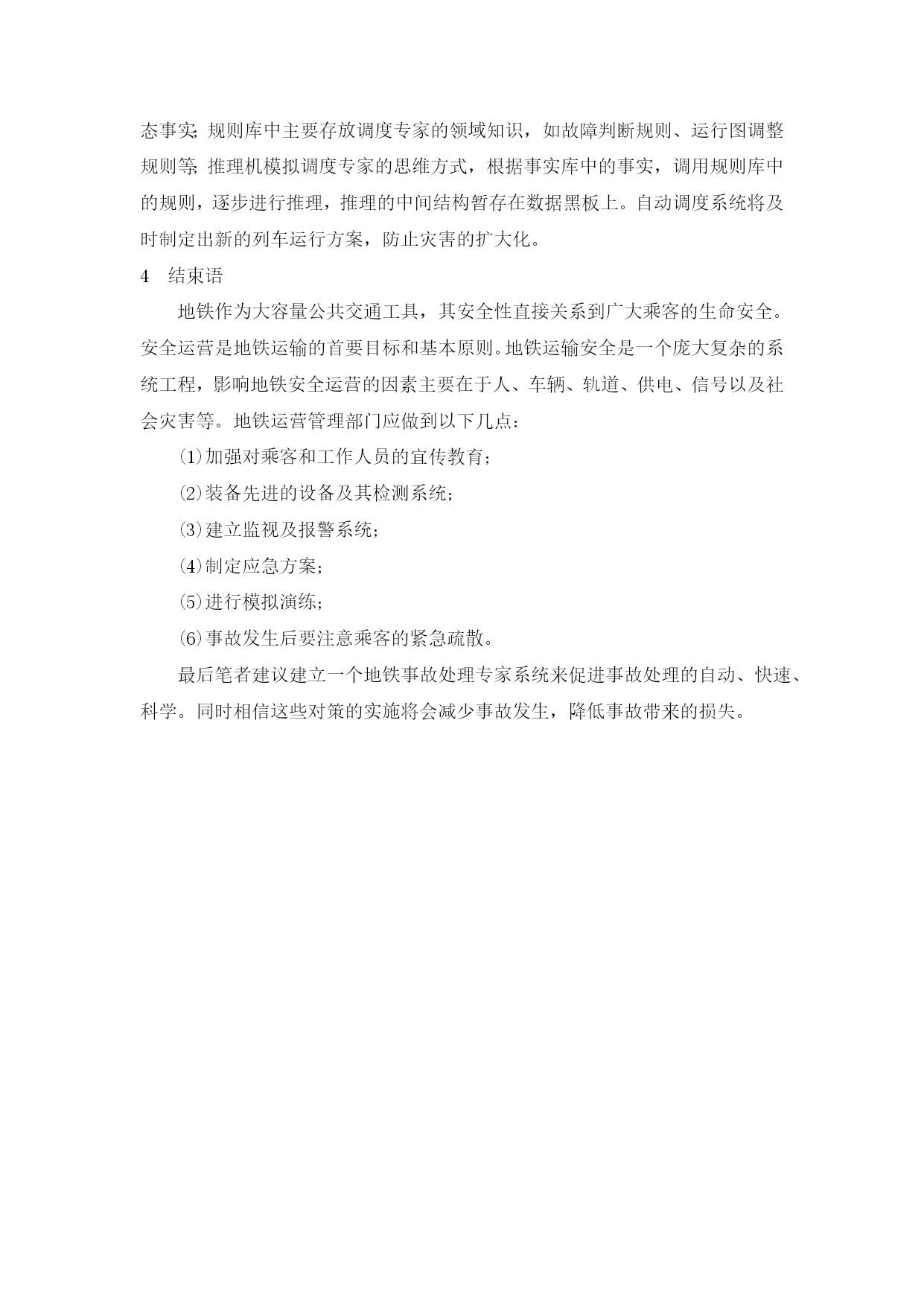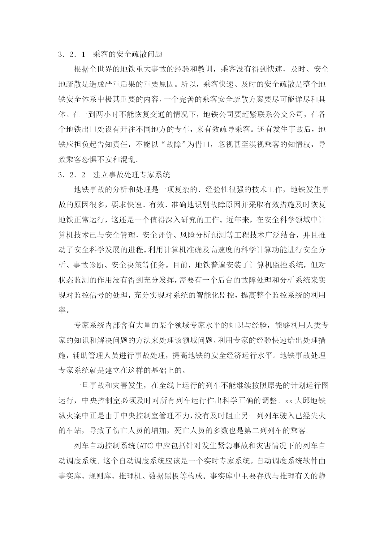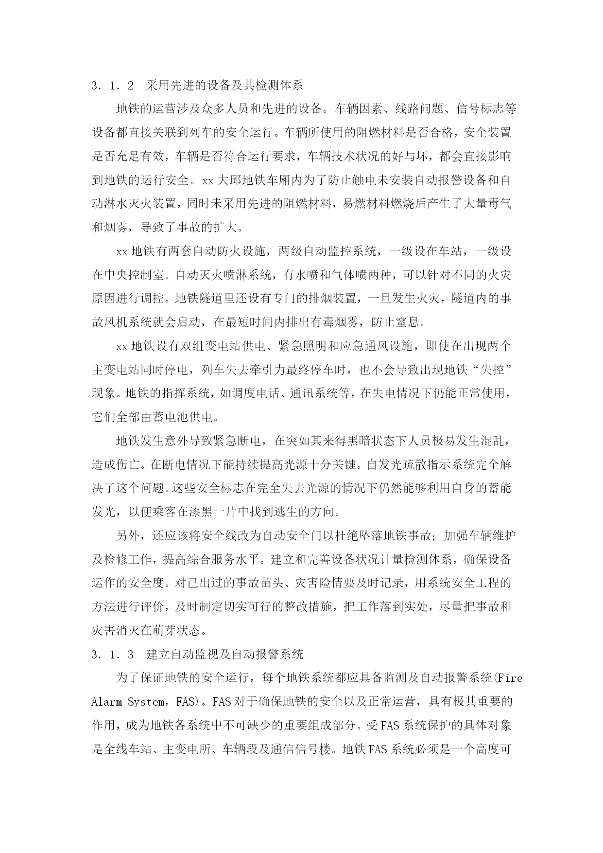 地铁运营事故分析及其对策研究[摘要]在对近年来国内外地铁发生的事故分析的基础上,笔者对影响地铁安全运营的人、车辆、轨道、供电、信号以及社会灾害等主要原因进行了探讨;针对这些原因提出了一些事故发生前的预防对策以及事故发生后的处理措施;突出强调了“以人为本”的大安全观,提出“人—车—轨道—安全管理”的安全运营系统及应急救援体系相结合的对策。这些对策和实施的实现将会减少地铁事故的发生和降低事故造成的人员伤亡及财产损失。[关键词]地铁;事故;影响因素;安全对策1引言地铁是城市公共交通重要组成部分之一,地铁安全的重要性不言而喻。近年来全球地铁事故不断发生,我国的xx、xx、xx等城市地铁先后发生不少事故。因此,分析地铁运营事故的影响因素,制定预防事故相关对策以及突发事故后的救援措施,对于改善地铁运营的安全现状,预防事故和降低事故损失都具有十分重要的意义。2地铁运营事故分析地铁运营安全不仅涉及人—车辆—轨道等系统因素,还受到社会环境和列车运行相关设备(信号系统、供电系统)等因素的影响。近年来国内外地铁事故统计的分析表明:人、车辆、轨道、供电、信号及社会灾害等是地铁事故的主要因素。2.1人员因素从2002年和2003年对xx地铁一、二号线发生事故的分类统计表明:一般性事故主要是因乘客未遵守安全乘车规则,而险性事故多是由于工作人员职责疏忽引发的。人员因素是肇致地铁事故的主要原因,其中包括:(1)拥挤。例如,2001年12月4日晚,xx地铁一号线一名女子在站台上候车,当车驶入站台时,被拥挤人流挤下站台,当场被列车压死。又如,1999年5月在白俄罗斯,也因地铁车站人员过多,混乱而拥挤,导致54名乘客被踩死事件。(2)不慎落人和故意跳人轨道。长期以来,因人员跳人地铁轨道,造成地铁列车延误的事件屡次发生,短的一两分钟,长则三五分钟。而地铁列车只要一旦受到影响,不能正点行驶,势必影响全局,就需全线进行调整。不仅影响当事列车上的乘客,而且使整条线路甚至其他轨道交通线路上的乘客都可能被延误。(3)工作人员处理措施不得当。例如,xx大邱市地铁2003年那场大火中,地铁司机和综合调度室有关人员对灾难的发生就有着不可推卸的责任。前方车站已经发生火灾后,另一辆1080号列车依然驶入烟雾弥漫的站台,在车站已经断电、列车不能行驶的情况下,司机没有采取任何果断措施疏散乘客,却车门紧闭,而且仍请示调度该如何处理。更不可思议的是,在事故发生5分钟后,调度居然还下达“允许1080号车出发”的指令。2.2车辆因素(1)导致地铁列车事故的主要因素是列车出轨。例如,英国伦敦地铁,在2003年1月25日,一列挂有8节车厢的中央线地铁列车在行经伦敦市中心一地铁站时出轨并撞在隧道墙上,最后3节车厢撞在站台上,32名乘客受轻伤。同年9月,一列慢速行驶的地铁列车在国王十字地铁站出轨,并导致地铁停运数小时。又如,在2000年3月发生的日比谷线地铁列车出轨意外,造成了3死44伤的惨剧。再如,xx2000年6月,发生一起地铁列车意外出轨,当时有89位乘客受伤。(2)还有其他车辆因素。例如,2003年3月20日,xx地铁三号线闸门自动解锁拖钩故障,停运1个多小时。又如,2002年4月4日,xx地铁二号线因机械故障车门无法开启,停运半小时。2.3轨道因素2001年5月22日,xx地铁淡水线士林站附近轨道发生裂缝,地铁被迫减速,并改为手动驾驶,10万旅客上班受阻。2.4&nbs供电因素例如,2003年7月15日xx地铁一号线莲花路到莘庄的列车突然停电,被迫停运62分钟。经查明原因是由于地铁牵引变电站直流开关跳闸,列车蓄电池亏电过量,才致使列车无法正常启动的。又如,2003年8月28日,英国首都伦敦和英格兰东南部部分地区突然发生重大停电事故,伦敦近2/3地铁停运,大约25万人被困在伦敦地铁中。2.5信号系统因素2003年3月17日,xx地铁一号线信号控制系统突然发生故障,停运8分钟。2003年2月14日,xx二号线中央控制室自动信号系统发生故障,停运20分钟。2.6社会灾害地铁车站及地铁列车是人流密集的公众聚集场所,一旦发生爆炸、毒气、火灾等突发事件,造成群死群伤或重大损失,严重地影响了社会秩序的稳定。近年来地铁接连不断的发生爆炸、毒气、火灾等社会灾害。例如,1995年3月20日日本东京地铁曾经遭受邪教组织“奥姆真理教”施放沙林毒气,夺走了十多条人命,5000多人受伤,引起全世界震惊。又如,2003年2月18日xx大邱市地铁发生的纵火事件造成至少126人死亡,146人受伤,318人失踪。再如,2004年2月6日莫斯科地铁的爆炸及大火夺去了奶人的生命,令上百人受伤。3对策探讨地铁一旦发生事故,将成为公众舆论的焦点,不仅带来不利的政治影响,人员伤亡、车