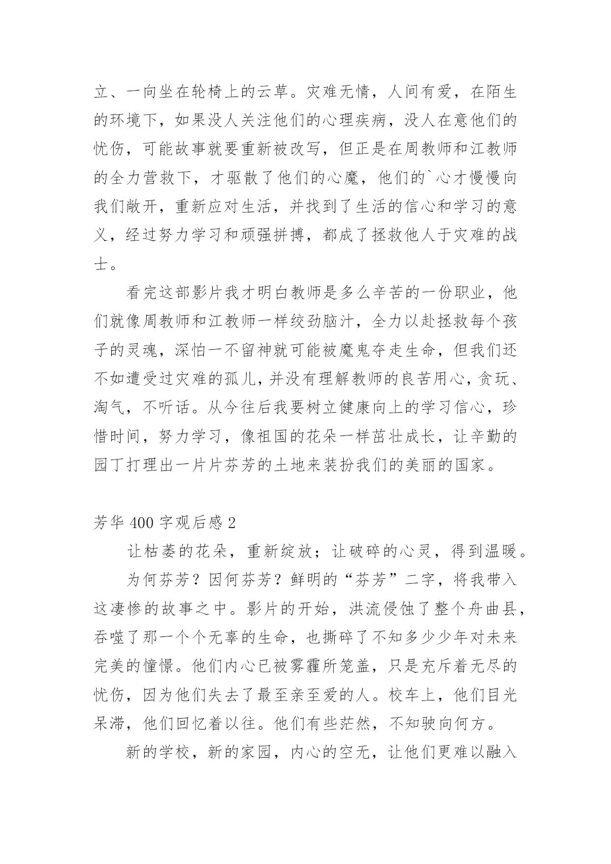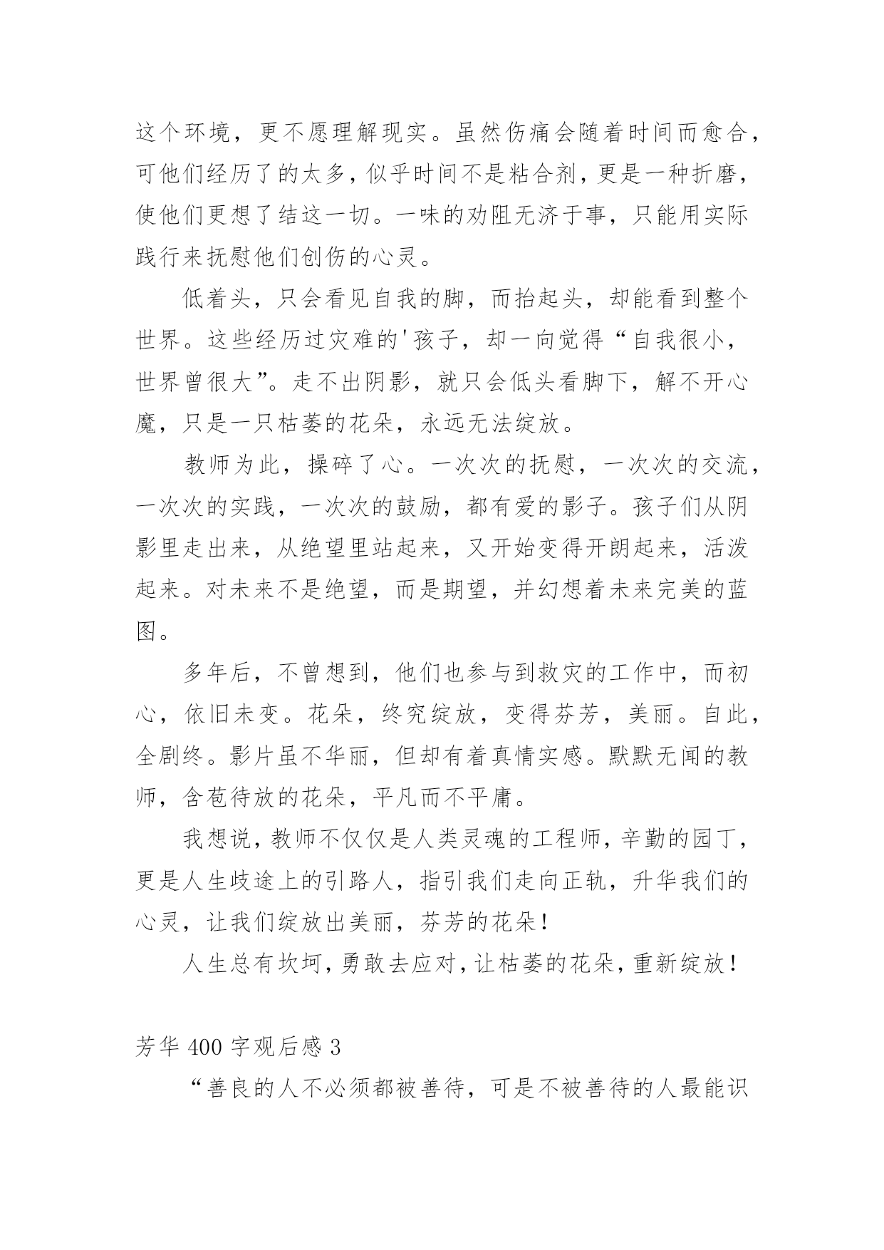 芳华400字观后感当观看完一部影视作品后,想必你有不少可以分享的东西,这时候最关键的观后感不能忘了。那么你会写观后感吗?下面是小编为大家收集的芳华400字观后感,供大家参考借鉴,希望可以帮助到有需要的朋友。芳华400字观后感1早就听说,今年有部大片讲述的是发生在我身边的故事,我带着无比自豪的心境和一位来自远方的朋友一齐观看了这部影片。出乎意料,我们没想到它真的如此精彩,如此感人,每个环节都扣人心弦,让我们泪流不止,就在影片结束的一霎那,我突然明白了:我们的学校为何如此芬芳?!舟曲是个美丽的地方,它就在咱甘肃,去年夏天我和爸爸妈妈还去过那里。清晨,沉浸在薄雾里的山村就像童话世界里的仙境一般迷人,但没想到这么美丽的地方曾遭受过泥石流。灾难吞没了一千多人的性命,也吞没了孩子们欢乐的家园,留下了遍地的创伤,但幸运的是,我们的国家又为他们重建了一个家园,那就是博飞中学,也就是我们兰州新区的舟曲中学,在那里他们遇到了可爱的江教师和周教师。影片主要讲述了四个被灾难笼罩着心灵,痛苦抑郁的大哥哥、大姐姐,如何在教师的拯救下重新开始生活、学习的故事。他们是:想要去见死去妹妹的多吉,认为害死了自我妈妈的井晓晓,不能正视没有爷爷这一现实的苗郎和不敢站立、一向坐在轮椅上的云草。灾难无情,人间有爱,在陌生的环境下,如果没人关注他们的心理疾病,没人在意他们的忧伤,可能故事就要重新被改写,但正是在周教师和江教师的全力营救下,才驱散了他们的心魔,他们的`心才慢慢向我们敞开,重新应对生活,并找到了生活的信心和学习的意义,经过努力学习和顽强拼搏,都成了拯救他人于灾难的战士。看完这部影片我才明白教师是多么辛苦的一份职业,他们就像周教师和江教师一样绞劲脑汁,全力以赴拯救每个孩子的灵魂,深怕一不留神就可能被魔鬼夺走生命,但我们还不如遭受过灾难的孤儿,并没有理解教师的良苦用心,贪玩、淘气,不听话。从今往后我要树立健康向上的学习信心,珍惜时间,努力学习,像祖国的花朵一样茁壮成长,让辛勤的园丁打理出一片片芬芳的土地来装扮我们的美丽的国家。芳华400字观后感2让枯萎的花朵,重新绽放;让破碎的心灵,得到温暖。为何芬芳?因何芬芳?鲜明的“芬芳”二字,将我带入这凄惨的故事之中。影片的开始,洪流侵蚀了整个舟曲县,吞噬了那一个个无辜的生命,也撕碎了不知多少少年对未来完美的憧憬。他们内心已被雾霾所笼盖,只是充斥着无尽的忧伤,因为他们失去了最至亲至爱的人。校车上,他们目光呆滞,他们回忆着以往。他们有些茫然,不知驶向何方。新的学校,新的家园,内心的空无,让他们更难以融入这个环境,更不愿理解现实。虽然伤痛会随着时间而愈合,可他们经历了的太多,似乎时间不是粘合剂,更是一种折磨,使他们更想了结这一切。一味的劝阻无济于事,只能用实际践行来抚慰他们创伤的心灵。低着头,只会看见自我的脚,而抬起头,却能看到整个世界。这些经历过灾难的'孩子,却一向觉得“自我很小,世界曾很大”。走不出阴影,就只会低头看脚下,解不开心魔,只是一只枯萎的花朵,永远无法绽放。教师为此,操碎了心。一次次的抚慰,一次次的交流,一次次的实践,一次次的鼓励,都有爱的影子。孩子们从阴影里走出来,从绝望里站起来,又开始变得开朗起来,活泼起来。对未来不是绝望,而是期望,并幻想着未来完美的蓝图。多年后,不曾想到,他们也参与到救灾的工作中,而初心,依旧未变。花朵,终究绽放,变得芬芳,美丽。自此,全剧终。影片虽不华丽,但却有着真情实感。默默无闻的教师,含苞待放的花朵,平凡而不平庸。我想说,教师不仅仅是人类灵魂的工程师,辛勤的园丁,更是人生歧途上的引路人,指引我们走向正轨,升华我们的心灵,让我们绽放出美丽,芬芳的花朵!人生总有坎坷,勇敢去应对,让枯萎的花朵,重新绽放!芳华400字观后感3“善良的人不必须都被善待,可是不被善待的人最能识别和珍惜善良。”这是《芳华》里最让我印象深刻的一句话,坚持善良很容易,可是一生善良却很难。《芳华》中刚刚来到歌舞团的何小萍以为自我脱离了不接纳自我的家庭,就是脱离了苦海,孰不知她又进入了另外一个苦海。整个歌舞团的人都拿她当笑话看待,大庭广众之下嫌弃她有异味,团体翻她的东西,还要撕她的衣服……可是自卑而又敏感的何小萍全都忍了,因为自卑,因为敏感,更因为没人了解和爱戴自我,可是除了刘峰。正因为如此她才最明白刘峰的善良,当刘峰被处理走掉时仅有她来相送。这又何尝不是我们的青春呢?以排挤嘲笑他人为乐,看到别人落荒而逃,满脸囧迫的样貌时一齐哈哈大笑,仿佛这就是我们的笑料。孰不知这样已经把一个人的自尊心践踏的一文不值,还要加上一万只脚。可是谁叫那时我们年轻呢?谁叫我们不懂的理解万岁呢?以前上学时有一个女同学的腿有点跛,走起路来稍微快一点就会一瘸一拐的,而那时候调皮的男孩子们总是故意拿她的东西逗她,然后她就会生气的.追,看着她一瘸一拐的