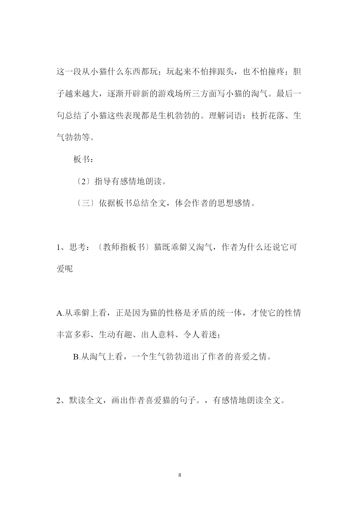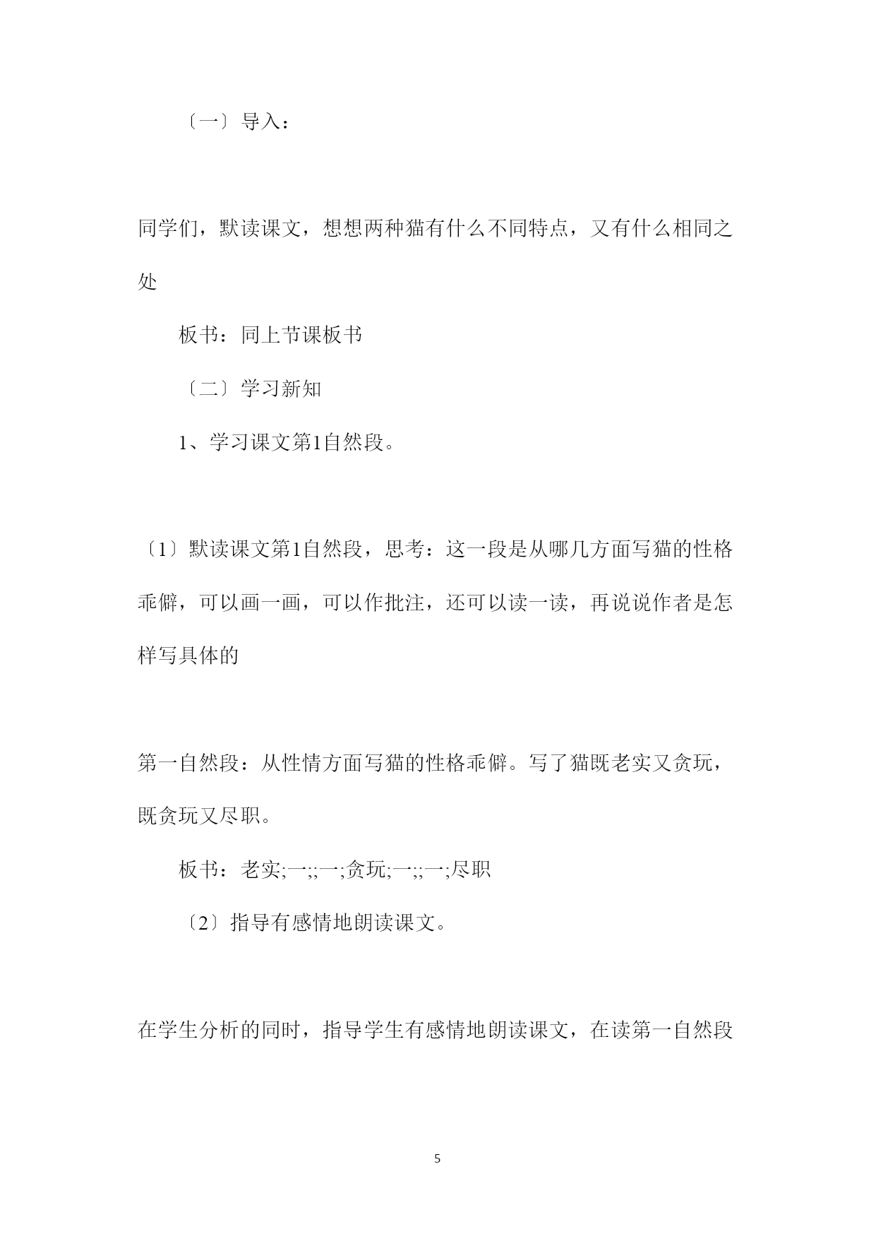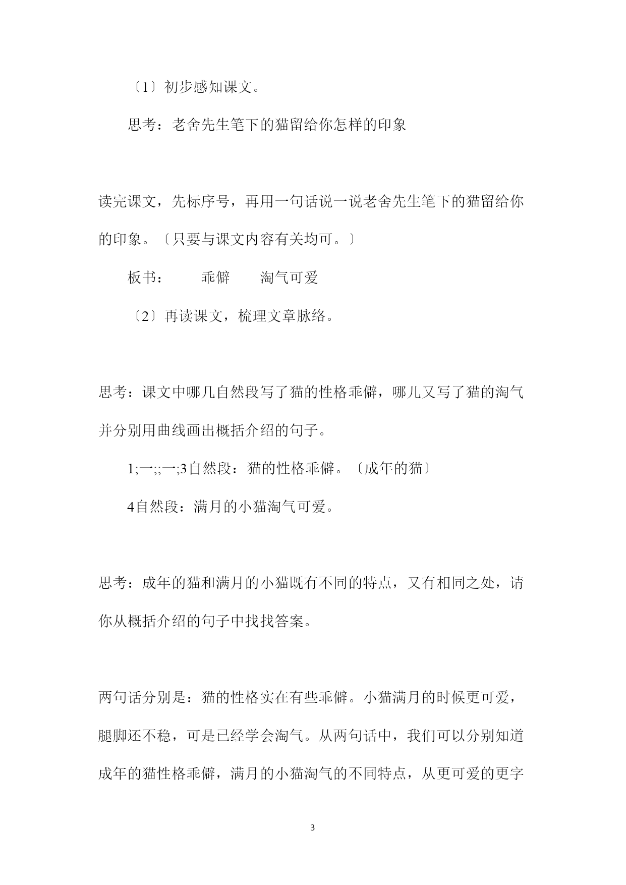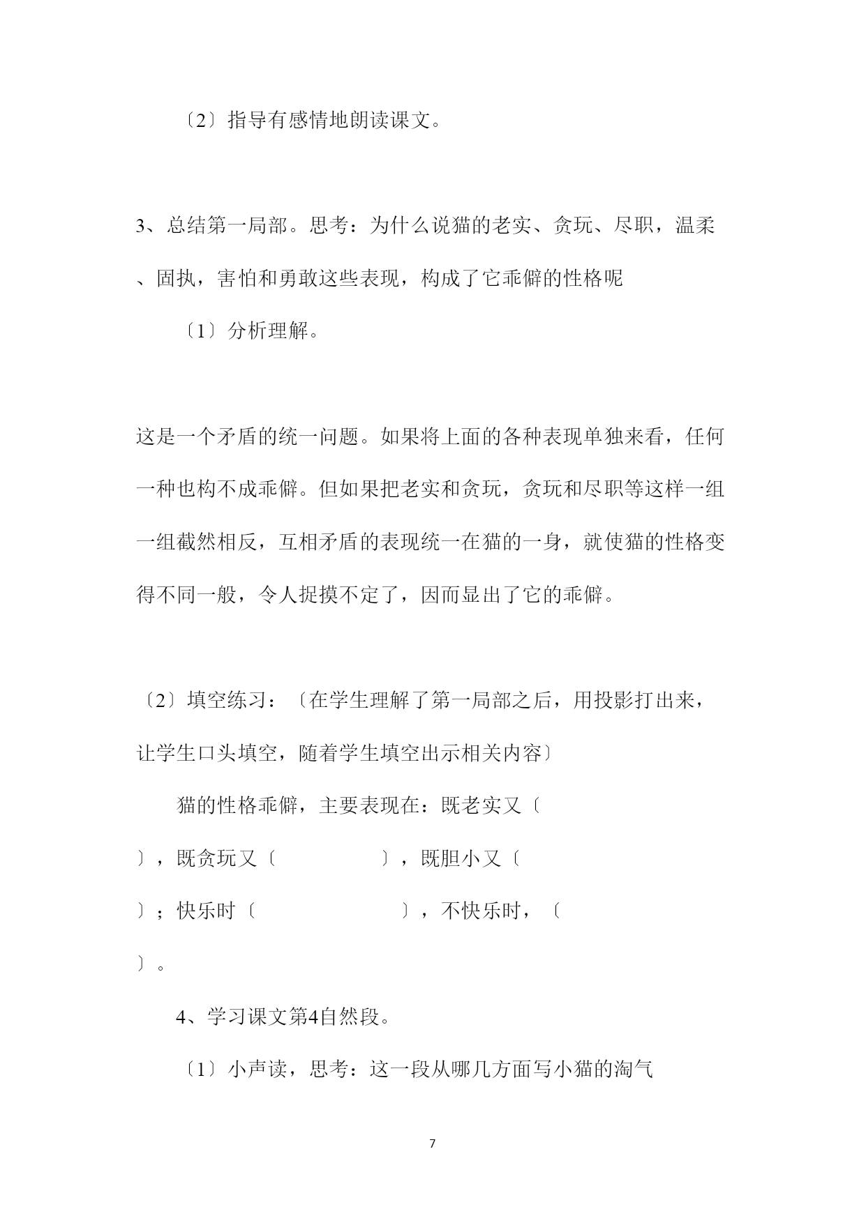 PAGEPAGE10?猫?教学设计资料教学目的:1、认识18个生字,学会其中13个;正确读写任凭、无忧无虑、闭息凝视、温柔可亲、丰富多腔、变化多端、枝折花落、生气勃勃等词语。2、初读课文,初步了解课文主要内容。教学重难点:掌握课文生字新词,初步了解课文主要内容。教学过程:〔一〕导入出示课题:猫〔齐读〕板书:猫导语:谁养过猫能用一句话说说你对猫的整体感觉吗〔学生发言〕同学们,老舍先生也很爱猫,今天我们一起学习的课文;一;;一;?猫?,就表达了他对猫的喜爱之情。〔二〕学习新知1、初读课文,学习生字词:要求:读准字音,认清字形〔一类生字要求会写〕,理解字义。〔1〕学生自己初读课文,自学生字。〔2〕课堂反应自学情况。①指名读生字:媒体演示13个生字。②正音:辟p@③辨析多音字:和运用媒体解决:A.出示和字,让学生读出它的字音,同时点击画面出示相应的拼音;B.让学生用和字的不同读音组词。④分析字形结构,记忆生字。⑤理解词语:〔可用查字典法、知字义解词义的方法〕任凭:不管,无论。无忧无虑:没有忧愁和担忧。闭息凝视:有意识地暂时抑制呼吸,聚精会神地看。生气勃勃:形容富有朝气,充满活力。2、默读课文,了解主要内容。〔1〕初步感知课文。思考:老舍先生笔下的猫留给你怎样的印象读完课文,先标序号,再用一句话说一说老舍先生笔下的猫留给你的印象。〔只要与课文内容有关均可。〕板书:乖僻淘气可爱〔2〕再读课文,梳理文章脉络。思考:课文中哪几自然段写了猫的性格乖僻,哪儿又写了猫的淘气并分别用曲线画出概括介绍的句子。1;一;;一;3自然段:猫的性格乖僻。〔成年的猫〕4自然段:满月的小猫淘气可爱。思考:成年的猫和满月的小猫既有不同的特点,又有相同之处,请你从概括介绍的句子中找找答案。两句话分别是:猫的性格实在有些乖僻。小猫满月的时候更可爱,腿脚还不稳,可是已经学会淘气。从两句话中,我们可以分别知道成年的猫性格乖僻,满月的小猫淘气的不同特点,从更可爱的更字,可以想到作者认为成年猫和满月的小猫的共同之处是它们都可爱。〔教师根据学生发言修改板书〕板书:可爱乖僻淘气小结:老舍先生用幽默亲切,通俗晓畅的语言,表现了猫的性情,字里行间流露着对猫的喜爱之情。下节课我们再深入学习。3、布置作业〔1〕抄写生字新词。〔2〕熟读课文。附:板书设计第二课时教学目的:1、读懂重点词、句、段,理解课文内容。2、有感情地朗读课文,背诵自己喜欢的段落。3、产生仔细观察事物的兴趣和热爱生活的思想感情。教学重难点:读懂重点词、句、段,理解课文内容,体会作者的思想感情。教学过程:〔一〕导入:同学们,默读课文,想想两种猫有什么不同特点,又有什么相同之处板书:同上节课板书〔二〕学习新知1、学习课文第1自然段。〔1〕默读课文第1自然段,思考:这一段是从哪几方面写猫的性格乖僻,可以画一画,可以作批注,还可以读一读,再说说作者是怎样写具体的第一自然段:从性情方面写猫的性格乖僻。写了猫既老实又贪玩,既贪玩又尽职。板书:老实;一;;一;贪玩;一;;一;尽职〔2〕指导有感情地朗读课文。在学生分析的同时,指导学生有感情地朗读课文,在读第一自然段时,要读出作者行文时的多重转折、回环婉转的语气。并结合课文理解无忧无虑、闭息凝视等词语。〔3〕总结学法:A.默读思考从哪方面写猫的性格乖僻;B.勾画、批注、朗读理解课文;C.说一说具体表现。2、学习第2、3自然段。〔1〕运用刚刚总结的学习方法,学习第2、3自然段。理解词语:温柔可亲、丰富多腔、变化多端等。〔先自学,再小组交流,最后汇报〕第二自然段:从脾气方面写猫的性格乖僻。主要写了猫快乐时温柔可亲,不快乐时一声也不出。板书:温柔;一;一固执〔根据课文内容总结出来的〕第三自然段:从猫的胆量方面写它的性格乖僻。主要写了猫什么时候都害怕,有时又非常勇敢。板书:害怕;一;;一;勇敢〔2〕指导有感情地朗读课文。3、总结第一局部。思考:为什么说猫的老实、贪玩、尽职,温柔、固执,害怕和勇敢这些表现,构成了它乖僻的性格呢〔1〕分析理解。这是一个矛盾的统一问题。如果将上面的各种表现单独来看,任何一种也构不成乖僻。但如果把老实和贪玩,贪玩和尽职等这样一组一组截然相反,互相矛盾的表现统一在猫的一身,就使猫的性格变得不同一般,令人捉摸不定了,因而显出了它的乖僻。〔2〕填空练习:〔在学生理解了第一局部之后,用投影打出来,让学生口头填空,随着学生填空出示相关内容〕猫的性格乖僻,主要表现在:既老实又〔〕,既贪玩又〔〕,既胆小又〔〕;快乐时〔〕,不快乐时,〔〕。4、学习课文第4自然段。〔1〕小声读,思考:这一段从哪几
