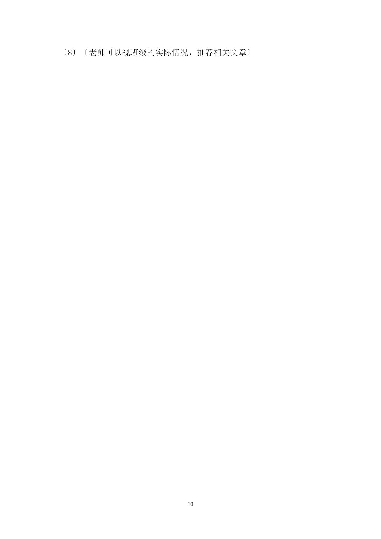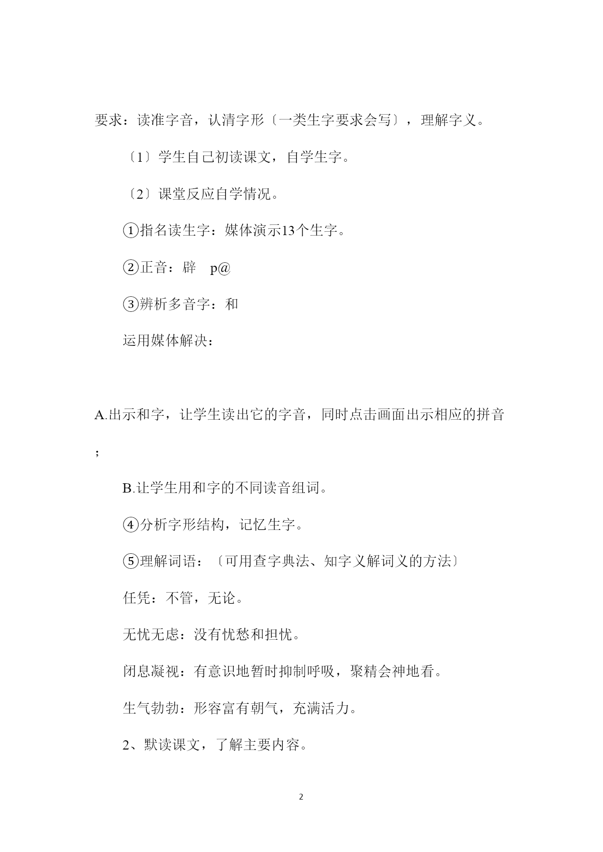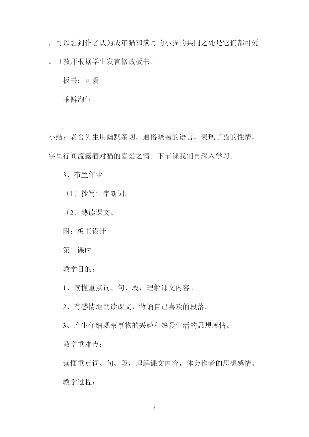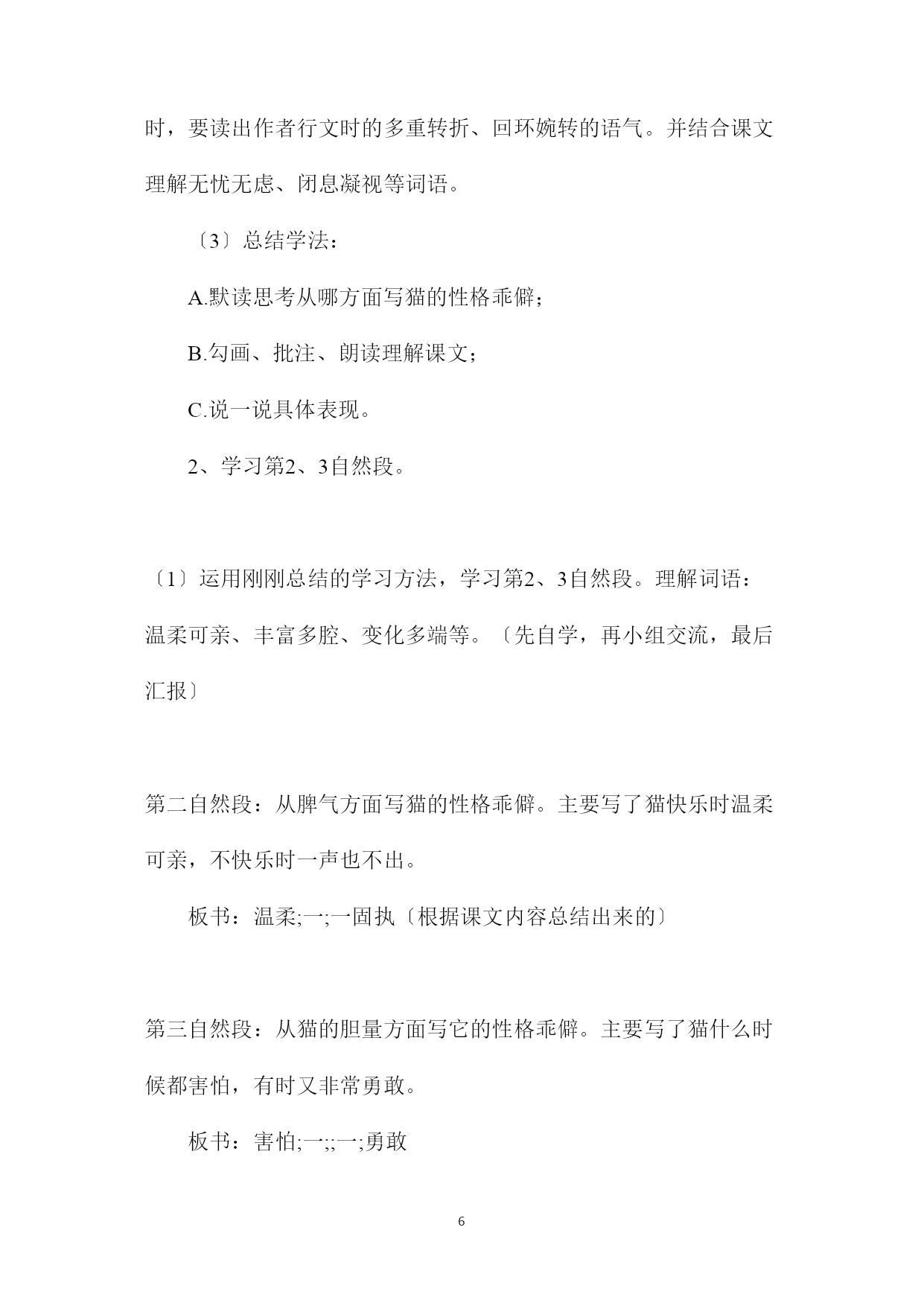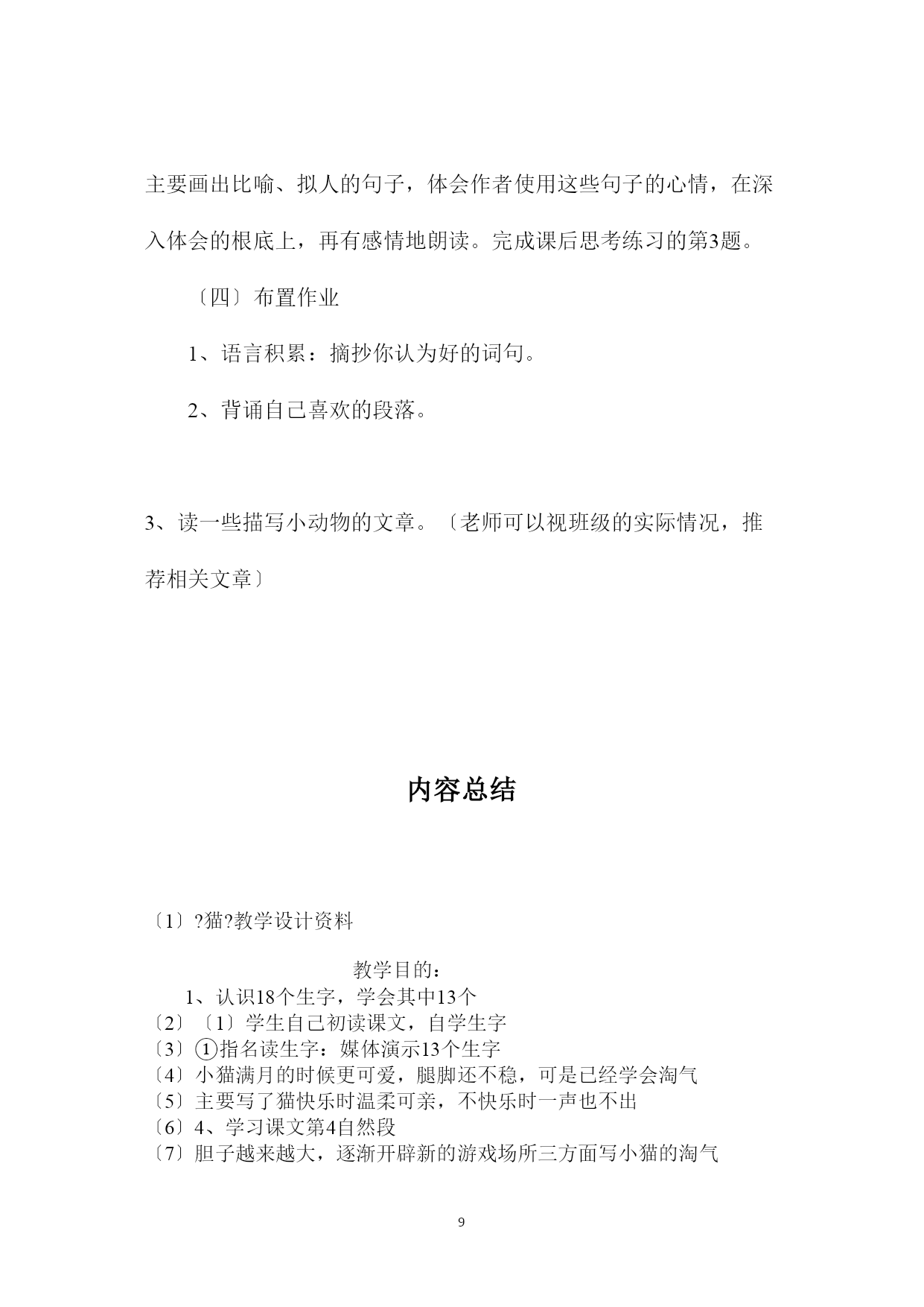 PAGEPAGE10?猫?教学设计资料教学目的:1、认识18个生字,学会其中13个;正确读写任凭、无忧无虑、闭息凝视、温柔可亲、丰富多腔、变化多端、枝折花落、生气勃勃等词语。2、初读课文,初步了解课文主要内容。教学重难点:掌握课文生字新词,初步了解课文主要内容。教学过程:〔一〕导入出示课题:猫〔齐读〕板书:猫导语:谁养过猫能用一句话说说你对猫的整体感觉吗〔学生发言〕同学们,老舍先生也很爱猫,今天我们一起学习的课文;一;;一;?猫?,就表达了他对猫的喜爱之情。〔二〕学习新知1、初读课文,学习生字词:要求:读准字音,认清字形〔一类生字要求会写〕,理解字义。〔1〕学生自己初读课文,自学生字。〔2〕课堂反应自学情况。①指名读生字:媒体演示13个生字。②正音:辟p@③辨析多音字:和运用媒体解决:A.出示和字,让学生读出它的字音,同时点击画面出示相应的拼音;B.让学生用和字的不同读音组词。④分析字形结构,记忆生字。⑤理解词语:〔可用查字典法、知字义解词义的方法〕任凭:不管,无论。无忧无虑:没有忧愁和担忧。闭息凝视:有意识地暂时抑制呼吸,聚精会神地看。生气勃勃:形容富有朝气,充满活力。2、默读课文,了解主要内容。〔1〕初步感知课文。思考:老舍先生笔下的猫留给你怎样的印象读完课文,先标序号,再用一句话说一说老舍先生笔下的猫留给你的印象。〔只要与课文内容有关均可。〕板书:乖僻淘气可爱〔2〕再读课文,梳理文章脉络。思考:课文中哪几自然段写了猫的性格乖僻,哪儿又写了猫的淘气并分别用曲线画出概括介绍的句子。1;一;;一;3自然段:猫的性格乖僻。〔成年的猫〕4自然段:满月的小猫淘气可爱。思考:成年的猫和满月的小猫既有不同的特点,又有相同之处,请你从概括介绍的句子中找找答案。两句话分别是:猫的性格实在有些乖僻。小猫满月的时候更可爱,腿脚还不稳,可是已经学会淘气。从两句话中,我们可以分别知道成年的猫性格乖僻,满月的小猫淘气的不同特点,从更可爱的更字,可以想到作者认为成年猫和满月的小猫的共同之处是它们都可爱。〔教师根据学生发言修改板书〕板书:可爱乖僻淘气小结:老舍先生用幽默亲切,通俗晓畅的语言,表现了猫的性情,字里行间流露着对猫的喜爱之情。下节课我们再深入学习。3、布置作业〔1〕抄写生字新词。〔2〕熟读课文。附:板书设计第二课时教学目的:1、读懂重点词、句、段,理解课文内容。2、有感情地朗读课文,背诵自己喜欢的段落。3、产生仔细观察事物的兴趣和热爱生活的思想感情。教学重难点:读懂重点词、句、段,理解课文内容,体会作者的思想感情。教学过程:〔一〕导入:同学们,默读课文,想想两种猫有什么不同特点,又有什么相同之处板书:同上节课板书〔二〕学习新知1、学习课文第1自然段。〔1〕默读课文第1自然段,思考:这一段是从哪几方面写猫的性格乖僻,可以画一画,可以作批注,还可以读一读,再说说作者是怎样写具体的第一自然段:从性情方面写猫的性格乖僻。写了猫既老实又贪玩,既贪玩又尽职。板书:老实;一;;一;贪玩;一;;一;尽职〔2〕指导有感情地朗读课文。在学生分析的同时,指导学生有感情地朗读课文,在读第一自然段时,要读出作者行文时的多重转折、回环婉转的语气。并结合课文理解无忧无虑、闭息凝视等词语。〔3〕总结学法:A.默读思考从哪方面写猫的性格乖僻;B.勾画、批注、朗读理解课文;C.说一说具体表现。2、学习第2、3自然段。〔1〕运用刚刚总结的学习方法,学习第2、3自然段。理解词语:温柔可亲、丰富多腔、变化多端等。〔先自学,再小组交流,最后汇报〕第二自然段:从脾气方面写猫的性格乖僻。主要写了猫快乐时温柔可亲,不快乐时一声也不出。板书:温柔;一;一固执〔根据课文内容总结出来的〕第三自然段:从猫的胆量方面写它的性格乖僻。主要写了猫什么时候都害怕,有时又非常勇敢。板书:害怕;一;;一;勇敢〔2〕指导有感情地朗读课文。3、总结第一局部。思考:为什么说猫的老实、贪玩、尽职,温柔、固执,害怕和勇敢这些表现,构成了它乖僻的性格呢〔1〕分析理解。这是一个矛盾的统一问题。如果将上面的各种表现单独来看,任何一种也构不成乖僻。但如果把老实和贪玩,贪玩和尽职等这样一组一组截然相反,互相矛盾的表现统一在猫的一身,就使猫的性格变得不同一般,令人捉摸不定了,因而显出了它的乖僻。〔2〕填空练习:〔在学生理解了第一局部之后,用投影打出来,让学生口头填空,随着学生填空出示相关内容〕猫的性格乖僻,主要表现在:既老实又〔〕,既贪玩又〔〕,既胆小又〔〕;快乐时〔〕,不快乐时,〔〕。4、学习课文第4自然段。〔1〕小声读,思考:这一段从哪几