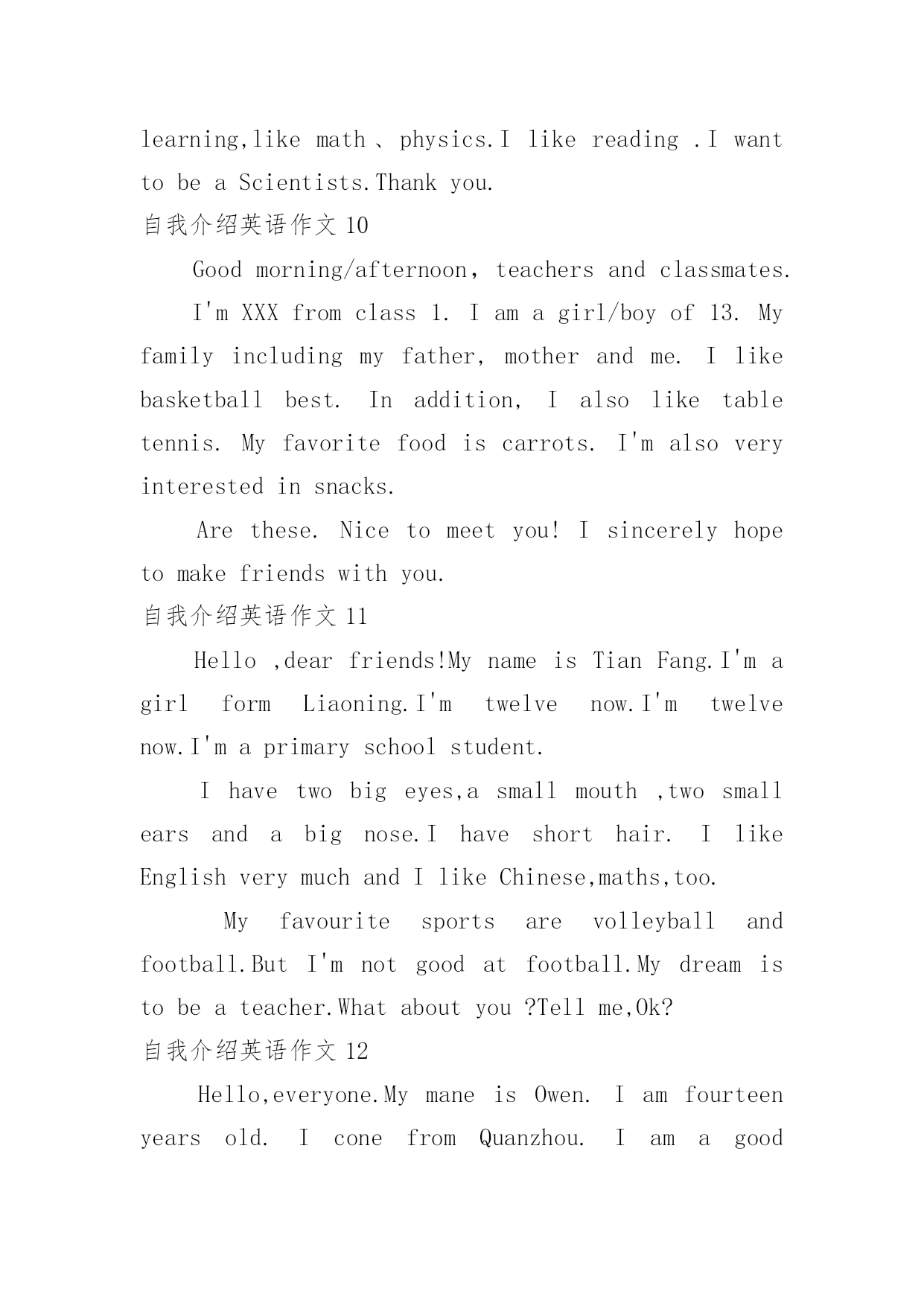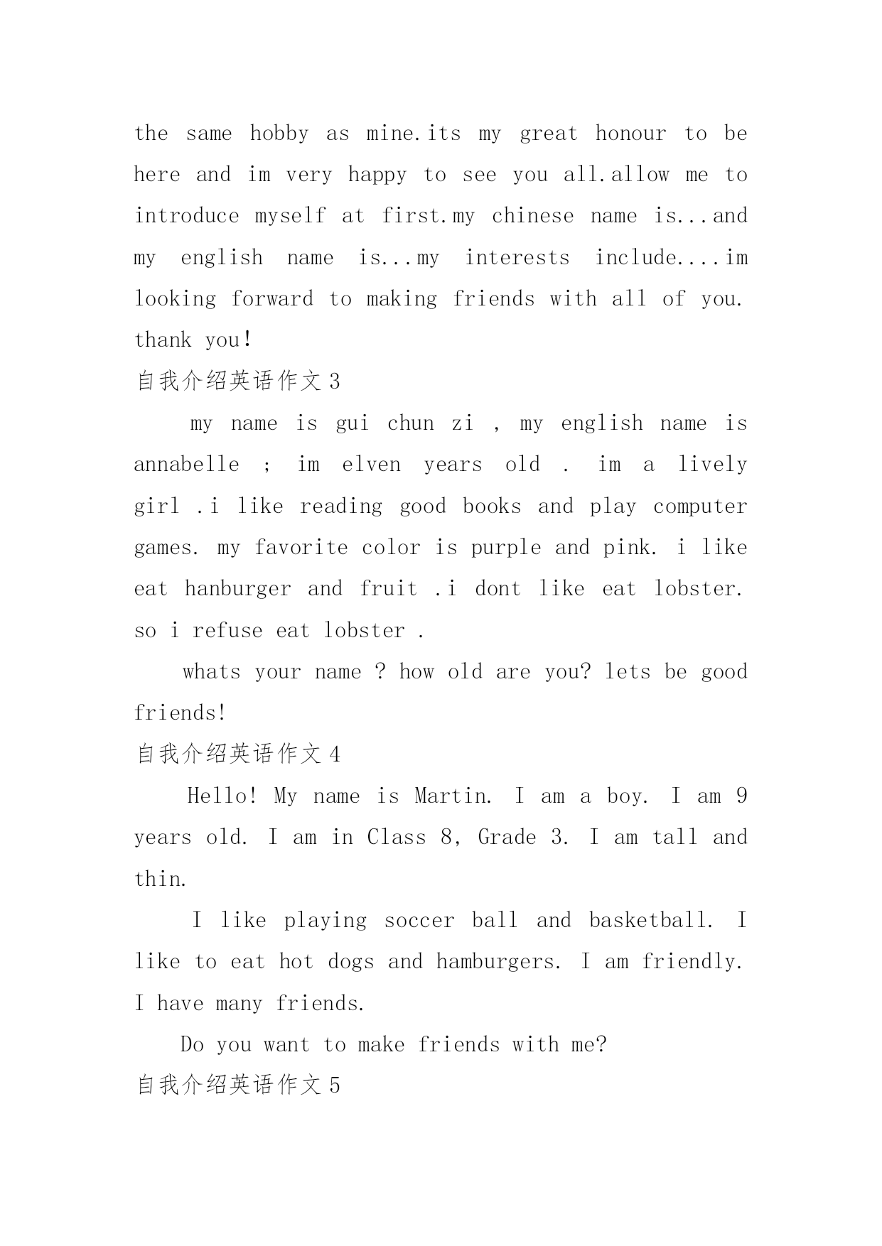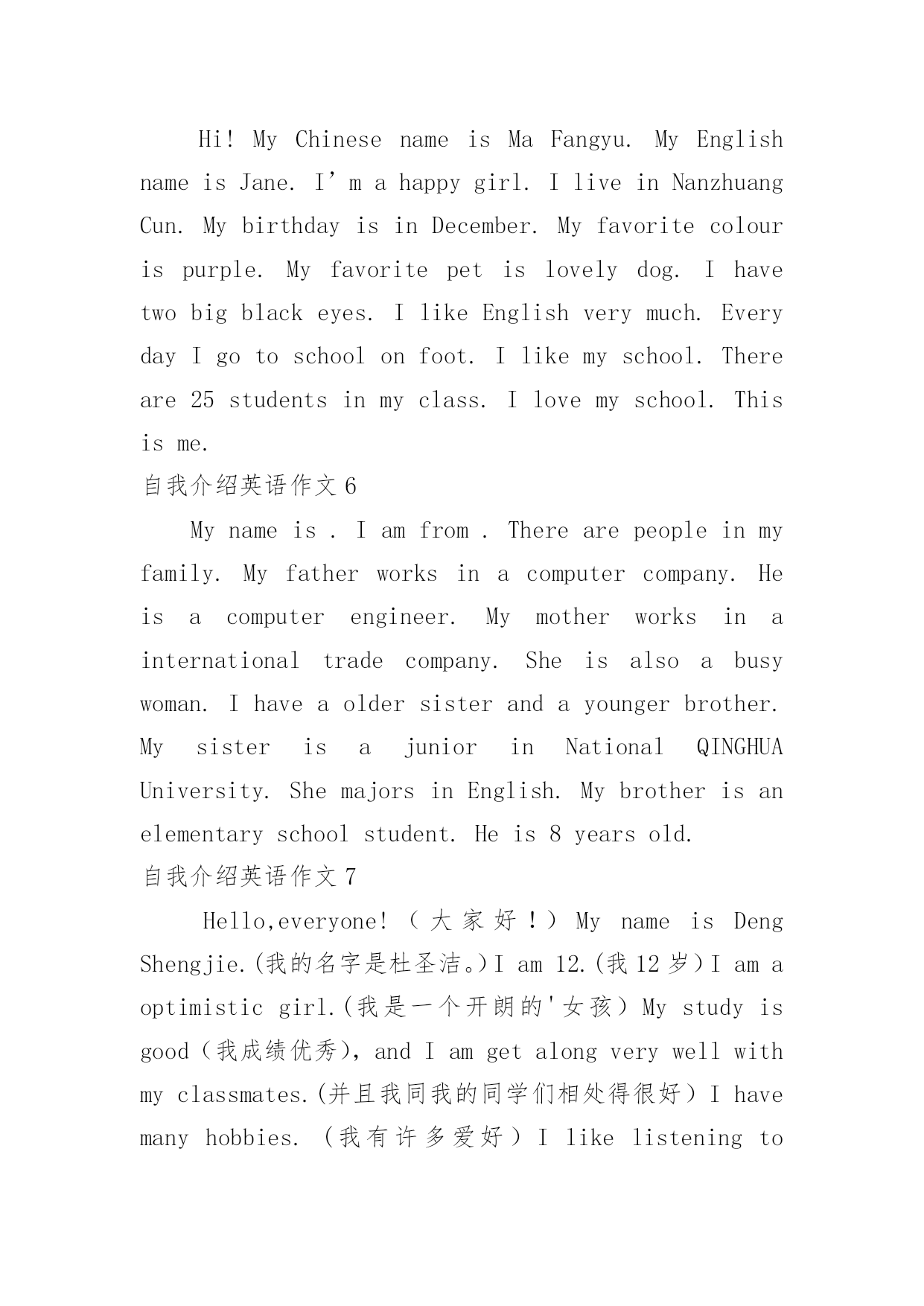 自我介绍英语作文自我介绍英语作文当去到一个新环境下,时常需要用到自我介绍,自我介绍是让陌生人彼此认识的好方法。现在你是否对自我介绍一筹莫展呢?以下是小编帮大家整理的自我介绍英语作文,欢迎大家分享。自我介绍英语作文1Hello!MynameisPengYanzhi,myfirstnameisYanzhi,mylastnameisPeng.I'mtwelveyearsold,I'minClass8,Grade7,TongshenghuExprementalSchoolnow.IlikeEnglishverymuch.Ihaveagoodfriend,sheismynewfriend,herfirstnameisXingYu,herlastnameisZhang,sheisverypureandfunny.Ialsolikemakingfriends.Doyouwanttobemyfriend?自我介绍英语作文2hi,evryone.mynameisxxandimfromyy.imgladthatiwillspendmynextfouryearshere,andihopethaticanbefriendswithallofyou.myhobbyisxxandihopeicanfindsomeonewhohasthesamehobbyasmine.itsmygreathonourtobehereandimveryhappytoseeyouall.allowmetointroducemyselfatfirst.mychinesenameis...andmyenglishnameis...myinterestsinclude....imlookingforwardtomakingfriendswithallofyou.thankyou!自我介绍英语作文3mynameisguichunzi,myenglishnameisannabelle;imelvenyearsold.imalivelygirl.ilikereadinggoodbooksandplaycomputergames.myfavoritecolorispurpleandpink.ilikeeathanburgerandfruit.idontlikeeatlobster.soirefuseeatlobster.whatsyourname?howoldareyou?letsbegoodfriends!自我介绍英语作文4Hello!MynameisMartin.Iamaboy.Iam9yearsold.IaminClass8,Grade3.Iamtallandthin.Ilikeplayingsoccerballandbasketball.Iliketoeathotdogsandhamburgers.Iamfriendly.Ihavemanyfriends.Doyouwanttomakefriendswithme?自我介绍英语作文5Hi!MyChinesenameisMaFangyu.MyEnglishnameisJane.I’mahappygirl.IliveinNanzhuangCun.MybirthdayisinDecember.Myfavoritecolourispurple.Myfavoritepetislovelydog.Ihavetwobigblackeyes.IlikeEnglishverymuch.EverydayIgotoschoolonfoot.Ilikemyschool.Thereare25studentsinmyclass.Ilovemyschool.Thisisme.自我介绍英语作文6Mynameis.Iamfrom.Therearepeopleinmyfamily.Myfatherworksinacomputercompany.Heisacomputerengineer.Mymotherworksinainternationaltradecompany.Sheisalsoabusywoman.Ihaveaoldersisterandayoungerbrother.MysisterisajuniorinNationalQINGHUAUniversity.ShemajorsinEnglish.Mybrotherisanelementaryschoolstudent.Heis8yearsold.自我介绍英语作文7Hello,everyone!(大家好!)MynameisDengShengjie.(我的名字是杜圣洁。)Iam12.(我12岁)Iamaoptimisticgirl.(我是一个开朗的'女孩)Mystudyisgood(我成绩优秀),andIamg