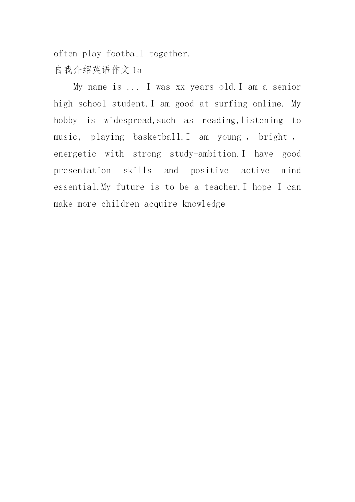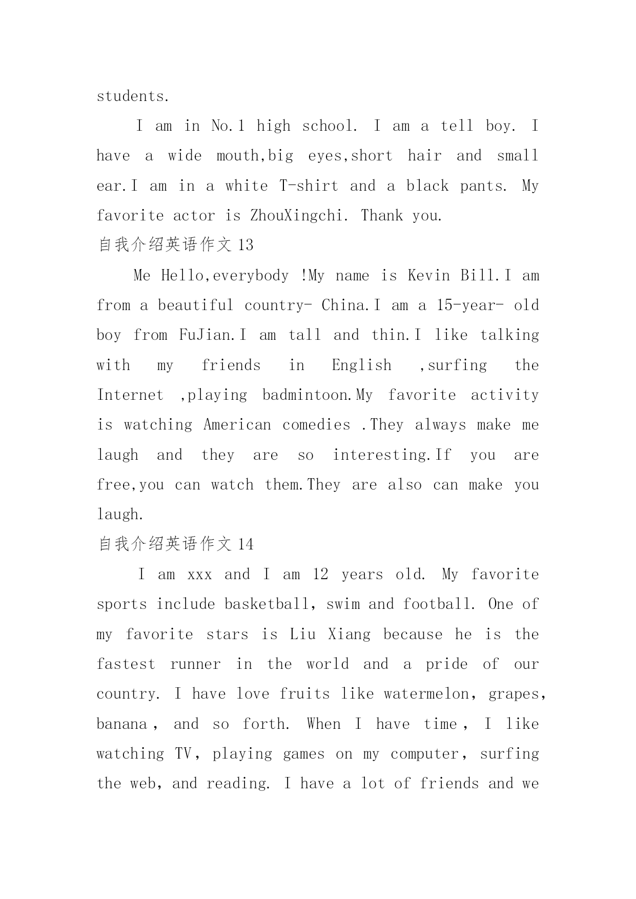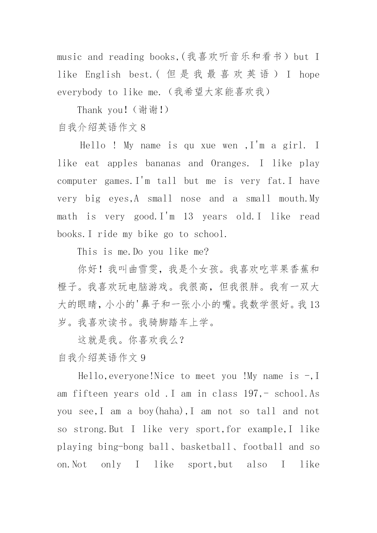 自我介绍英语作文自我介绍英语作文当去到一个新环境下,时常需要用到自我介绍,自我介绍是让陌生人彼此认识的好方法。现在你是否对自我介绍一筹莫展呢?以下是小编帮大家整理的自我介绍英语作文,欢迎大家分享。自我介绍英语作文1Hello!MynameisPengYanzhi,myfirstnameisYanzhi,mylastnameisPeng.I'mtwelveyearsold,I'minClass8,Grade7,TongshenghuExprementalSchoolnow.IlikeEnglishverymuch.Ihaveagoodfriend,sheismynewfriend,herfirstnameisXingYu,herlastnameisZhang,sheisverypureandfunny.Ialsolikemakingfriends.Doyouwanttobemyfriend?自我介绍英语作文2hi,evryone.mynameisxxandimfromyy.imgladthatiwillspendmynextfouryearshere,andihopethaticanbefriendswithallofyou.myhobbyisxxandihopeicanfindsomeonewhohasthesamehobbyasmine.itsmygreathonourtobehereandimveryhappytoseeyouall.allowmetointroducemyselfatfirst.mychinesenameis...andmyenglishnameis...myinterestsinclude....imlookingforwardtomakingfriendswithallofyou.thankyou!自我介绍英语作文3mynameisguichunzi,myenglishnameisannabelle;imelvenyearsold.imalivelygirl.ilikereadinggoodbooksandplaycomputergames.myfavoritecolorispurpleandpink.ilikeeathanburgerandfruit.idontlikeeatlobster.soirefuseeatlobster.whatsyourname?howoldareyou?letsbegoodfriends!自我介绍英语作文4Hello!MynameisMartin.Iamaboy.Iam9yearsold.IaminClass8,Grade3.Iamtallandthin.Ilikeplayingsoccerballandbasketball.Iliketoeathotdogsandhamburgers.Iamfriendly.Ihavemanyfriends.Doyouwanttomakefriendswithme?自我介绍英语作文5Hi!MyChinesenameisMaFangyu.MyEnglishnameisJane.I’mahappygirl.IliveinNanzhuangCun.MybirthdayisinDecember.Myfavoritecolourispurple.Myfavoritepetislovelydog.Ihavetwobigblackeyes.IlikeEnglishverymuch.EverydayIgotoschoolonfoot.Ilikemyschool.Thereare25studentsinmyclass.Ilovemyschool.Thisisme.自我介绍英语作文6Mynameis.Iamfrom.Therearepeopleinmyfamily.Myfatherworksinacomputercompany.Heisacomputerengineer.Mymotherworksinainternationaltradecompany.Sheisalsoabusywoman.Ihaveaoldersisterandayoungerbrother.MysisterisajuniorinNationalQINGHUAUniversity.ShemajorsinEnglish.Mybrotherisanelementaryschoolstudent.Heis8yearsold.自我介绍英语作文7Hello,everyone!(大家好!)MynameisDengShengjie.(我的名字是杜圣洁。)Iam12.(我12岁)Iamaoptimisticgirl.(我是一个开朗的'女孩)Mystudyisgood(我成绩优秀),andIamg