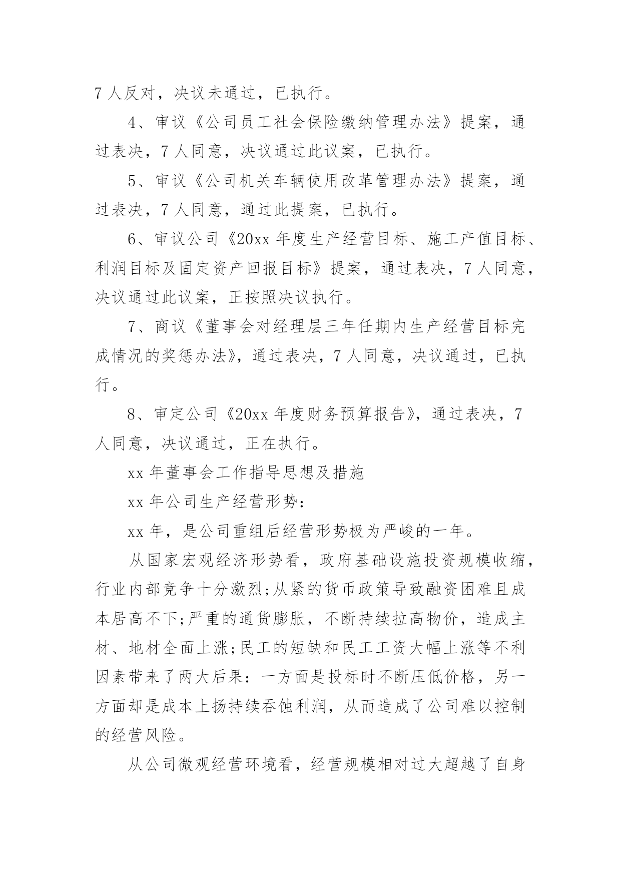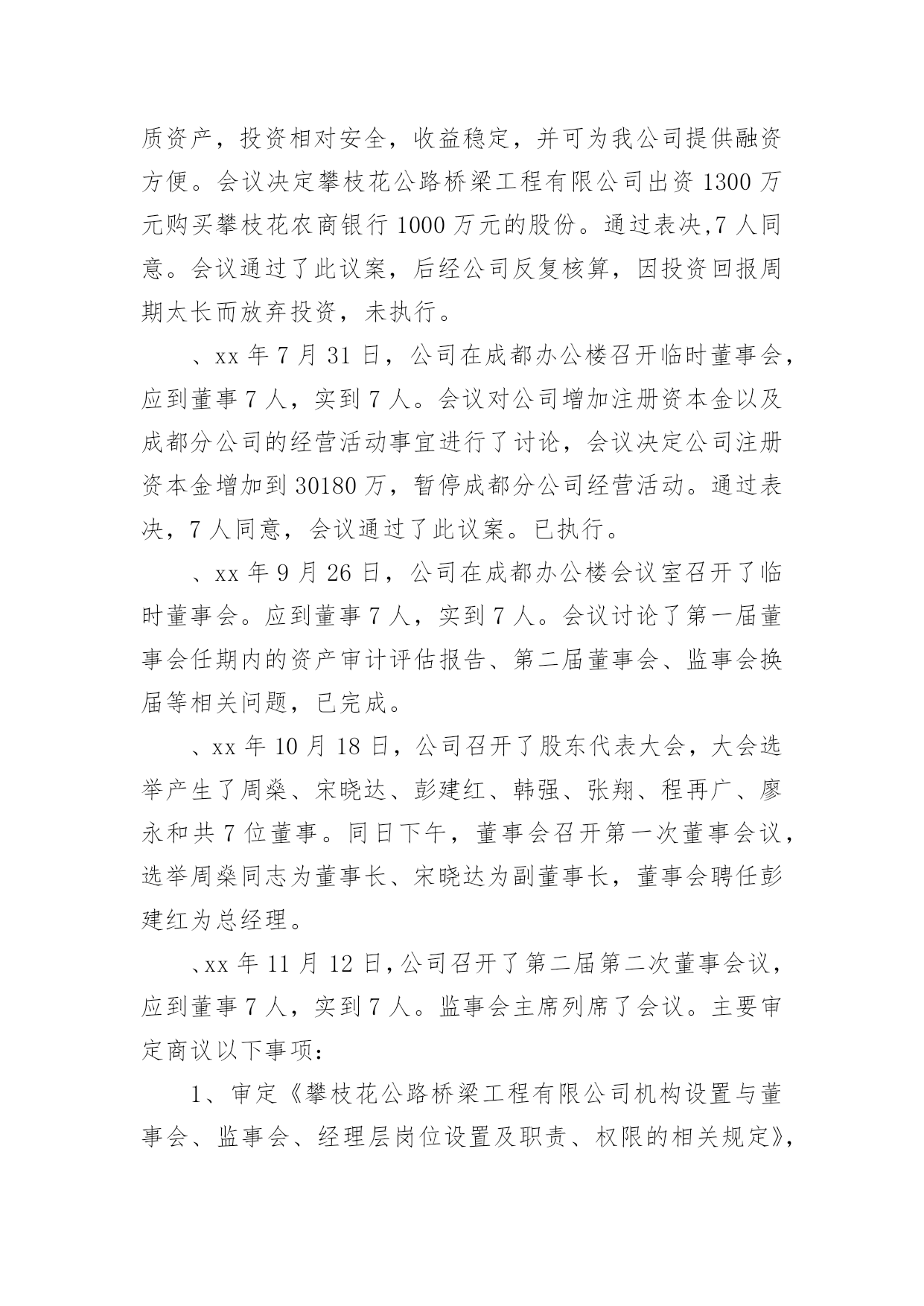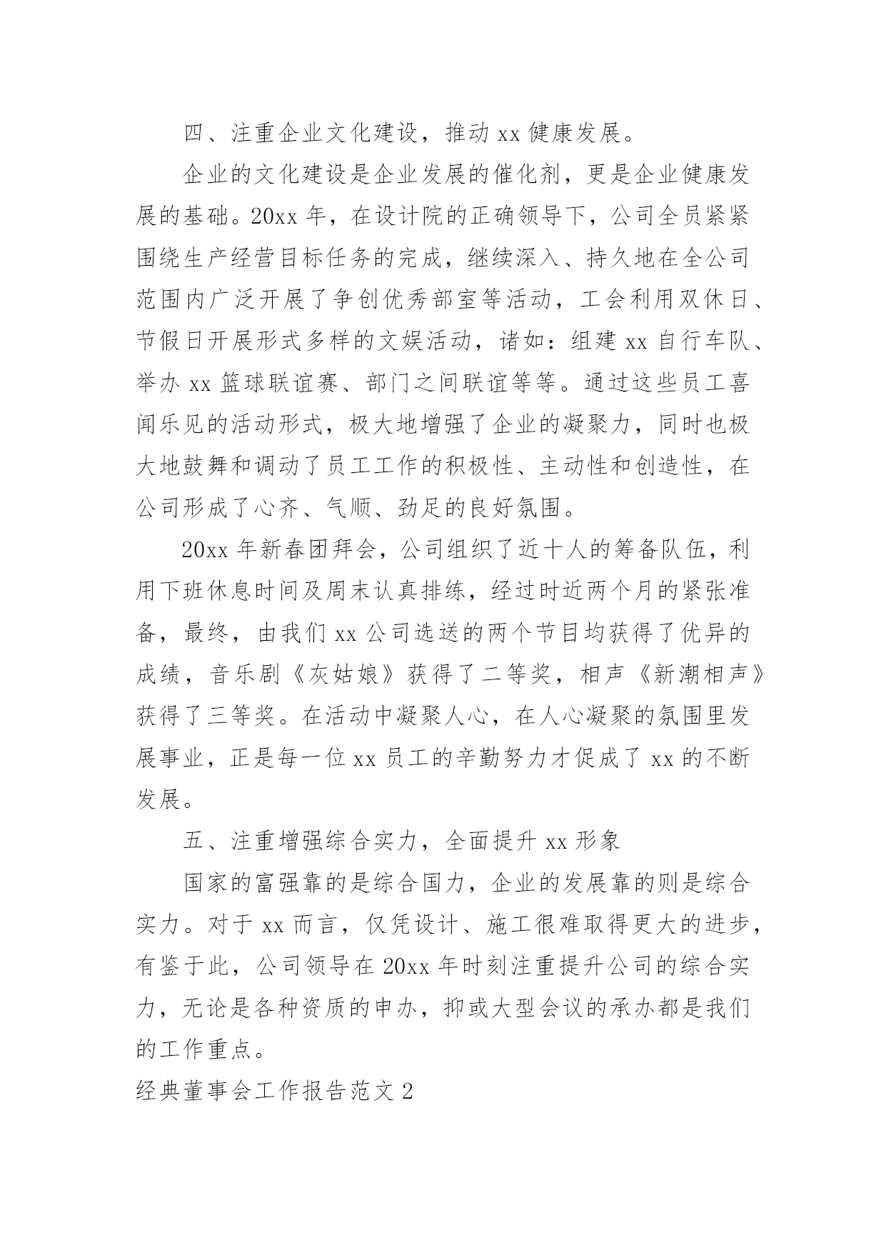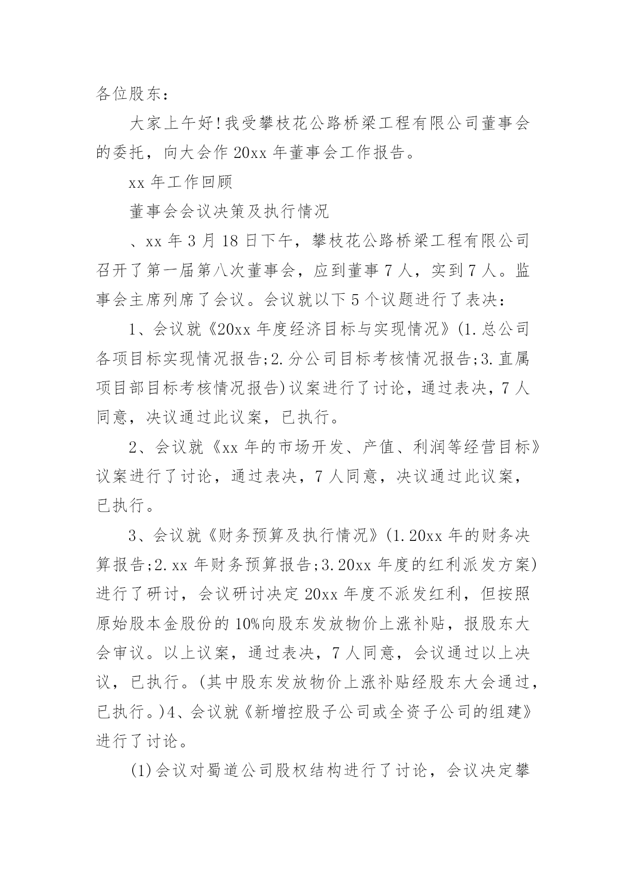 经典董事会工作报告经典董事会工作报告范文在经济飞速发展的今天,报告使用的频率越来越高,报告成为了一种新兴产业。写起报告来就毫无头绪?下面是小编收集整理的经典董事会工作报告范文,欢迎大家分享。经典董事会工作报告范文1各位股东代表,大家好!今天,兰州xx交通科技有限公司在这里召开股东代表大会,借此机会,我首先向在过去一年里为xx公司的发展和壮大做出巨大贡献的各位股东和股东代表表示衷心的感谢!下面,我受董事会的委托,并代表董事会,向诸位作20xx年度工作报告,请予以审议!20xx年对于xx而言是机遇与挑战并存的一年,更是公司收获的一年。本年度,公司在设计院的正确领导和支持下,紧紧围绕发展经济这一目标,抓机遇、求发展,全体员工齐心协力,顽强进取,各方面的工作都取得了一定的成绩。在过去的一年里,公司全员团结拼搏、务实创新,始终坚持“创新从心开始”的经营理念,同心同德、真抓实干,切实完成了设计院下达的生产指标。下面对公司本年度的各项工作予以汇报。一、狠抓生产,经营业绩不断提高20xx年,公司继续围绕“争创勘察设计精品”的经营目标,坚持“创造从心开始”的经营理念,继续深入贯彻落实科学发展观,把发展经济作为公司发展的第一要务。一年来,公司在工程设计与施工、多媒体制作与演示、网络监控及软件开发等方面均取得了一定的成绩,主要项目有:天水过境段两阶段施工图设计、三抚线三屯营至唐秦界段改建工程(第一合同段)两阶段施工图设计、曲麻莱至不冻泉三级公路安全设施设计、甘肃省水运局信息化系统工可报告及设计、s207线靖远至会宁县际扶贫公路一阶段施工图设计、全省高速公路计重收费改造施工图设计、内蒙古省道313线兰家梁至嘎鲁图机电设计、中川、天水路、瓜州收费站情报板施工等,公司全年共完成生产任务多项,其中通过设计院承揽的生产任务近20项,独立承揽生产任务15项。(详细情况见附表)二、完善制度,管理水平不断提高制度建设是企业发展的重要保证。公司发展至今,一是靠正确的领导和政策,二是靠广大员工的支持和严格的管理。20xx年,公司结合经营管理实际,对管理制度进行了第四次修订,并制订《兰州xx交通科技有限公司管理制度汇编》,内容涉及人事、财务、薪金、奖惩、采购、报销、质量追究、内部控制等21项,基本达到了按制度和规定办事的管理理念,公司管理逐步进入了科学管理的轨道,管理水平不断提高,同时也有效促进了劳动生产率和工作效率的提高。由于公司20xx年的工作重心会偏向于机电施工,因此,我们会在设备采购管理、施工控制、招投标管理及资产、资质、资金(“三资”)管理上狠下功夫,不断完善相关制度,由以往的“人治”逐渐步入依制度办事、依法律办事的轨道,使公司能更好更快地发展。三、注重培训,员工综合素质不断提高一直以来,公司始终给予员工培训工作极大的重视。采取公司外派深造、个人主动学习、聘请专家授课等多种形式进行培训,同时保证每月至少两次的学习时间;在学习内容上,不仅注重在思想政治方面的学习,同时对于专业知识方面的学习也相当重视。内容主要包括:现代企业管理知识、专业基础知识、各门类的技术培训等,对于成绩突出者给予一定的奖励,并由公司报销相应费用。通过学习培训,有效地提高了广大员工学习的积极性,使员工的整体素质得到了全面的.提升。20xx年,公司先后组织培训员工10余人次。其中,12月23日媒体部赴北京进行为期六天的公路虚拟现实软件培训影响深远,为康临路制作虚拟现实作了充分的准备,更为重要的是为公司以后公路交通虚拟现实打下了坚实的基础。此外,公司还组织设计施工人员10余人进行了甘肃省建筑行业安全培训、罗杰康交换机技术培训等。目前公司开展的“创新标兵、技术能手和科研小组活动”已接近尾声,对于在活动中涌现出的先进个人和部门,公司也给予了一定的物质奖励,这项活动我们将长期坚持下去,这样做的目的既鼓励了先进,鞭策了后进,员工的集体荣誉感得到了加强,同时,xx的形象也得到了弘扬,各项工作都得到了促进。四、注重企业文化建设,推动xx健康发展。企业的文化建设是企业发展的催化剂,更是企业健康发展的基础。20xx年,在设计院的正确领导下,公司全员紧紧围绕生产经营目标任务的完成,继续深入、持久地在全公司范围内广泛开展了争创优秀部室等活动,工会利用双休日、节假日开展形式多样的文娱活动,诸如:组建xx自行车队、举办xx篮球联谊赛、部门之间联谊等等。通过这些员工喜闻乐见的活动形式,极大地增强了企业的凝聚力,同时也极大地鼓舞和调动了员工工作的积极性、主动性和创造性,在公司形成了心齐、气顺、劲足的良好氛围。20xx年新春团拜会,公司组织了近十人的筹备队伍,利用下班休息时间及周末认真排练,经过时近两个月的紧张准备,最终,由我们xx公司选送的两个节目均获得了优异的成绩,音乐剧《灰姑娘》获得了二等奖,相声《新潮相声》获得了三