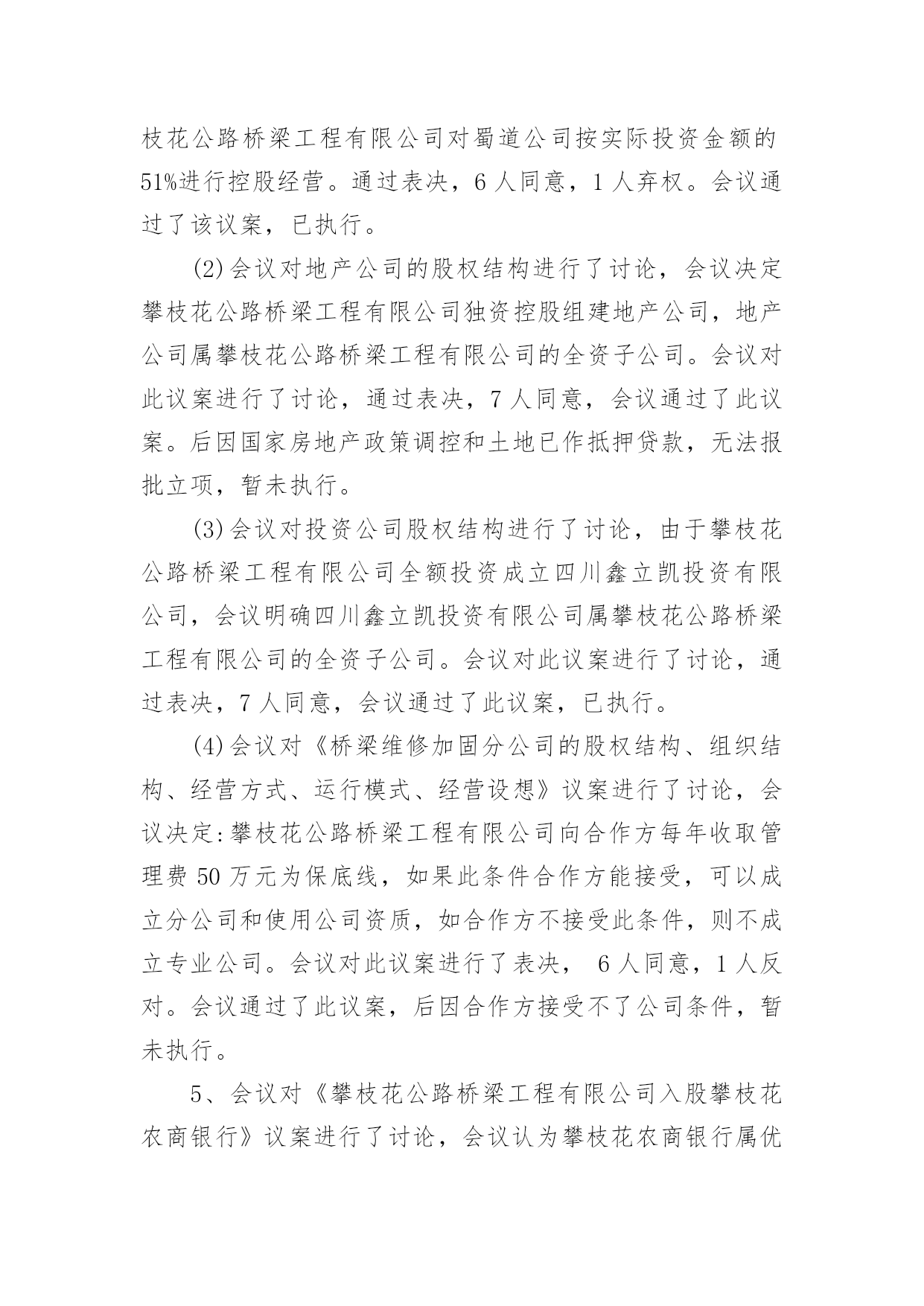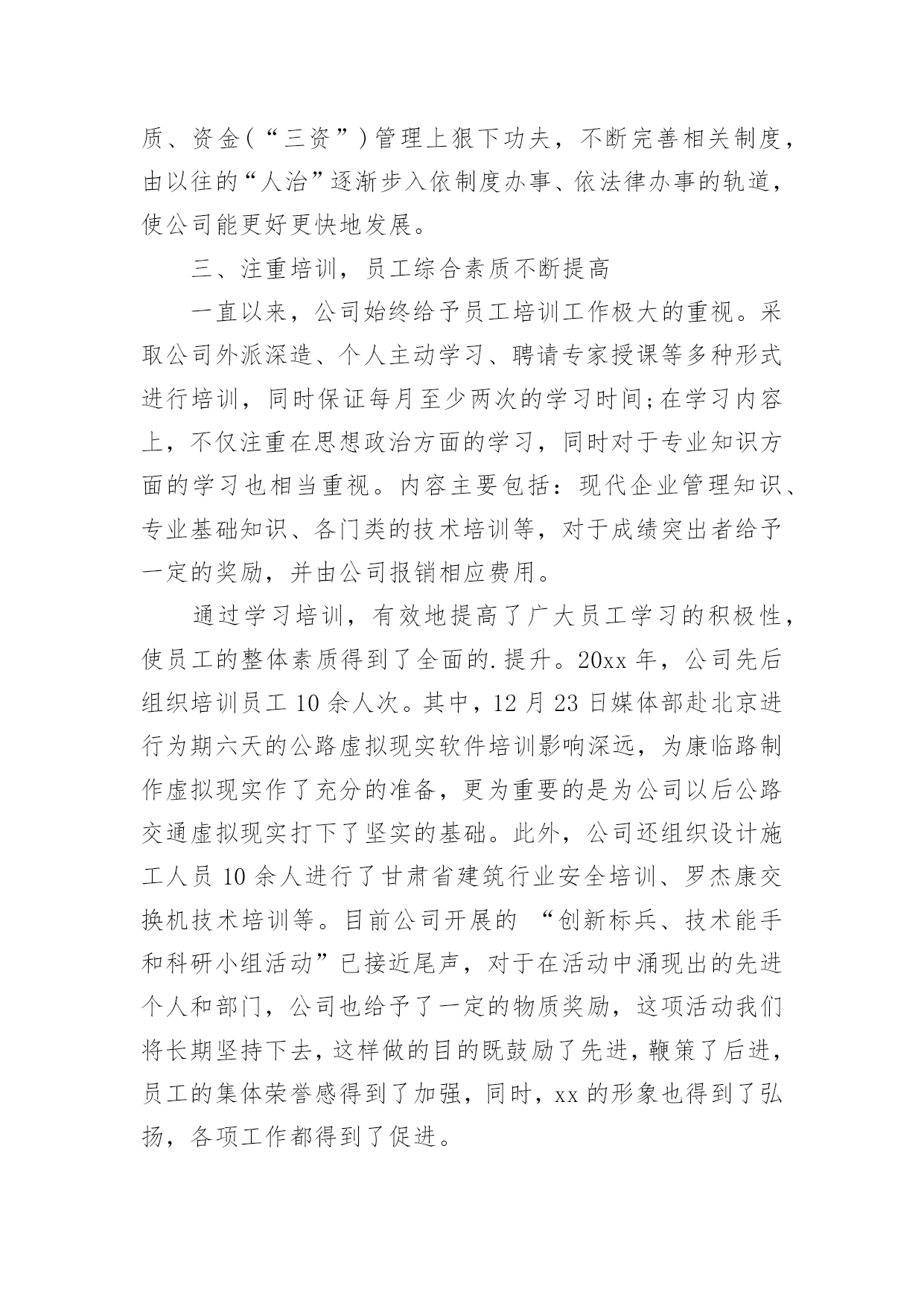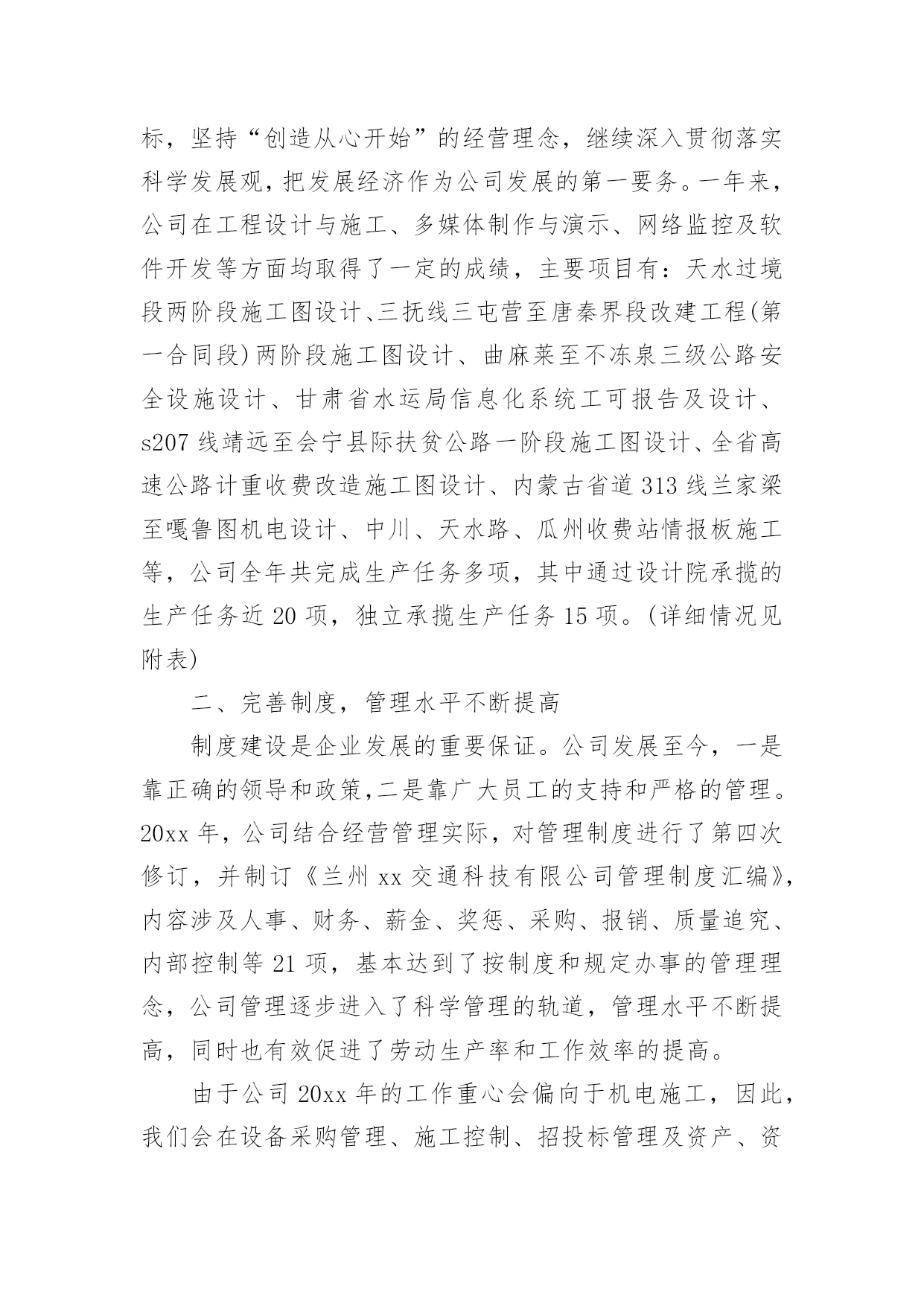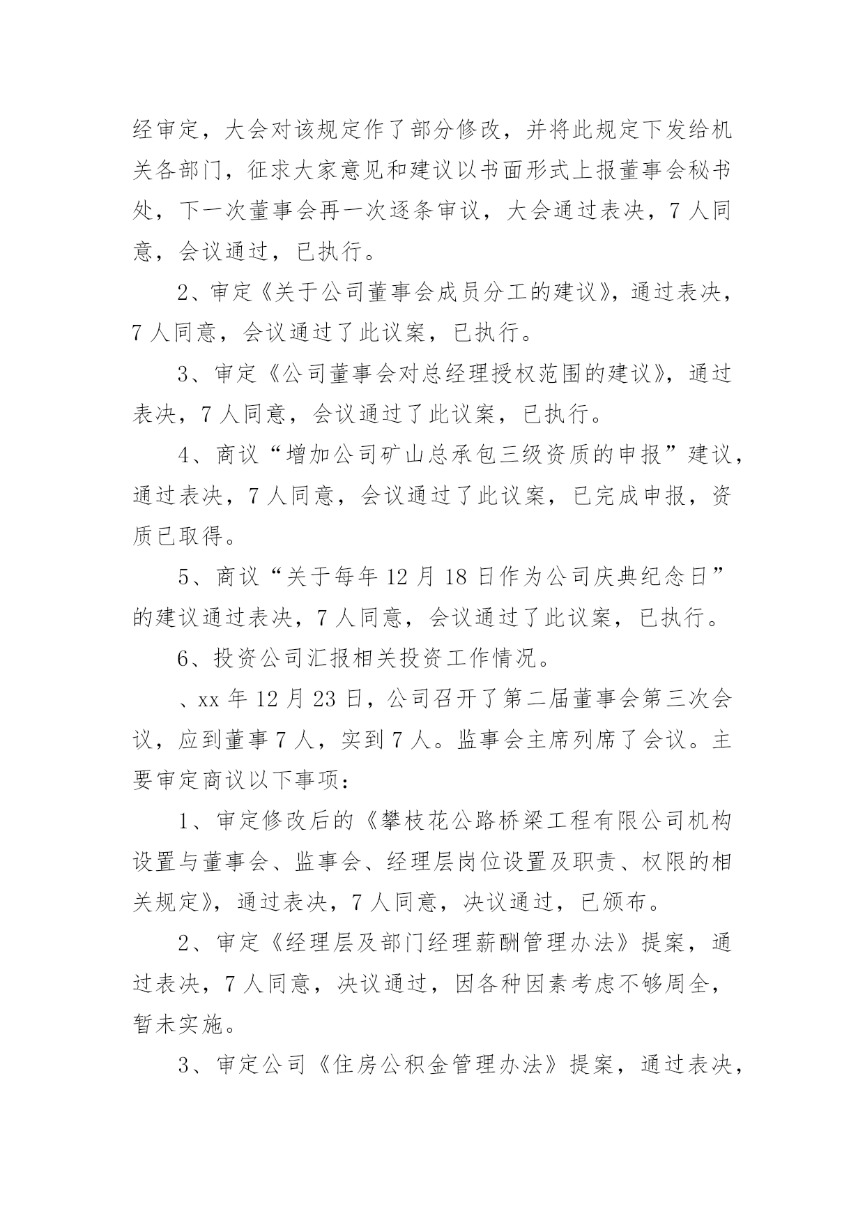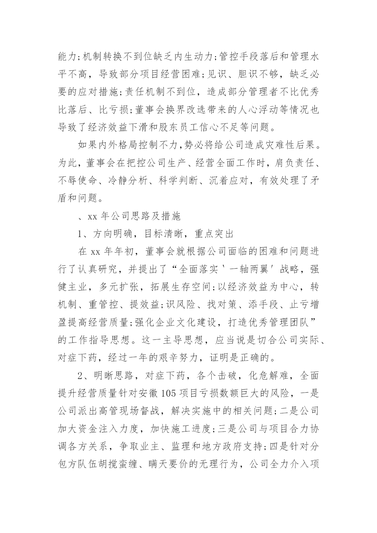 经典董事会工作报告经典董事会工作报告范文在经济飞速发展的今天,报告使用的频率越来越高,报告成为了一种新兴产业。写起报告来就毫无头绪?下面是小编收集整理的经典董事会工作报告范文,欢迎大家分享。经典董事会工作报告范文1各位股东代表,大家好!今天,兰州xx交通科技有限公司在这里召开股东代表大会,借此机会,我首先向在过去一年里为xx公司的发展和壮大做出巨大贡献的各位股东和股东代表表示衷心的感谢!下面,我受董事会的委托,并代表董事会,向诸位作20xx年度工作报告,请予以审议!20xx年对于xx而言是机遇与挑战并存的一年,更是公司收获的一年。本年度,公司在设计院的正确领导和支持下,紧紧围绕发展经济这一目标,抓机遇、求发展,全体员工齐心协力,顽强进取,各方面的工作都取得了一定的成绩。在过去的一年里,公司全员团结拼搏、务实创新,始终坚持“创新从心开始”的经营理念,同心同德、真抓实干,切实完成了设计院下达的生产指标。下面对公司本年度的各项工作予以汇报。一、狠抓生产,经营业绩不断提高20xx年,公司继续围绕“争创勘察设计精品”的经营目标,坚持“创造从心开始”的经营理念,继续深入贯彻落实科学发展观,把发展经济作为公司发展的第一要务。一年来,公司在工程设计与施工、多媒体制作与演示、网络监控及软件开发等方面均取得了一定的成绩,主要项目有:天水过境段两阶段施工图设计、三抚线三屯营至唐秦界段改建工程(第一合同段)两阶段施工图设计、曲麻莱至不冻泉三级公路安全设施设计、甘肃省水运局信息化系统工可报告及设计、s207线靖远至会宁县际扶贫公路一阶段施工图设计、全省高速公路计重收费改造施工图设计、内蒙古省道313线兰家梁至嘎鲁图机电设计、中川、天水路、瓜州收费站情报板施工等,公司全年共完成生产任务多项,其中通过设计院承揽的生产任务近20项,独立承揽生产任务15项。(详细情况见附表)二、完善制度,管理水平不断提高制度建设是企业发展的重要保证。公司发展至今,一是靠正确的领导和政策,二是靠广大员工的支持和严格的管理。20xx年,公司结合经营管理实际,对管理制度进行了第四次修订,并制订《兰州xx交通科技有限公司管理制度汇编》,内容涉及人事、财务、薪金、奖惩、采购、报销、质量追究、内部控制等21项,基本达到了按制度和规定办事的管理理念,公司管理逐步进入了科学管理的轨道,管理水平不断提高,同时也有效促进了劳动生产率和工作效率的提高。由于公司20xx年的工作重心会偏向于机电施工,因此,我们会在设备采购管理、施工控制、招投标管理及资产、资质、资金(“三资”)管理上狠下功夫,不断完善相关制度,由以往的“人治”逐渐步入依制度办事、依法律办事的轨道,使公司能更好更快地发展。三、注重培训,员工综合素质不断提高一直以来,公司始终给予员工培训工作极大的重视。采取公司外派深造、个人主动学习、聘请专家授课等多种形式进行培训,同时保证每月至少两次的学习时间;在学习内容上,不仅注重在思想政治方面的学习,同时对于专业知识方面的学习也相当重视。内容主要包括:现代企业管理知识、专业基础知识、各门类的技术培训等,对于成绩突出者给予一定的奖励,并由公司报销相应费用。通过学习培训,有效地提高了广大员工学习的积极性,使员工的整体素质得到了全面的.提升。20xx年,公司先后组织培训员工10余人次。其中,12月23日媒体部赴北京进行为期六天的公路虚拟现实软件培训影响深远,为康临路制作虚拟现实作了充分的准备,更为重要的是为公司以后公路交通虚拟现实打下了坚实的基础。此外,公司还组织设计施工人员10余人进行了甘肃省建筑行业安全培训、罗杰康交换机技术培训等。目前公司开展的“创新标兵、技术能手和科研小组活动”已接近尾声,对于在活动中涌现出的先进个人和部门,公司也给予了一定的物质奖励,这项活动我们将长期坚持下去,这样做的目的既鼓励了先进,鞭策了后进,员工的集体荣誉感得到了加强,同时,xx的形象也得到了弘扬,各项工作都得到了促进。四、注重企业文化建设,推动xx健康发展。企业的文化建设是企业发展的催化剂,更是企业健康发展的基础。20xx年,在设计院的正确领导下,公司全员紧紧围绕生产经营目标任务的完成,继续深入、持久地在全公司范围内广泛开展了争创优秀部室等活动,工会利用双休日、节假日开展形式多样的文娱活动,诸如:组建xx自行车队、举办xx篮球联谊赛、部门之间联谊等等。通过这些员工喜闻乐见的活动形式,极大地增强了企业的凝聚力,同时也极大地鼓舞和调动了员工工作的积极性、主动性和创造性,在公司形成了心齐、气顺、劲足的良好氛围。20xx年新春团拜会,公司组织了近十人的筹备队伍,利用下班休息时间及周末认真排练,经过时近两个月的紧张准备,最终,由我们xx公司选送的两个节目均获得了优异的成绩,音乐剧《灰姑娘》获得了二等奖,相声《新潮相声》获得了三