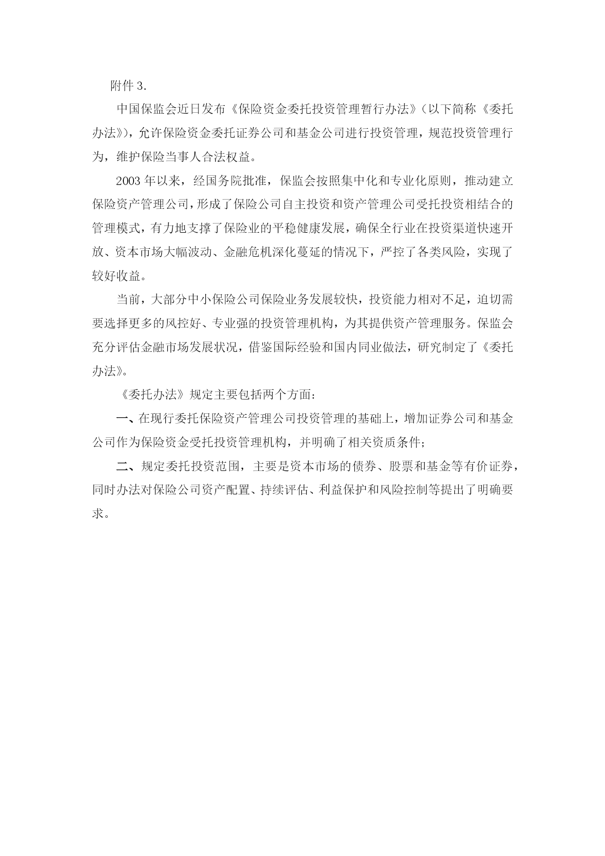 保险资金委托投资管理暂行办法保监会印发《保险资金委托投资管理暂行办法》保监发〔2012〕60号各保险集团(控股)公司、保险公司、保险资产管理公司:为规范保险资金委托投资行为,防范投资管理风险,切实保障资产安全,维护保险当事人合法权益,我会制定了《保险资金委托投资管理暂行办法》,现印发给你们,请遵照执行。中国保险监督管理委员会二一二年七月十六日保险资金委托投资管理暂行办法第一章总则第一条为规范保险资金委托投资行为,防范投资管理风险,切实保障资产安全,维护保险当事人合法权益,根据《中华人民共和国HYPERLINK"http://insurance.jrj.com.cn/news/20080112/000000185662.htm"保险法》、《中华人民共和国合同法》、《保险资金运用管理暂行办法》等法律法规,制定本办法。第二条中国境内依法设立的保险集团(控股)公司和保险公司(以下统称保险公司),将保险资金委托给符合条件的投资管理人,开展定向资产管理、专项资产管理或者特定客户资产管理等投资业务,适用本办法。本办法所称投资管理人,是指在中国境内依法设立的,符合中国保险监督管理委员会(以下简称中国保监会)规定的保险资产管理公司、证券公司、证券资产管理公司、证券投资基金管理公司及其子公司(以下简称基金管理公司)等专业投资管理机构。第三条保险公司开展保险资金委托投资,应当建立资产托管机制,并按照本办法规定选择投资管理人。保险公司委托投资资金及其运用形成的财产,应当独立于投资管理人、托管人的固有财产及其管理的其他财产。投资管理人因投资、管理或者处分保险资金取得的财产和收益,应当归入委托投资资产。相关机构不得对受托投资的保险资金采取强制措施。第四条中国保监会负责制定保险资金委托投资的政策规定,依法对委托投资和受托投资等行为实施监督管理。第二章资质条件第五条保险公司开展委托投资,应当满足下列要求:(一)具有完善的公司治理、决策流程和内控机制;(二)具有健全的资产管理体制和明确的资产配置计划;(三)财务状况良好,资产配置能力符合中国保监会有关规定;(四)建立委托投资管理制度,包括投资管理人选聘、监督、评价、考核等制度,并覆盖委托投资全部过程;(五)建立委托资产托管机制,资金运作透明规范;(六)最近三年未发现重大违法违规行为。第六条保险公司开展委托投资,受托的投资管理人应当符合下列条件:(一)公司治理完善,市场信誉良好,具有国家有关部门认可的资产管理业务资质;(二)具有健全的操作流程、内控机制、风险管理及稽核制度,建立公平交易和风险隔离机制;(三)具有丰富的产品线,稳定的过往投资业绩;(四)设置产品开发、投资研究、投资管理、风险控制、绩效评估、咨询服务等专业岗位;(五)具有稳定的投资管理团队,拥有不少于15名具有相关资质和投资经验的专业人员,其中具有5年以上投资经验的不少于5名,具有3年以上投资经验的不少于5名;(六)最近三年未发现重大违法违规行为。第七条保险公司选择保险资产管理公司开展委托投资,该公司除符合第六条规定外,还应当符合下列条件:(一)注册资本不低于1亿元;(二)管理资产余额不低于100亿元;(三)具有一年以上受托投资经验。保险资产管理公司受托管理关联方机构的资金,不受前款第(二)、(三)项的限制。第八条保险公司选择证券公司或证券资产管理公司开展委托投资,该公司除符合第六条规定外,还应当符合下列条件:(一)取得客户资产管理业务资格三年以上;(二)最近一年客户资产管理业务管理资产余额(含全国社保基金和企业年金)不低于100亿元,或者集合资产管理业务受托资金余额不低于50亿元;(三)接受中国保监会涉及保险资金委托投资的质询,并报告有关情况。第九条保险公司选择基金管理公司开展委托投资,该公司除符合第六条规定外,还应当符合下列条件:(一)取得特定客户资产管理业务资格三年以上;(二)最近一年管理非货币类证券投资基金余额不低于100亿元;(三)接受中国保监会涉及保险资金委托投资的质询,并报告有关情况。第三章投资规范第十条保险资金委托投资范围,限于境内市场的存款、依法公开发行并上市交易的债券和股票、证券投资基金及其他金融工具。保险资金投资金融工具的品种和比例,应当符合中国保监会规定。第十一条保险公司开展委托投资,应当按照规定和内控要求,完善决策程序和授权机制,确定股东(大)会、董事会和经营管理层的决策及批准权限,由董事会承担委托投资的最终责任。第十二条保险公司开展委托投资,应当制定投资管理人选聘标准和流程,综合考虑风险、成本和收益等因素,通过市场化方式,合理确定投资管理人数量。第十三条保险公司开展委托投资,应当与投资管理人签订委托投资管理协议
