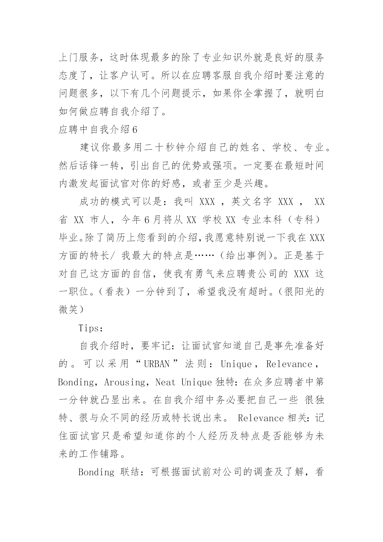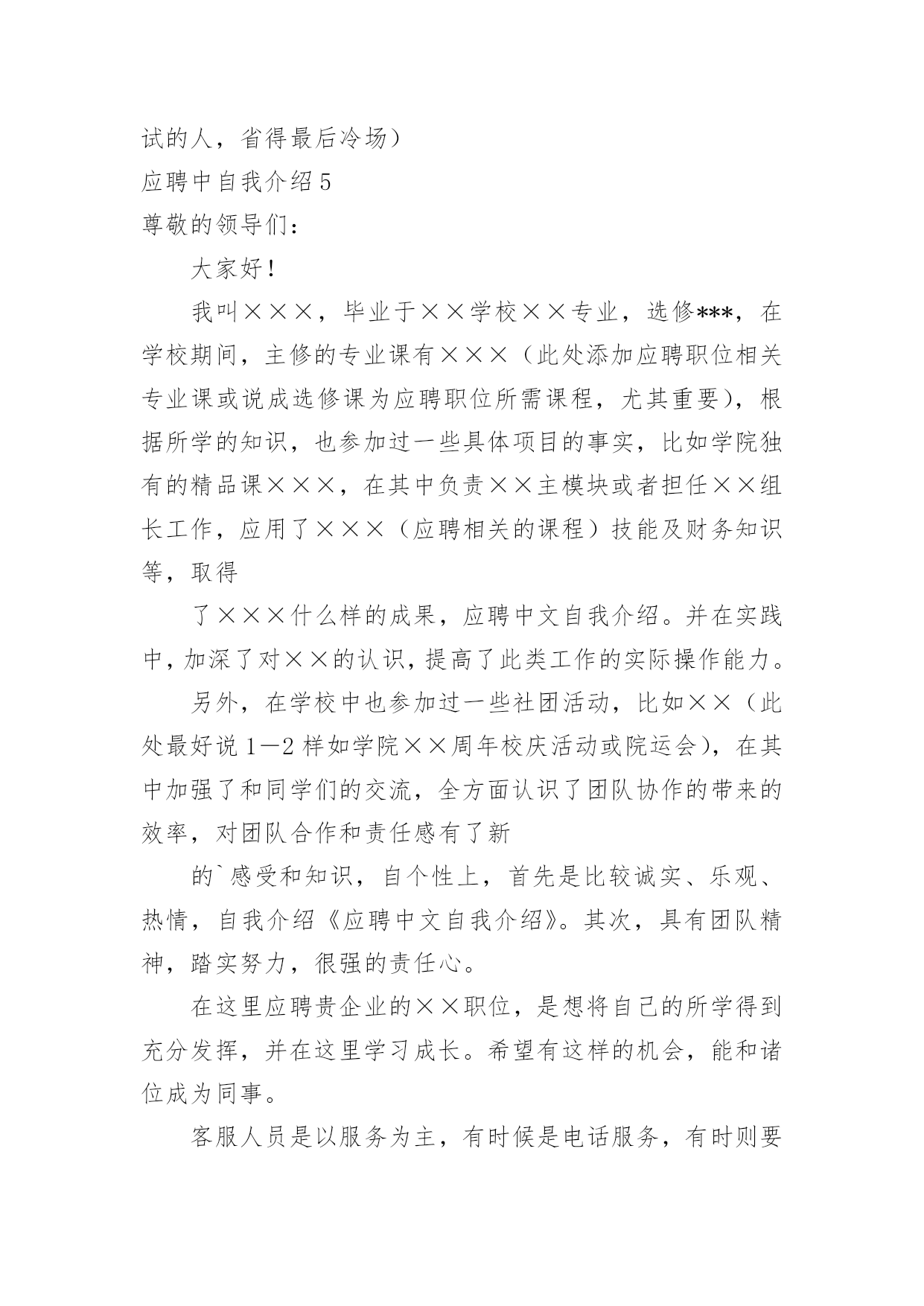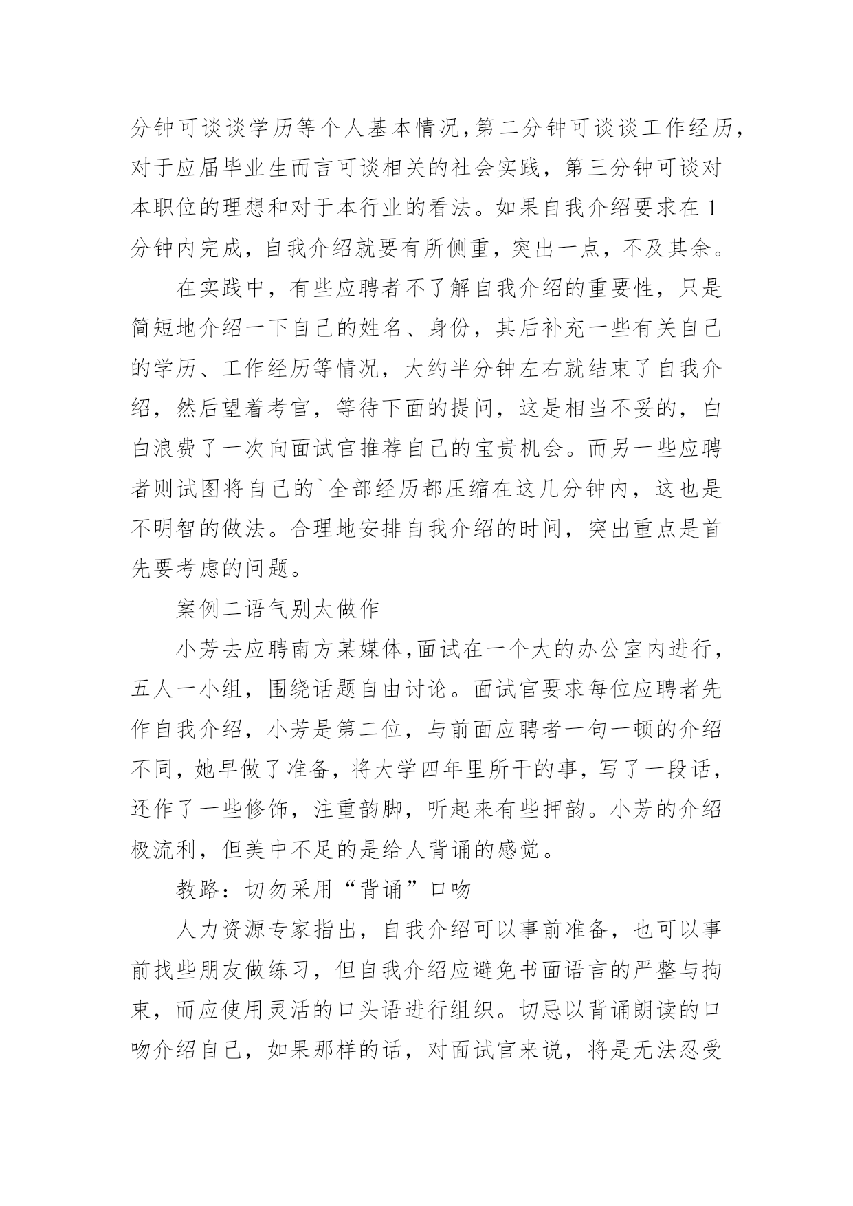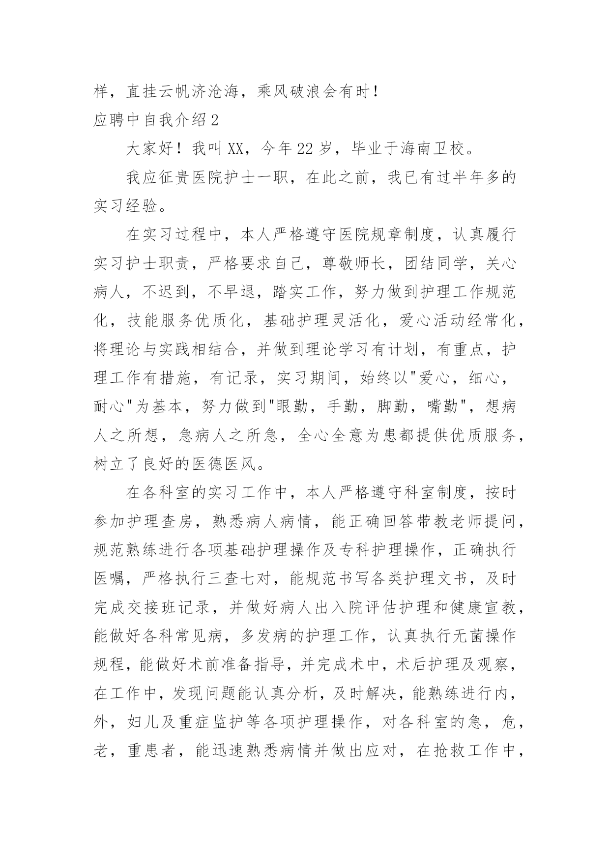 应聘中自我介绍应聘中自我介绍来到一个新的地方后,我们有必要进行适当的自我介绍,自我介绍有助于自我宣传、自我展示。那么自我介绍应该包括什么内容呢?下面是小编整理的应聘中自我介绍,欢迎大家分享。应聘中自我介绍1尊敬的领导们:大家好!我是xx大学xx学院xxx专业xx级本科学生,将于xxx年xx月毕业。在即将叩响社会这扇大门时,我怀着无比的真诚和高度责任感把我的人生向您靠拢。xxx年的大学生活使我树立了正确的人生观、价值观,形成了热情、上进、不屈不挠的性格和诚实、守信、有责任心、有爱心的人生信条。xxx年,厚积薄发的xxx年,给我的`“轻叩柴扉”留下一个自信而又响亮的声音。在即将走向社会之时,诚望贵单位全面考察我的情况,若能蒙您垂青,我将深感荣幸,并在日后工作中,不懈拼搏之劲,不失进取之心,克尽己能,为贵单位事业奉献自己的一份力量。相信在您们的支持下,我会和您所领导的单位一样,直挂云帆济沧海,乘风破浪会有时!应聘中自我介绍2大家好!我叫XX,今年22岁,毕业于海南卫校。我应征贵医院护士一职,在此之前,我已有过半年多的实习经验。在实习过程中,本人严格遵守医院规章制度,认真履行实习护士职责,严格要求自己,尊敬师长,团结同学,关心病人,不迟到,不早退,踏实工作,努力做到护理工作规范化,技能服务优质化,基础护理灵活化,爱心活动经常化,将理论与实践相结合,并做到理论学习有计划,有重点,护理工作有措施,有记录,实习期间,始终以"爱心,细心,耐心"为基本,努力做到"眼勤,手勤,脚勤,嘴勤",想病人之所想,急病人之所急,全心全意为患都提供优质服务,树立了良好的医德医风。在各科室的实习工作中,本人严格遵守科室制度,按时参加护理查房,熟悉病人病情,能正确回答带教老师提问,规范熟练进行各项基础护理操作及专科护理操作,正确执行医嘱,严格执行三查七对,能规范书写各类护理文书,及时完成交接班记录,并做好病人出入院评估护理和健康宣教,能做好各科常见病,多发病的护理工作,认真执行无菌操作规程,能做好术前准备指导,并完成术中,术后护理及观察,在工作中,发现问题能认真分析,及时解决,能熟练进行内,外,妇儿及重症监护等各项护理操作,对各科室的急,危,老,重患者,能迅速熟悉病情并做出应对,在抢救工作中,一丝不苟,有条不紊,得到了患者的信赖和好评,同时,本人积极参加各类病例讨论和学术讲座,不断丰富自己的业务知识,通过学习,对整体护理技术与病房管理知识有了更全面的认识和了解.通过半年多的护理工作实习,在带教老师的悉心指导与耐心带教下,认真学习《医疗事故处理条例》及其法律法规,并积极参加医院组织的医疗事故护理条例培训,多次参加护理人员学习,通过学习使我意识到,社会主义市场经济体制的建立,法律制度日益完善,人民群众法制观念不断增强,依法办事、依法维护自身的合法权益已成为人们的'共识,现代护理质量观念是全方位、全过程的让病人满意,这是人们对医疗护理服务提出更高、更新的需求,因而丰富法律知识,增强安全保护意识,并且可以使护理人员懂法、用法、依法减少医疗事故的发生。理论水平与实践水平有了一定提高。应聘中自我介绍3研究生毕业的小刘很健谈,口才甚佳,对自我介绍,他自认为不在话下,所以他从来不准备,看什么人说什么话。他的求职目标是地产策划,有一次,应聘本地一家大型房地产公司,在自我介绍时,他大谈起了房地产行业的走向,由于跑题太远,面试官不得不把话题收回来。自我介绍也只能“半途而止”。教路:一分钟谈一项内容自我介绍的时间一般为3分钟,在时间的分配上,第一分钟可谈谈学历等个人基本情况,第二分钟可谈谈工作经历,对于应届毕业生而言可谈相关的社会实践,第三分钟可谈对本职位的理想和对于本行业的看法。如果自我介绍要求在1分钟内完成,自我介绍就要有所侧重,突出一点,不及其余。在实践中,有些应聘者不了解自我介绍的重要性,只是简短地介绍一下自己的姓名、身份,其后补充一些有关自己的学历、工作经历等情况,大约半分钟左右就结束了自我介绍,然后望着考官,等待下面的提问,这是相当不妥的,白白浪费了一次向面试官推荐自己的宝贵机会。而另一些应聘者则试图将自己的`全部经历都压缩在这几分钟内,这也是不明智的做法。合理地安排自我介绍的时间,突出重点是首先要考虑的问题。案例二语气别太做作小芳去应聘南方某媒体,面试在一个大的办公室内进行,五人一小组,围绕话题自由讨论。面试官要求每位应聘者先作自我介绍,小芳是第二位,与前面应聘者一句一顿的介绍不同,她早做了准备,将大学四年里所干的事,写了一段话,还作了一些修饰,注重韵脚,听起来有些押韵。小芳的介绍极流利,但美中不足的是给人背诵的感觉。教路:切勿采用“背诵”口吻人力资源专家指出,自我介绍可以事前准备,也可以事前找些朋友做练习,但自我介绍应避免书面语言的严整与拘束,而应使用灵活的口头语进