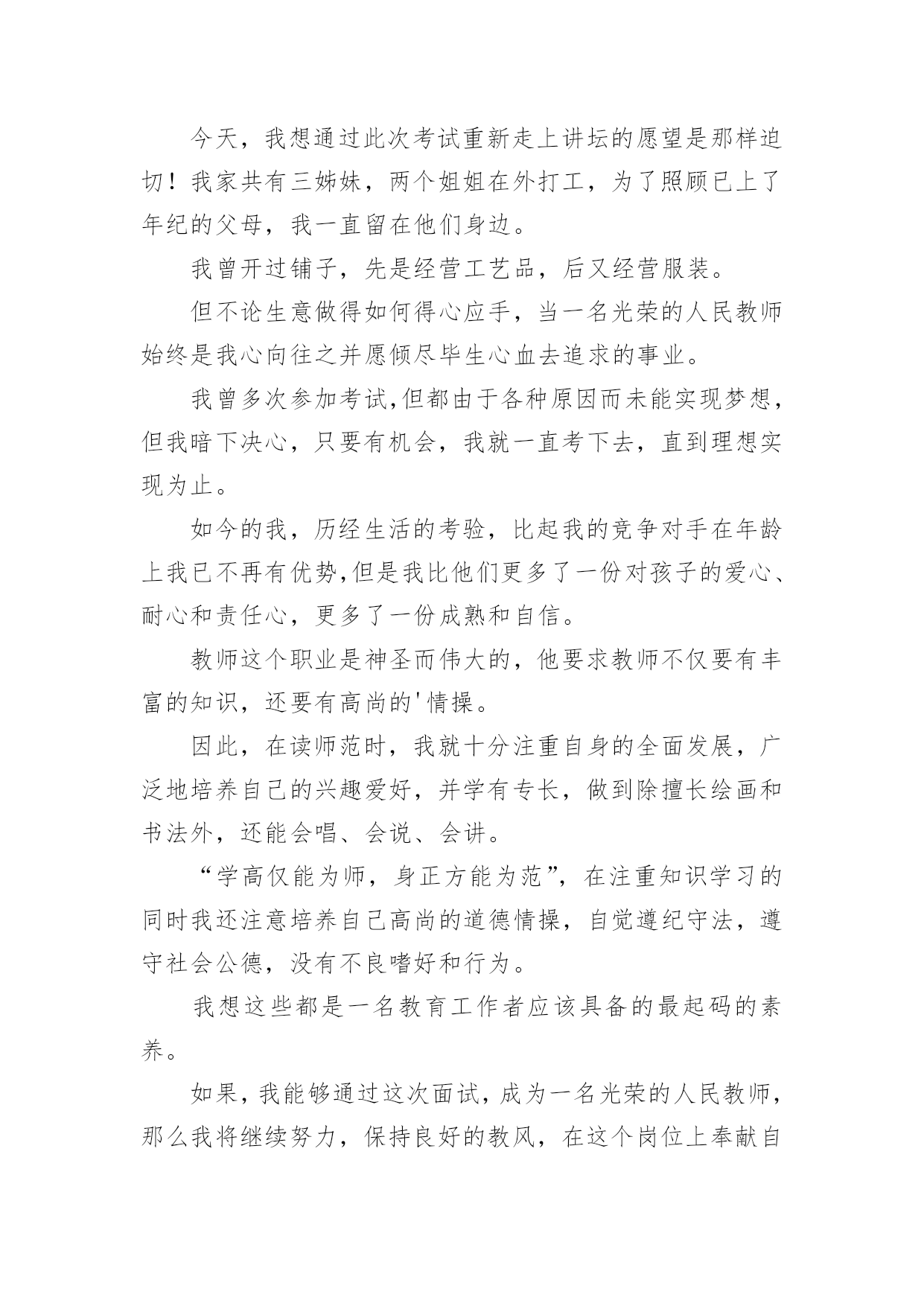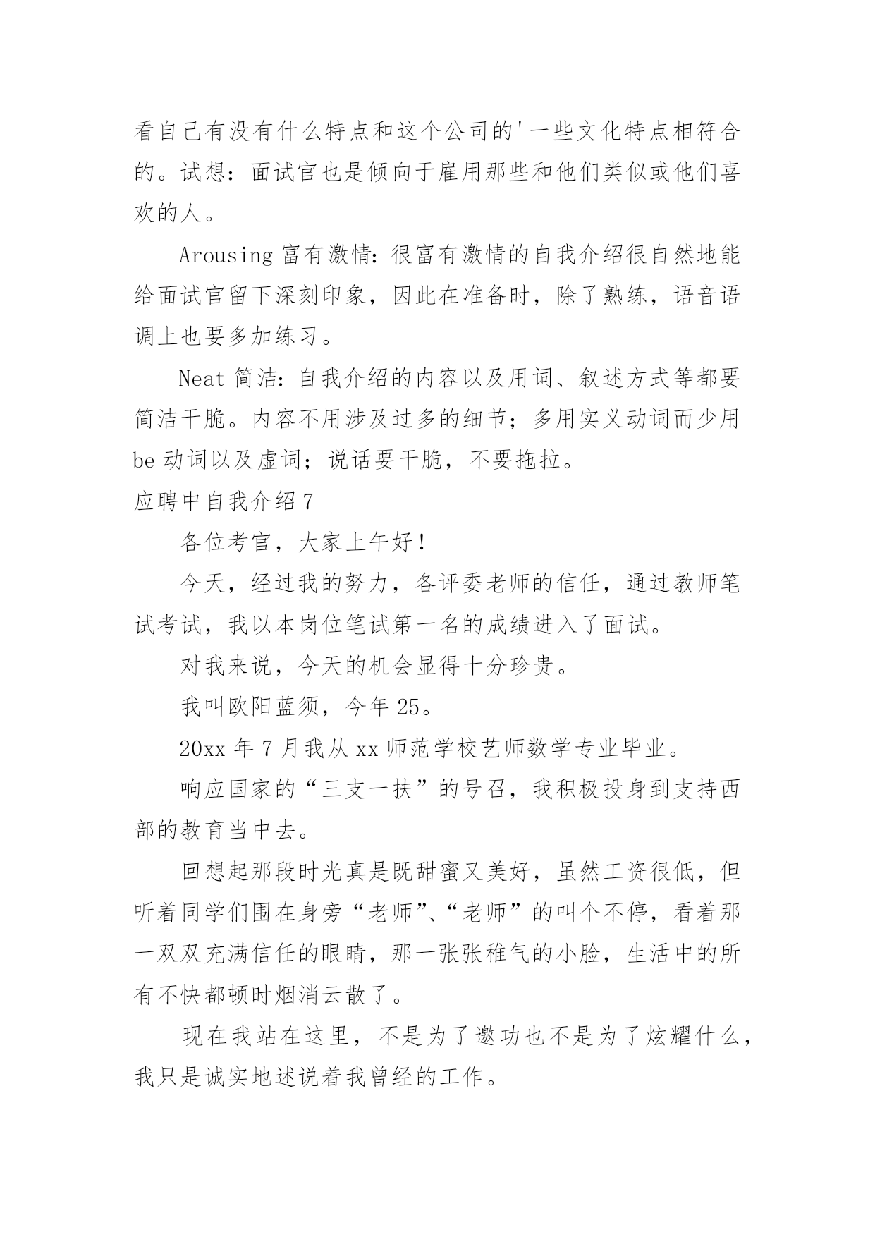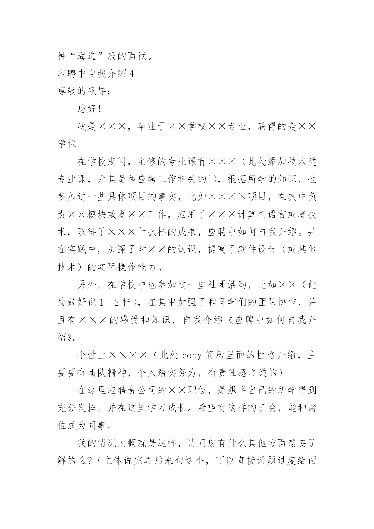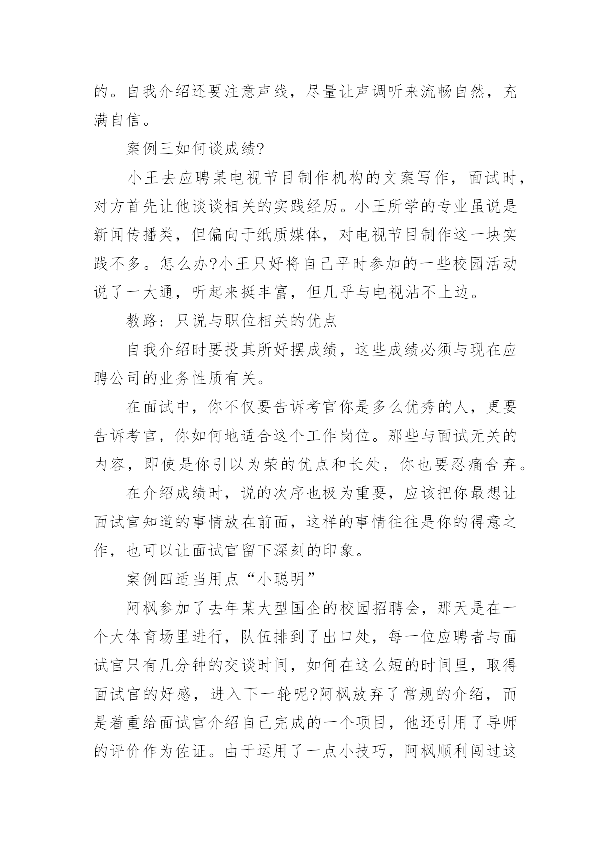 应聘中自我介绍应聘中自我介绍来到一个新的地方后,我们有必要进行适当的自我介绍,自我介绍有助于自我宣传、自我展示。那么自我介绍应该包括什么内容呢?下面是小编整理的应聘中自我介绍,欢迎大家分享。应聘中自我介绍1尊敬的领导们:大家好!我是xx大学xx学院xxx专业xx级本科学生,将于xxx年xx月毕业。在即将叩响社会这扇大门时,我怀着无比的真诚和高度责任感把我的人生向您靠拢。xxx年的大学生活使我树立了正确的人生观、价值观,形成了热情、上进、不屈不挠的性格和诚实、守信、有责任心、有爱心的人生信条。xxx年,厚积薄发的xxx年,给我的`“轻叩柴扉”留下一个自信而又响亮的声音。在即将走向社会之时,诚望贵单位全面考察我的情况,若能蒙您垂青,我将深感荣幸,并在日后工作中,不懈拼搏之劲,不失进取之心,克尽己能,为贵单位事业奉献自己的一份力量。相信在您们的支持下,我会和您所领导的单位一样,直挂云帆济沧海,乘风破浪会有时!应聘中自我介绍2大家好!我叫XX,今年22岁,毕业于海南卫校。我应征贵医院护士一职,在此之前,我已有过半年多的实习经验。在实习过程中,本人严格遵守医院规章制度,认真履行实习护士职责,严格要求自己,尊敬师长,团结同学,关心病人,不迟到,不早退,踏实工作,努力做到护理工作规范化,技能服务优质化,基础护理灵活化,爱心活动经常化,将理论与实践相结合,并做到理论学习有计划,有重点,护理工作有措施,有记录,实习期间,始终以"爱心,细心,耐心"为基本,努力做到"眼勤,手勤,脚勤,嘴勤",想病人之所想,急病人之所急,全心全意为患都提供优质服务,树立了良好的医德医风。在各科室的实习工作中,本人严格遵守科室制度,按时参加护理查房,熟悉病人病情,能正确回答带教老师提问,规范熟练进行各项基础护理操作及专科护理操作,正确执行医嘱,严格执行三查七对,能规范书写各类护理文书,及时完成交接班记录,并做好病人出入院评估护理和健康宣教,能做好各科常见病,多发病的护理工作,认真执行无菌操作规程,能做好术前准备指导,并完成术中,术后护理及观察,在工作中,发现问题能认真分析,及时解决,能熟练进行内,外,妇儿及重症监护等各项护理操作,对各科室的急,危,老,重患者,能迅速熟悉病情并做出应对,在抢救工作中,一丝不苟,有条不紊,得到了患者的信赖和好评,同时,本人积极参加各类病例讨论和学术讲座,不断丰富自己的业务知识,通过学习,对整体护理技术与病房管理知识有了更全面的认识和了解.通过半年多的护理工作实习,在带教老师的悉心指导与耐心带教下,认真学习《医疗事故处理条例》及其法律法规,并积极参加医院组织的医疗事故护理条例培训,多次参加护理人员学习,通过学习使我意识到,社会主义市场经济体制的建立,法律制度日益完善,人民群众法制观念不断增强,依法办事、依法维护自身的合法权益已成为人们的'共识,现代护理质量观念是全方位、全过程的让病人满意,这是人们对医疗护理服务提出更高、更新的需求,因而丰富法律知识,增强安全保护意识,并且可以使护理人员懂法、用法、依法减少医疗事故的发生。理论水平与实践水平有了一定提高。应聘中自我介绍3研究生毕业的小刘很健谈,口才甚佳,对自我介绍,他自认为不在话下,所以他从来不准备,看什么人说什么话。他的求职目标是地产策划,有一次,应聘本地一家大型房地产公司,在自我介绍时,他大谈起了房地产行业的走向,由于跑题太远,面试官不得不把话题收回来。自我介绍也只能“半途而止”。教路:一分钟谈一项内容自我介绍的时间一般为3分钟,在时间的分配上,第一分钟可谈谈学历等个人基本情况,第二分钟可谈谈工作经历,对于应届毕业生而言可谈相关的社会实践,第三分钟可谈对本职位的理想和对于本行业的看法。如果自我介绍要求在1分钟内完成,自我介绍就要有所侧重,突出一点,不及其余。在实践中,有些应聘者不了解自我介绍的重要性,只是简短地介绍一下自己的姓名、身份,其后补充一些有关自己的学历、工作经历等情况,大约半分钟左右就结束了自我介绍,然后望着考官,等待下面的提问,这是相当不妥的,白白浪费了一次向面试官推荐自己的宝贵机会。而另一些应聘者则试图将自己的`全部经历都压缩在这几分钟内,这也是不明智的做法。合理地安排自我介绍的时间,突出重点是首先要考虑的问题。案例二语气别太做作小芳去应聘南方某媒体,面试在一个大的办公室内进行,五人一小组,围绕话题自由讨论。面试官要求每位应聘者先作自我介绍,小芳是第二位,与前面应聘者一句一顿的介绍不同,她早做了准备,将大学四年里所干的事,写了一段话,还作了一些修饰,注重韵脚,听起来有些押韵。小芳的介绍极流利,但美中不足的是给人背诵的感觉。教路:切勿采用“背诵”口吻人力资源专家指出,自我介绍可以事前准备,也可以事前找些朋友做练习,但自我介绍应避免书面语言的严整与拘束,而应使用灵活的口头语进