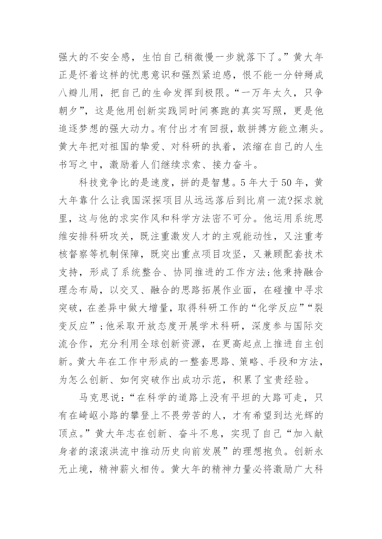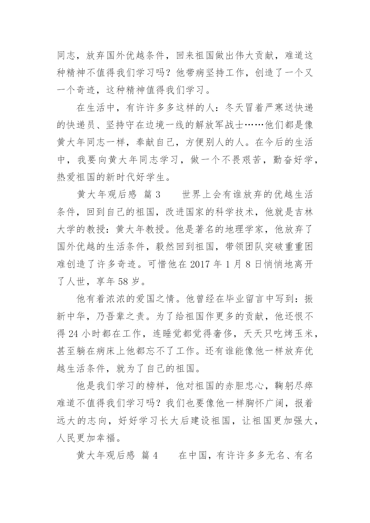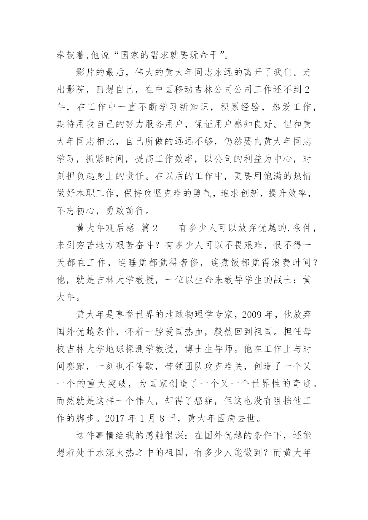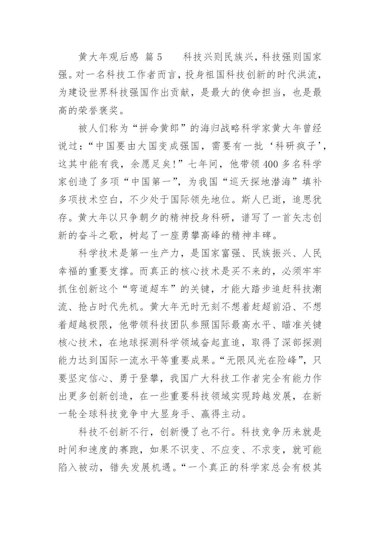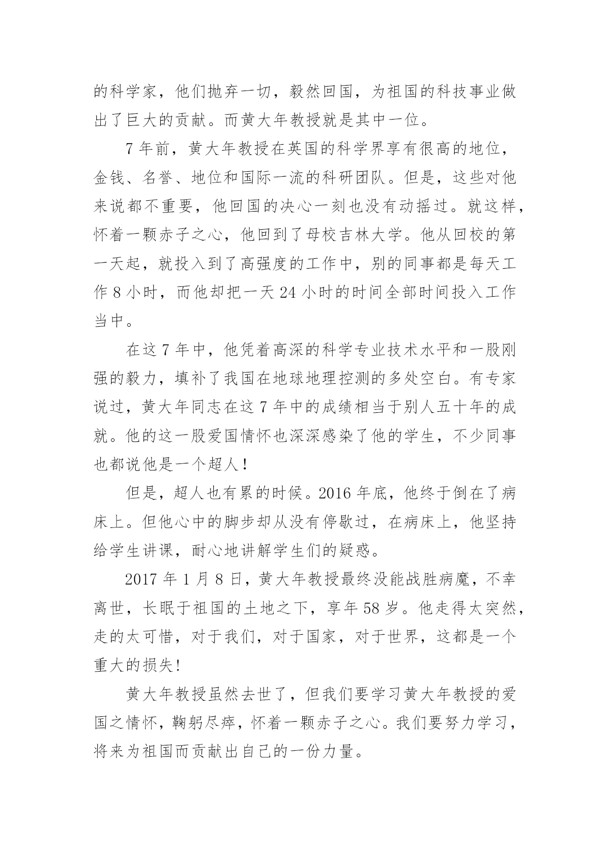 黄大年观后感黄大年观后感(通用5篇)当品味完一部作品后,你有什么总结呢?是时候抽出时间写写观后感了。那要怎么写好观后感呢?下面是小编收集整理的黄大年观后感,欢迎大家借鉴与参考,希望对大家有所帮助。黄大年观后感篇1观看了故事影片《黄大年》。早在之前的党课学习中就对黄大年同志不忘初心,至诚报国的先进事迹有所了解,此次观看电影让我更深入的学习了这位科技工作者的敬业爱国精神。黄大年同志是吉林大学地球探测科学与技术学院教授、博士生导师,和学校很多老师一样,专心科研、认真教学,甚至于无暇照顾家庭、顾及自己的身体。2009年,因国家启动引进海外人才的召唤以及母校吉林大学的诚挚邀请下,黄大年同志毅然放弃国外优越的条件回到祖国,只因为国内的科学事业需要他。正是黄大年同志不惧强者、勇于超越的自信和能力,填补了我国多项技术空白。他回国只想作一名全职教授,一心投入科研,培养学生。他需要时间让祖国的科学事业逐渐强大,因此他争分夺秒,讲求效率。随着故事的推进,在各项事情顺利进行的同时,黄大年同志的身体也逐渐出现异样,尽管司机一次又一次的提醒,但黄大年就是不听,一心扑在他的事业上,为国家科学事业奉献着,他说“国家的需求就要玩命干”。影片的最后,伟大的黄大年同志永远的离开了我们。走出影院,回想自己,在中国移动吉林公司公司工作还不到2年,在工作中一直不断学习新知识,积累经验,热爱工作,期待用我自己的努力服务用户,保证用户感知良好。但和黄大年同志相比,自己所做的远远不够,仍然要向黄大年同志学习,抓紧时间,提高工作效率,以公司的利益为中心,时刻担负起身上的责任。在以后的工作中,更要用饱满的热情做好本职工作,保持攻坚克难的勇气,追求创新,提升效率,不忘初心,勇敢前行。黄大年观后感篇2有多少人可以放弃优越的.条件,来到穷苦地方艰苦奋斗?有多少人可以不畏艰难,恨不得一天都在工作,连睡觉都觉得奢侈,连煮饭都觉得浪费时间?他,就是吉林大学教授,一位以生命来教导学生的战士:黄大年。黄大年是享誉世界的地球物理学专家,2009年,他放弃国外优越条件,怀着一腔爱国热血,毅然回到祖国。担任母校吉林大学地球探测学教授,博士生导师。他在工作上与时间赛跑,一刻也不停歇,带领团队攻克难关,创造了一个又一个的重大突破,为国家创造了一个又一个世界性的奇迹。而然就是这样一个伟人,却得了癌症,但这也没有阻挡他工作的脚步。2017年1月8日,黄大年因病去世。这件事情给我的感触很深:在国外优越的条件下,还能想着处于水深火热之中的祖国,有多少人能做到?而黄大年同志,放弃国外优越条件,回来祖国做出伟大贡献,难道这种精神不值得我们学习吗?他带病坚持工作,创造了一个又一个奇迹,这种精神值得我们学习。在生活中,有许许多多这样的人:冬天冒着严寒送快递的快递员、坚持守在边境一线的解放军战士……他们都是像黄大年同志一样,奉献自己,方便别人的人。在今后的生活中,我要向黄大年同志学习,做一个不畏艰苦,勤奋好学,热爱祖国的新时代好学生。黄大年观后感篇3世界上会有谁放弃的优越生活条件,回到自己的祖国,改进国家的科学技术,他就是吉林大学的教授:黄大年教授。他是著名的地理学家,他放弃了国外优越的生活条件,毅然回到祖国,带领团队突破重重困难创造了许多奇迹。可惜他在2017年1月8日悄悄地离开了人世,享年58岁。他有着浓浓的爱国之情。他曾经在毕业留言中写到:振新中华,乃吾辈之责。为了给祖国作更多的贡献,他还恨不得24小时都在工作,连睡觉都觉得奢侈,天天只吃烤玉米,甚至躺在病床上他都忘不了工作。还有谁能像他一样放弃优越生活条件,就为了自己的祖国。他是我们学习的榜样,他对祖国的赤胆忠心,鞠躬尽瘁难道不值得我们学习吗?我们也要像他一样胸怀广阔,报着远大的志向,好好学习长大后建设祖国,让祖国更加强大,人民更加幸福。黄大年观后感篇4在中国,有许许多多无名、有名的科学家,他们抛弃一切,毅然回国,为祖国的科技事业做出了巨大的贡献。而黄大年教授就是其中一位。7年前,黄大年教授在英国的科学界享有很高的地位,金钱、名誉、地位和国际一流的科研团队。但是,这些对他来说都不重要,他回国的决心一刻也没有动摇过。就这样,怀着一颗赤子之心,他回到了母校吉林大学。他从回校的第一天起,就投入到了高强度的工作中,别的同事都是每天工作8小时,而他却把一天24小时的时间全部时间投入工作当中。在这7年中,他凭着高深的科学专业技术水平和一股刚强的毅力,填补了我国在地球地理控测的多处空白。有专家说过,黄大年同志在这7年中的成绩相当于别人五十年的成就。他的这一股爱国情怀也深深感染了他的学生,不少同事也都说他是一个超人!但是,超人也有累的时候。2016年底,他终于倒在了病床上。但他心中的脚步却从没有停歇过,在病床上,他坚持给学生讲课,耐心地讲解学生们的疑惑。2017年1月8日,黄大