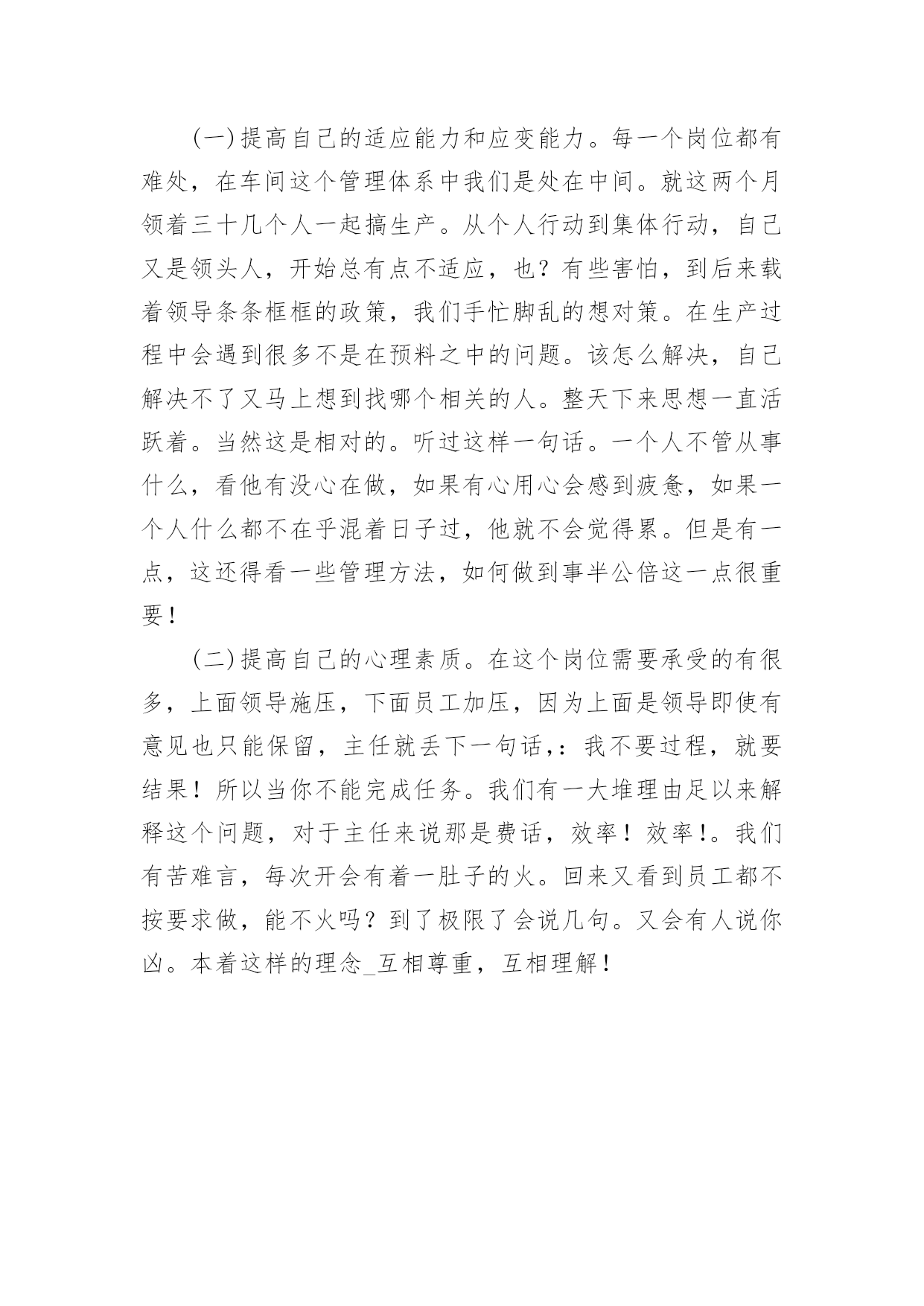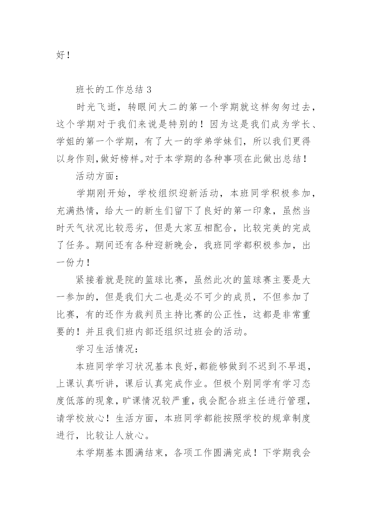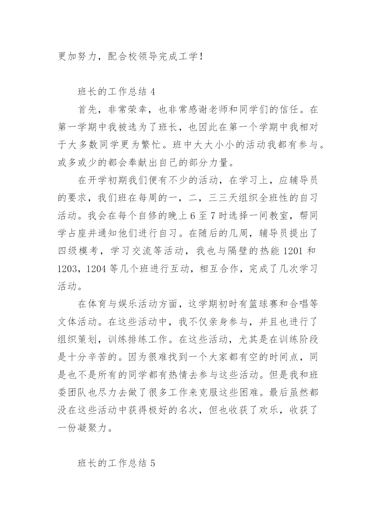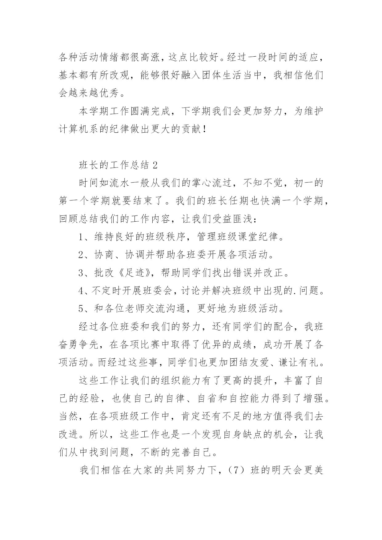 班长的工作总结班长的工作总结(精选5篇)时光在流逝,从不停歇,一段时间的工作已经结束了,这段时间以来的工作,收获了不少成绩,来为这一年的工作写一份工作总结吧。那么要如何写呢?以下是小编为大家整理的班长的工作总结(精选5篇),仅供参考,欢迎大家阅读。班长的工作总结1大二的上学期即将过去,很荣幸在本学期我能担任纪律部副部这一职位,能够更切身的投入到学校各项工作中是我的荣幸。在此对本学期工作进行总结。和上以前不同,作为纪律部副部,我能了解到更多学校内部的情况,并且能够参与进去进行管理,出自己的一份力,我非常高兴。俗话说权利越大,责任也就越大。我知道,作为纪律部最主要的工作就是维持我们计算机系的秩序,协助老师管理同学。所以我和部长陶冶两人,带领部员杨文鹏等九人,每天对大一新生的早操、晚自习进行检查,期间遇到各种问题,我们都能够很好的解决,大一的九个部员也都表现良好,能积极参加部内活动,我非常高兴。存在问题,开始时,大一新生刚进入大学生活,不能够很快适应,所以存在各种问题,比较散漫,不好管理。但对各种活动情绪都很高涨,这点比较好。经过一段时间的适应,基本都有所改观,能够很好融入团体生活当中,我相信他们会越来越优秀。本学期工作圆满完成,下学期我们会更加努力,为维护计算机系的纪律做出更大的贡献!班长的工作总结2时间如流水一般从我们的掌心流过,不知不觉,初一的第一个学期就要结束了。我们的班长任期也快满一个学期,回顾总结我们的工作内容,让我们受益匪浅:1、维持良好的班级秩序,管理班级课堂纪律。2、协商、协调并帮助各班委开展各项活动。3、批改《足迹》,帮助同学们找出错误并改正。4、不定时开展班委会,讨论并解决班级中出现的.问题。5、和各位老师交流沟通,更好地为班级活动。经过各位班委和我们的努力,还有同学们的配合,我班奋勇争先,在各项比赛中取得了优异的成绩,成功开展了各项活动。而经过这些事,同学们也更加团结友爱、谦让有礼。这些工作让我们的组织能力有了更高的提升,丰富了自己的经验,也使自己的自律、自省和自控能力得到了增强。当然,在各项班级工作中,肯定还有不足的地方值得我们去改进。所以,这些工作也是一个发现自身缺点的机会,让我们从中找到问题,不断的完善自己。我们相信在大家的共同努力下,(7)班的明天会更美好!班长的工作总结3时光飞逝,转眼间大二的第一个学期就这样匆匆过去,这个学期对于我们来说是特别的!因为这是我们成为学长、学姐的第一个学期,有了大一的学弟学妹们,所以我们更得以身作则,做好榜样。对于本学期的各种事项在此做出总结!活动方面:学期刚开始,学校组织迎新活动,本班同学积极参加,充满热情,给大一的新生们留下了良好的第一印象,虽然当时天气状况比较恶劣,但是大家互相配合,比较完美的完成了任务。期间还有各种迎新晚会,我班同学都积极参加,出一份力!紧接着就是院的篮球比赛,虽然此次的篮球赛主要是大一参加的,但是我们大二也是必不可少的成员,不但参加了比赛,有的还作为裁判员主持比赛的公正性,这都是非常重要的!并且我们班内部还组织过班会的活动。学习生活情况:本班同学学习状况基本良好,都能够做到不迟到不早退,上课认真听讲,课后认真完成作业。但极个别同学有学习态度低落的现象,旷课情况较严重,我会配合班主任进行管理,请学校放心!生活方面,本班同学都能按照学校的规章制度进行,比较让人放心。本学期基本圆满结束,各项工作圆满完成!下学期我会更加努力,配合校领导完成工学!班长的工作总结4首先,非常荣幸,也非常感谢老师和同学们的信任。在第一学期中我被选为了班长,也因此在第一个学期中我相对于大多数同学更为繁忙。班中大大小小的活动我都有参与。或多或少的都会奉献出自己的部分力量。在开学初期我们便有不少的活动,在学习上,应辅导员的要求,我们班在每周的一,二,三三天组织全班性的自习活动。我会在每个自修的晚上6至7时选择一间教室,帮同学占座并通知他们进行自习。在随后的几周,辅导员提出了四级模考,学习交流等活动,我也与隔壁的热能1201和1203,1204等几个班进行互动,相互合作,完成了几次学习活动。在体育与娱乐活动方面,这学期初时有篮球赛和合唱等文体活动。在这些活动中,我不仅亲身参与,并且也进行了组织策划,训练排练工作。在这些活动,尤其是在训练阶段是十分辛苦的。因为很难找到一个大家都有空的时间点,同是也不是所有的同学都有热情去参与这些活动。但是我和班委团队也尽力去做了很多工作来克服这些困难。最后虽然都没在这些活动中获得极好的名次,但也收获了欢乐,收获了一份凝聚力。班长的工作总结5(一)提高自己的适应能力和应变能力。每一个岗位都有难处,在车间这个管理体系中我们是处在中间。就这两个月领着三十几个人一起搞生产。从个人行动到集体行动,自己又是领头人,开始总有点不适应,也?有些害怕,到后来载着领