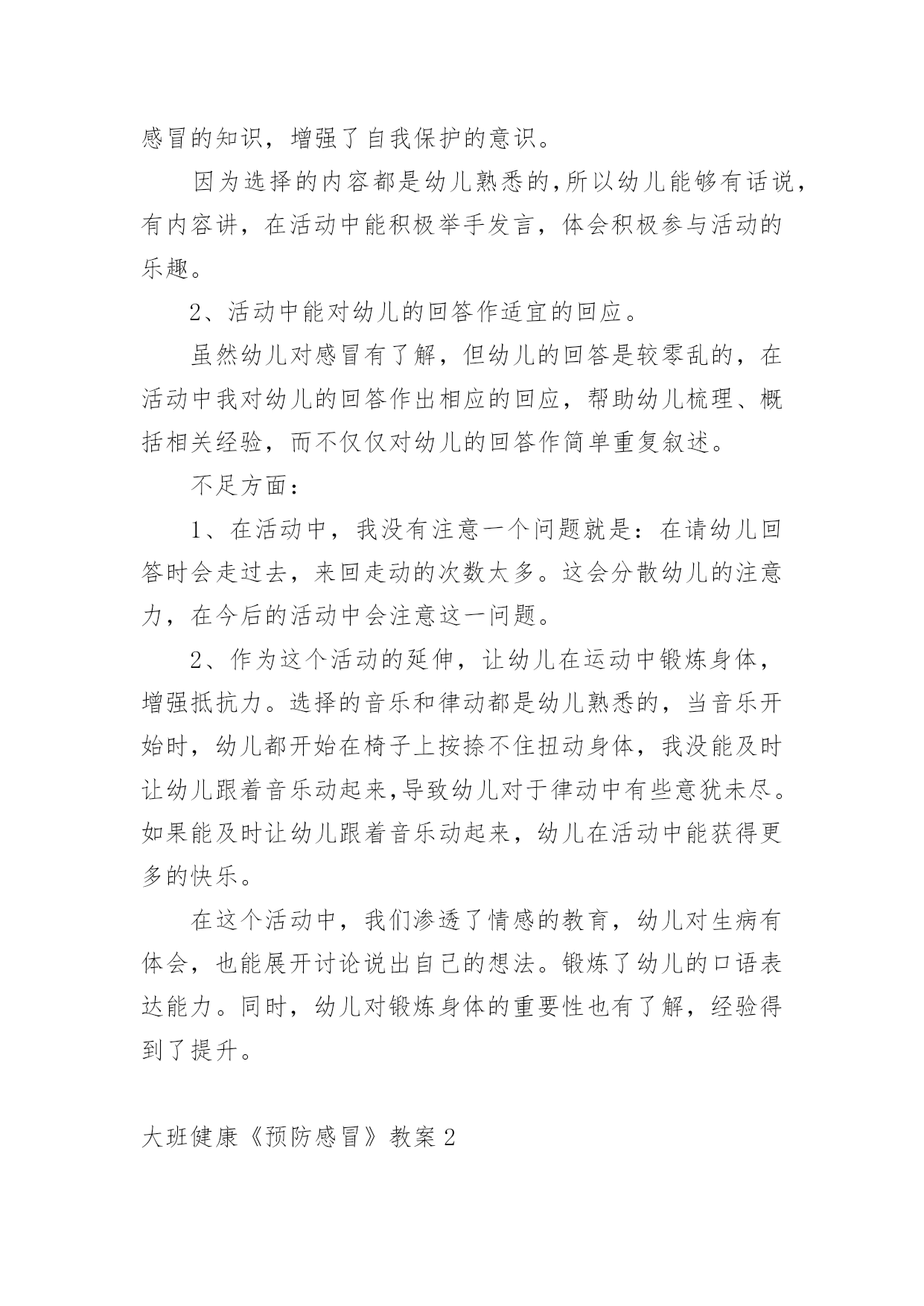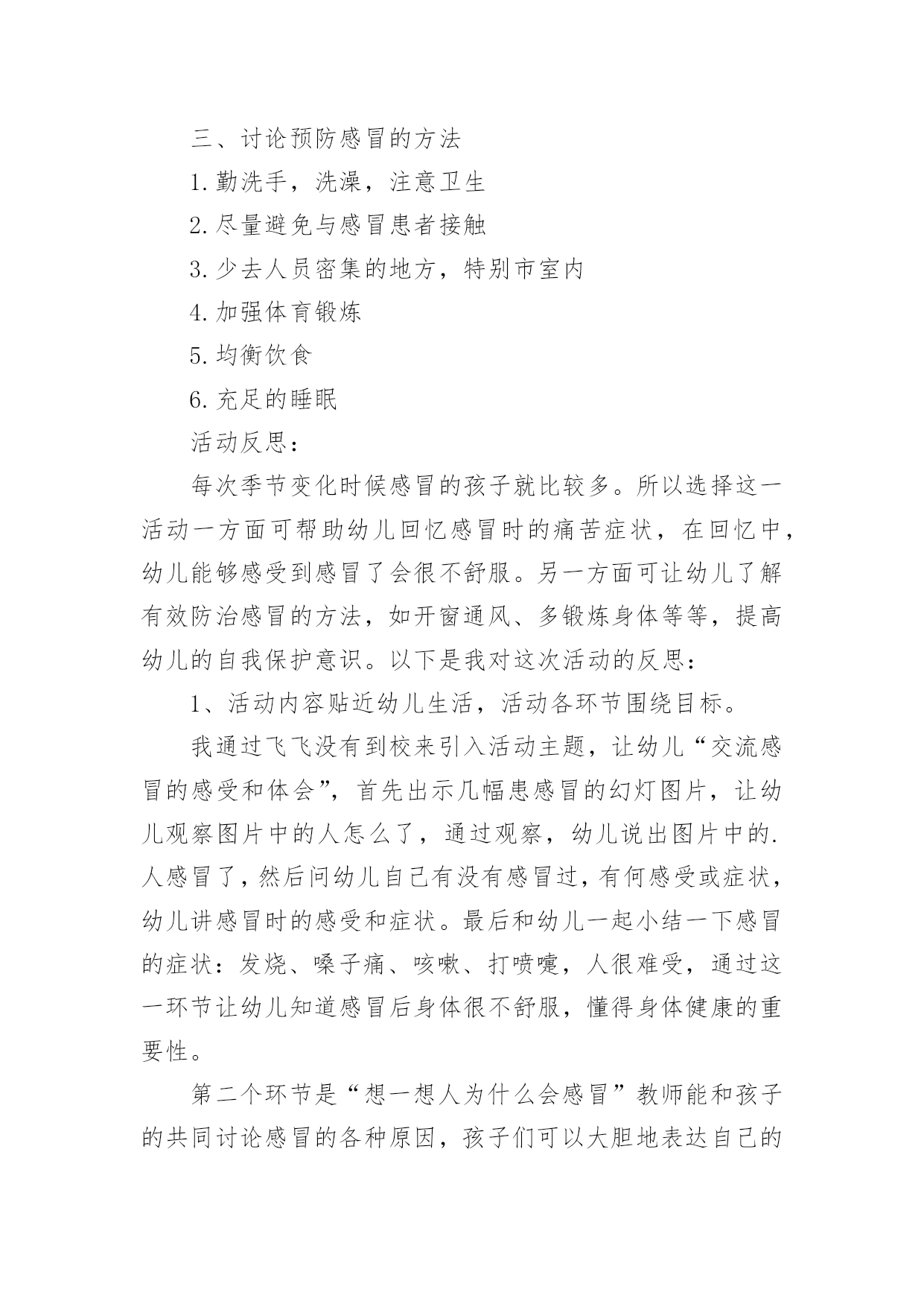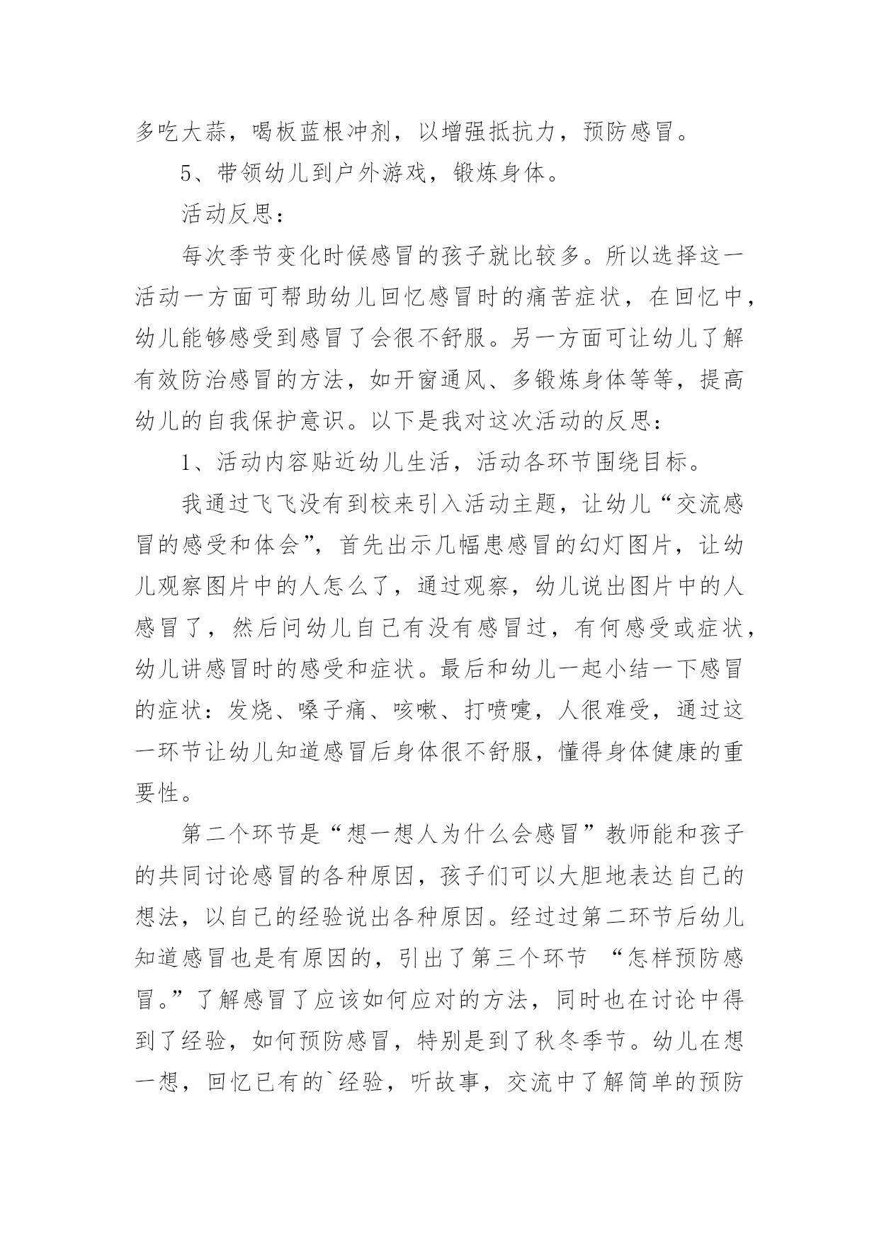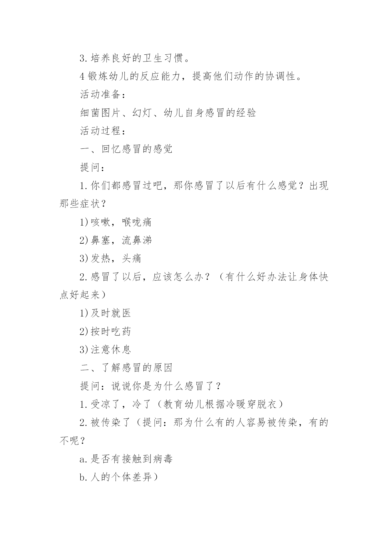 大班健康《预防感冒》教案作为一名人民教师,通常会被要求编写教案,编写教案有利于我们弄通教材内容,进而选择科学、恰当的教学方法。那么教案应该怎么写才合适呢?以下是小编为大家收集的大班健康《预防感冒》教案,欢迎大家借鉴与参考,希望对大家有所帮助。大班健康《预防感冒》教案1活动目标:1、了解简单的预防感冒知识。2、学习擦鼻涕的正确方法。3、回忆感冒给自己带来的不愉快的感受,体验身体健康的重要性。4、初步了解健康的小常识。5、了解多运动对身体有好处。活动准备:1、小白兔、小刺猬、小青蛙手偶或图片各一。2、动听优美的背景音乐。3、让孩子回家和爸爸妈妈回忆以前感冒时候去医院打针、吃药的情景。活动过程:1、幼儿随音乐欣赏童话故事《感冒的快乐小兔》1)孩子们,你们知道这童话故事的名字叫什么吗?小兔生什么病了?出现了什么症状啊?2)小青蛙、小刺猬去看他的时候,小白兔为什么不见他们。3)朋友们用什么方法关心小兔的。2、通过谈话,归纳感冒的主要症状。1)你感冒过吗?你感冒出现了哪些症状?有什么感觉?2)感冒了你们会打喷嚏、流鼻涕、鼻子不通,喉咙干痛、头痛等,身体非常不舒服。3、师生共同讨论感冒的原因。1)人为什么会感冒?2)感冒了怎么办?(引导幼儿谈一谈感冒时,爸爸妈妈是怎么照顾自己的。)3)有鼻涕怎么办啊?(教师教幼儿正确的搽鼻涕的方法:用干净的餐巾纸或是手帕捏住一只鼻孔,擤鼻涕,在捏住另一只鼻孔擤鼻涕。)4)师生小结:当我们受凉或是身体的抵抗力下降时,就会流鼻涕、咳嗽等,感冒时要及时看医生,按时吃药,多喝开水,注意休息等。4、幼儿简单了解预防感冒的知识。1)感冒时身体舒服吗?我们怎么预感冒呢?2)幼儿相互交流经验。3)幼儿讲述预防感冒的方法和措施,教师记录在表格上。4)师生共同小结:经常锻炼身体可以预防感冒,在天气变冷或变热时要及时增减衣服,不要和生病人接触,还可以多吃大蒜,喝板蓝根冲剂,以增强抵抗力,预防感冒。5、带领幼儿到户外游戏,锻炼身体。活动反思:每次季节变化时候感冒的孩子就比较多。所以选择这一活动一方面可帮助幼儿回忆感冒时的痛苦症状,在回忆中,幼儿能够感受到感冒了会很不舒服。另一方面可让幼儿了解有效防治感冒的方法,如开窗通风、多锻炼身体等等,提高幼儿的自我保护意识。以下是我对这次活动的反思:1、活动内容贴近幼儿生活,活动各环节围绕目标。我通过飞飞没有到校来引入活动主题,让幼儿“交流感冒的感受和体会”,首先出示几幅患感冒的幻灯图片,让幼儿观察图片中的人怎么了,通过观察,幼儿说出图片中的人感冒了,然后问幼儿自己有没有感冒过,有何感受或症状,幼儿讲感冒时的感受和症状。最后和幼儿一起小结一下感冒的症状:发烧、嗓子痛、咳嗽、打喷嚏,人很难受,通过这一环节让幼儿知道感冒后身体很不舒服,懂得身体健康的重要性。第二个环节是“想一想人为什么会感冒”教师能和孩子的共同讨论感冒的各种原因,孩子们可以大胆地表达自己的想法,以自己的经验说出各种原因。经过过第二环节后幼儿知道感冒也是有原因的,引出了第三个环节“怎样预防感冒。”了解感冒了应该如何应对的方法,同时也在讨论中得到了经验,如何预防感冒,特别是到了秋冬季节。幼儿在想一想,回忆已有的`经验,听故事,交流中了解简单的预防感冒的知识,增强了自我保护的意识。因为选择的内容都是幼儿熟悉的,所以幼儿能够有话说,有内容讲,在活动中能积极举手发言,体会积极参与活动的乐趣。2、活动中能对幼儿的回答作适宜的回应。虽然幼儿对感冒有了解,但幼儿的回答是较零乱的,在活动中我对幼儿的回答作出相应的回应,帮助幼儿梳理、概括相关经验,而不仅仅对幼儿的回答作简单重复叙述。不足方面:1、在活动中,我没有注意一个问题就是:在请幼儿回答时会走过去,来回走动的次数太多。这会分散幼儿的注意力,在今后的活动中会注意这一问题。2、作为这个活动的延伸,让幼儿在运动中锻炼身体,增强抵抗力。选择的音乐和律动都是幼儿熟悉的,当音乐开始时,幼儿都开始在椅子上按捺不住扭动身体,我没能及时让幼儿跟着音乐动起来,导致幼儿对于律动中有些意犹未尽。如果能及时让幼儿跟着音乐动起来,幼儿在活动中能获得更多的快乐。在这个活动中,我们渗透了情感的教育,幼儿对生病有体会,也能展开讨论说出自己的想法。锻炼了幼儿的口语表达能力。同时,幼儿对锻炼身体的重要性也有了解,经验得到了提升。大班健康《预防感冒》教案2活动设计背景在日常生活中由于各种原因会很容易让我们患感冒,那如何才能做好预防好感冒呢?通过挂图讲述让幼儿懂得预防感冒的小常识。活动目标1.使幼儿了解感冒的起因及人体的影响。2.让幼儿知道预防感冒的小常识。教学重点、难点让幼儿知道预防感冒的'小常识,提高幼儿预防感冒的意识,从而更好保护好自己活动准备活动准备:挂图一幅音乐《健康歌》。活动过程:一、引导幼儿观察画面:教师:图中天下雨了