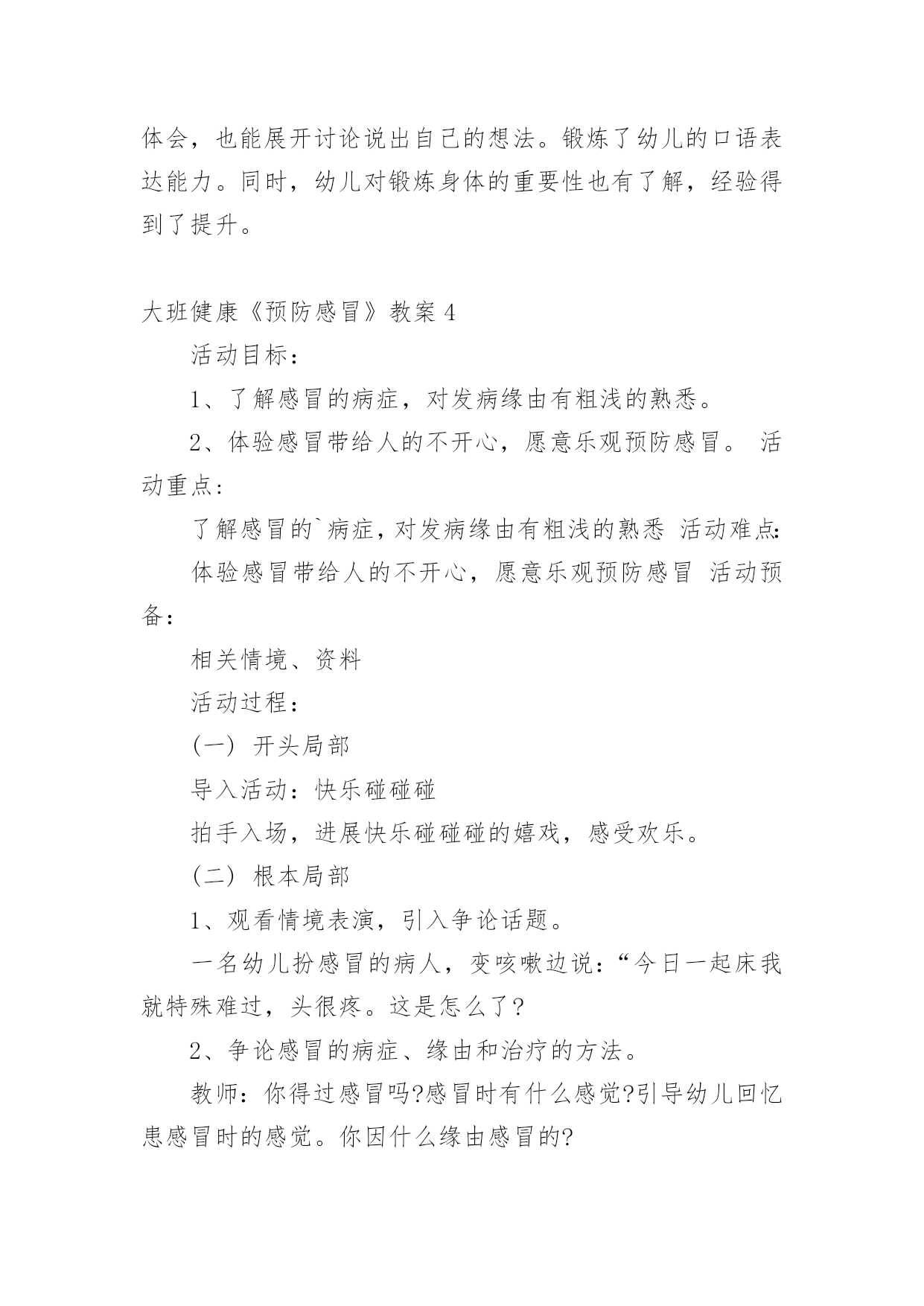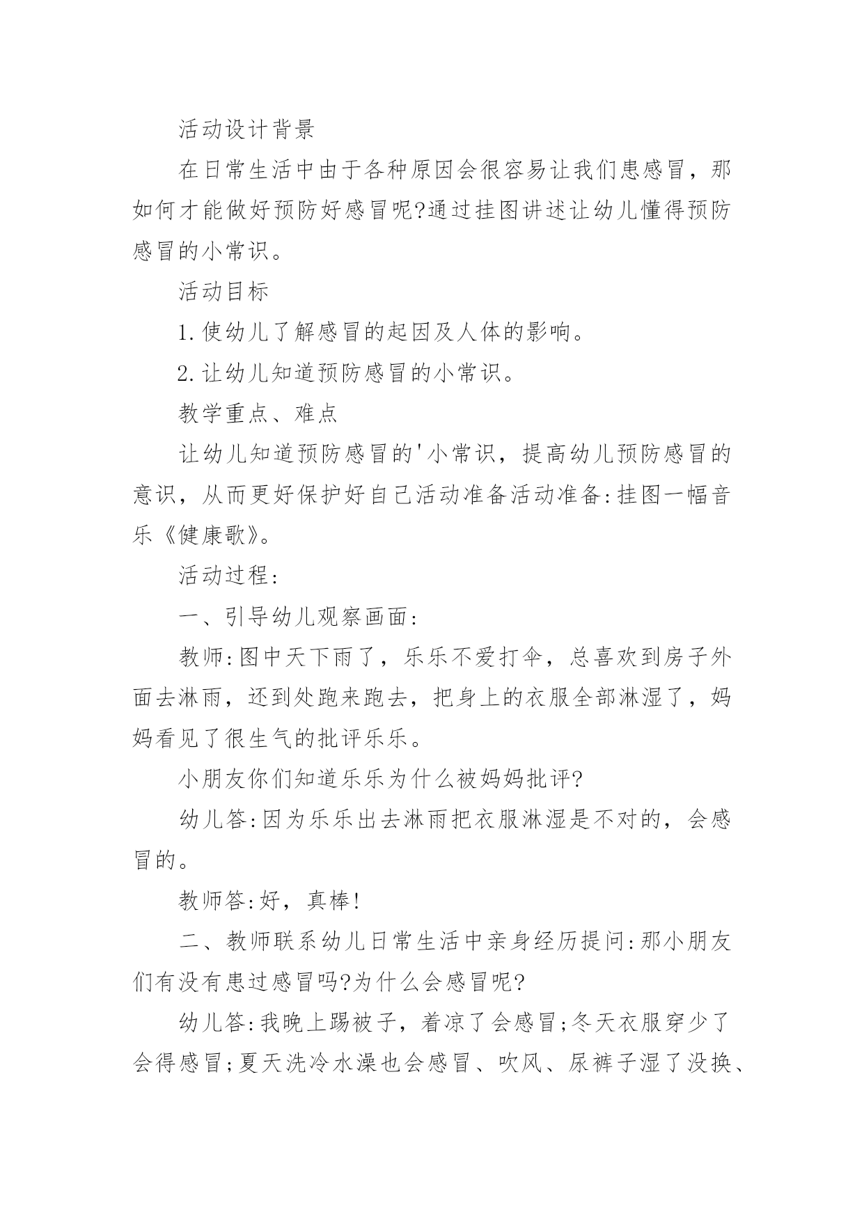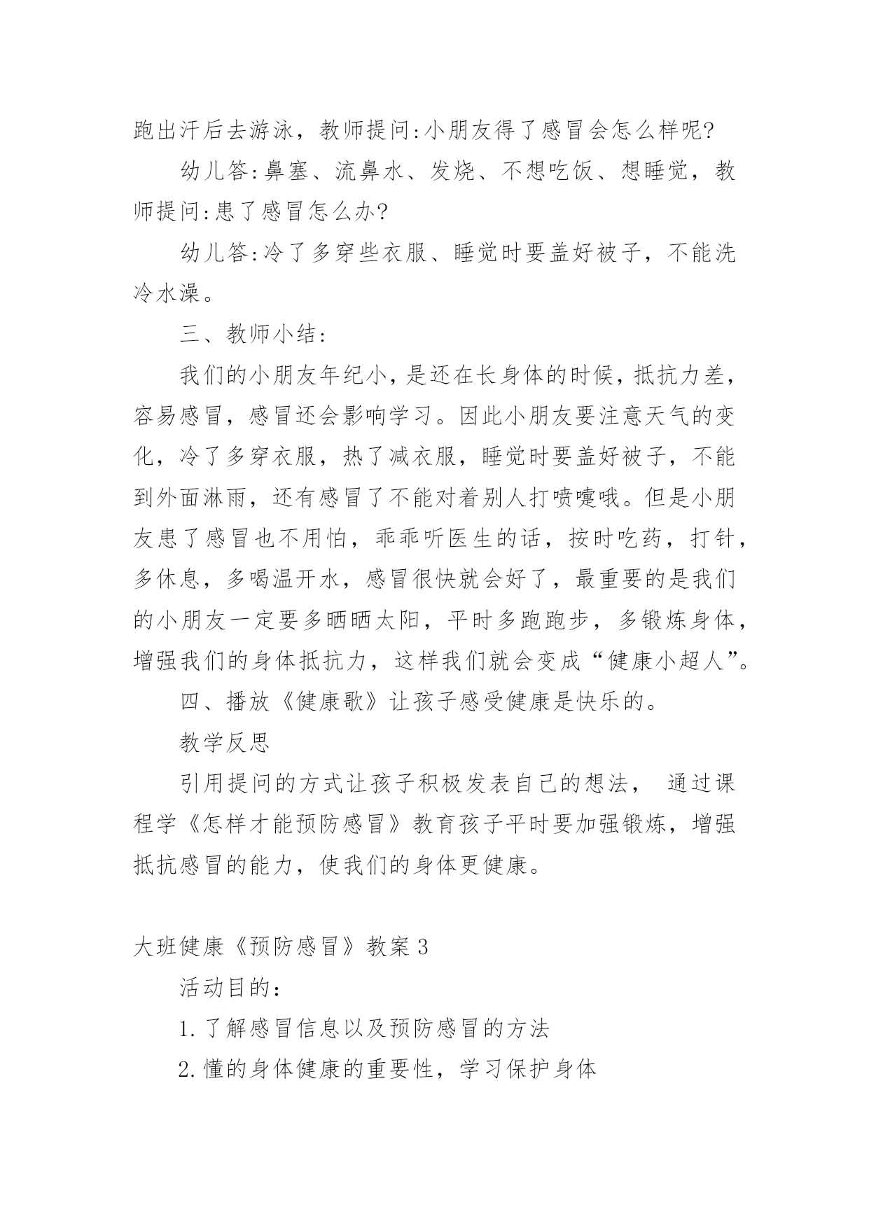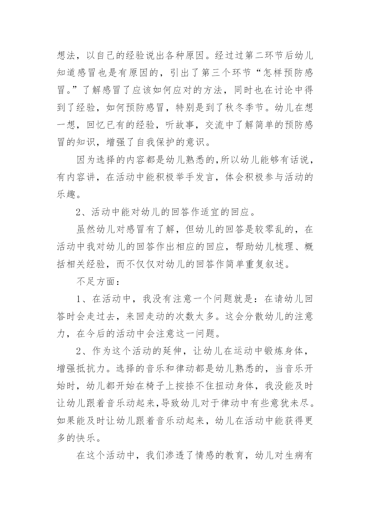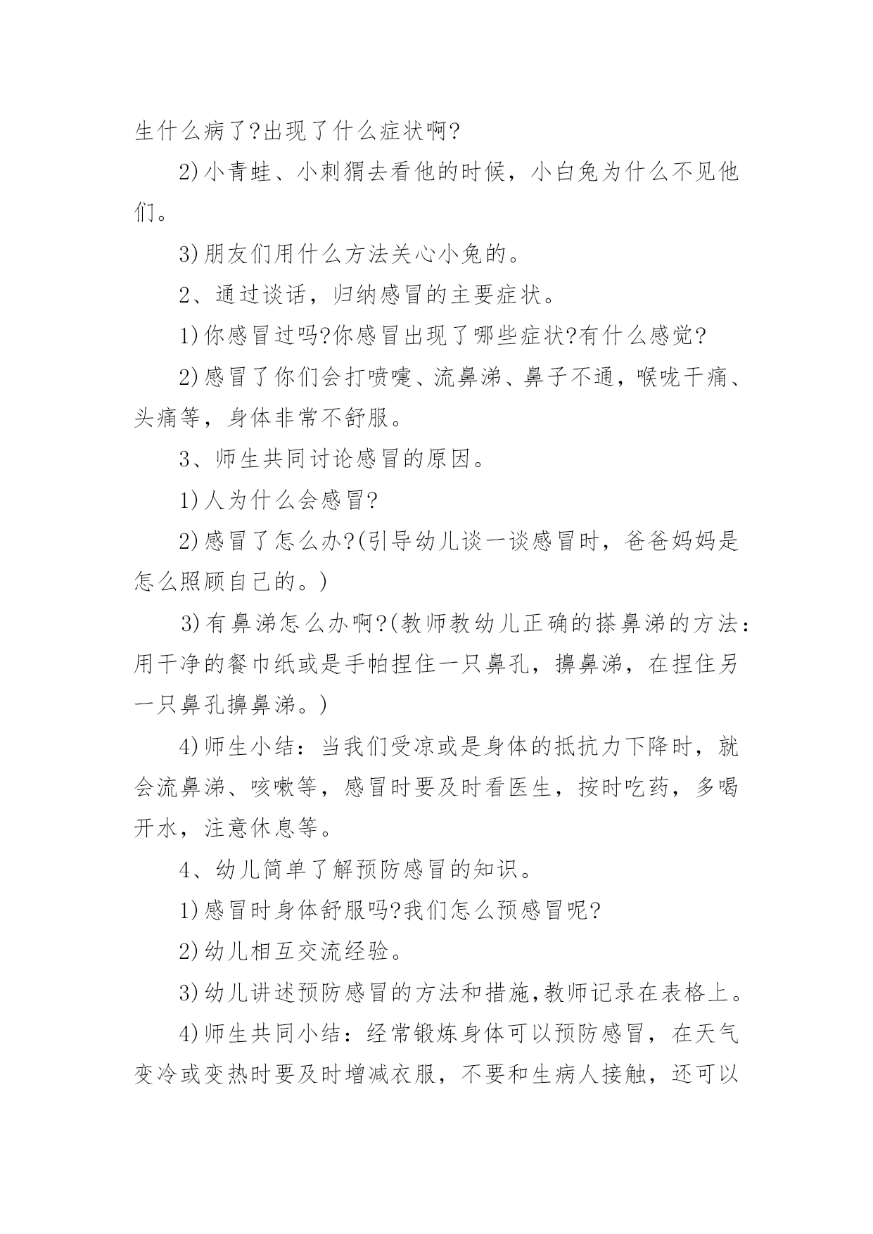 大班健康《预防感冒》教案作为一名人民教师,通常会被要求编写教案,编写教案有利于我们弄通教材内容,进而选择科学、恰当的教学方法。那么教案应该怎么写才合适呢?以下是小编为大家收集的大班健康《预防感冒》教案,欢迎大家借鉴与参考,希望对大家有所帮助。大班健康《预防感冒》教案1活动目标:1、了解简单的预防感冒知识。2、学习擦鼻涕的正确方法。3、回忆感冒给自己带来的不愉快的感受,体验身体健康的重要性。4、初步了解健康的小常识。5、了解多运动对身体有好处。活动准备:1、小白兔、小刺猬、小青蛙手偶或图片各一。2、动听优美的背景音乐。3、让孩子回家和爸爸妈妈回忆以前感冒时候去医院打针、吃药的情景。活动过程:1、幼儿随音乐欣赏童话故事《感冒的快乐小兔》1)孩子们,你们知道这童话故事的名字叫什么吗?小兔生什么病了?出现了什么症状啊?2)小青蛙、小刺猬去看他的时候,小白兔为什么不见他们。3)朋友们用什么方法关心小兔的。2、通过谈话,归纳感冒的主要症状。1)你感冒过吗?你感冒出现了哪些症状?有什么感觉?2)感冒了你们会打喷嚏、流鼻涕、鼻子不通,喉咙干痛、头痛等,身体非常不舒服。3、师生共同讨论感冒的原因。1)人为什么会感冒?2)感冒了怎么办?(引导幼儿谈一谈感冒时,爸爸妈妈是怎么照顾自己的。)3)有鼻涕怎么办啊?(教师教幼儿正确的搽鼻涕的方法:用干净的餐巾纸或是手帕捏住一只鼻孔,擤鼻涕,在捏住另一只鼻孔擤鼻涕。)4)师生小结:当我们受凉或是身体的抵抗力下降时,就会流鼻涕、咳嗽等,感冒时要及时看医生,按时吃药,多喝开水,注意休息等。4、幼儿简单了解预防感冒的知识。1)感冒时身体舒服吗?我们怎么预感冒呢?2)幼儿相互交流经验。3)幼儿讲述预防感冒的方法和措施,教师记录在表格上。4)师生共同小结:经常锻炼身体可以预防感冒,在天气变冷或变热时要及时增减衣服,不要和生病人接触,还可以多吃大蒜,喝板蓝根冲剂,以增强抵抗力,预防感冒。5、带领幼儿到户外游戏,锻炼身体。活动反思:每次季节变化时候感冒的孩子就比较多。所以选择这一活动一方面可帮助幼儿回忆感冒时的痛苦症状,在回忆中,幼儿能够感受到感冒了会很不舒服。另一方面可让幼儿了解有效防治感冒的方法,如开窗通风、多锻炼身体等等,提高幼儿的自我保护意识。以下是我对这次活动的反思:1、活动内容贴近幼儿生活,活动各环节围绕目标。我通过飞飞没有到校来引入活动主题,让幼儿“交流感冒的感受和体会”,首先出示几幅患感冒的幻灯图片,让幼儿观察图片中的人怎么了,通过观察,幼儿说出图片中的人感冒了,然后问幼儿自己有没有感冒过,有何感受或症状,幼儿讲感冒时的感受和症状。最后和幼儿一起小结一下感冒的症状:发烧、嗓子痛、咳嗽、打喷嚏,人很难受,通过这一环节让幼儿知道感冒后身体很不舒服,懂得身体健康的重要性。第二个环节是“想一想人为什么会感冒”教师能和孩子的共同讨论感冒的各种原因,孩子们可以大胆地表达自己的想法,以自己的经验说出各种原因。经过过第二环节后幼儿知道感冒也是有原因的,引出了第三个环节“怎样预防感冒。”了解感冒了应该如何应对的方法,同时也在讨论中得到了经验,如何预防感冒,特别是到了秋冬季节。幼儿在想一想,回忆已有的`经验,听故事,交流中了解简单的预防感冒的知识,增强了自我保护的意识。因为选择的内容都是幼儿熟悉的,所以幼儿能够有话说,有内容讲,在活动中能积极举手发言,体会积极参与活动的乐趣。2、活动中能对幼儿的回答作适宜的回应。虽然幼儿对感冒有了解,但幼儿的回答是较零乱的,在活动中我对幼儿的回答作出相应的回应,帮助幼儿梳理、概括相关经验,而不仅仅对幼儿的回答作简单重复叙述。不足方面:1、在活动中,我没有注意一个问题就是:在请幼儿回答时会走过去,来回走动的次数太多。这会分散幼儿的注意力,在今后的活动中会注意这一问题。2、作为这个活动的延伸,让幼儿在运动中锻炼身体,增强抵抗力。选择的音乐和律动都是幼儿熟悉的,当音乐开始时,幼儿都开始在椅子上按捺不住扭动身体,我没能及时让幼儿跟着音乐动起来,导致幼儿对于律动中有些意犹未尽。如果能及时让幼儿跟着音乐动起来,幼儿在活动中能获得更多的快乐。在这个活动中,我们渗透了情感的教育,幼儿对生病有体会,也能展开讨论说出自己的想法。锻炼了幼儿的口语表达能力。同时,幼儿对锻炼身体的重要性也有了解,经验得到了提升。大班健康《预防感冒》教案2活动设计背景在日常生活中由于各种原因会很容易让我们患感冒,那如何才能做好预防好感冒呢?通过挂图讲述让幼儿懂得预防感冒的小常识。活动目标1.使幼儿了解感冒的起因及人体的影响。2.让幼儿知道预防感冒的小常识。教学重点、难点让幼儿知道预防感冒的'小常识,提高幼儿预防感冒的意识,从而更好保护好自己活动准备活动准备:挂图一幅音乐《健康歌》。活动过程:一、引导幼儿观察画面:教师:图中天下雨了