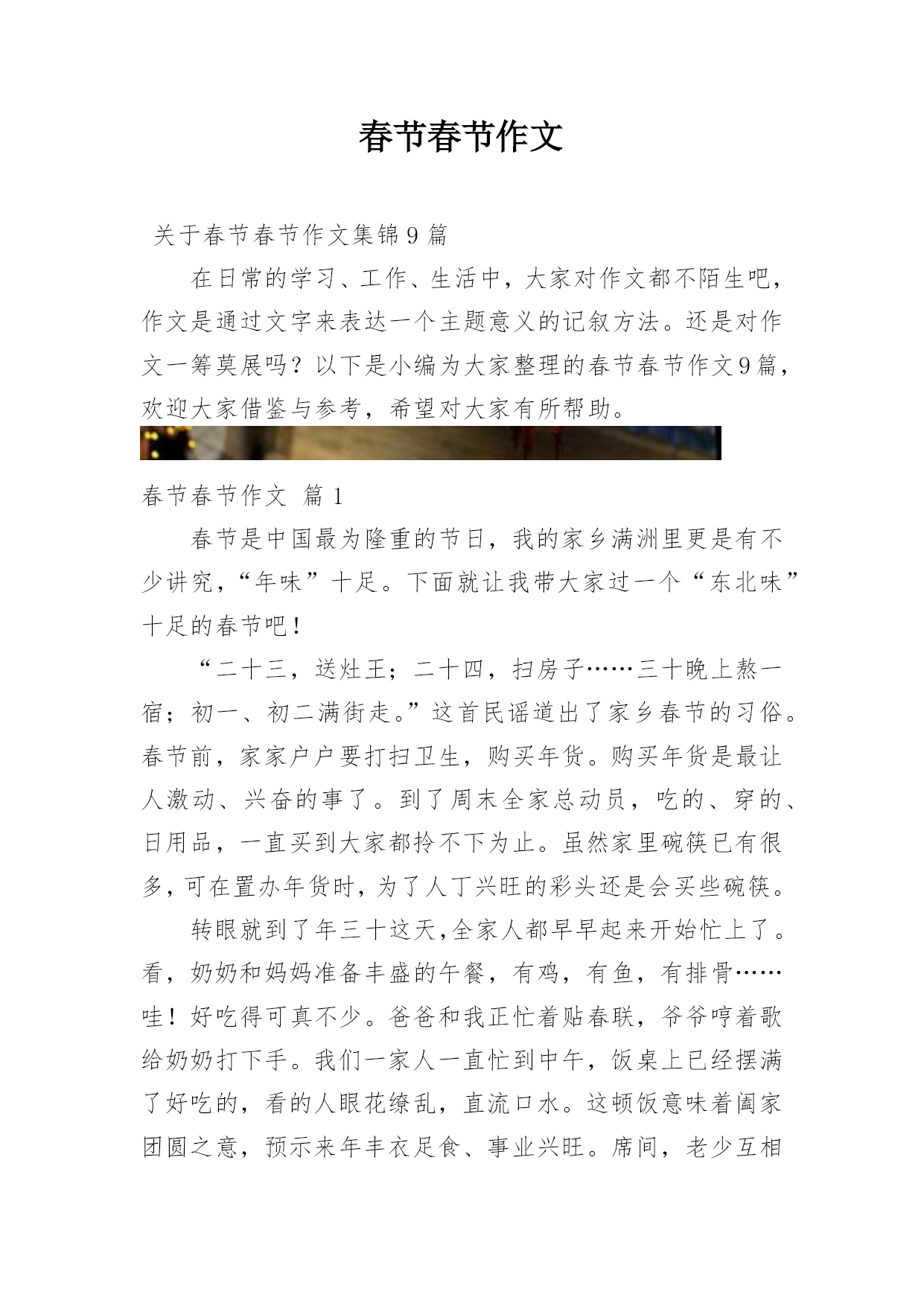 春节春节作文关于春节春节作文集锦9篇在日常的学习、工作、生活中,大家对作文都不陌生吧,作文是通过文字来表达一个主题意义的记叙方法。还是对作文一筹莫展吗?以下是小编为大家整理的春节春节作文9篇,欢迎大家借鉴与参考,希望对大家有所帮助。春节春节作文篇1春节是中国最为隆重的节日,我的家乡满洲里更是有不少讲究,“年味”十足。下面就让我带大家过一个“东北味”十足的春节吧!“二十三,送灶王;二十四,扫房子……三十晚上熬一宿;初一、初二满街走。”这首民谣道出了家乡春节的习俗。春节前,家家户户要打扫卫生,购买年货。购买年