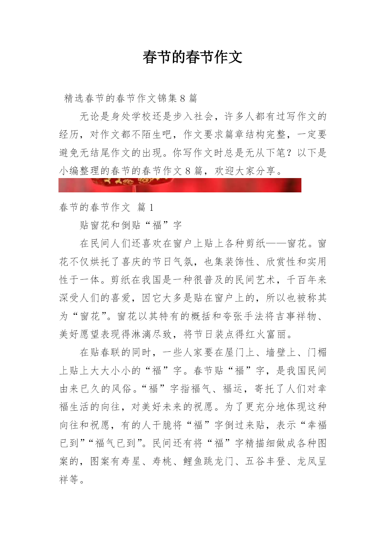 春节的春节作文精选春节的春节作文锦集8篇无论是身处学校还是步入社会,许多人都有过写作文的经历,对作文都不陌生吧,作文要求篇章结构完整,一定要避免无结尾作文的出现。你写作文时总是无从下笔?以下是小编整理的春节的春节作文8篇,欢迎大家分享。春节的春节作文篇1贴窗花和倒贴“福”字在民间人们还喜欢在窗户上贴上各种剪纸——窗花。窗花不仅烘托了喜庆的节日气氛,也集装饰性、欣赏性和实用性于一体。剪纸在我国是一种很普及的民间艺术,千百年来深受人们的喜爱,因它大多是贴在窗户上的,所以也被称其为“窗花”。窗花以其特有的概括和