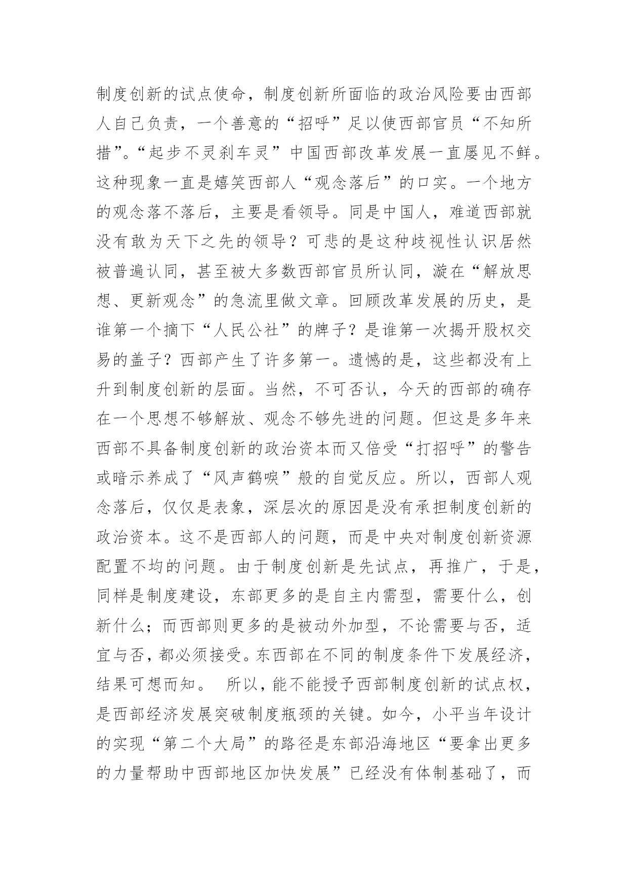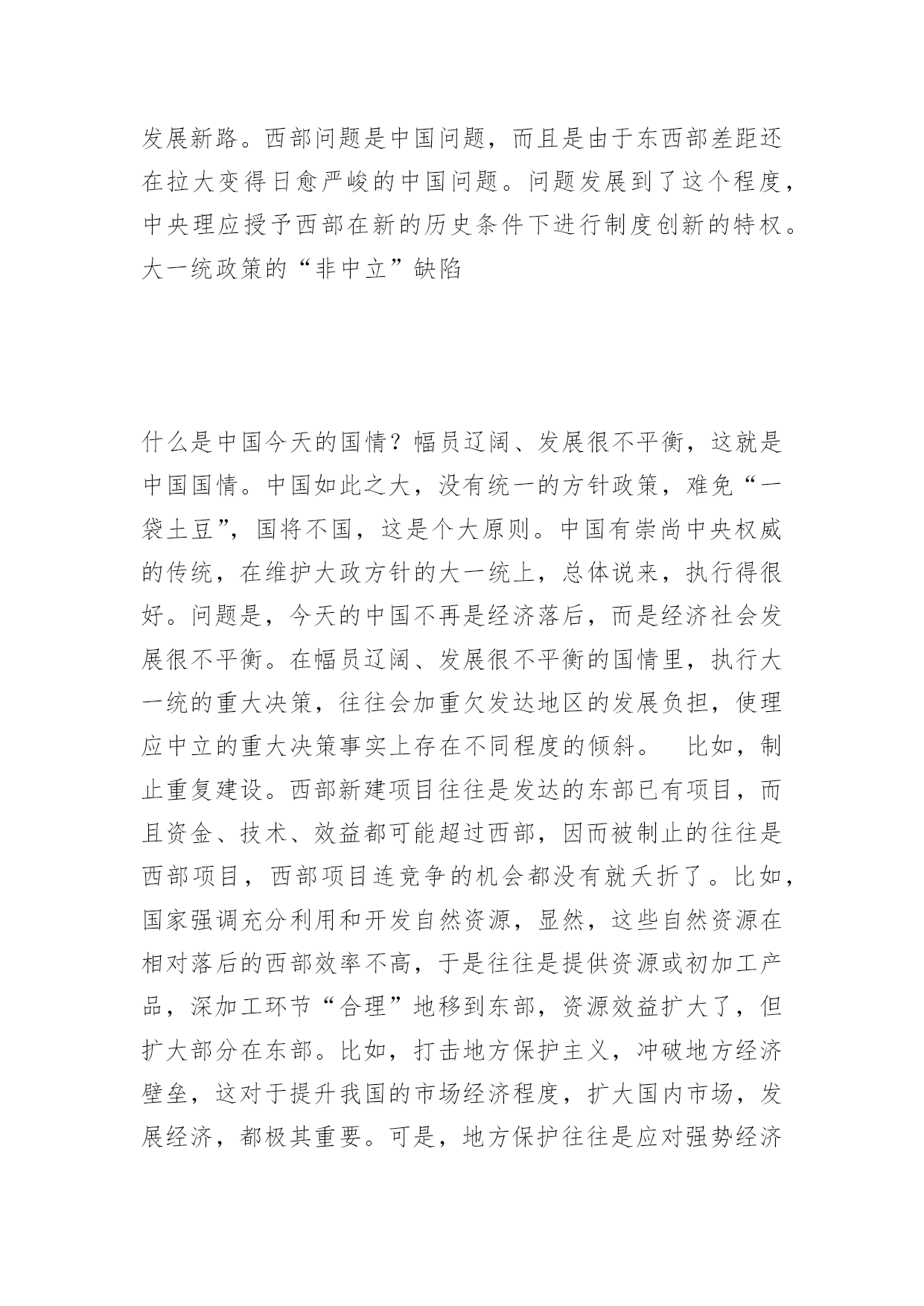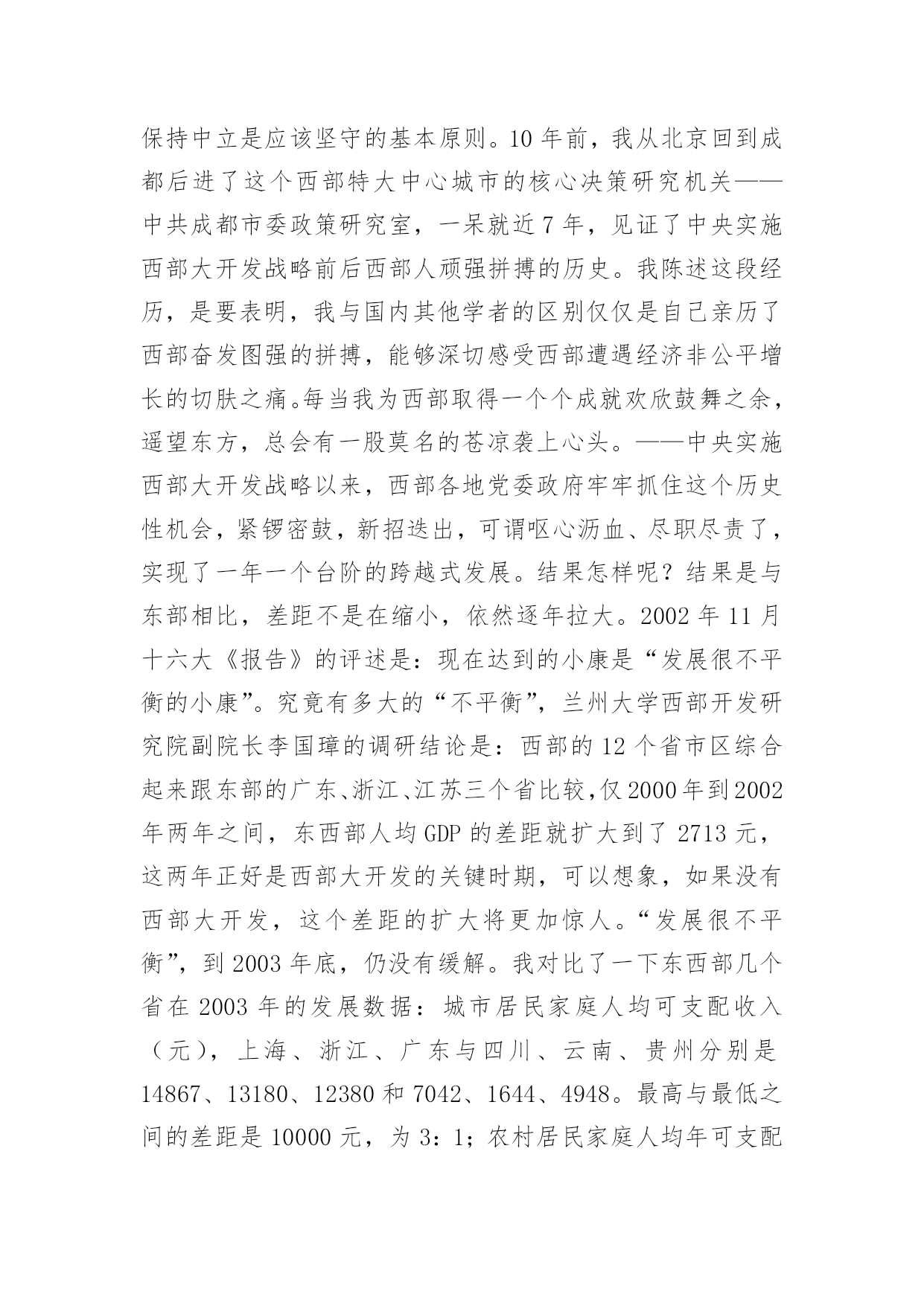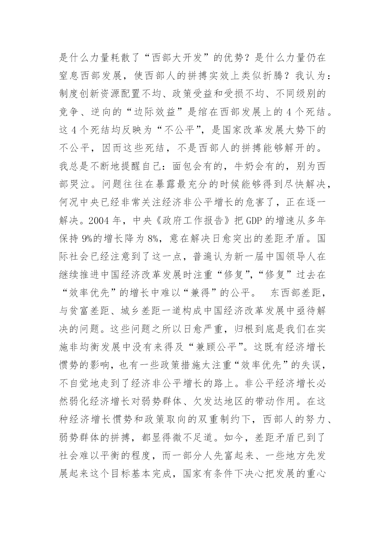 在非公平经济增长中折腾的西部提要没有制度创新试点权,使西部一次次坐失经济突破性发展的历史性机会,尝食南橘北枳的苦涩;大一统政策,使“发展很不平衡”的西部没有充分享受政策中立所带来的相应的活力;“市场一体化”把西部逼上了与东部短兵相遇的“拳击场”,以40公斤级的拳击实力迎战80公斤级的东部对手,仅有屡败屡战的悲壮;一个个“逆向边际效益”、“溢出效益”重大项目,总是难以得到合理的政策性补偿。这些,都是绾住西部发展的死结,在更大程度上冲淡了“西部大开发”各项重大举措所带来的发展活力,使西部人所有的努力都不过是“经济非公平增长”这个大趋势下的折腾。这些由于国家经济政策和经济走势给西部发展绾上的死结,不是西部的努力可以解开的。实施西部大开发战略,仅仅是实现邓小平构想的“第二个大局”中的重要一环。5年的历史已经说明,这远远不够,在继续实施西部大开发的同时,还需要把西部发展纳入整个国家经济社会改革发展的每一项重大决策中来考虑,需要从实现“第一个大局”的政策取向(非公平经济增长方式)向实现“第二个大局”的政策取向(公平的经济增长方式)转变。只有这个转变完成,绾在西部发展上的死结才有解开的现实条件。西部问题,仍是中国问题这些年来,我常常在反问自己:我是一个西部人,当我倾注如此之多的心血审视西部经济改革发展中遭遇的种种不公平,是不是我带有西部人的偏见?作为一位学者,保持中立是应该坚守的基本原则。10年前,我从北京回到成都后进了这个西部特大中心城市的核心决策研究机关——中共成都市委政策研究室,一呆就近7年,见证了中央实施西部大开发战略前后西部人顽强拼搏的历史。我陈述这段经历,是要表明,我与国内其他学者的区别仅仅是自己亲历了西部奋发图强的拼搏,能够深切感受西部遭遇经济非公平增长的切肤之痛。每当我为西部取得一个个成就欢欣鼓舞之余,遥望东方,总会有一股莫名的苍凉袭上心头。——中央实施西部大开发战略以来,西部各地党委政府牢牢抓住这个历史性机会,紧锣密鼓,新招迭出,可谓呕心沥血、尽职尽责了,实现了一年一个台阶的跨越式发展。结果怎样呢?结果是与东部相比,差距不是在缩小,依然逐年拉大。2002年11月十六大《报告》的评述是:现在达到的小康是“发展很不平衡的小康”。究竟有多大的“不平衡”,兰州大学西部开发研究院副院长李国璋的调研结论是:西部的12个省市区综合起来跟东部的广东、浙江、江苏三个省比较,仅2000年到2002年两年之间,东西部人均GDP的差距就扩大到了2713元,这两年正好是西部大开发的关键时期,可以想象,如果没有西部大开发,这个差距的扩大将更加惊人。“发展很不平衡”,到2003年底,仍没有缓解。我对比了一下东西部几个省在2003年的发展数据:城市居民家庭人均可支配收入(元),上海、浙江、广东与四川、云南、贵州分别是14867、13180、12380和7042、1644、4948。最高与最低之间的差距是10000元,为3:1;农村居民家庭人均年可支配收入(元),上海、浙江、广东与四川、云南、贵州分别是6658、5431、4055、2230、1697、1565。最高与最低之间的差距是5000元,为4:1。我们不得不正视这一痛苦的事实:5年来实施西部大开发战略并没有从根本上扭转西部落后的态势。全国有6000万绝对贫困人口。最新统计(2004年资料)显示,绝对贫困人口大部分分布在西部,仅西部云贵川三省就有3000万。在最穷的地方,一家人的家产合计不及100元。这当然是最极端的事例。尽管如此,它仍为我们反观25年的改革发展之后东西部的严重差距提供了需要警醒的参照。——我坚信:西部问题仍然是中国问题。西部对中国经济发展的负面影响,并非在很远的将来才凸显出来,事实上在今天就已经非常明显。在相当长一段时间里,国家经济增长主要是通过投资来挪动,消费增速缓慢。2003年我国消费率仅55.4%,是1978年以来25年里的最低点。表明我国经济增长是在缺乏消费支撑的高位上运行,经济形势相当严峻。为什么呀?贫富差距、城乡差距和区域差距是导致消费率过低的重要原因。而西部,是贫富差距、城乡差距、区域差距最集中、最突出的地方。所以,西部增长问题,与低收入群体问题、“三农”问题一样,都是涉及我国全面小康社会的奋斗目标和国家经济安全、国家社会稳定的重大问题。多年困绕中国经济改革发展的突出问题就是发展不平衡问题。贫富差距、城乡差距、东西部差距,不是随着中国经济的增长而缩小,而是随着中国经济的增长在加大,症结就是我们在经济增长中丢失了公平。三大差距日愈扩大使中国经济在“地震多发地带”驰行,速度越快,风险越大。2003年9月世界银行发表的研究报告主题是《中国:推动公平的经济增长》,指出中国经济改革发展面临日益严重的受益差距扩大的挑战,由于非公平使得经济增长对减少贫困的作用在弱化,因而就中国经