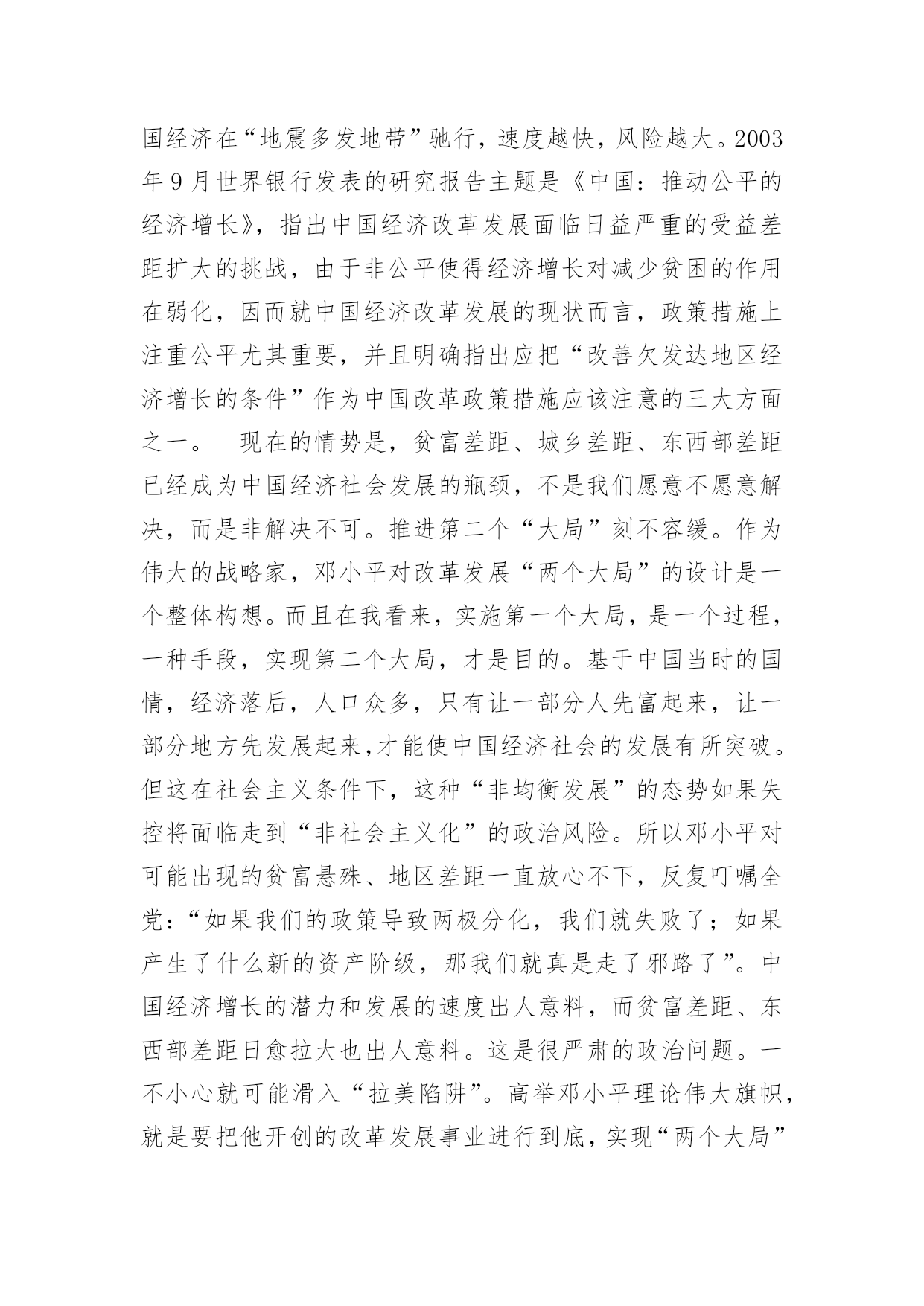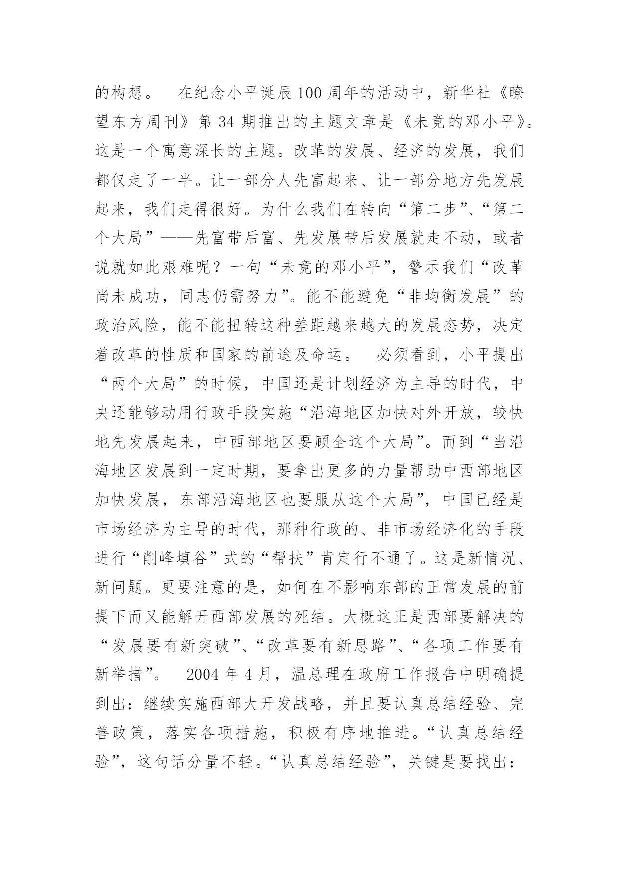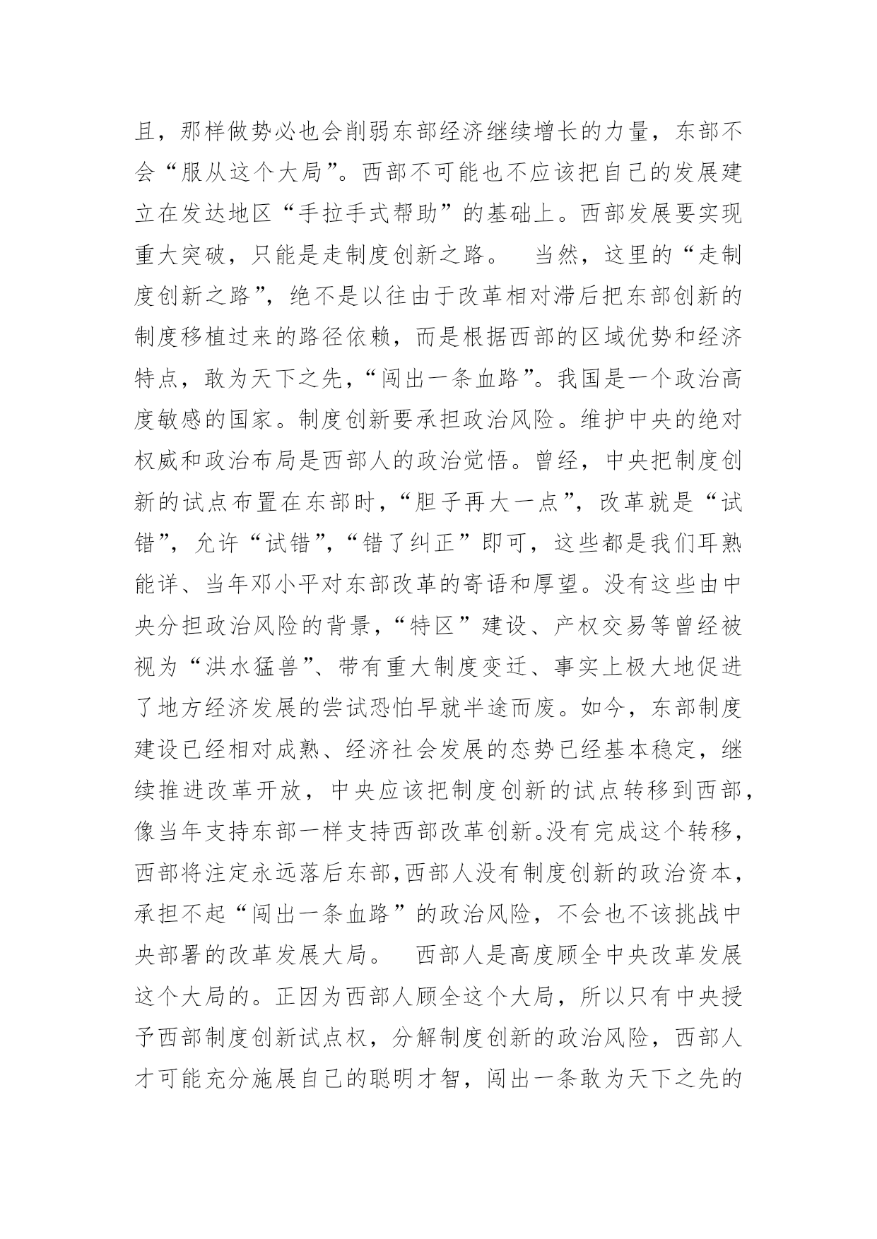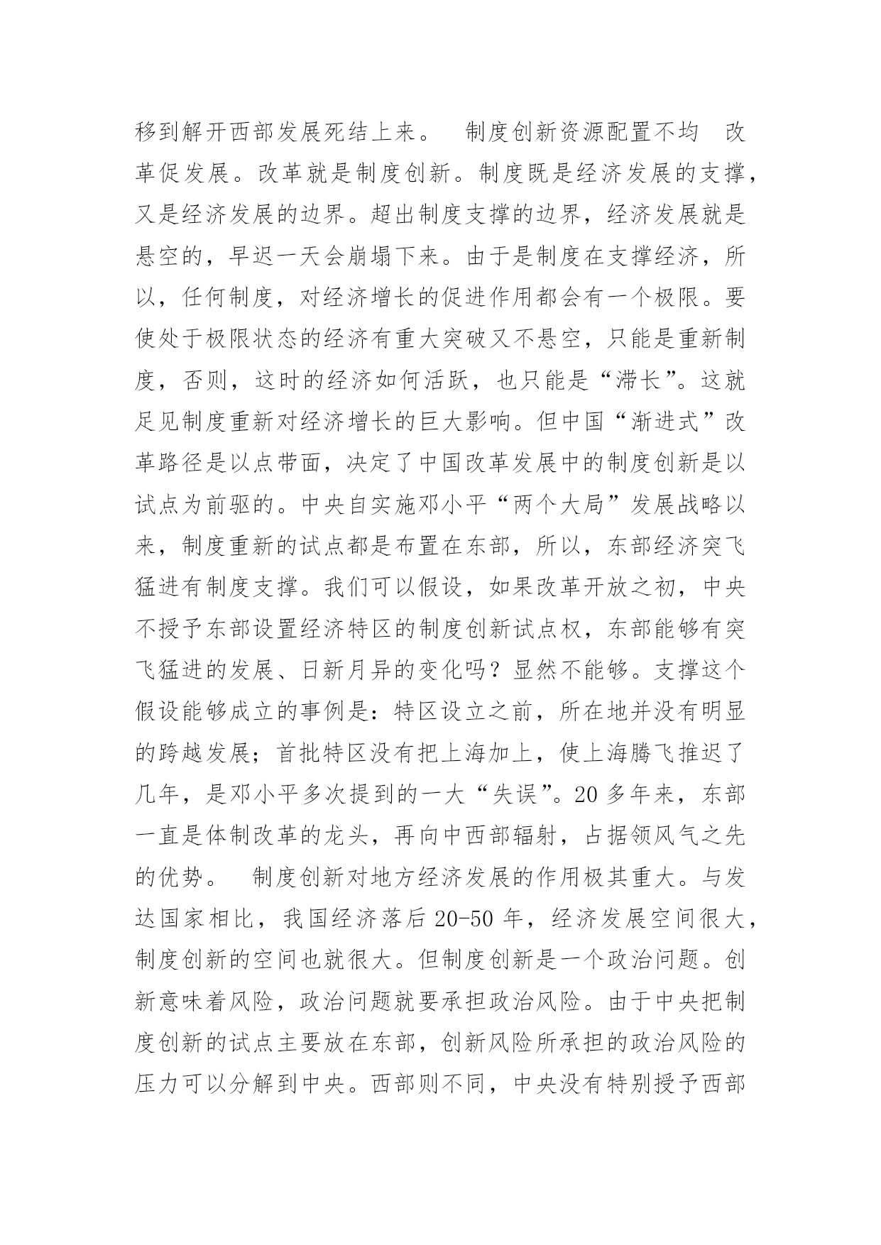 在非公平经济增长中折腾的西部提要没有制度创新试点权,使西部一次次坐失经济突破性发展的历史性机会,尝食南橘北枳的苦涩;大一统政策,使“发展很不平衡”的西部没有充分享受政策中立所带来的相应的活力;“市场一体化”把西部逼上了与东部短兵相遇的“拳击场”,以40公斤级的拳击实力迎战80公斤级的东部对手,仅有屡败屡战的悲壮;一个个“逆向边际效益”、“溢出效益”重大项目,总是难以得到合理的政策性补偿。这些,都是绾住西部发展的死结,在更大程度上冲淡了“西部大开发”各项重大举措所带来的发展活力,使西部人所有的努力都不过是“经济非公平增长”这个大趋势下的折腾。这些由于国家经济政策和经济走势给西部发展绾上的死结,不是西部的努力可以解开的。实施西部大开发战略,仅仅是实现邓小平构想的“第二个大局”中的重要一环。5年的历史已经说明,这远远不够,在继续实施西部大开发的同时,还需要把西部发展纳入整个国家经济社会改革发展的每一项重大决策中来考虑,需要从实现“第一个大局”的政策取向(非公平经济增长方式)向实现“第二个大局”的政策取向(公平的经济增长方式)转变。只有这个转变完成,绾在西部发展上的死结才有解开的现实条件。西部问题,仍是中国问题这些年来,我常常在反问自己:我是一个西部人,当我倾注如此之多的心血审视西部经济改革发展中遭遇的种种不公平,是不是我带有西部人的偏见?作为一位学者,保持中立是应该坚守的基本原则。10年前,我从北京回到成都后进了这个西部特大中心城市的核心决策研究机关——中共成都市委政策研究室,一呆就近7年,见证了中央实施西部大开发战略前后西部人顽强拼搏的历史。我陈述这段经历,是要表明,我与国内其他学者的区别仅仅是自己亲历了西部奋发图强的拼搏,能够深切感受西部遭遇经济非公平增长的切肤之痛。每当我为西部取得一个个成就欢欣鼓舞之余,遥望东方,总会有一股莫名的苍凉袭上心头。——中央实施西部大开发战略以来,西部各地党委政府牢牢抓住这个历史性机会,紧锣密鼓,新招迭出,可谓呕心沥血、尽职尽责了,实现了一年一个台阶的跨越式发展。结果怎样呢?结果是与东部相比,差距不是在缩小,依然逐年拉大。2002年11月十六大《报告》的评述是:现在达到的小康是“发展很不平衡的小康”。究竟有多大的“不平衡”,兰州大学西部开发研究院副院长李国璋的调研结论是:西部的12个省市区综合起来跟东部的广东、浙江、江苏三个省比较,仅2000年到2002年两年之间,东西部人均GDP的差距就扩大到了2713元,这两年正好是西部大开发的关键时期,可以想象,如果没有西部大开发,这个差距的扩大将更加惊人。“发展很不平衡”,到2003年底,仍没有缓解。我对比了一下东西部几个省在2003年的发展数据:城市居民家庭人均可支配收入(元),上海、浙江、广东与四川、云南、贵州分别是14867、13180、12380和7042、1644、4948。最高与最低之间的差距是10000元,为3:1;农村居民家庭人均年可支配收入(元),上海、浙江、广东与四川、云南、贵州分别是6658、5431、4055、2230、1697、1565。最高与最低之间的差距是5000元,为4:1。我们不得不正视这一痛苦的事实:5年来实施西部大开发战略并没有从根本上扭转西部落后的态势。全国有6000万绝对贫困人口。最新统计(2004年资料)显示,绝对贫困人口大部分分布在西部,仅西部云贵川三省就有3000万。在最穷的地方,一家人的家产合计不及100元。这当然是最极端的事例。尽管如此,它仍为我们反观25年的改革发展之后东西部的严重差距提供了需要警醒的参照。——我坚信:西部问题仍然是中国问题。西部对中国经济发展的负面影响,并非在很远的将来才凸显出来,事实上在今天就已经非常明显。在相当长一段时间里,国家经济增长主要是通过投资来挪动,消费增速缓慢。2003年我国消费率仅55.4%,是1978年以来25年里的最低点。表明我国经济增长是在缺乏消费支撑的高位上运行,经济形势相当严峻。为什么呀?贫富差距、城乡差距和区域差距是导致消费率过低的重要原因。而西部,是贫富差距、城乡差距、区域差距最集中、最突出的地方。所以,西部增长问题,与低收入群体问题、“三农”问题一样,都是涉及我国全面小康社会的奋斗目标和国家经济安全、国家社会稳定的重大问题。多年困绕中国经济改革发展的突出问题就是发展不平衡问题。贫富差距、城乡差距、东西部差距,不是随着中国经济的增长而缩小,而是随着中国经济的增长在加大,症结就是我们在经济增长中丢失了公平。三大差距日愈扩大使中国经济在“地震多发地带”驰行,速度越快,风险越大。2003年9月世界银行发表的研究报告主题是《中国:推动公平的经济增长》,指出中国经济改革发展面临日益严重的受益差距扩大的挑战,由于非公平使得经济增长对减少贫困的作用在弱化,因而就中国经