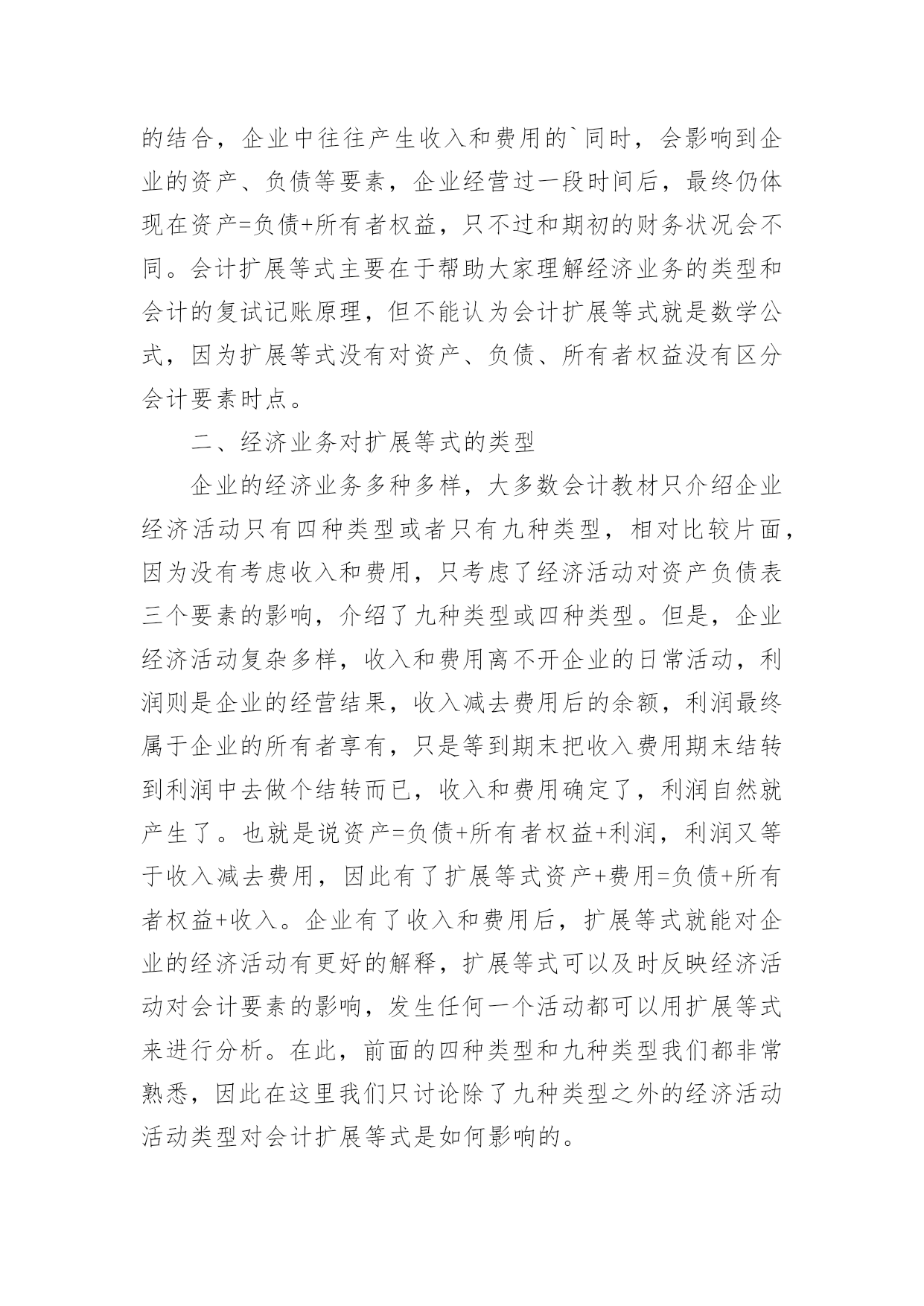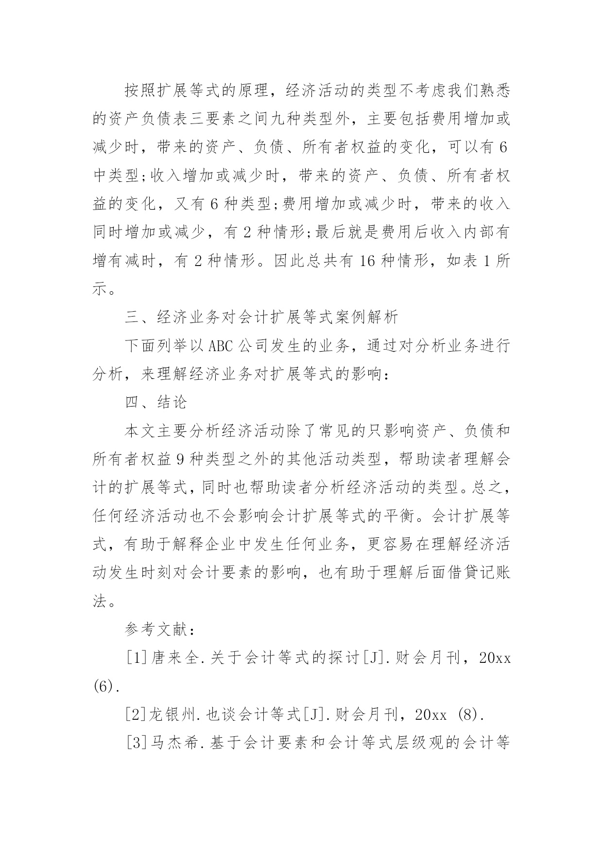 经济业务对会计扩展等式的影响分析经济业务对会计扩展等式的影响分析摘要:根据企业的资金运动情况,我们把企业的资金运动划分为两个侧面,一是资金的来源,二是资金的运用,那么任何时点资金的来源情况等于资金的运用情况,于是就有了资产=权益或资产=负债+所有者权益的会计等式。在初学会计学原理的教材中,往往根据上述两个等式,主要介绍经济业务只有四种类型或九种类型的说法,不涉及收入和费用要素的变动。但在经济活动中,收入和费用时刻都在发生,本文以会计扩展等式资产+费用=负债+所有者权益+收入,来讨论经济活动的类型,帮助初学者更全面地理解经济活动对会计扩展等式的影响。关键词:会计扩展等式;经济业务;影响分析一、会计扩展等式会计等式是对会计对象资金运动很形象也很简化的一种反映,会计等式架起了会计要素的桥梁,也是我们后面复试记账,编制财务报表的理论基础。其中静态等式表现为:资产=负债+所有者权益;动态等式表现为:收入-费用=利润。由于企业资金总是处于运动过程中,为了体现企业资金运动过程对各个会计要素的变化,就有了会计的扩展等式:资产+费用=负债+所有者权益+收入。此等式体现的是静态与动态的结合,企业中往往产生收入和费用的`同时,会影响到企业的资产、负债等要素,企业经营过一段时间后,最终仍体现在资产=负债+所有者权益,只不过和期初的财务状况会不同。会计扩展等式主要在于帮助大家理解经济业务的类型和会计的复试记账原理,但不能认为会计扩展等式就是数学公式,因为扩展等式没有对资产、负债、所有者权益没有区分会计要素时点。二、经济业务对扩展等式的类型企业的经济业务多种多样,大多数会计教材只介绍企业经济活动只有四种类型或者只有九种类型,相对比较片面,因为没有考虑收入和费用,只考虑了经济活动对资产负债表三个要素的影响,介绍了九种类型或四种类型。但是,企业经济活动复杂多样,收入和费用离不开企业的日常活动,利润则是企业的经营结果,收入减去费用后的余额,利润最终属于企业的所有者享有,只是等到期末把收入费用期末结转到利润中去做个结转而已,收入和费用确定了,利润自然就产生了。也就是说资产=负债+所有者权益+利润,利润又等于收入减去费用,因此有了扩展等式资产+费用=负债+所有者权益+收入。企业有了收入和费用后,扩展等式就能对企业的经济活动有更好的解释,扩展等式可以及时反映经济活动对会计要素的影响,发生任何一个活动都可以用扩展等式来进行分析。在此,前面的四种类型和九种类型我们都非常熟悉,因此在这里我们只讨论除了九种类型之外的经济活动活动类型对会计扩展等式是如何影响的。按照扩展等式的原理,经济活动的类型不考虑我们熟悉的资产负债表三要素之间九种类型外,主要包括费用增加或减少时,带来的资产、负债、所有者权益的变化,可以有6中类型;收入增加或减少时,带来的资产、负债、所有者权益的变化,又有6种类型;费用增加或减少时,带来的收入同时增加或减少,有2种情形;最后就是费用后收入内部有增有减时,有2种情形。因此总共有16种情形,如表1所示。三、经济业务对会计扩展等式案例解析下面列举以ABC公司发生的业务,通过对分析业务进行分析,来理解经济业务对扩展等式的影响:四、结论本文主要分析经济活动除了常见的只影响资产、负债和所有者权益9种类型之外的其他活动类型,帮助读者理解会计的扩展等式,同时也帮助读者分析经济活动的类型。总之,任何经济活动也不会影响会计扩展等式的平衡。会计扩展等式,有助于解释企业中发生任何业务,更容易在理解经济活动发生时刻对会计要素的影响,也有助于理解后面借貸记账法。参考文献:[1]唐来全.关于会计等式的探讨[J].财会月刊,20xx(6).[2]龙银州.也谈会计等式[J].财会月刊,20xx(8).[3]马杰希.基于会计要素和会计等式层级观的会计等式简析[J].财会学习,20xx(23).