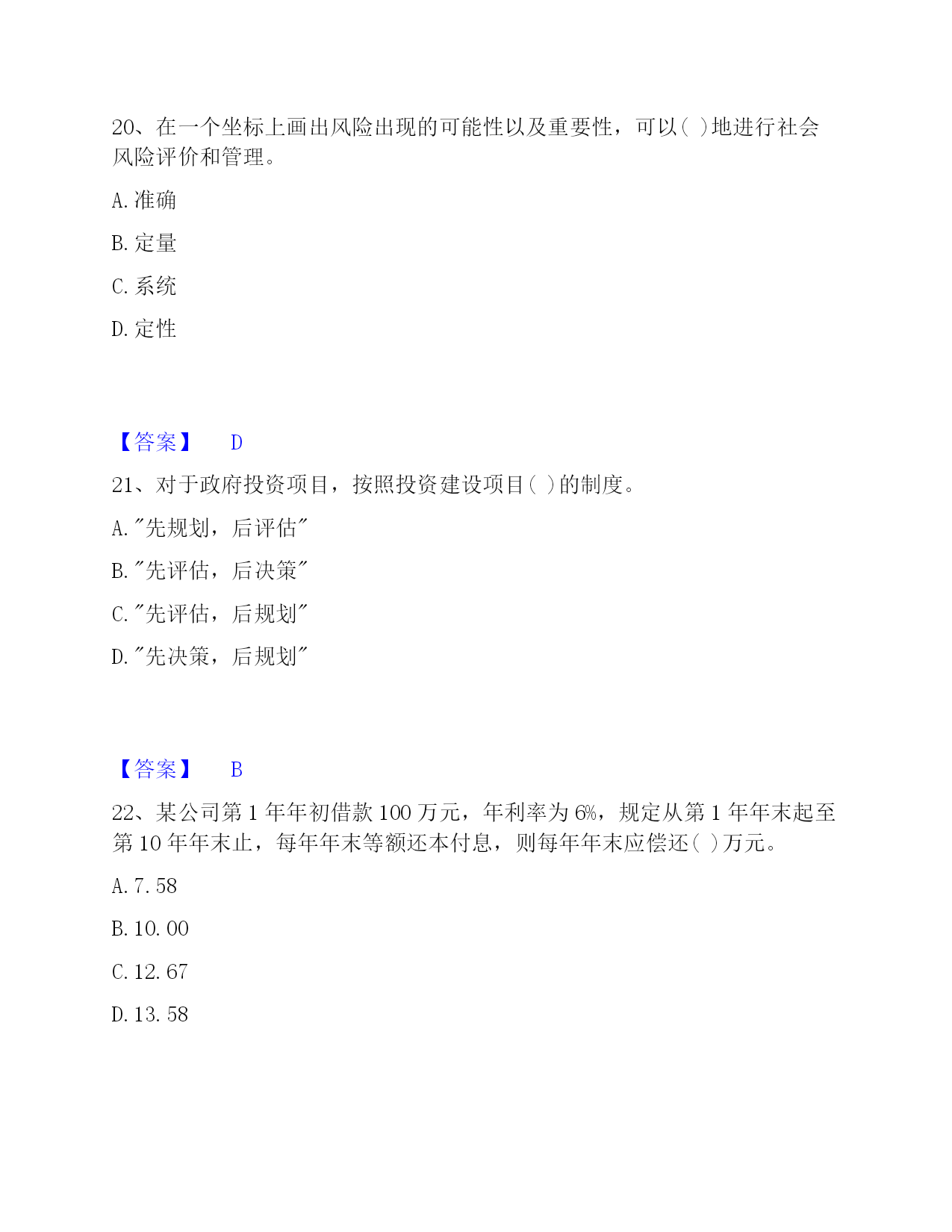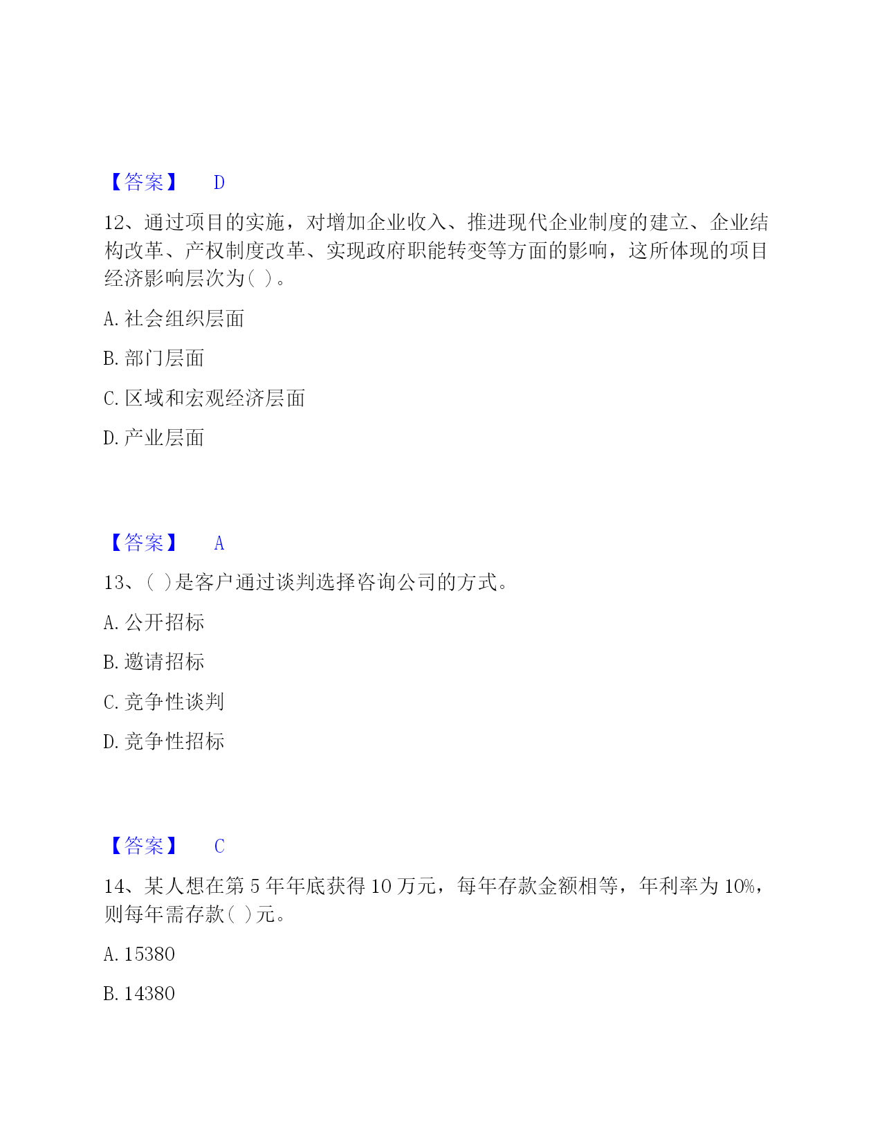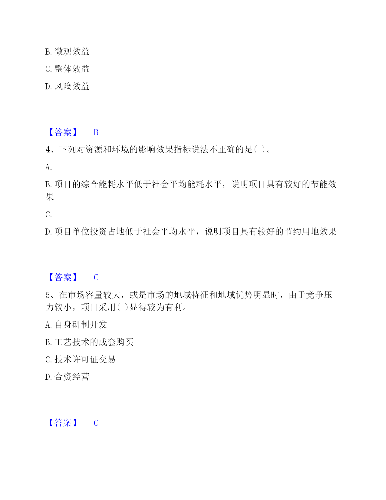 2022-2023年投资项目管理师之投资建设项目决策综合检测试卷A卷含答案单选题(共50题)1、工艺技术方案和工艺流程方案优化选择的()的基本要求是充分发挥投资效益,降低生产成本,以较少资金,获取更大效益。A.先进适用性B.安全可靠性C.经济合理性D.技术来源可得性【答案】C2、以下对建设项目的投资风险分析表达正确的是()。A.盈亏平衡点越低,抗风险能力也越强B.盈亏平衡点越低,抗风险能力也越弱C.不确定性因素的敏感性分析越敏感,项目的风险就越小D.盈亏平衡生产能力利用率越高,抗风险能力也越强【答案】A3、可行性研究一般从行业或企业角度,论证项目建设的必要性、市场前景、技术和经济的可行性,着重项目投资的()。A.宏观效益B.微观效益C.整体效益D.风险效益【答案】B4、下列对资源和环境的影响效果指标说法不正确的是()。A.B.项目的综合能耗水平低于社会平均能耗水平,说明项目具有较好的节能效果C.D.项目单位投资占地低于社会平均水平,说明项目具有较好的节约用地效果【答案】C5、在市场容量较大,或是市场的地域特征和地域优势明显时,由于竞争压力较小,项目采用()显得较为有利。A.自身研制开发B.工艺技术的成套购买C.技术许可证交易D.合资经营【答案】C6、下列选项中,()的取值应根据社会经济运行的实际情况、投资收益水平、资金供求状况、资金机会成本以及国家宏观调控目标取向等因素的综合分析确定,具体取值应执行国家有关规定。A.影子汇率B.社会折现率C.影子汇率换算系数D.内部收益率【答案】B7、如果在10年内,每年年末存入银行2000万元,年利率为8%,则10年后本利和为()万元。A.14487B.28974C.43461D.57948【答案】B8、按照消费者支付意愿的原则,通过其他相关市场价格信号,按照()的方法,寻找揭示这些影响的隐含价值,对其效果进行间接估算。A."选择偏好"B."揭示偏好"C."支付意愿"D."表达偏好"【答案】B9、环保治理采用的技术方案,应具有(),并对生产流程相关环节的污染进行全过程控制。A.客观性、科学性、可靠性B.先进性、适用性、可靠性C.科学性、适用性、可靠性D.经济性、客观性、可靠性【答案】B10、下列关于建设项目偿债能力指标的表述,错误的是()。A.偿债备付率是反映项目负债水平和偿债能力的综合指标B.不能简单地用资产负债率的高或低来判断项目负债状况的优劣C.利息备付率高,表明利息偿付的保障程度高D.对项目利息备付率的具体判断应结合债权人的要求而定【答案】A11、土地影子费用中新增资源消耗一般包括()。A.土地补偿费和青苗补偿费B.劳动力安置的有关费用和土地补偿费C.拆迁费用和征地补偿费D.拆迁费用和劳动力安置的有关费用【答案】D12、通过项目的实施,对增加企业收入、推进现代企业制度的建立、企业结构改革、产权制度改革、实现政府职能转变等方面的影响,这所体现的项目经济影响层次为()。A.社会组织层面B.部门层面C.区域和宏观经济层面D.产业层面【答案】A13、()是客户通过谈判选择咨询公司的方式。A.公开招标B.邀请招标C.竞争性谈判D.竞争性招标【答案】C14、某人想在第5年年底获得10万元,每年存款金额相等,年利率为10%,则每年需存款()元。A.15380B.14380C.16380D.17380【答案】C15、()是在一定的生产能力条件下,研究分析项目成本费用与收益平衡关系的一种方法。A.最大盈利分析B.期望值分析C.最小损失分析D.盈亏平衡分析【答案】D16、环境质量参数包括常规参数和()。A.数学参数B.敏感度参数C.特征参数D.物理参数【答案】C17、对于没有列入建设项目环境影响评价分类管理名录的建设项目,由()环境保护行政主管部门根据相关原则,确定其环境影响评价管理类别,并报国家环境保护总局备案。A.省级B.市级C.县级D.乡镇【答案】A18、在下列常见的市场预测方法中,属于按时间序列分析的方法是()。A.专家会议法B.移动平均法C.消费系数法D.弹性系数法【答案】B19、项目产品方案应以()为导向,根据目标市场来确定产品品种、数量、质量,产品方案应能适应市场多变的要求。A.市场需求B.市场总体结构C.市场供应D.价格波动【答案】A20、在一个坐标上画出风险出现的可能性以及重要性,可以()地进行社会风险评价和管理。A.准确B.定量C.系统D.定性【答案】D21、对于政