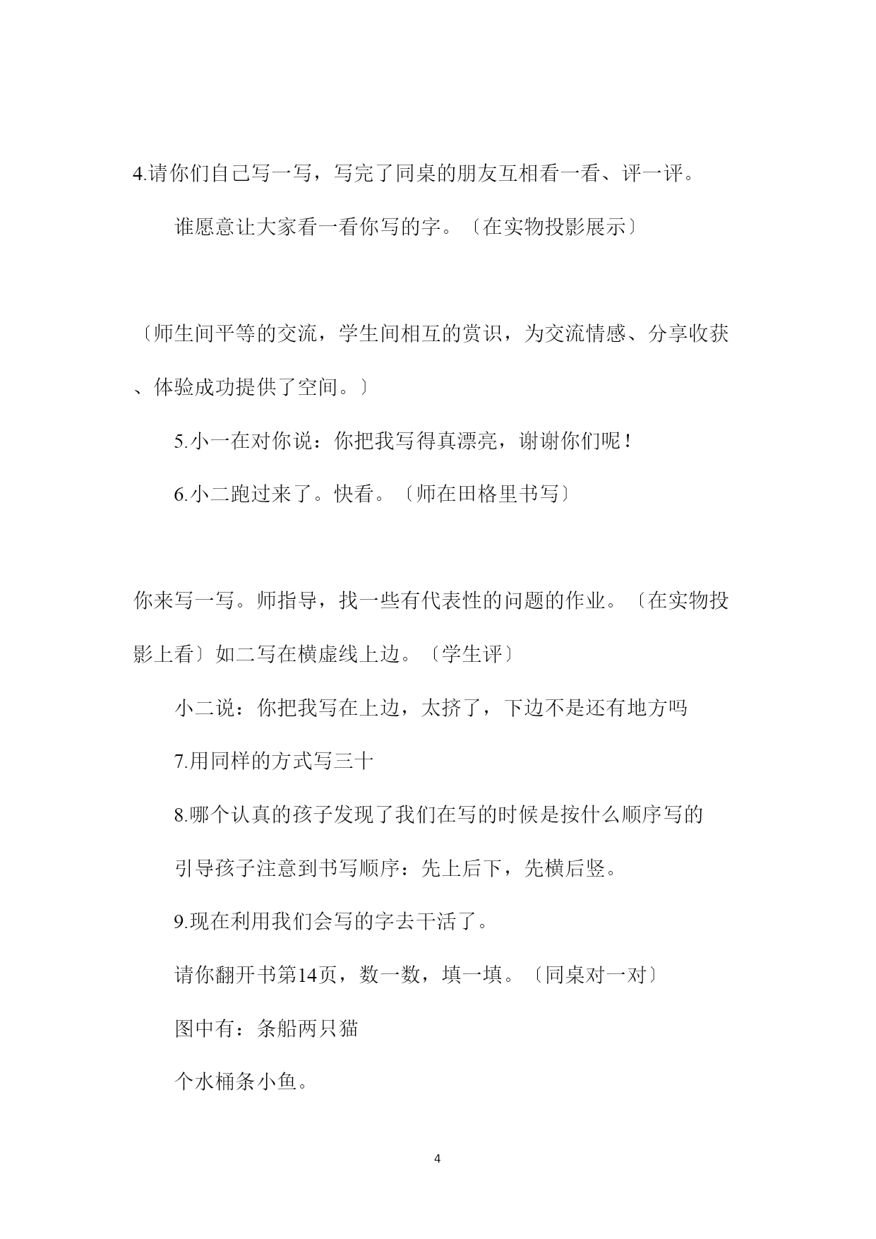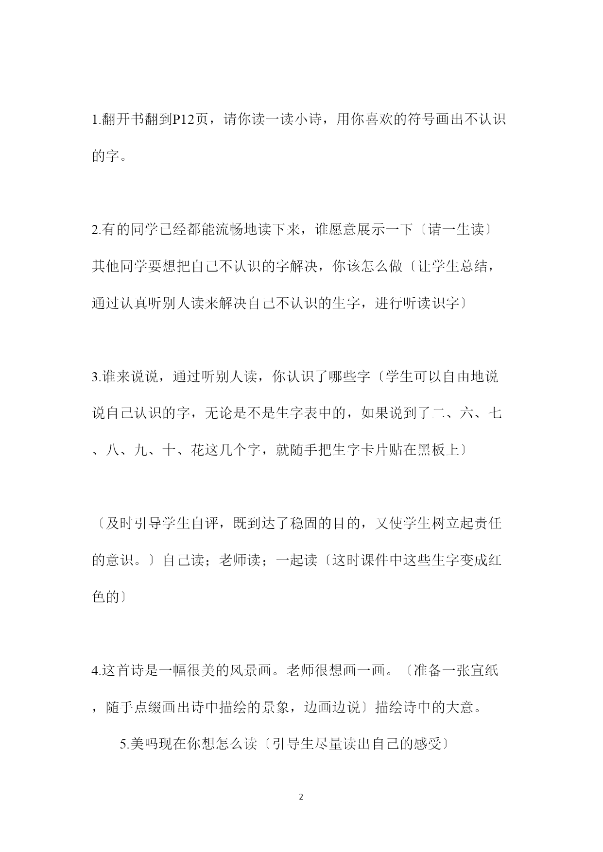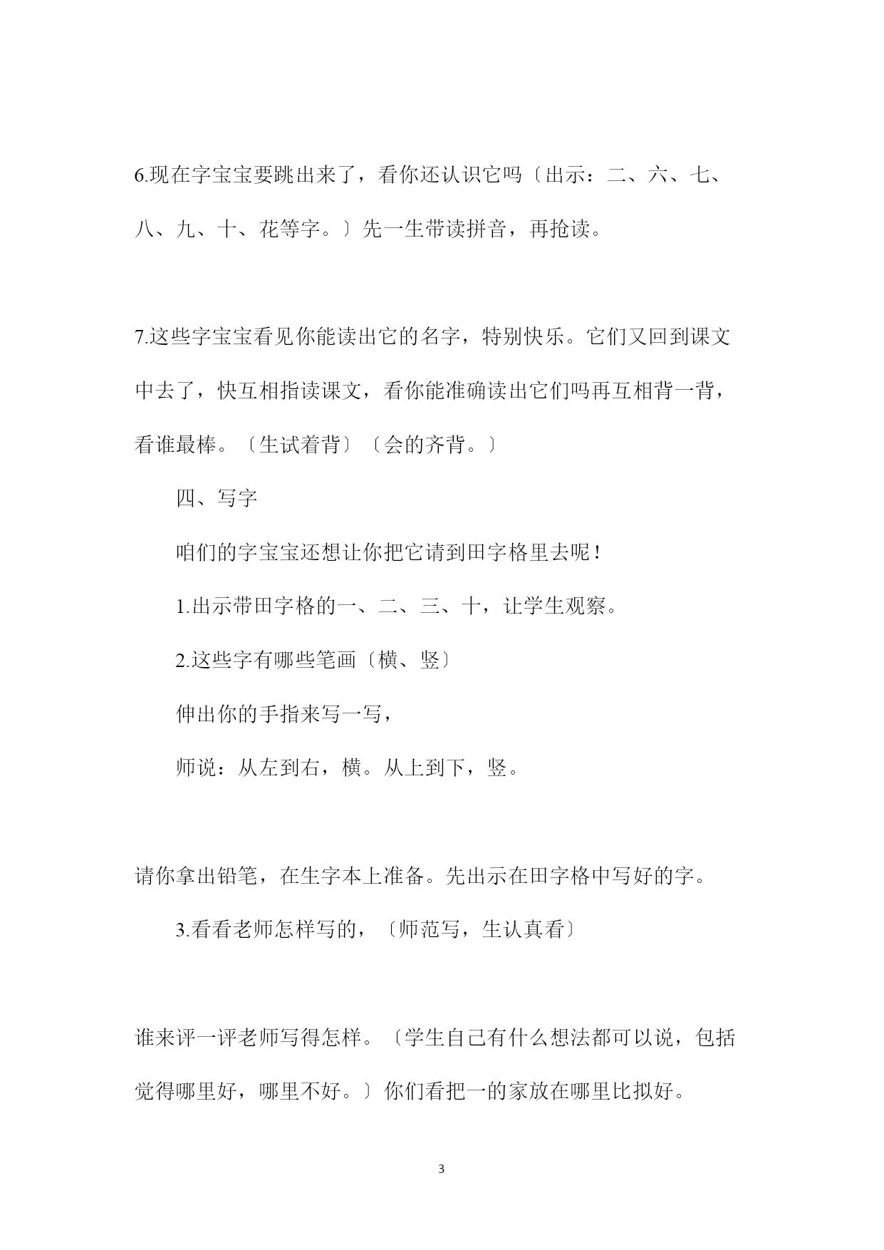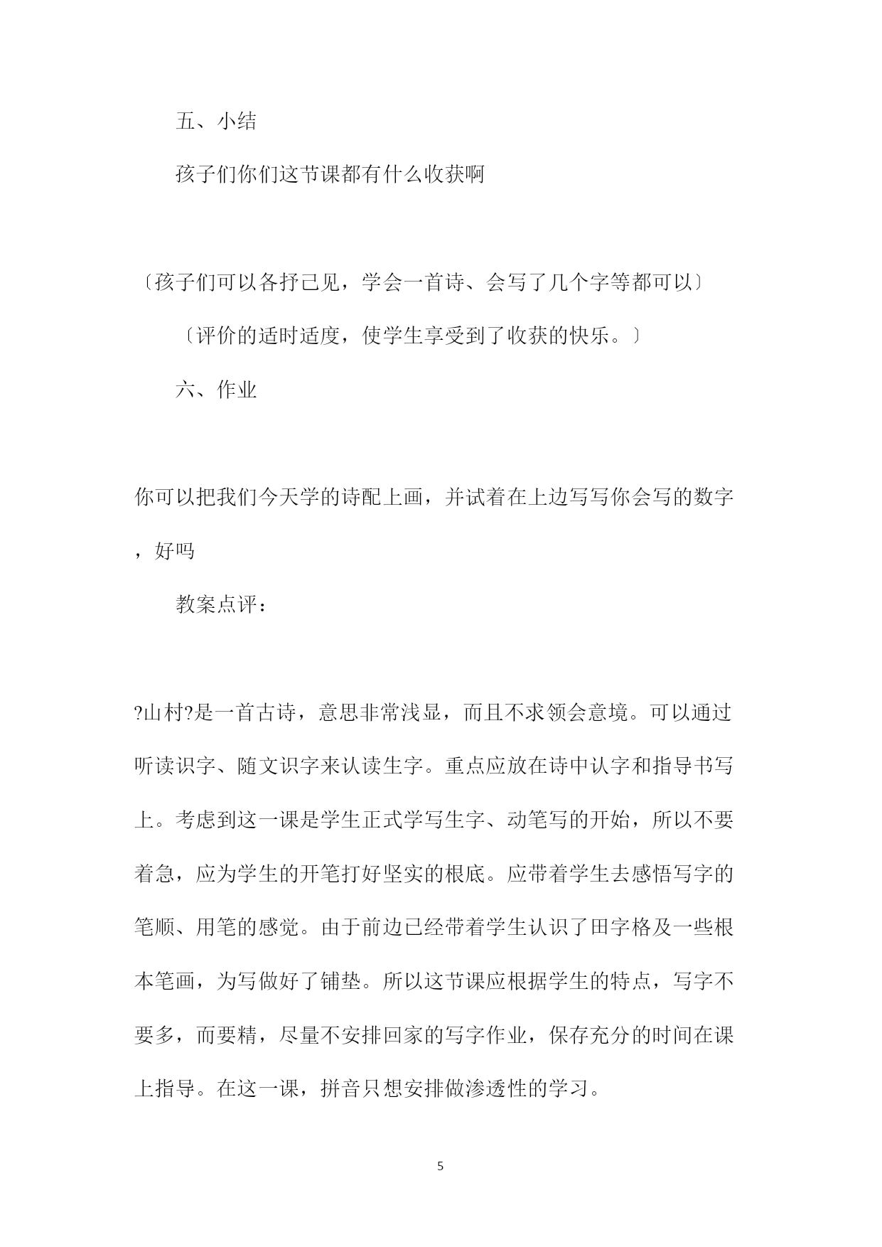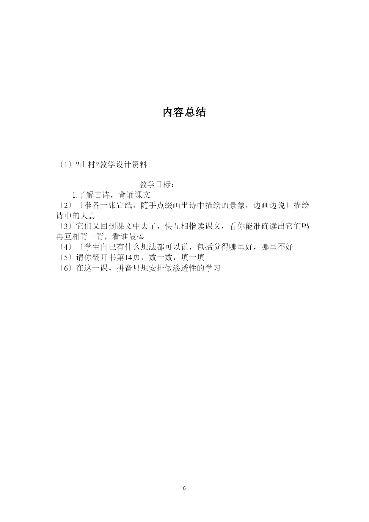 PAGEPAGE6?山村?教学设计资料教学目标:1.了解古诗,背诵课文。2.在课文中随文识字,渗透拼音的认识。3.学写生字。教学重点、难点:1.随文识字。2.学写生字。教学过程:一、课前活动你会背哪些诗,给大家展示一下。二、导入新课1.同学们你们会背这么多诗了,真好,今天我们再来学一首小诗好吗板书:山村2.谁认识,读一读。三、新授1.翻开书翻到P12页,请你读一读小诗,用你喜欢的符号画出不认识的字。2.有的同学已经都能流畅地读下来,谁愿意展示一下〔请一生读〕其他同学要想把自己不认识的字解决,你该怎么做〔让学生总结,通过认真听别人读来解决自己不认识的生字,进行听读识字〕3.谁来说说,通过听别人读,你认识了哪些字〔学生可以自由地说说自己认识的字,无论是不是生字表中的,如果说到了二、六、七、八、九、十、花这几个字,就随手把生字卡片贴在黑板上〕〔及时引导学生自评,既到达了稳固的目的,又使学生树立起责任的意识。〕自己读;老师读;一起读〔这时课件中这些生字变成红色的〕4.这首诗是一幅很美的风景画。老师很想画一画。〔准备一张宣纸,随手点缀画出诗中描绘的景象,边画边说〕描绘诗中的大意。5.美吗现在你想怎么读〔引导生尽量读出自己的感受〕6.现在字宝宝要跳出来了,看你还认识它吗〔出示:二、六、七、八、九、十、花等字。〕先一生带读拼音,再抢读。7.这些字宝宝看见你能读出它的名字,特别快乐。它们又回到课文中去了,快互相指读课文,看你能准确读出它们吗再互相背一背,看谁最棒。〔生试着背〕〔会的齐背。〕四、写字咱们的字宝宝还想让你把它请到田字格里去呢!1.出示带田字格的一、二、三、十,让学生观察。2.这些字有哪些笔画〔横、竖〕伸出你的手指来写一写,师说:从左到右,横。从上到下,竖。请你拿出铅笔,在生字本上准备。先出示在田字格中写好的字。3.看看老师怎样写的,〔师范写,生认真看〕谁来评一评老师写得怎样。〔学生自己有什么想法都可以说,包括觉得哪里好,哪里不好。〕你们看把一的家放在哪里比拟好。4.请你们自己写一写,写完了同桌的朋友互相看一看、评一评。谁愿意让大家看一看你写的字。〔在实物投影展示〕〔师生间平等的交流,学生间相互的赏识,为交流情感、分享收获、体验成功提供了空间。〕5.小一在对你说:你把我写得真漂亮,谢谢你们呢!6.小二跑过来了。快看。〔师在田格里书写〕你来写一写。师指导,找一些有代表性的问题的作业。〔在实物投影上看〕如二写在横虚线上边。〔学生评〕小二说:你把我写在上边,太挤了,下边不是还有地方吗7.用同样的方式写三十8.哪个认真的孩子发现了我们在写的时候是按什么顺序写的引导孩子注意到书写顺序:先上后下,先横后竖。9.现在利用我们会写的字去干活了。请你翻开书,数一数,填一填。〔同桌对一对〕图中有:条船两只猫个水桶条小鱼。五、小结孩子们你们这节课都有什么收获啊〔孩子们可以各抒己见,学会一首诗、会写了几个字等都可以〕〔评价的适时适度,使学生享受到了收获的快乐。〕六、作业你可以把我们今天学的诗配上画,并试着在上边写写你会写的数字,好吗教案点评:?山村?是一首古诗,意思非常浅显,而且不求领会意境。可以通过听读识字、随文识字来认读生字。重点应放在诗中认字和指导书写上。考虑到这一课是学生正式学写生字、动笔写的开始,所以不要着急,应为学生的开笔打好坚实的根底。应带着学生去感悟写字的笔顺、用笔的感觉。由于前边已经带着学生认识了田字格及一些根本笔画,为写做好了铺垫。所以这节课应根据学生的特点,写字不要多,而要精,尽量不安排回家的写字作业,保存充分的时间在课上指导。在这一课,拼音只想安排做渗透性的学习。内容总结〔1〕?山村?教学设计资料教学目标:1.了解古诗,背诵课文〔2〕〔准备一张宣纸,随手点缀画出诗中描绘的景象,边画边说〕描绘诗中的大意〔3〕它们又回到课文中去了,快互相指读课文,看你能准确读出它们吗再互相背一背,看谁最棒〔4〕〔学生自己有什么想法都可以说,包括觉得哪里好,哪里不好〔5〕请你翻开书,数一数,填一填〔6〕在这一课,拼音只想安排做渗透性的学习