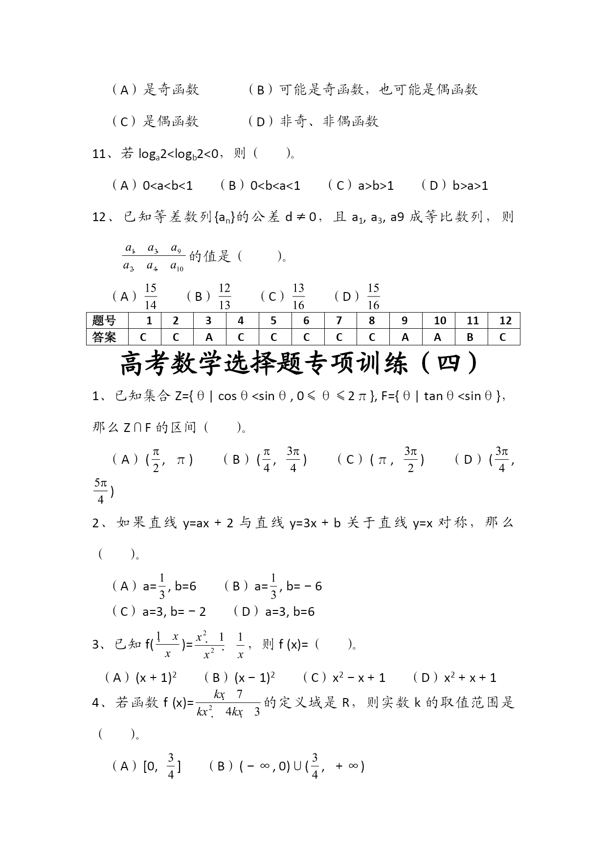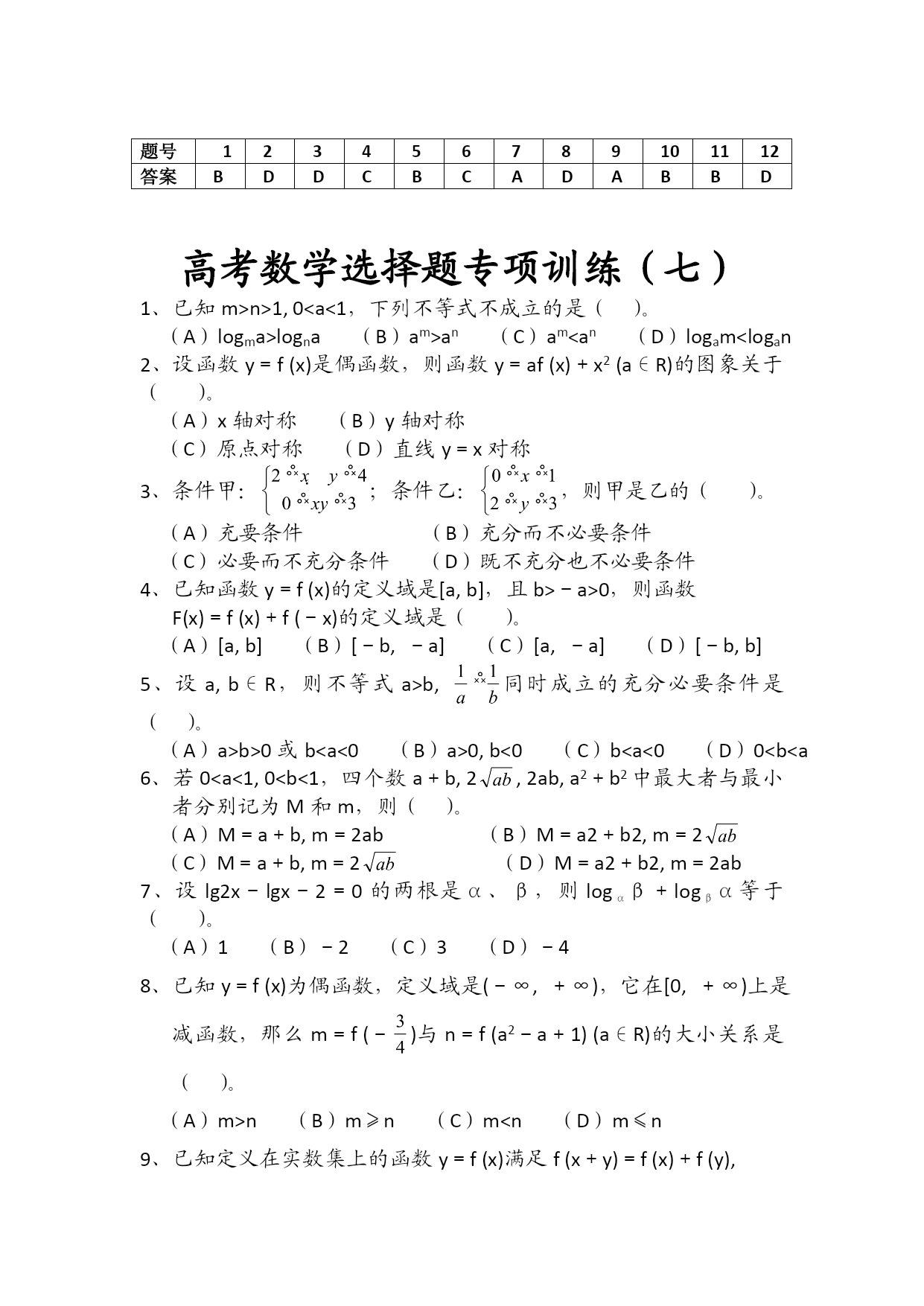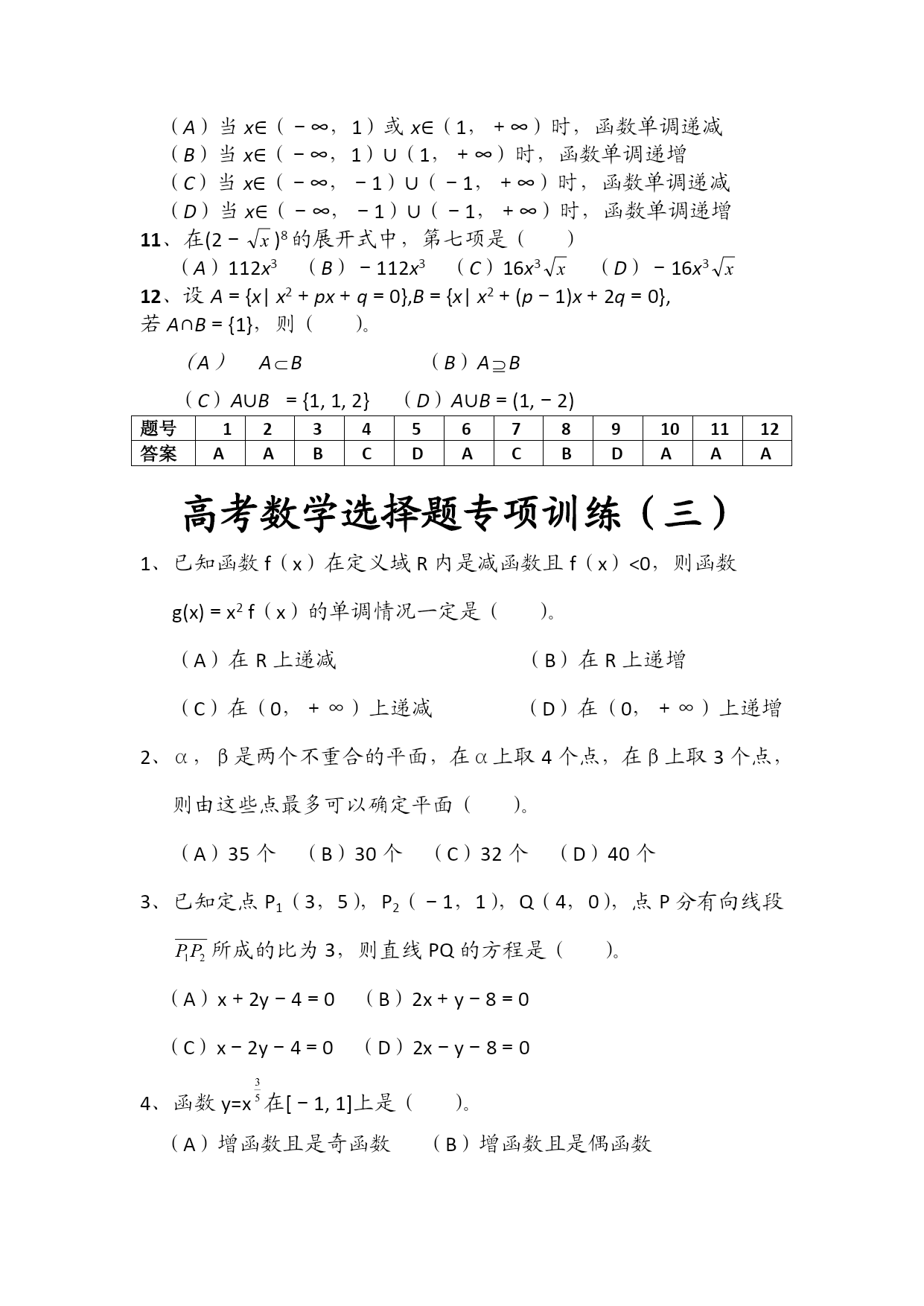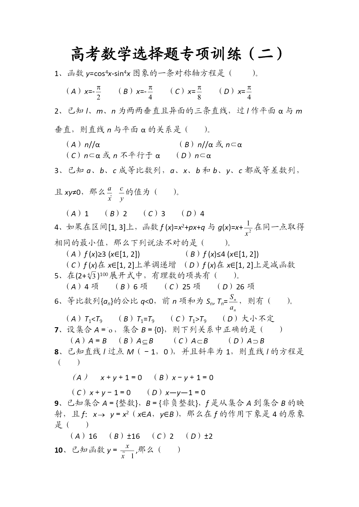 高考数学选择题专项训练(一)1、同时满足①M{1,2,3,4,5};②若a∈M,则(6-a)∈M,的非空集合M有()。(A)16个(B)15个(C)7个(D)8个2、函数y=f(x)是R上的增函数,则a+b>0是f(a)+f(b)>f(-a)+f(-b)的()条件。(A)充分不必要(B)必要不充分(C)充要(D)不充分不必要3、函数g(x)=x2,若a≠0且a∈R,则下列点一定在函数y=g(x)的图象上的是()。(A)(-a,-g(-a))(B)(a,g(-a))(C)(a,-g(a))(D)(-a,-g(a))4、数列{an}满足a1=1,a2=,且(n≥2),则an等于()。(A)(B)()n-1(C)()n(D)5、由1,2,3,4组成的没有重复数字的四位数,按从小到大的顺序排成一个数列{an},其中a18等于()。(A)1243(B)3421(C)4123(D)34126、已知圆锥内有一个内接圆柱,若圆柱的侧面积最大,则此圆柱的上底面将已知圆锥的体积分成小、大两部分的比是()。(A)1:1(B)1:2(C)1:8(D)1:77、直线4x+6y-9=0夹在两坐标轴之间的线段的垂直平分线是l,则l的方程是()。(A)24x-16y+15=0(B)24x-16y-15=0(C)24x+16y+15=0(D)24x+16y-15=08、函数f(x)=loga(ax2-x)在x∈[2,4]上是增函数,则a的取值范围是()。(A)a>1(B)a>0且a≠1(C)0<a<1(D)a∈9、函数y=f(x)的反函数f-1(x)=(x∈R且x≠-3),则y=f(x)的图象()。(A)关于点(2,3)对称(B)关于点(-2,-3)对称(C)关于直线y=3对称(D)关于直线x=-2对称10、两条曲线|y|=与x=-的交点坐标是()。(A)(-1,-1)(B)(0,0)和(-1,-1)(C)(-1,1)和(0,0)(D)(1,-1)和(0,0)11、已知a,b∈R,m=,n=-b+b2,则下列结论正确的是()。(A)m<n(B)m≥n(C)m>n(D)m≤n12、若a,b∈R,那么成立的一个充分非必要条件是()。(A)a>b(B)ab(a-b)<0(C)a<b<0(D)a<b题号123456789101112答案CCDABDBABBDC高考数学选择题专项训练(二)1、函数y=cos4x-sin4x图象的一条对称轴方程是()。(A)x=-(B)x=-(C)x=(D)x=2、已知l、m、n为两两垂直且异面的三条直线,过l作平面α与m垂直,则直线n与平面α的关系是()。(A)n//α(B)n//α或nα(C)nα或n不平行于α(D)nα3、已知a、b、c成等比数列,a、x、b和b、y、c都成等差数列,且xy≠0,那么的值为()。(A)1(B)2(C)3(D)44、如果在区间[1,3]上,函数f(x)=x2+px+q与g(x)=x+在同一点取得相同的最小值,那么下列说法不对的是()。(A)f(x)≥3(x∈[1,2])(B)f(x)≤4(x∈[1,2])(C)f(x)在x∈[1,2]上单调递增(D)f(x)在x∈[1,2]上是减函数5、在(2+)100展开式中,有理数的项共有()。(A)4项(B)6项(C)25项(D)26项6、等比数列{an}的公比q<0,前n项和为Sn,Tn=,则有()。(A)T1<T9(B)T1=T9(C)T1>T9(D)大小不定7、设集合A=,集合B={0},则下列关系中正确的是()(A)A=B(B)AB(C)AB(D)AB8、已知直线l过点M(-1,0),并且斜率为1,则直线l的方程是()x+y+1=0(B)x-y+1=0(C)x+y-1=0(D)x―y―1=09、已知集合A={整数},B={非负整数},f是从集合A到集合B的映射,且f:xy=x2(x∈A,y∈B),那么在f的作用下象是4的原象是()(A)16(B)±16(C)2(D)±210、已知函数y=,那么()(A)当x∈(-∞,1)或x∈(1,+∞)时,函数单调递减(B)当x∈(-∞,1)∪(1,+∞)时,函数单调递增(C)当x∈(-∞,-1)∪(-1,+∞)时,函数单调递减(D)当x∈(-∞,-1)∪(-1,+∞)时,函数单调递增11、在(2-)8的展开式中,第七项是()(A)112x3(B)-112x3(C)16x3(D)-16x312、设A={x|x2+px+q=0},B={x|x2+(p-1)x+2q=0},若A∩B={1},则()。AB(B)AB(C)A∪B={1,1,2}(D)A∪B=(1,-2)题号123456789101112答案