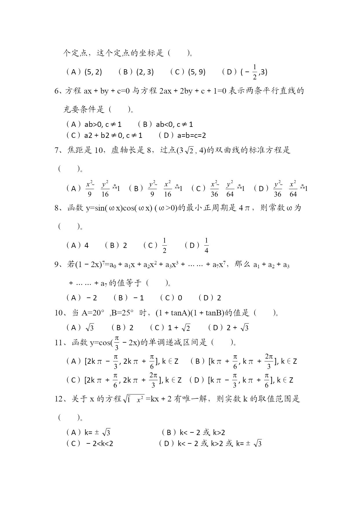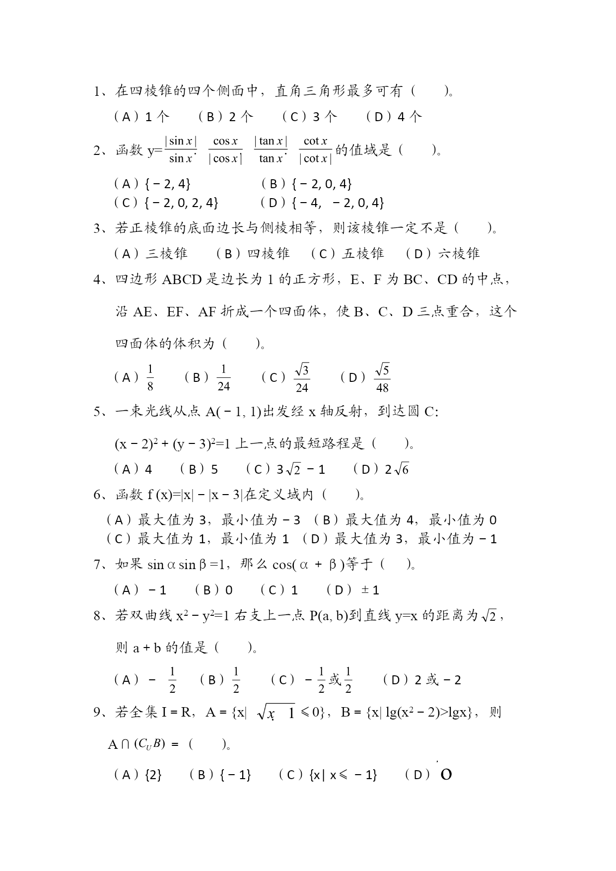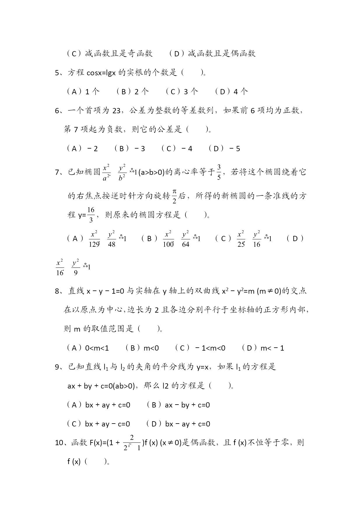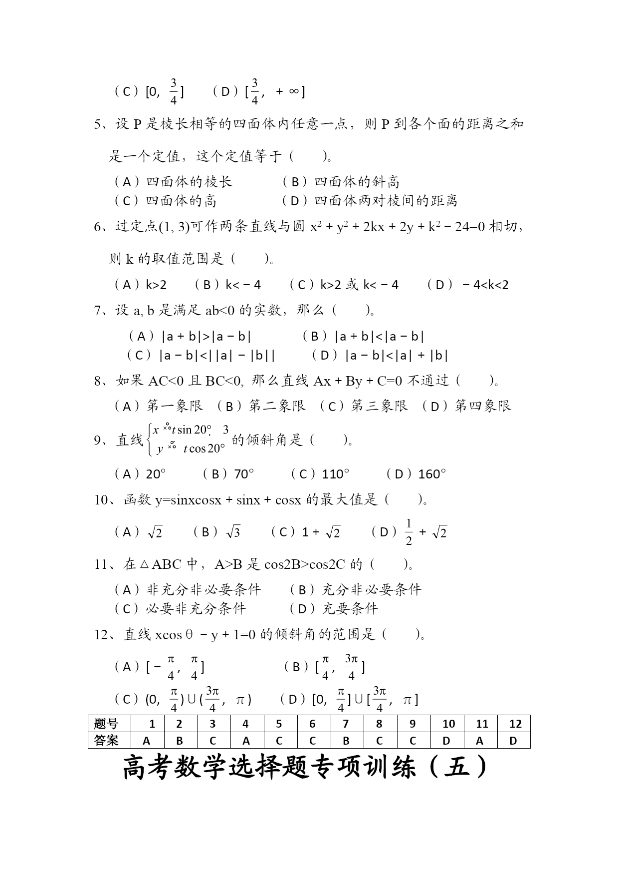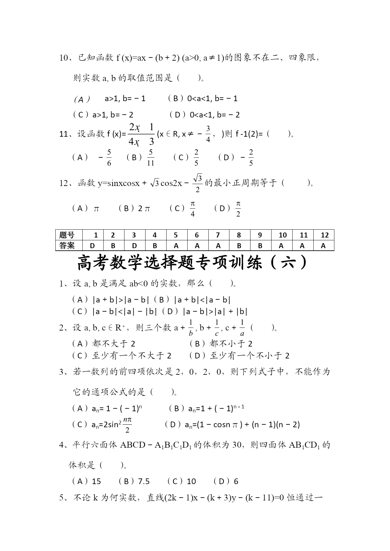 高考数学选择题专项训练(一)1、同时满足①M{1,2,3,4,5};②若a∈M,则(6-a)∈M,的非空集合M有()。(A)16个(B)15个(C)7个(D)8个2、函数y=f(x)是R上的增函数,则a+b>0是f(a)+f(b)>f(-a)+f(-b)的()条件。(A)充分不必要(B)必要不充分(C)充要(D)不充分不必要3、函数g(x)=x2,若a≠0且a∈R,则下列点一定在函数y=g(x)的图象上的是()。(A)(-a,-g(-a))(B)(a,g(-a))(C)(a,-g(a))(D)(-a,-g(a))4、数列{an}满足a1=1,a2=,且(n≥2),则an等于()。(A)(B)()n-1(C)()n(D)5、由1,2,3,4组成的没有重复数字的四位数,按从小到大的顺序排成一个数列{an},其中a18等于()。(A)1243(B)3421(C)4123(D)34126、已知圆锥内有一个内接圆柱,若圆柱的侧面积最大,则此圆柱的上底面将已知圆锥的体积分成小、大两部分的比是()。(A)1:1(B)1:2(C)1:8(D)1:77、直线4x+6y-9=0夹在两坐标轴之间的线段的垂直平分线是l,则l的方程是()。(A)24x-16y+15=0(B)24x-16y-15=0(C)24x+16y+15=0(D)24x+16y-15=08、函数f(x)=loga(ax2-x)在x∈[2,4]上是增函数,则a的取值范围是()。(A)a>1(B)a>0且a≠1(C)0<a<1(D)a∈9、函数y=f(x)的反函数f-1(x)=(x∈R且x≠-3),则y=f(x)的图象()。(A)关于点(2,3)对称(B)关于点(-2,-3)对称(C)关于直线y=3对称(D)关于直线x=-2对称10、两条曲线|y|=与x=-的交点坐标是()。(A)(-1,-1)(B)(0,0)和(-1,-1)(C)(-1,1)和(0,0)(D)(1,-1)和(0,0)11、已知a,b∈R,m=,n=-b+b2,则下列结论正确的是()。(A)m<n(B)m≥n(C)m>n(D)m≤n12、若a,b∈R,那么成立的一个充分非必要条件是()。(A)a>b(B)ab(a-b)<0(C)a<b<0(D)a<b题号123456789101112答案CCDABDBABBDC高考数学选择题专项训练(二)1、函数y=cos4x-sin4x图象的一条对称轴方程是()。(A)x=-(B)x=-(C)x=(D)x=2、已知l、m、n为两两垂直且异面的三条直线,过l作平面α与m垂直,则直线n与平面α的关系是()。(A)n//α(B)n//α或nα(C)nα或n不平行于α(D)nα3、已知a、b、c成等比数列,a、x、b和b、y、c都成等差数列,且xy≠0,那么的值为()。(A)1(B)2(C)3(D)44、如果在区间[1,3]上,函数f(x)=x2+px+q与g(x)=x+在同一点取得相同的最小值,那么下列说法不对的是()。(A)f(x)≥3(x∈[1,2])(B)f(x)≤4(x∈[1,2])(C)f(x)在x∈[1,2]上单调递增(D)f(x)在x∈[1,2]上是减函数5、在(2+)100展开式中,有理数的项共有()。(A)4项(B)6项(C)25项(D)26项6、等比数列{an}的公比q<0,前n项和为Sn,Tn=,则有()。(A)T1<T9(B)T1=T9(C)T1>T9(D)大小不定7、设集合A=,集合B={0},则下列关系中正确的是()(A)A=B(B)AB(C)AB(D)AB8、已知直线l过点M(-1,0),并且斜率为1,则直线l的方程是()x+y+1=0(B)x-y+1=0(C)x+y-1=0(D)x―y―1=09、已知集合A={整数},B={非负整数},f是从集合A到集合B的映射,且f:xy=x2(x∈A,y∈B),那么在f的作用下象是4的原象是()(A)16(B)±16(C)2(D)±210、已知函数y=,那么()(A)当x∈(-∞,1)或x∈(1,+∞)时,函数单调递减(B)当x∈(-∞,1)∪(1,+∞)时,函数单调递增(C)当x∈(-∞,-1)∪(-1,+∞)时,函数单调递减(D)当x∈(-∞,-1)∪(-1,+∞)时,函数单调递增11、在(2-)8的展开式中,第七项是()(A)112x3(B)-112x3(C)16x3(D)-16x312、设A={x|x2+px+q=0},B={x|x2+(p-1)x+2q=0},若A∩B={1},则()。AB(B)AB(C)A∪B={1,1,2}(D)A∪B=(1,-2)题号123456789101112答案