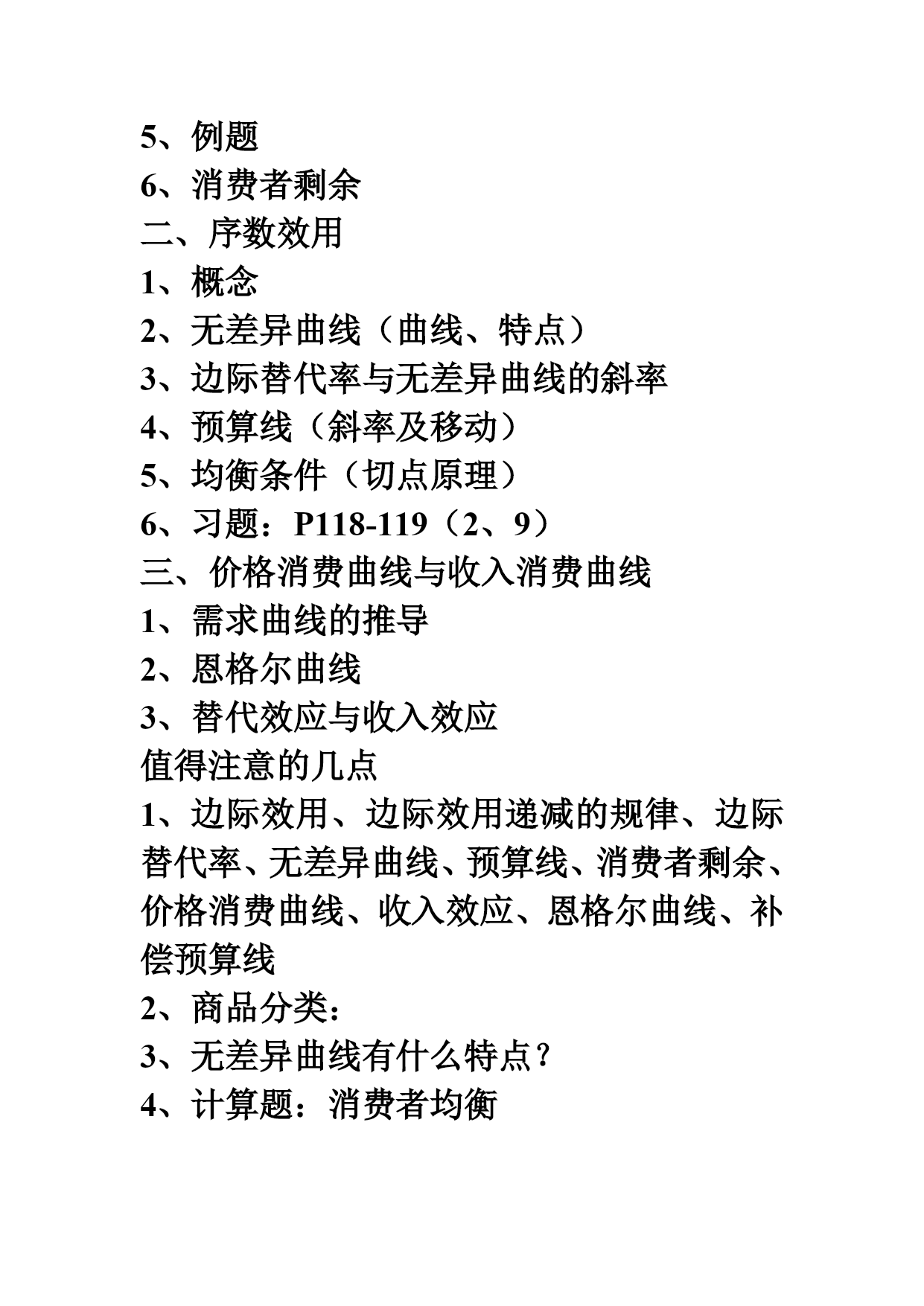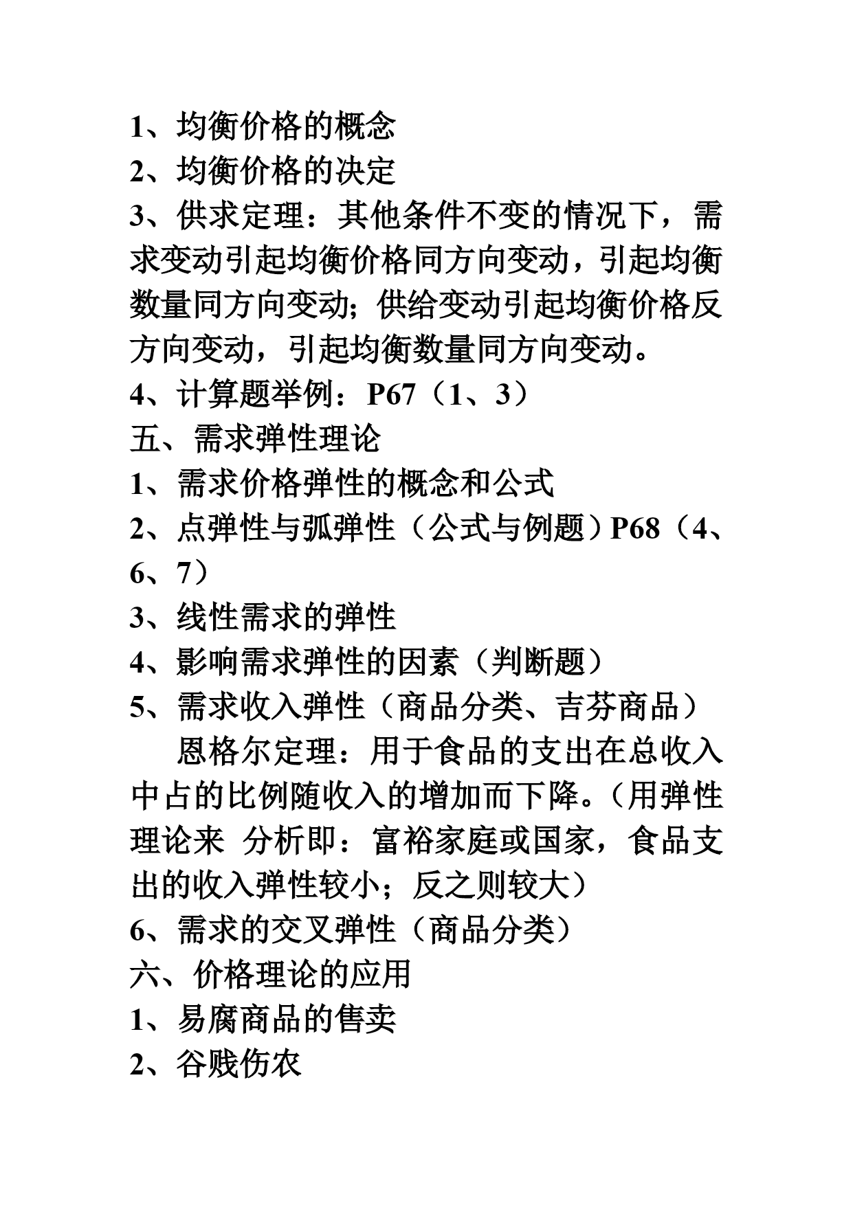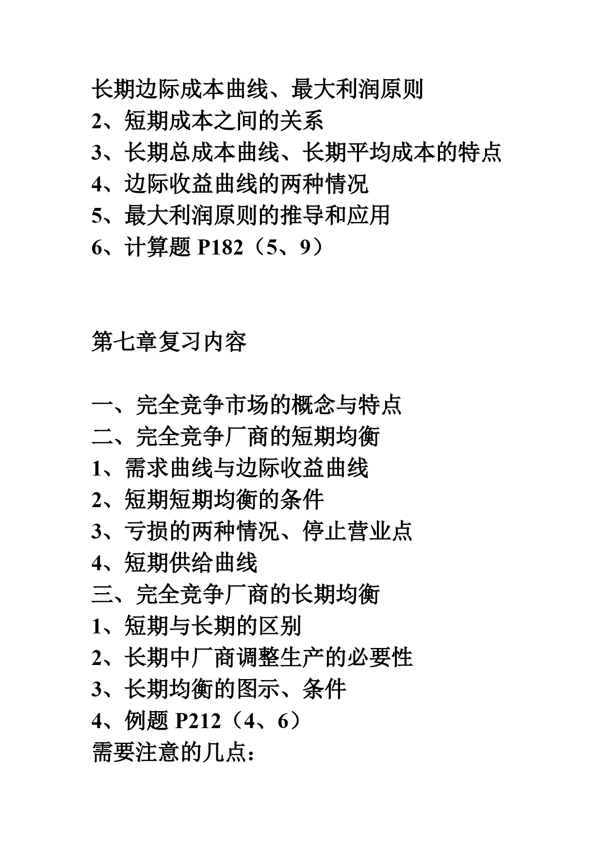 复习内容西方经济学要解决的两个问题为什么要学习西方经济学复习内容什么是微观经济学微观经济学的定义微观经济学的理论假设(理性人)需求理论需求及其影响因素需求函数Q=A-BP需求规律需求的变动与需求量的变动供给理论供给与影响供给的因素供给函数Q=-C+DP供给规律供给的变动与供给量的变动均衡价格均衡价格的概念均衡价格的决定供求定理:其他条件不变的情况下,需求变动引起均衡价格同方向变动,引起均衡数量同方向变动;供给变动引起均衡价格反方向变动,引起均衡数量同方向变动。计算题举例:P67(1、3)需求弹性理论需求价格弹性的概念和公式点弹性与弧弹性(公式与例题)P68(4、6、7)线性需求的弹性影响需求弹性的因素(判断题)需求收入弹性(商品分类、吉芬商品)恩格尔定理:用于食品的支出在总收入中占的比例随收入的增加而下降。(用弹性理论来分析即:富裕家庭或国家,食品支出的收入弹性较小;反之则较大)需求的交叉弹性(商品分类)价格理论的应用易腐商品的售卖谷贱伤农最高、低限价值得关注的几点名词解释:吉芬商品、低档品、需求曲线、均衡价格、恩格尔定理、最高限价需求量变动与需求变动、供求定理影响需求弹性的因素均衡价格是怎样形成的?粮食丰收了农民为什么不一定增收?与均衡价格有关的计算题复习内容基数效用概念总效用与边际效用的关系边际效用递减的规律均衡条件(等边际原理)例题消费者剩余序数效用概念无差异曲线(曲线、特点)边际替代率与无差异曲线的斜率预算线(斜率及移动)均衡条件(切点原理)习题:P118-119(2、9)价格消费曲线与收入消费曲线需求曲线的推导恩格尔曲线替代效应与收入效应值得注意的几点边际效用、边际效用递减的规律、边际替代率、无差异曲线、预算线、消费者剩余、价格消费曲线、收入效应、恩格尔曲线、补偿预算线商品分类:无差异曲线有什么特点?计算题:消费者均衡复习内容生产函数企业的定义和本质线性生产函数列昂惕夫生产函数C-D生产函数一种变动要素的生产函数总产量、平均产量与边际产量边际报酬递减的规律短期生产的三阶段(特点、怎么区分、例题)最优区间两种要素变动的生产函数等产量线(曲线、特点、形状)边际替代率与曲线的斜率等成本线(斜率与变动)均衡条件(切点原理)例题扩展线与等斜线规模报酬三种情况表示与判断例题:P154(8)值得关注的几点企业、企业的本质、生产函数、边际产量、边际报酬递减规律、边际技术替代率、等成本线、等斜线、扩展线、规模报酬递减C-D生产函数有什么特点?等产量线有什么特点?一种要素变动的条件下,厂商最优生产区间是什么?为什么?利用图形说明在既定产量下,如何实现最小成本的最优要素组合。复习内容成本的一般概念成本机会成本显成本和隐成本会计成本与经济成本会计利润与经济利润正常利润短期成本固定成本与可变成本平均固定成本与平均变动成本总成本、平均成本与边际成本短期成本之间的关系、形状、原因短期成本与产量之间的关系长期成本长期总成本长期平均成本长期边际成本收益总收益、平均收益与边际收益价格不变的情况(四线合一)价格下降的情况(边际收益曲线平分需求曲线上任一点到纵轴的垂线)利润经济利润最大利润原则、值得注意的几点:机会成本、隐性成本、正常利润、经济利润、边际成本、边际收益、长期边际成本曲线、最大利润原则短期成本之间的关系长期总成本曲线、长期平均成本的特点边际收益曲线的两种情况最大利润原则的推导和应用计算题P182(5、9)复习内容完全竞争市场的概念与特点完全竞争厂商的短期均衡需求曲线与边际收益曲线短期短期均衡的条件亏损的两种情况、停止营业点短期供给曲线完全竞争厂商的长期均衡短期与长期的区别长期中厂商调整生产的必要性长期均衡的图示、条件例题P212(4、6)需要注意的几点:完全竞争市场特点完全竞争厂商面对的需求曲线亏损的两种情况与应对措施、停止营业点长期均衡的条件复习内容完全垄断完全垄断市场的概念与特点形成的原因需求曲线与边际收益曲线短期均衡的四种情况长期均衡的条件价格歧视的条件、三种情况及其效率、三级价格歧视垄断竞争垄断竞争的概念与特点两条需求曲线短期均衡条件及四种情况长期均衡的条件剩余生产能力寡头垄断寡头垄断市场的概念与特点古诺模型的条件、结论及其推广斯威齐模型价格的刚性、折弯的需求曲线)值得注意的几点:完全垄断市场的特点、长期均衡的条件、价格歧视(三种情况及比较)垄断竞争的特点、产品的差别性、长