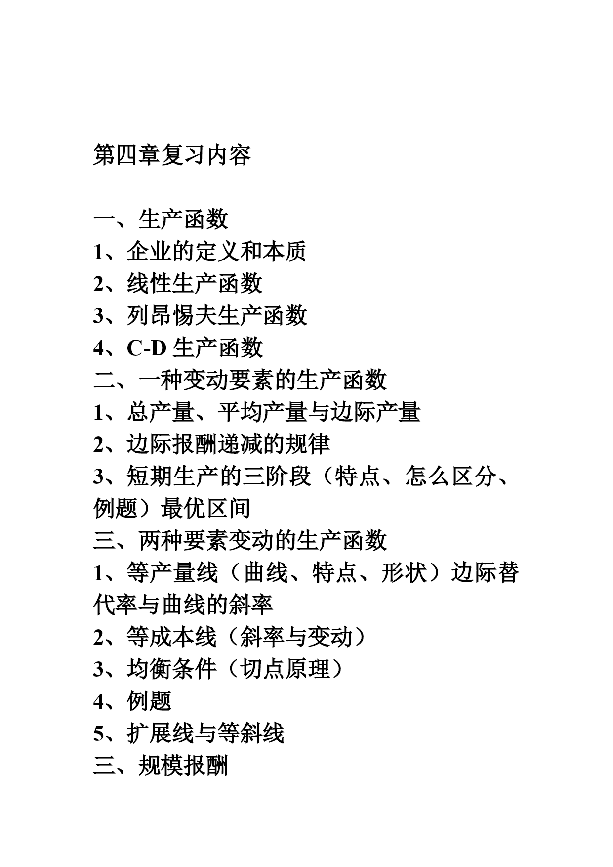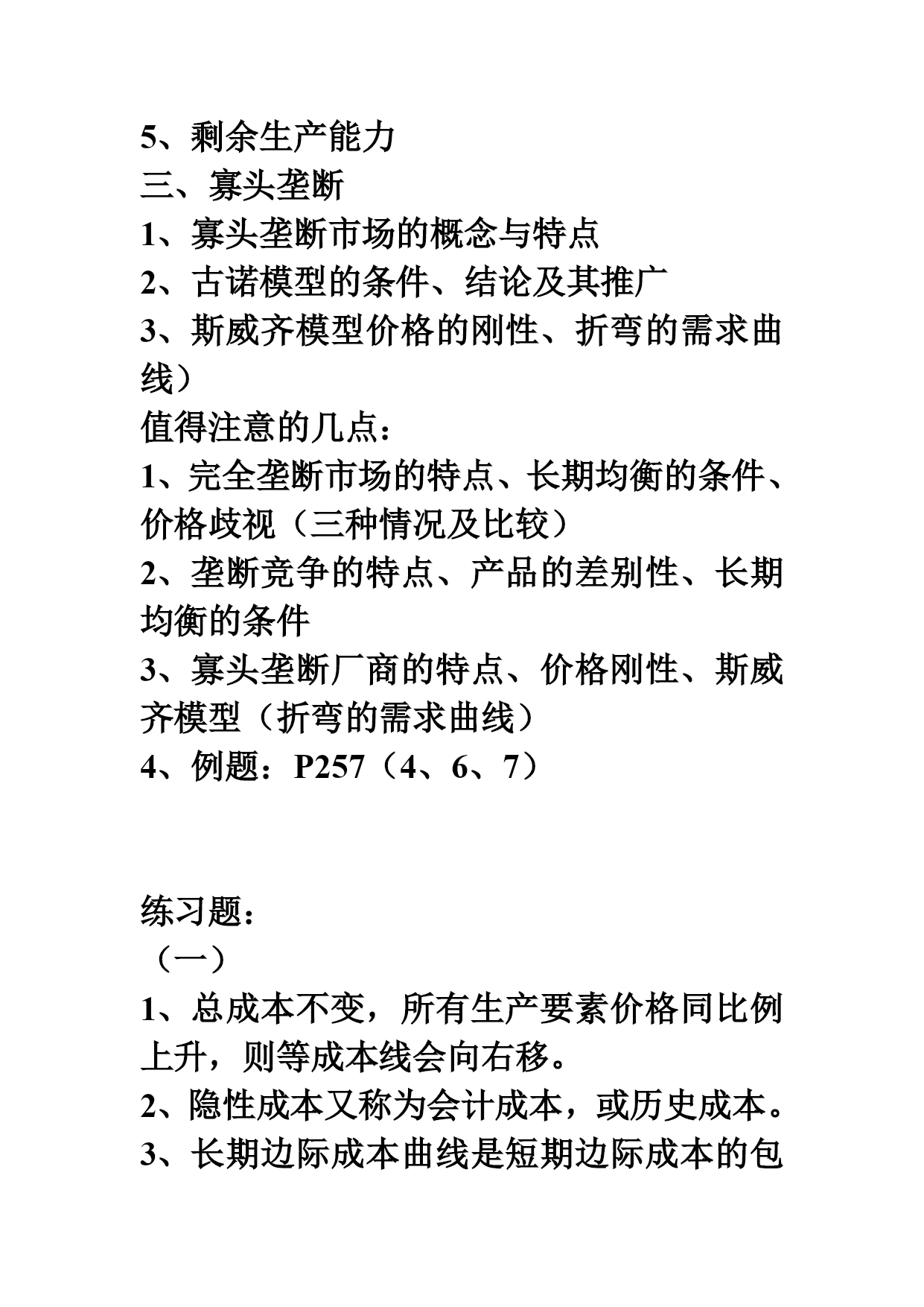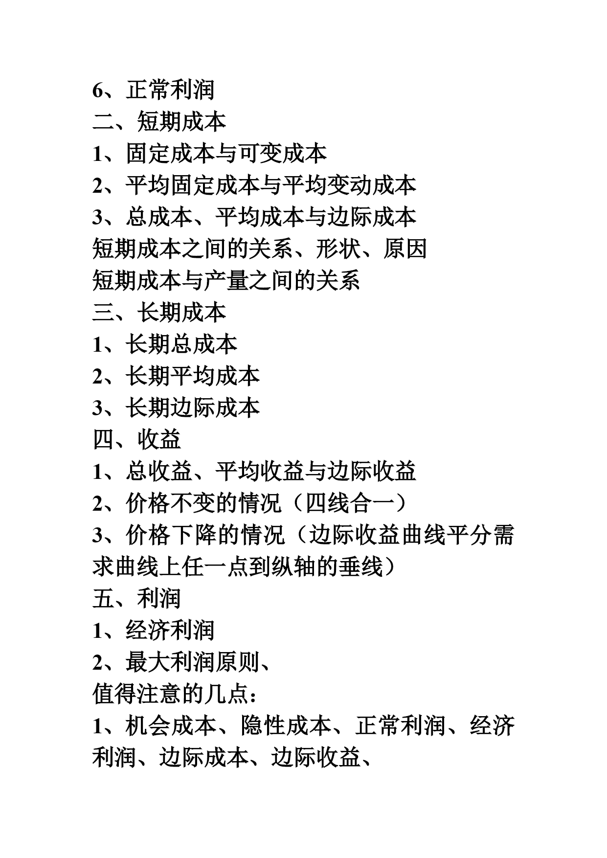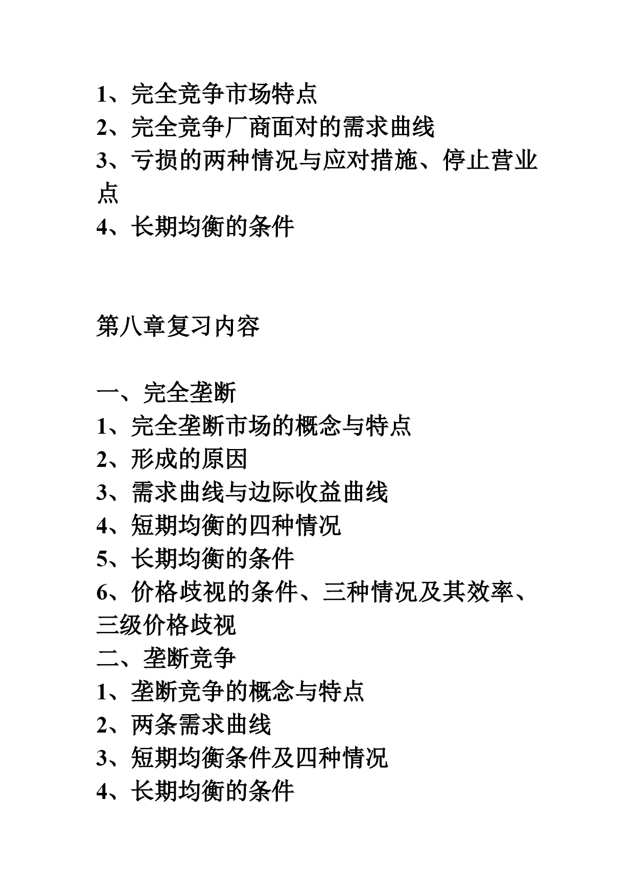 复习内容西方经济学要解决的两个问题为什么要学习西方经济学复习内容什么是微观经济学微观经济学的定义微观经济学的理论假设(理性人)需求理论需求及其影响因素需求函数Q=A-BP需求规律需求的变动与需求量的变动供给理论供给与影响供给的因素供给函数Q=-C+DP供给规律供给的变动与供给量的变动均衡价格均衡价格的概念均衡价格的决定供求定理:其他条件不变的情况下,需求变动引起均衡价格同方向变动,引起均衡数量同方向变动;供给变动引起均衡价格反方向变动,引起均衡数量同方向变动。计算题举例:P67(1、3)需求弹性理论需求价格弹性的概念和公式点弹性与弧弹性(公式与例题)P68(4、6、7)线性需求的弹性影响需求弹性的因素(判断题)需求收入弹性(商品分类、吉芬商品)恩格尔定理:用于食品的支出在总收入中占的比例随收入的增加而下降。(用弹性理论来分析即:富裕家庭或国家,食品支出的收入弹性较小;反之则较大)需求的交叉弹性(商品分类)价格理论的应用易腐商品的售卖谷贱伤农最高、低限价值得关注的几点名词解释:吉芬商品、低档品、需求曲线、均衡价格、恩格尔定理、最高限价需求量变动与需求变动、供求定理影响需求弹性的因素均衡价格是怎样形成的?粮食丰收了农民为什么不一定增收?与均衡价格有关的计算题复习内容基数效用概念总效用与边际效用的关系边际效用递减的规律均衡条件(等边际原理)例题消费者剩余序数效用概念无差异曲线(曲线、特点)边际替代率与无差异曲线的斜率预算线(斜率及移动)均衡条件(切点原理)习题:P118-119(2、9)价格消费曲线与收入消费曲线需求曲线的推导恩格尔曲线替代效应与收入效应值得注意的几点边际效用、边际效用递减的规律、边际替代率、无差异曲线、预算线、消费者剩余、价格消费曲线、收入效应、恩格尔曲线、补偿预算线商品分类:无差异曲线有什么特点?计算题:消费者均衡复习内容生产函数企业的定义和本质线性生产函数列昂惕夫生产函数C-D生产函数一种变动要素的生产函数总产量、平均产量与边际产量边际报酬递减的规律短期生产的三阶段(特点、怎么区分、例题)最优区间两种要素变动的生产函数等产量线(曲线、特点、形状)边际替代率与曲线的斜率等成本线(斜率与变动)均衡条件(切点原理)例题扩展线与等斜线规模报酬三种情况表示与判断例题:P154(8)值得关注的几点企业、企业的本质、生产函数、边际产量、边际报酬递减规律、边际技术替代率、等成本线、等斜线、扩展线、规模报酬递减C-D生产函数有什么特点?等产量线有什么特点?一种要素变动的条件下,厂商最优生产区间是什么?为什么?利用图形说明在既定产量下,如何实现最小成本的最优要素组合。复习内容成本的一般概念成本机会成本显成本和隐成本会计成本与经济成本会计利润与经济利润正常利润短期成本固定成本与可变成本平均固定成本与平均变动成本总成本、平均成本与边际成本短期成本之间的关系、形状、原因短期成本与产量之间的关系长期成本长期总成本长期平均成本长期边际成本收益总收益、平均收益与边际收益价格不变的情况(四线合一)价格下降的情况(边际收益曲线平分需求曲线上任一点到纵轴的垂线)利润经济利润最大利润原则、值得注意的几点:机会成本、隐性成本、正常利润、经济利润、边际成本、边际收益、长期边际成本曲线、最大利润原则短期成本之间的关系长期总成本曲线、长期平均成本的特点边际收益曲线的两种情况最大利润原则的推导和应用计算题P182(5、9)复习内容完全竞争市场的概念与特点完全竞争厂商的短期均衡需求曲线与边际收益曲线短期短期均衡的条件亏损的两种情况、停止营业点短期供给曲线完全竞争厂商的长期均衡短期与长期的区别长期中厂商调整生产的必要性长期均衡的图示、条件例题P212(4、6)需要注意的几点:完全竞争市场特点完全竞争厂商面对的需求曲线亏损的两种情况与应对措施、停止营业点长期均衡的条件复习内容完全垄断完全垄断市场的概念与特点形成的原因需求曲线与边际收益曲线短期均衡的四种情况长期均衡的条件价格歧视的条件、三种情况及其效率、三级价格歧视垄断竞争垄断竞争的概念与特点两条需求曲线短期均衡条件及四种情况长期均衡的条件剩余生产能力寡头垄断寡头垄断市场的概念与特点古诺模型的条件、结论及其推广斯威齐模型价格的刚性、折弯的需求曲线)值得注意的几点:完全垄断市场的特点、长期均衡的条件、价格歧视(三种情况及比较)垄断竞争的特点、产品的差别性、长